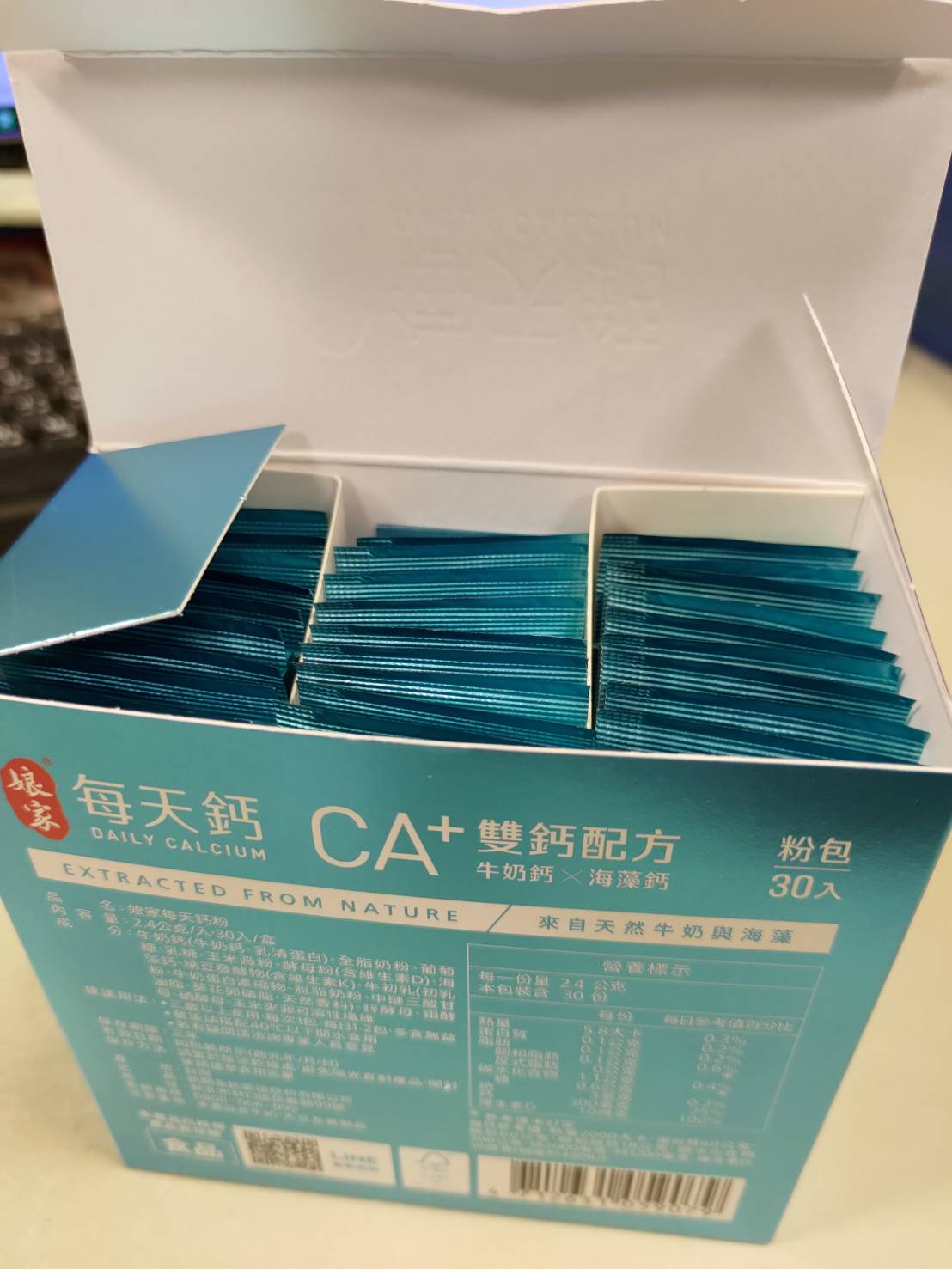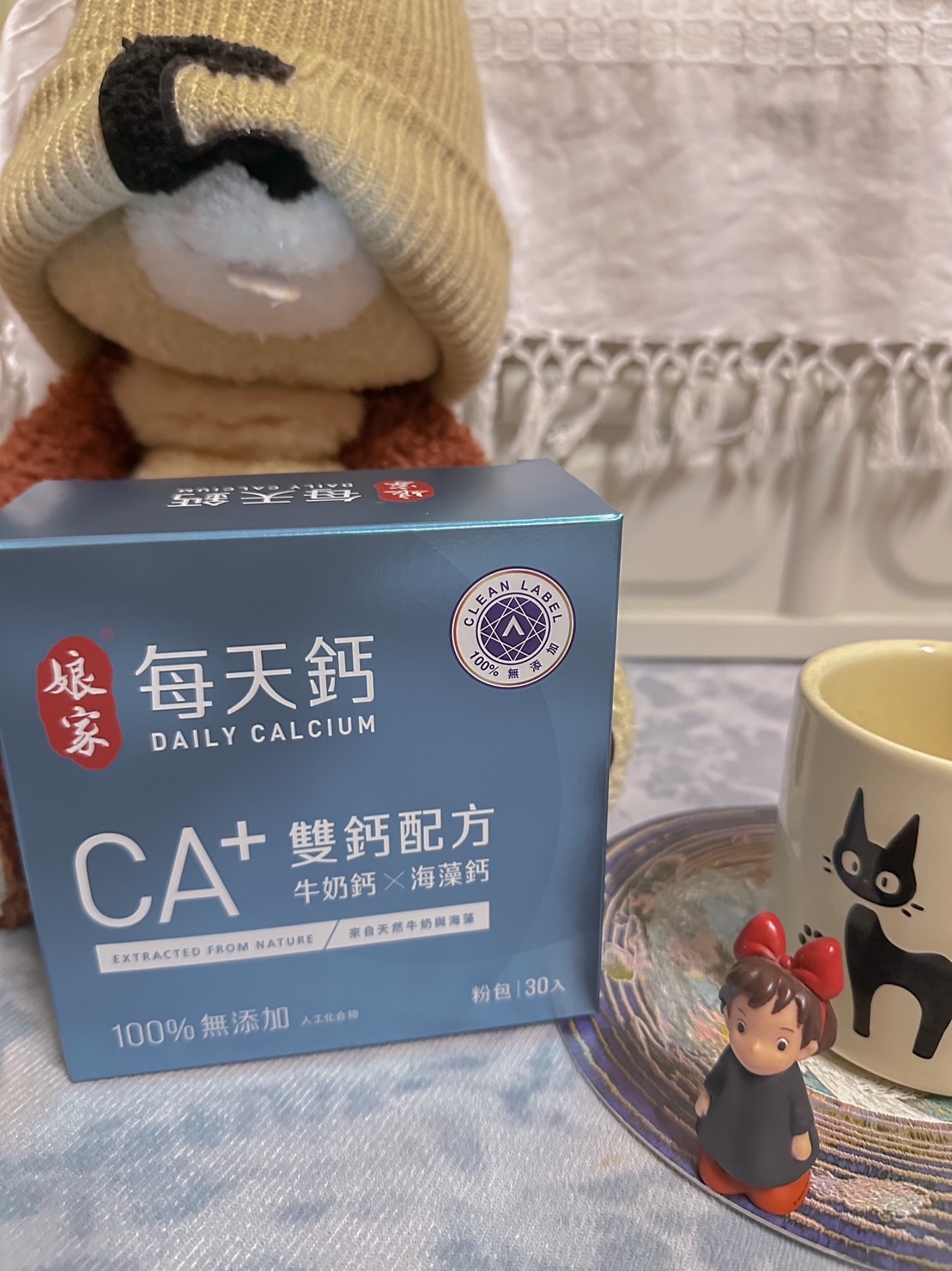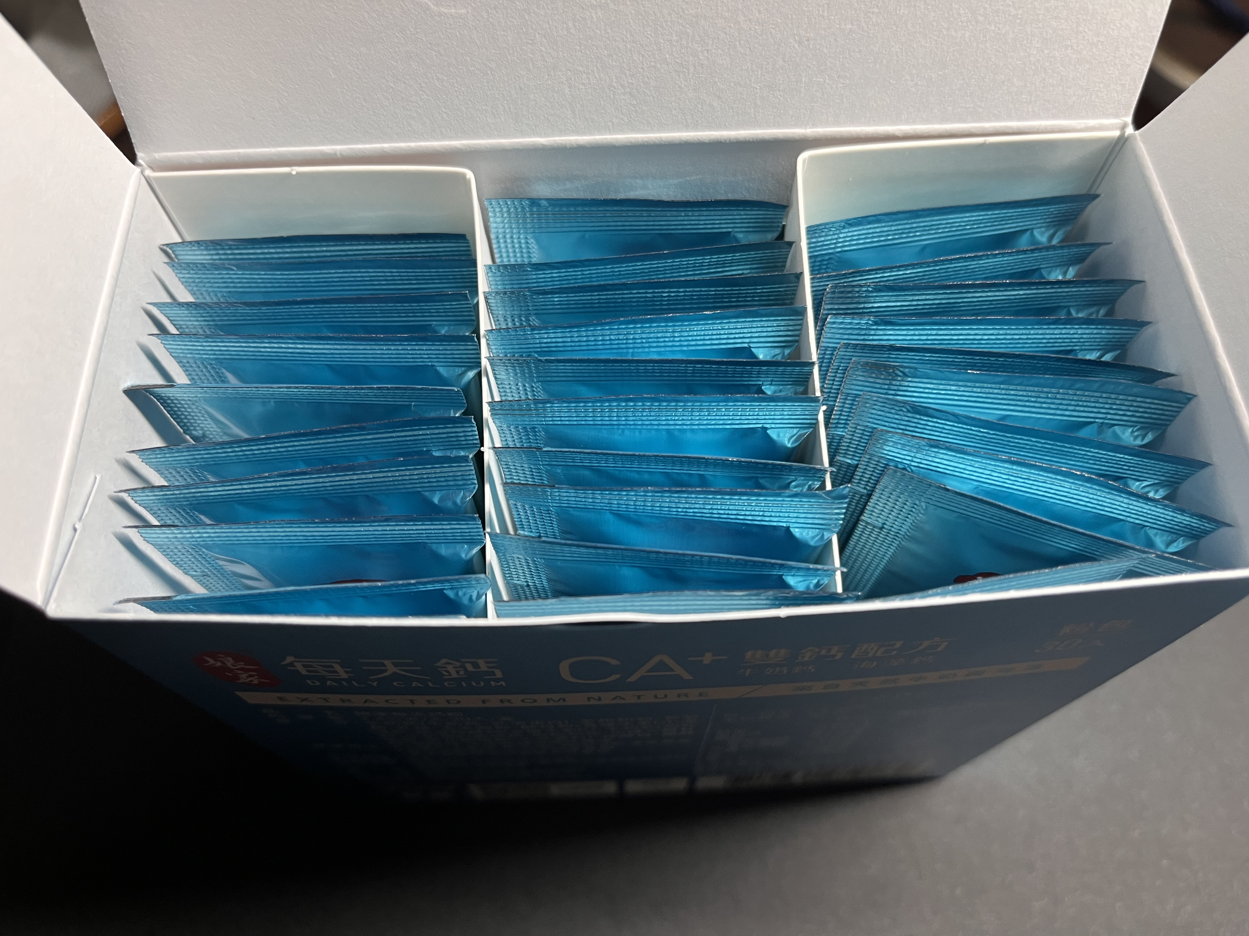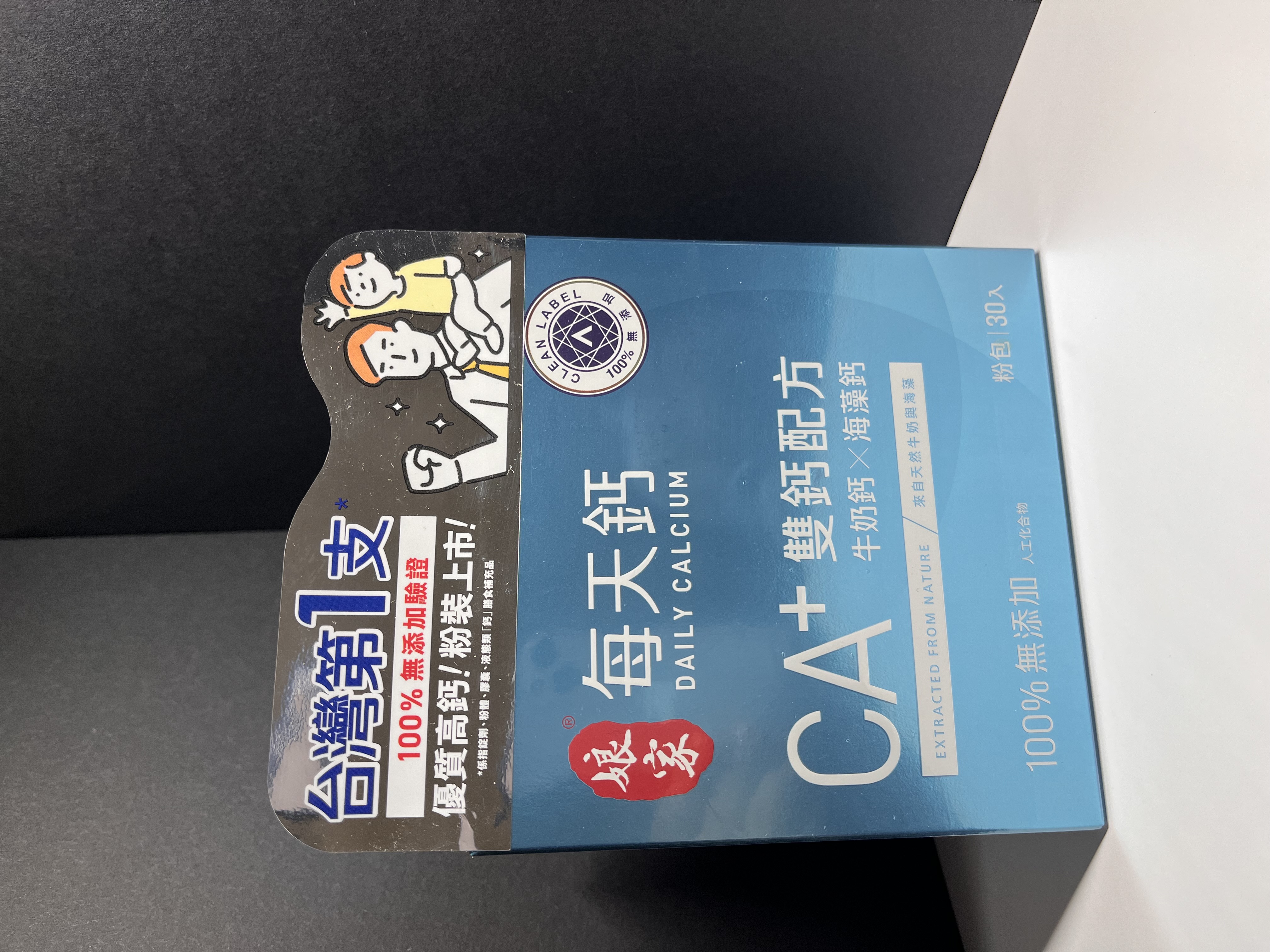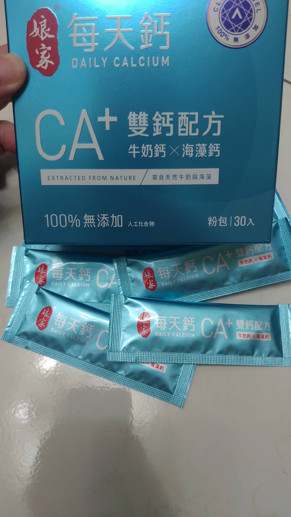 牛奶鈣(牛奶鈣、乳清蛋白)、全脂奶粉、葡萄糖、乳糖、玉米澱粉、酵母粉(含維生素D)、海藻鈣、納豆發酵物(含維生素K)、牛初乳(初乳粉、牛奶蛋白濃縮物、脫脂奶粉、中鏈三酸甘油脂、葵花卵磷脂、天然香料)、鋅酵母、鉬酵母、硒酵母、玉米來源可溶性纖維。