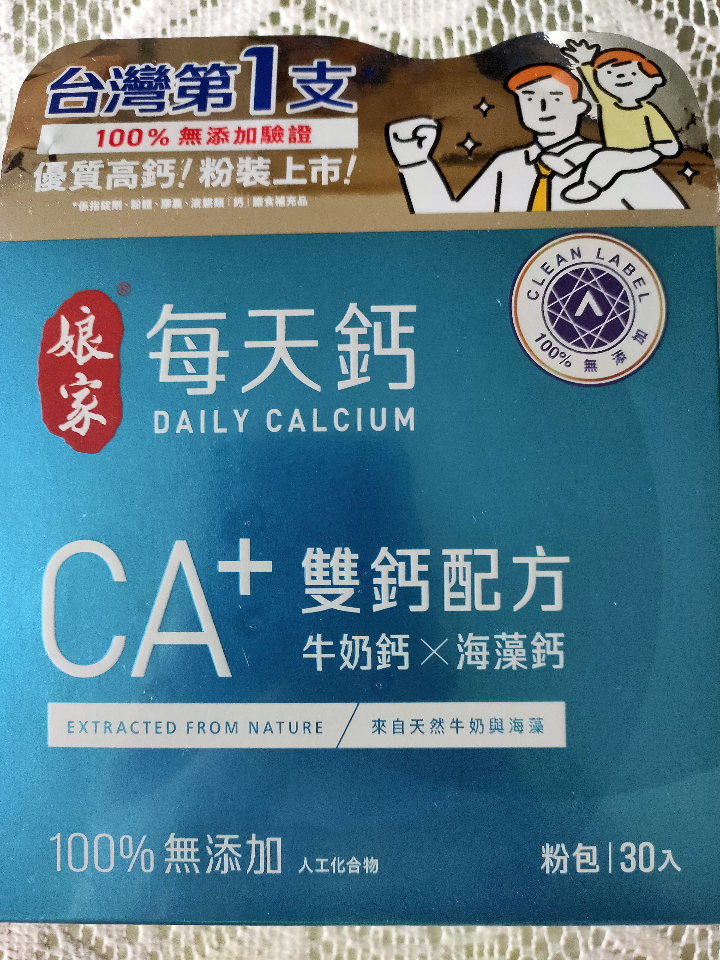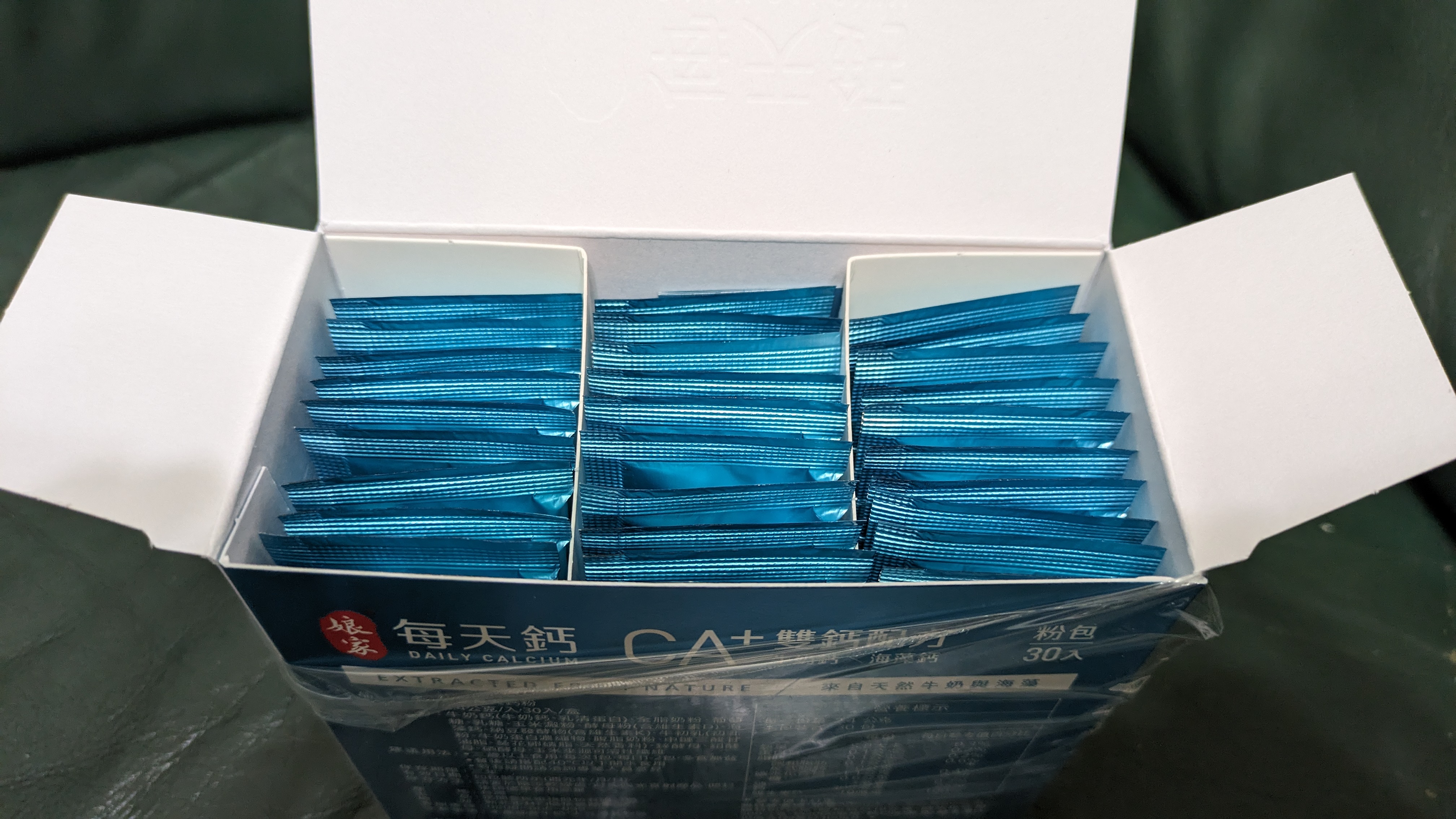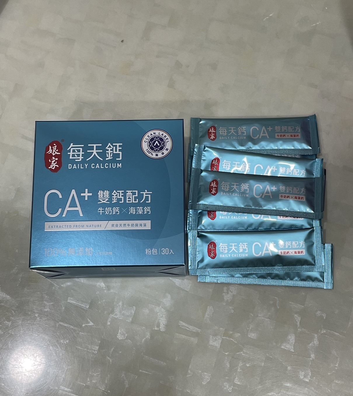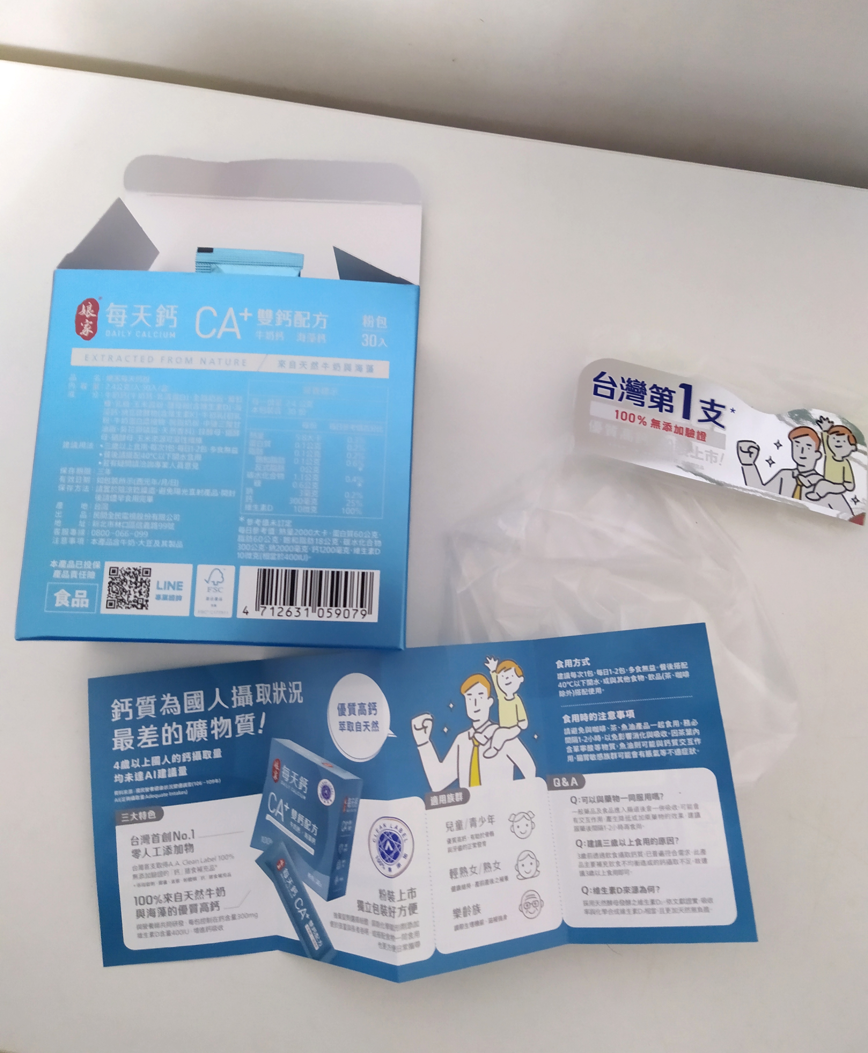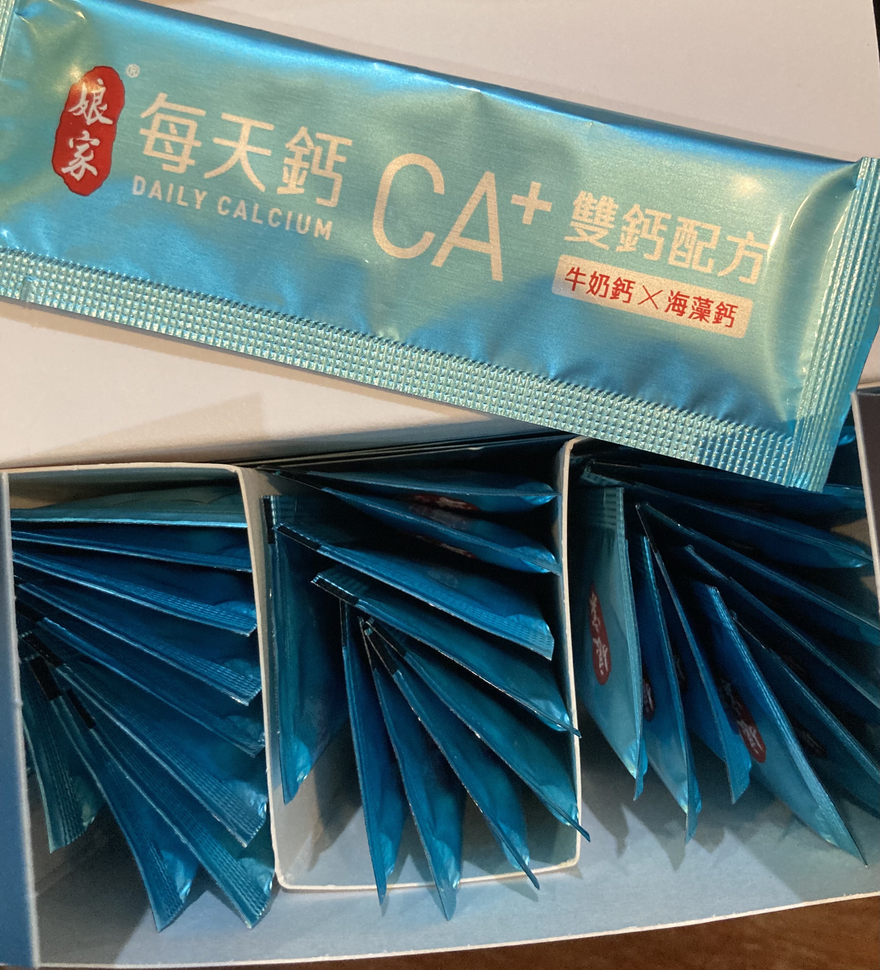 牛奶鈣(牛奶鈣、乳清蛋白)、全脂奶粉、葡萄糖、乳糖、玉米澱粉、酵母粉(含維生素D)、海藻鈣、納豆發酵物(含維生素K)、牛初乳(初乳粉、牛奶蛋白濃縮物、脫脂奶粉、中鏈三酸甘油脂、葵花卵磷脂、天然香料)、鋅酵母、鉬酵母、硒酵母、玉米來源可溶性纖維。