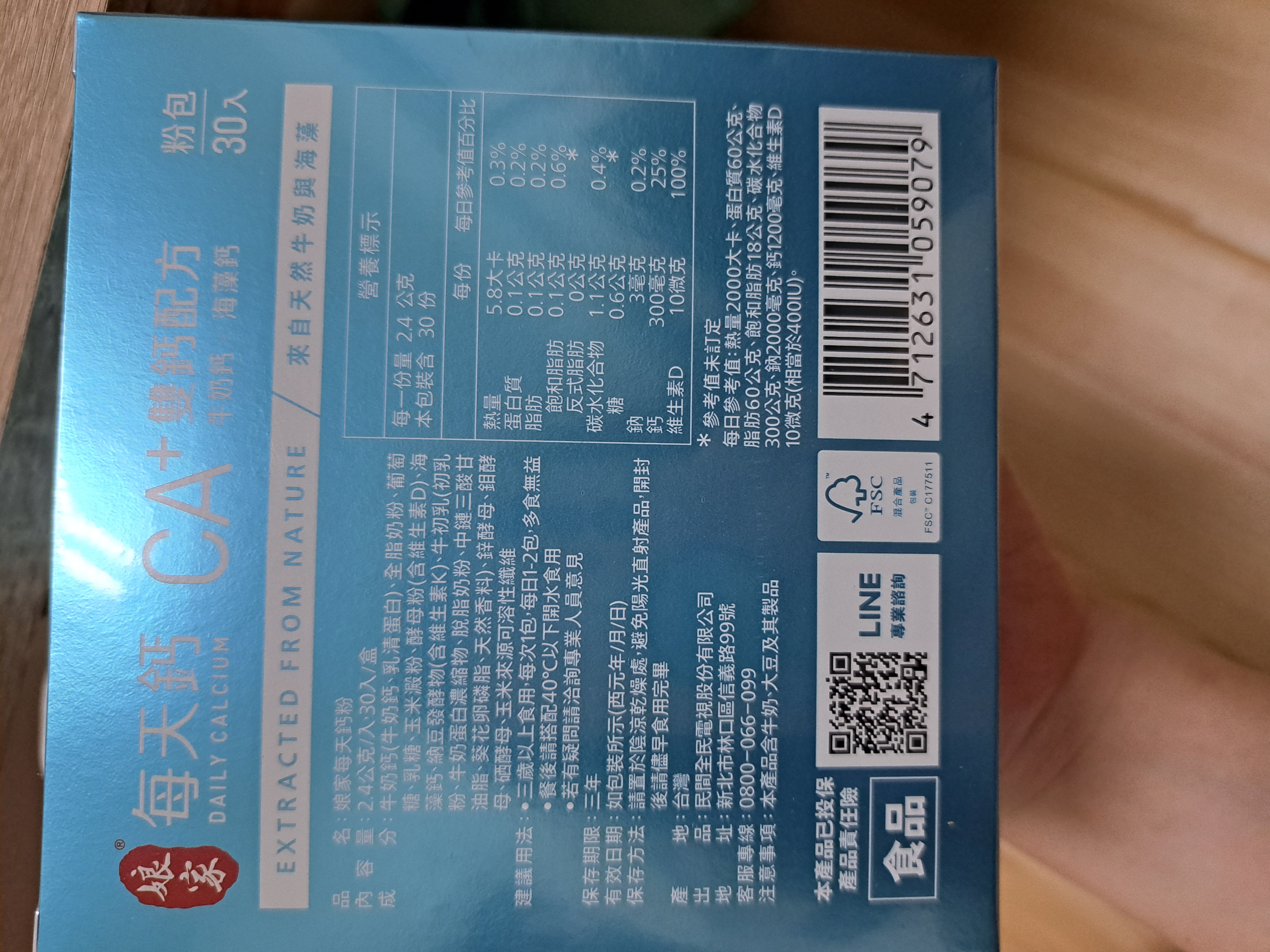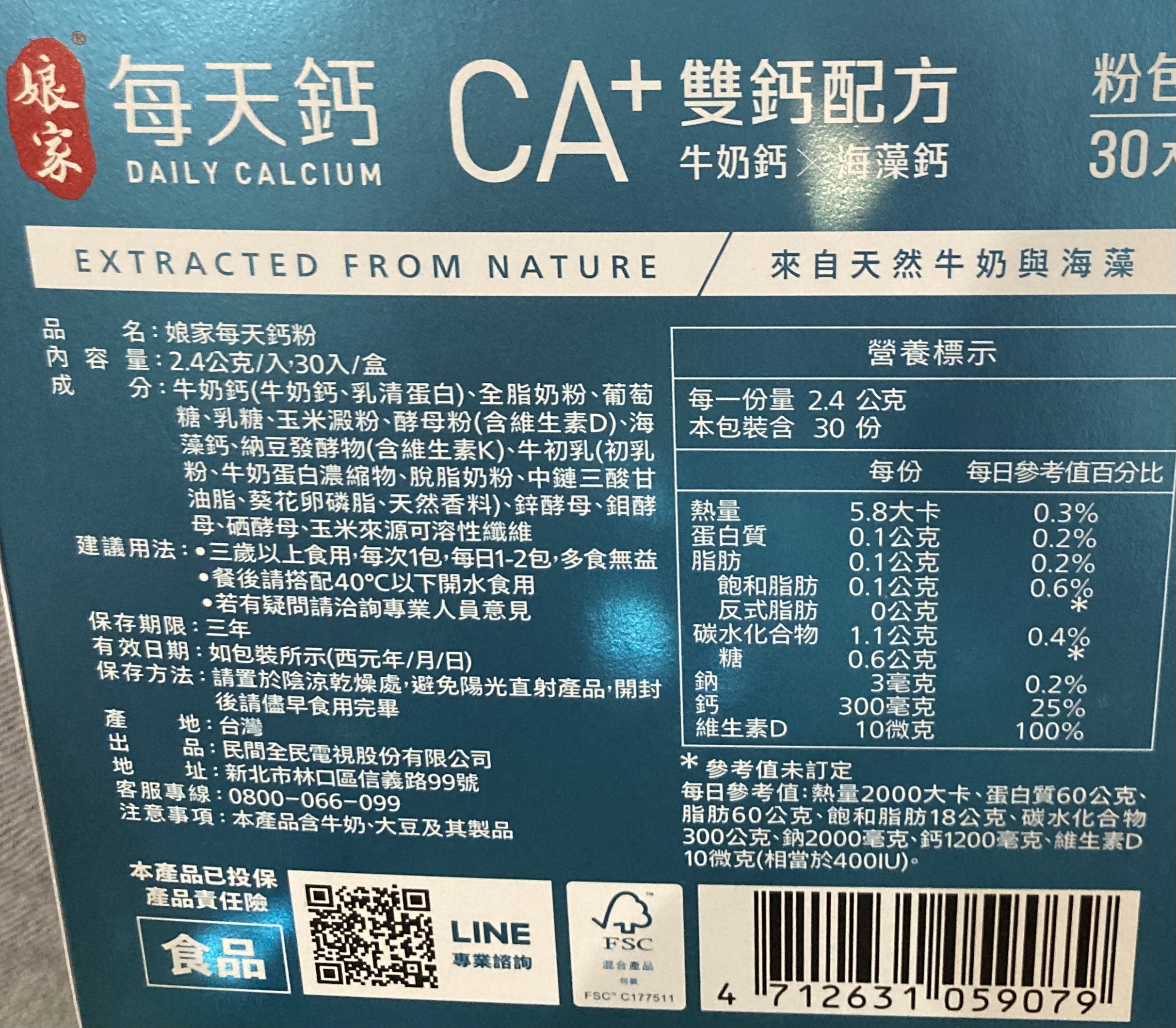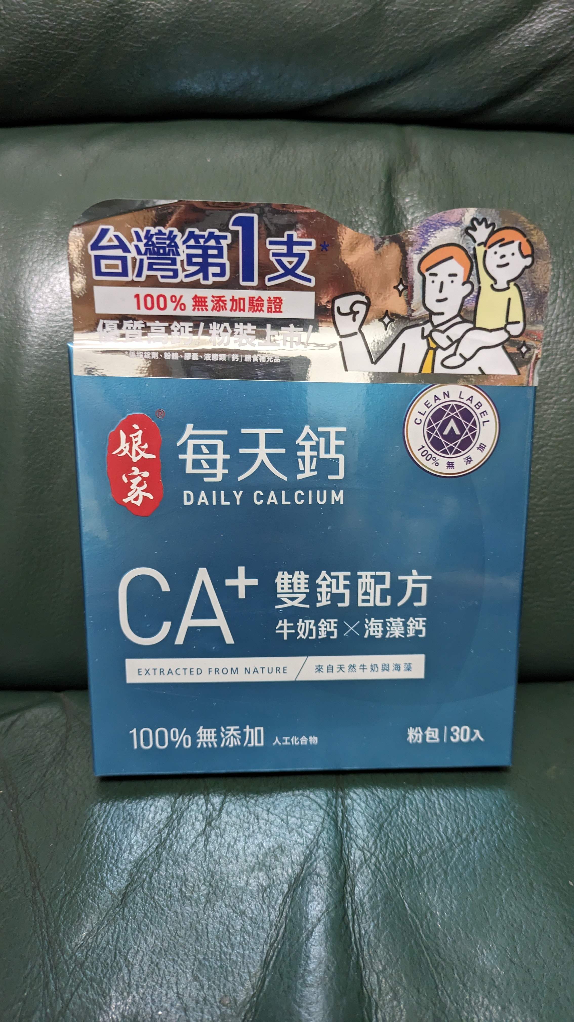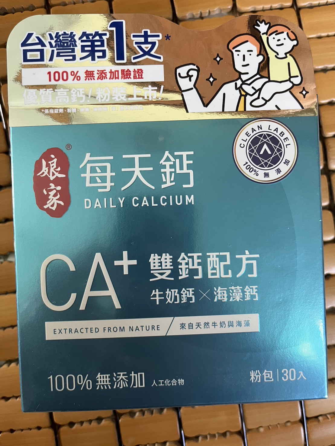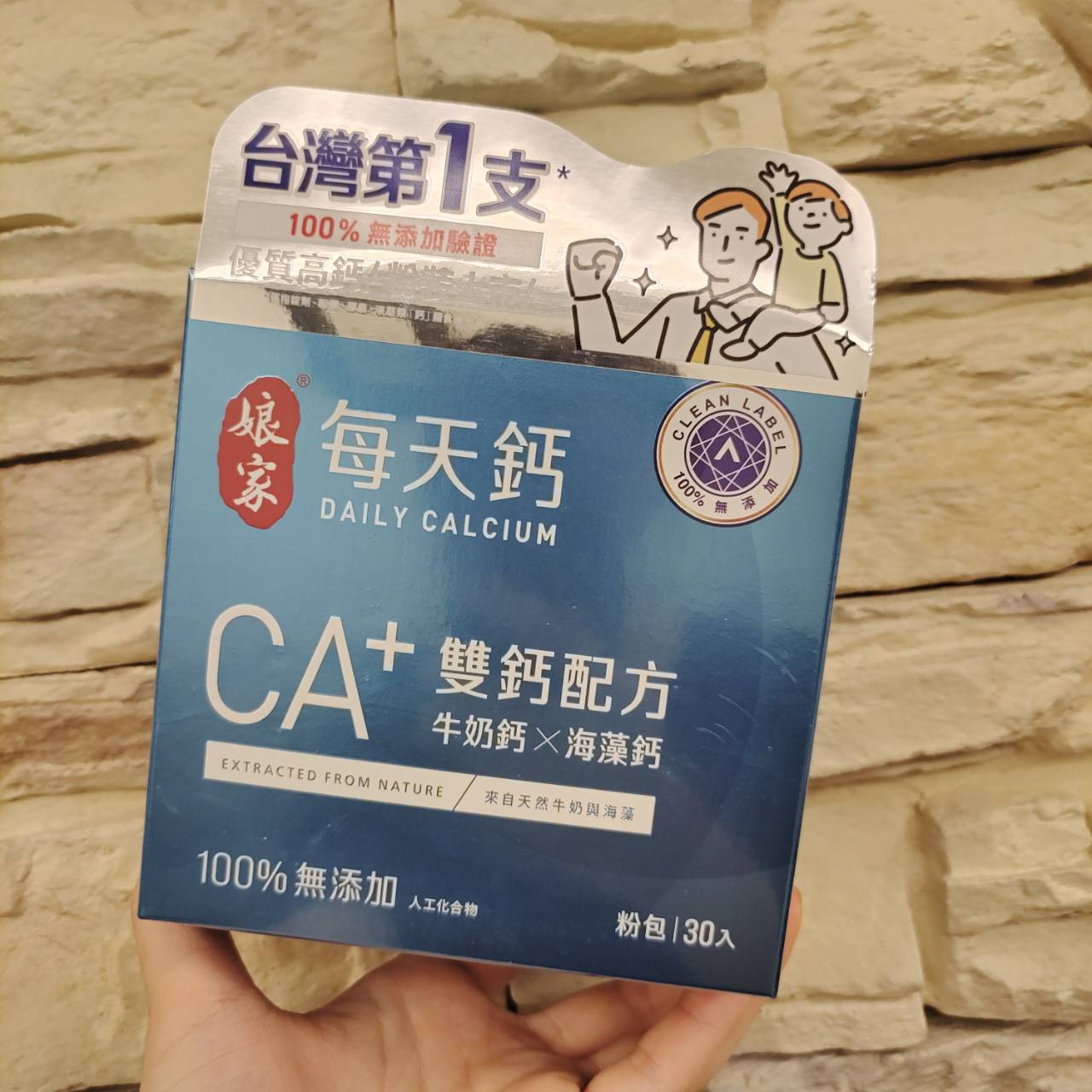 牛奶鈣(牛奶鈣、乳清蛋白)、全脂奶粉、葡萄糖、乳糖、玉米澱粉、酵母粉(含維生素D)、海藻鈣、納豆發酵物(含維生素K)、牛初乳(初乳粉、牛奶蛋白濃縮物、脫脂奶粉、中鏈三酸甘油脂、葵花卵磷脂、天然香料)、鋅酵母、鉬酵母、硒酵母、玉米來源可溶性纖維。