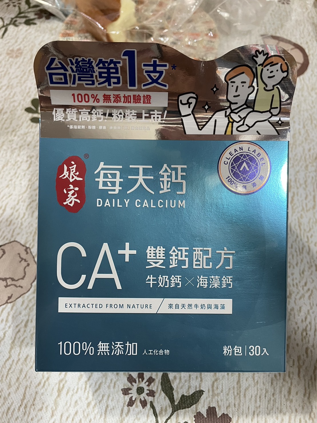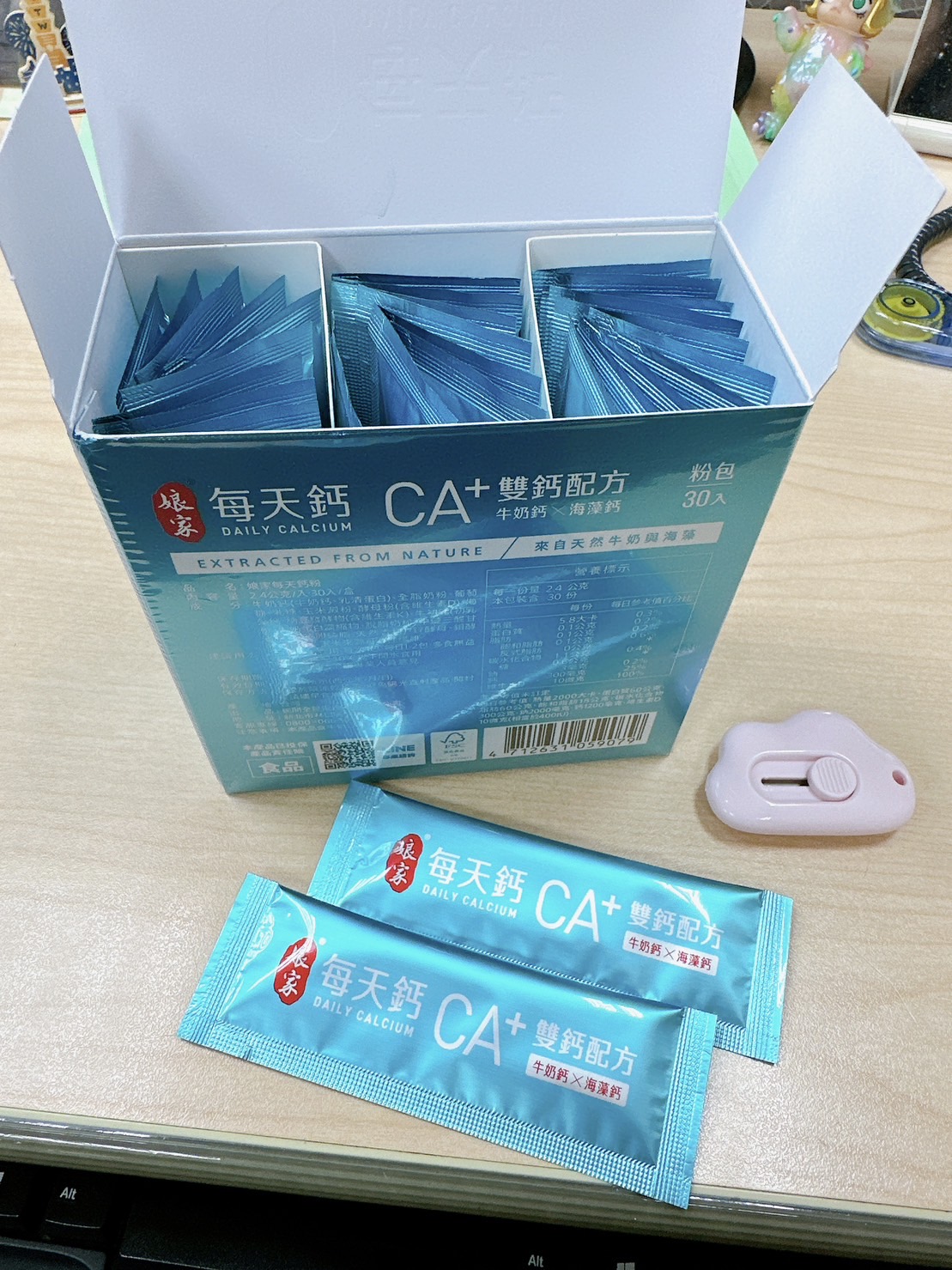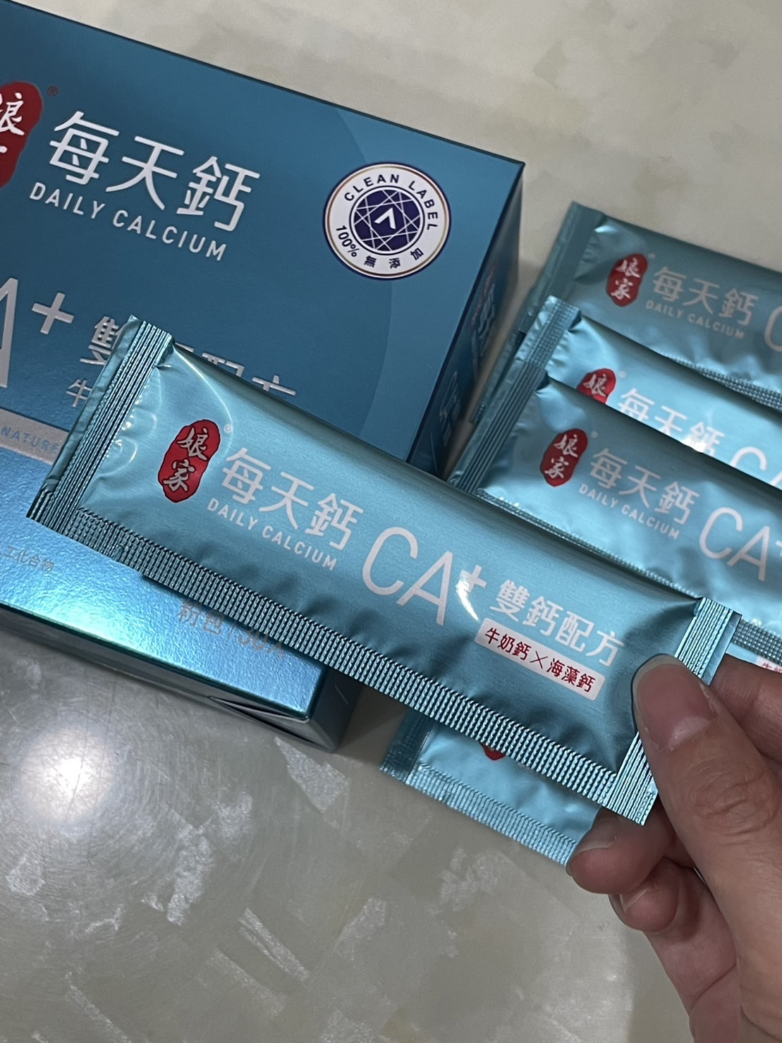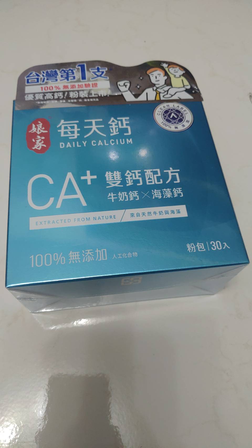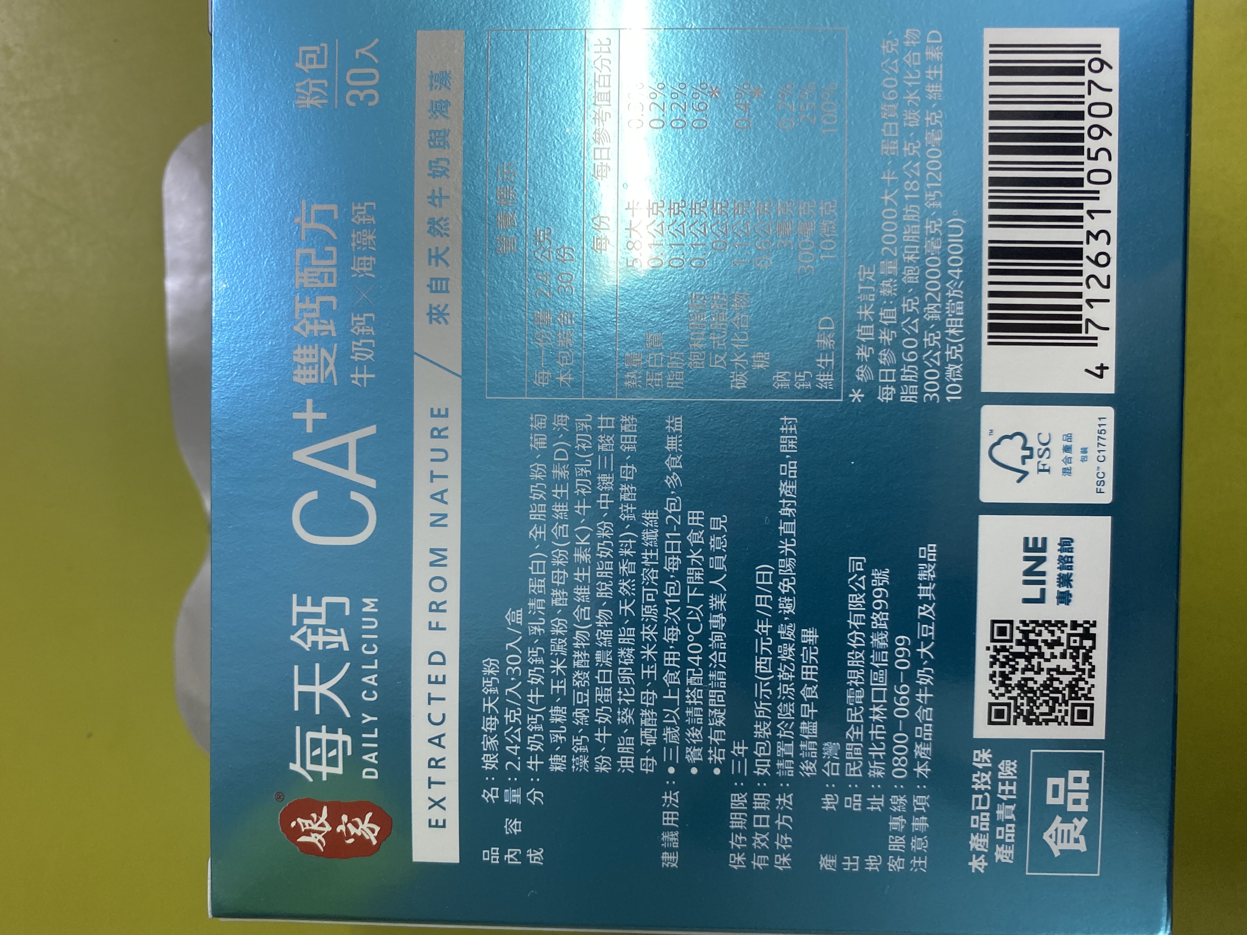牛奶鈣(牛奶鈣、乳清蛋白)、全脂奶粉、葡萄糖、乳糖、玉米澱粉、酵母粉(含維生素D)、海藻鈣、納豆發酵物(含維生素K)、牛初乳(初乳粉、牛奶蛋白濃縮物、脫脂奶粉、中鏈三酸甘油脂、葵花卵磷脂、天然香料)、鋅酵母、鉬酵母、硒酵母、玉米來源可溶性纖維。