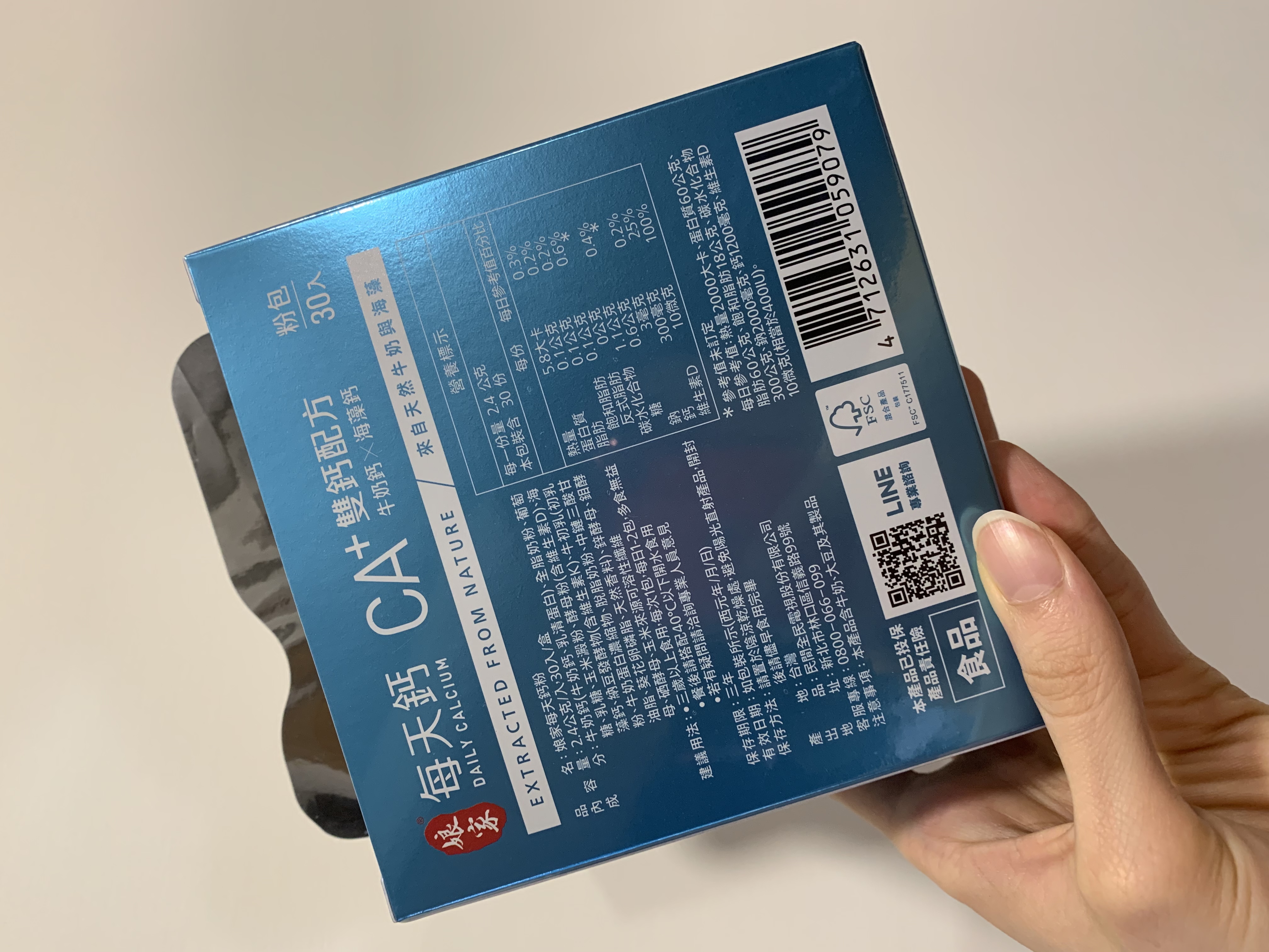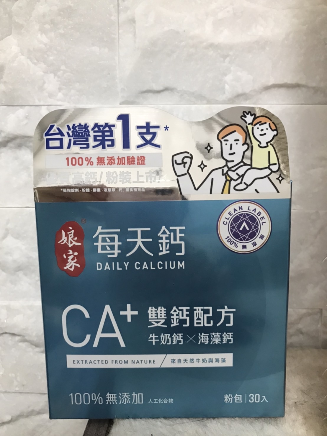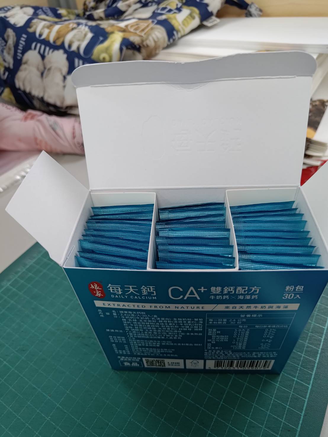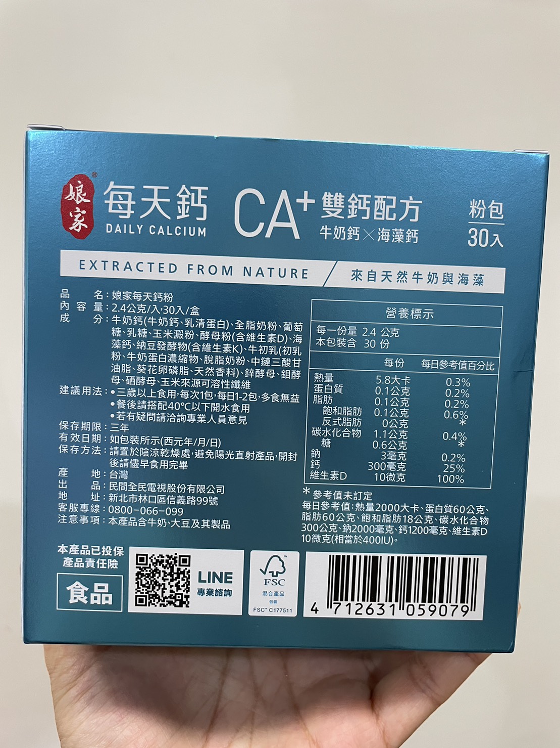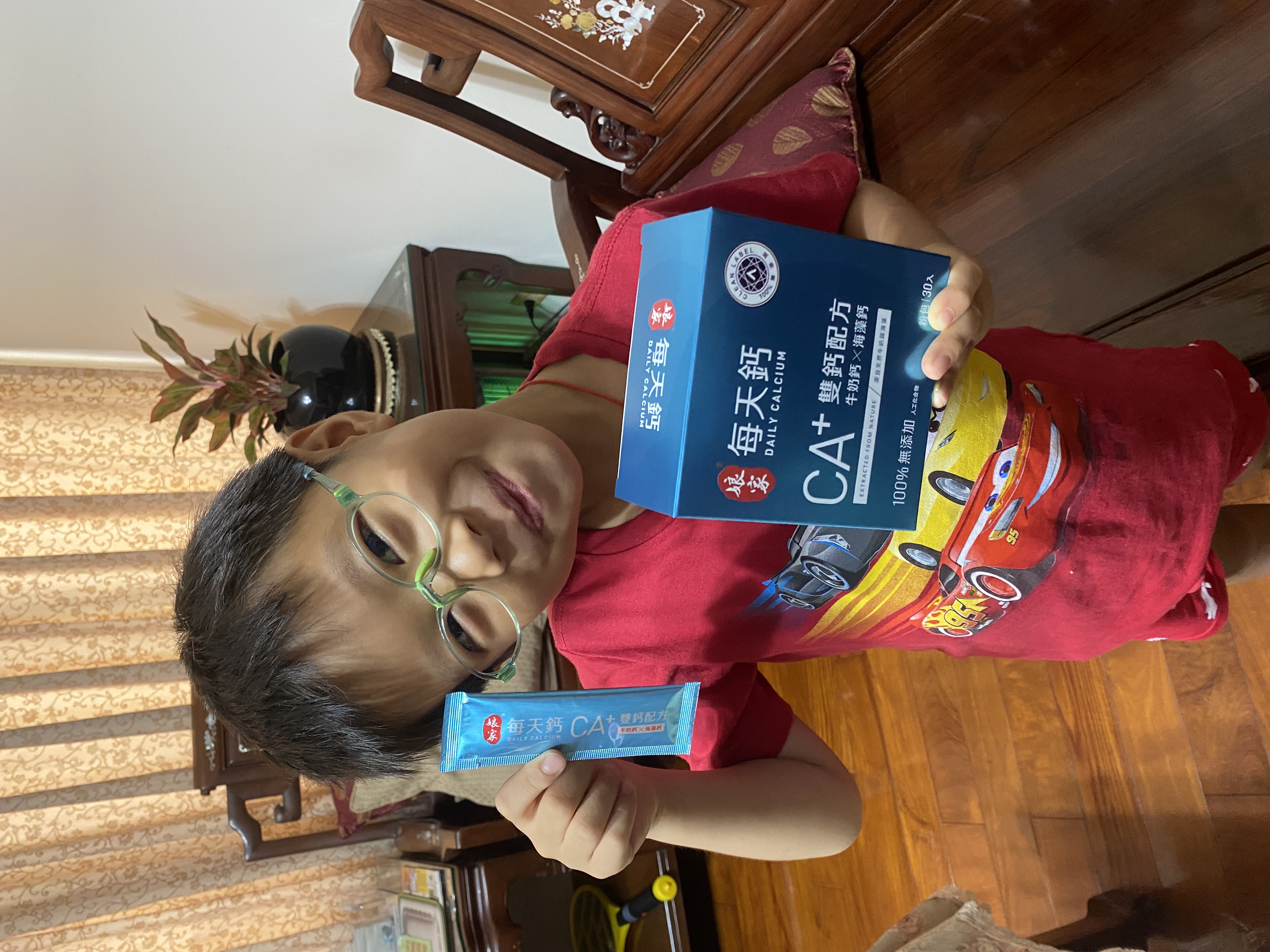 牛奶鈣(牛奶鈣、乳清蛋白)、全脂奶粉、葡萄糖、乳糖、玉米澱粉、酵母粉(含維生素D)、海藻鈣、納豆發酵物(含維生素K)、牛初乳(初乳粉、牛奶蛋白濃縮物、脫脂奶粉、中鏈三酸甘油脂、葵花卵磷脂、天然香料)、鋅酵母、鉬酵母、硒酵母、玉米來源可溶性纖維。