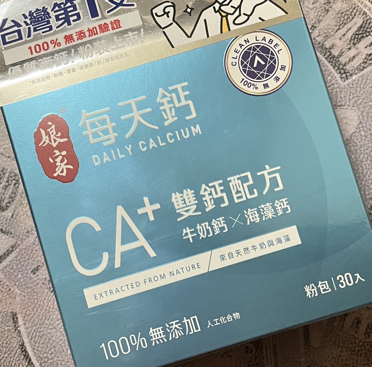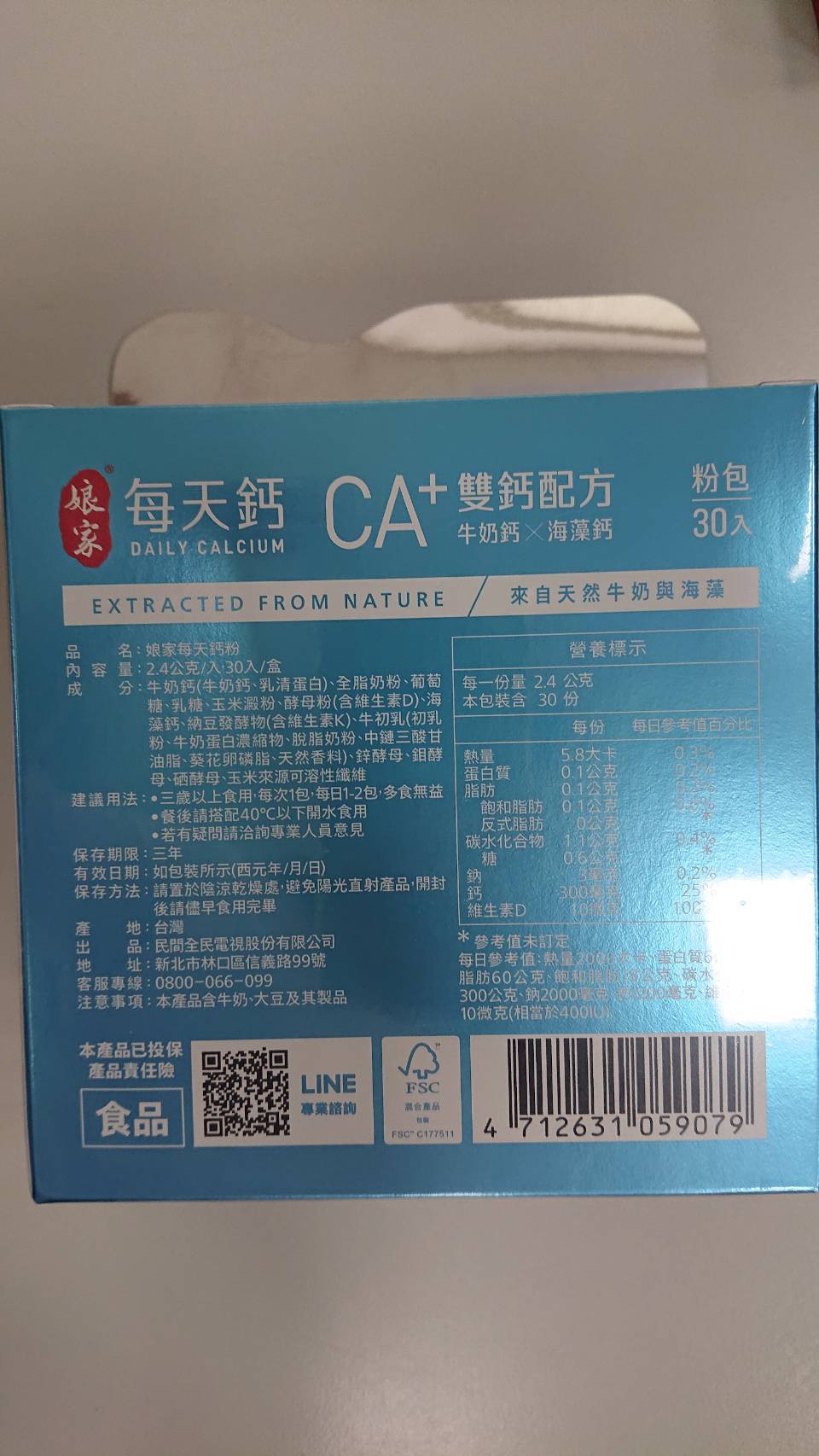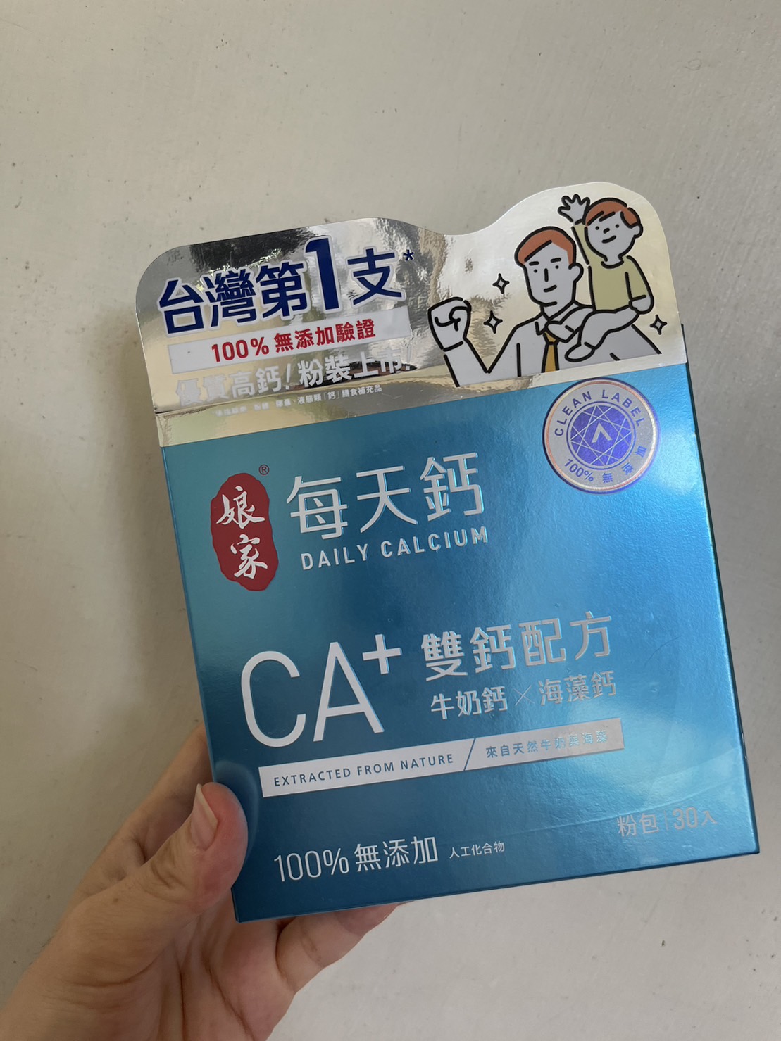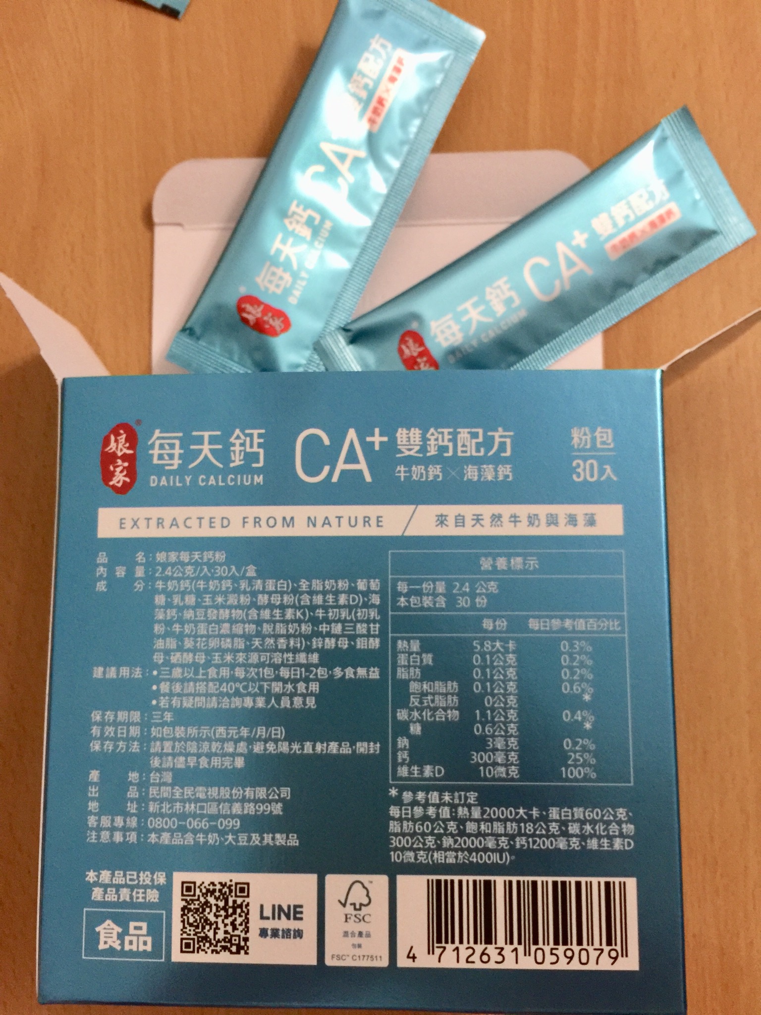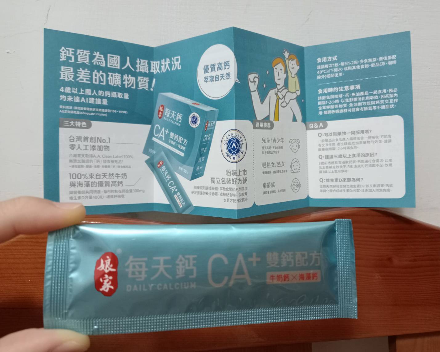 牛奶鈣(牛奶鈣、乳清蛋白)、全脂奶粉、葡萄糖、乳糖、玉米澱粉、酵母粉(含維生素D)、海藻鈣、納豆發酵物(含維生素K)、牛初乳(初乳粉、牛奶蛋白濃縮物、脫脂奶粉、中鏈三酸甘油脂、葵花卵磷脂、天然香料)、鋅酵母、鉬酵母、硒酵母、玉米來源可溶性纖維。