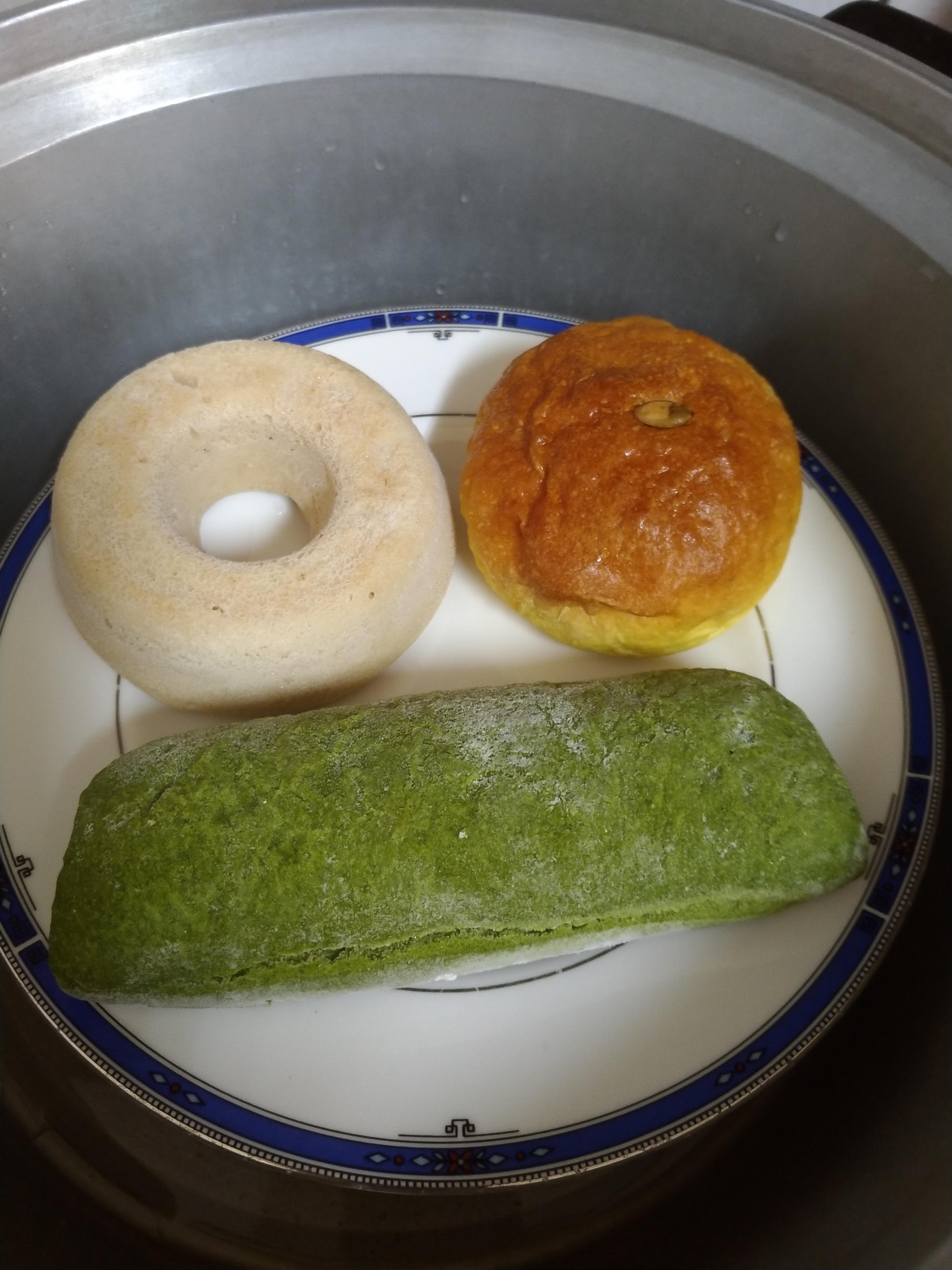 冷凍取出,使用一張乾淨的廚房紙巾,將飲用水完全噴溼紙巾後覆蓋在麵包上,以家用微波爐(600W) 60-80秒。