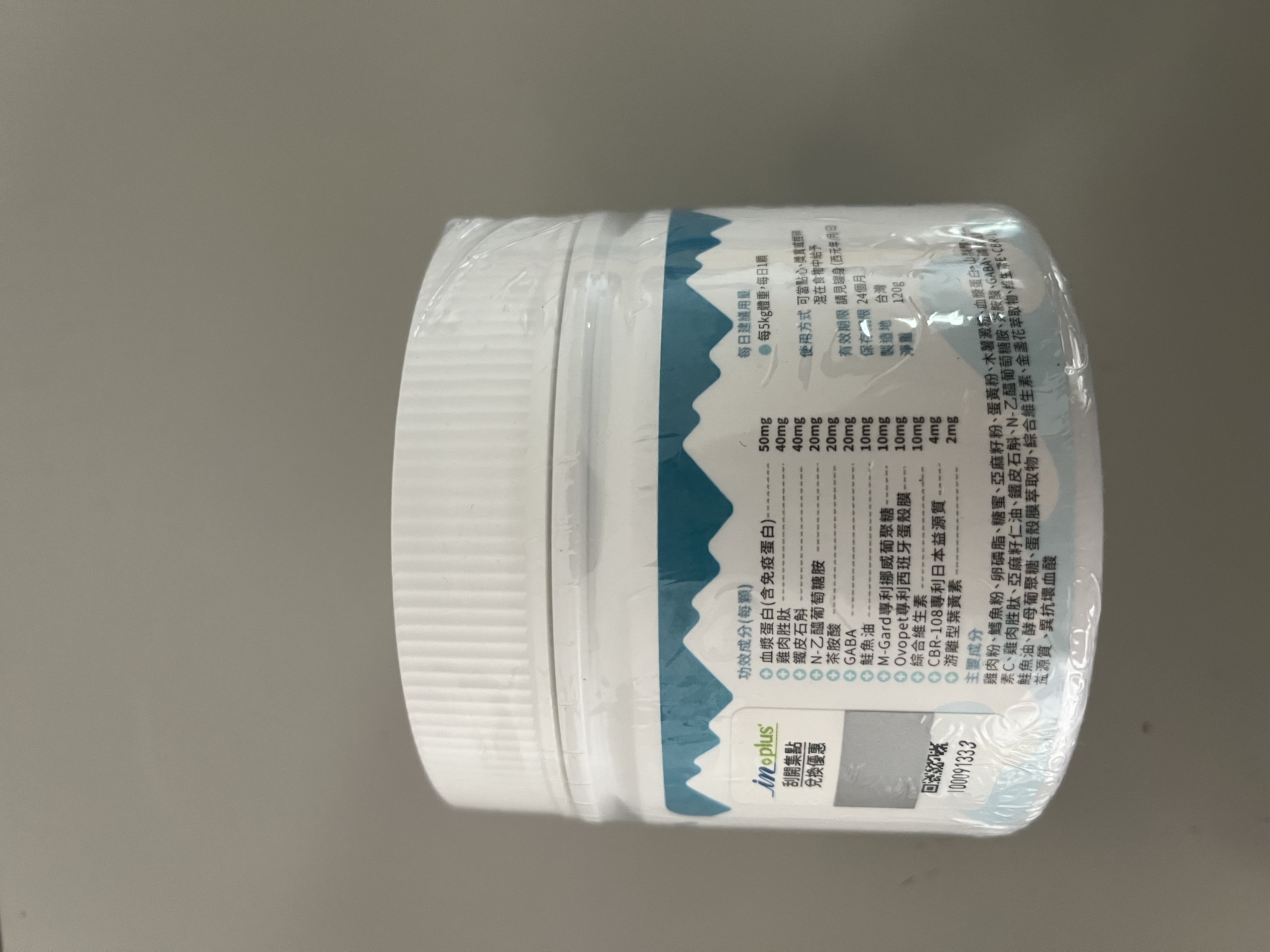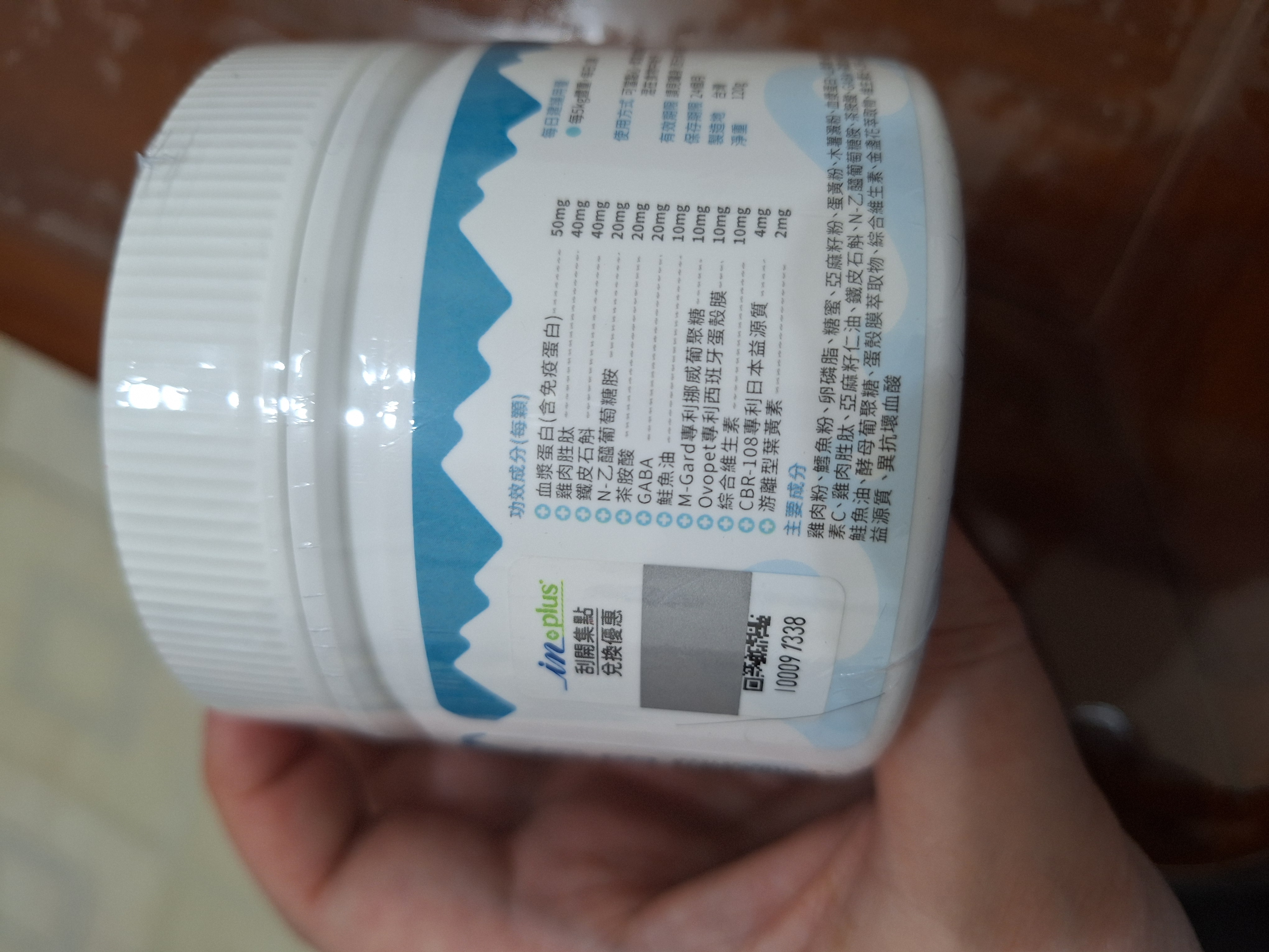 雞肉粉、鱈魚粉、卵磷脂、糖蜜、亞麻籽粉、蛋黃粉、木薯澱粉、血漿蛋白、山梨醇、維生素C、雞肉胜肽、小麥草、N-乙醯葡萄糖胺、茶胺酸、GABA、磷酸氫鈣、鮭魚油、酵母葡聚糖、蛋殼膜萃取物、綜合維生素、金盞花萃取物、維生素E、CBR-108益源質 、異抗壞血酸