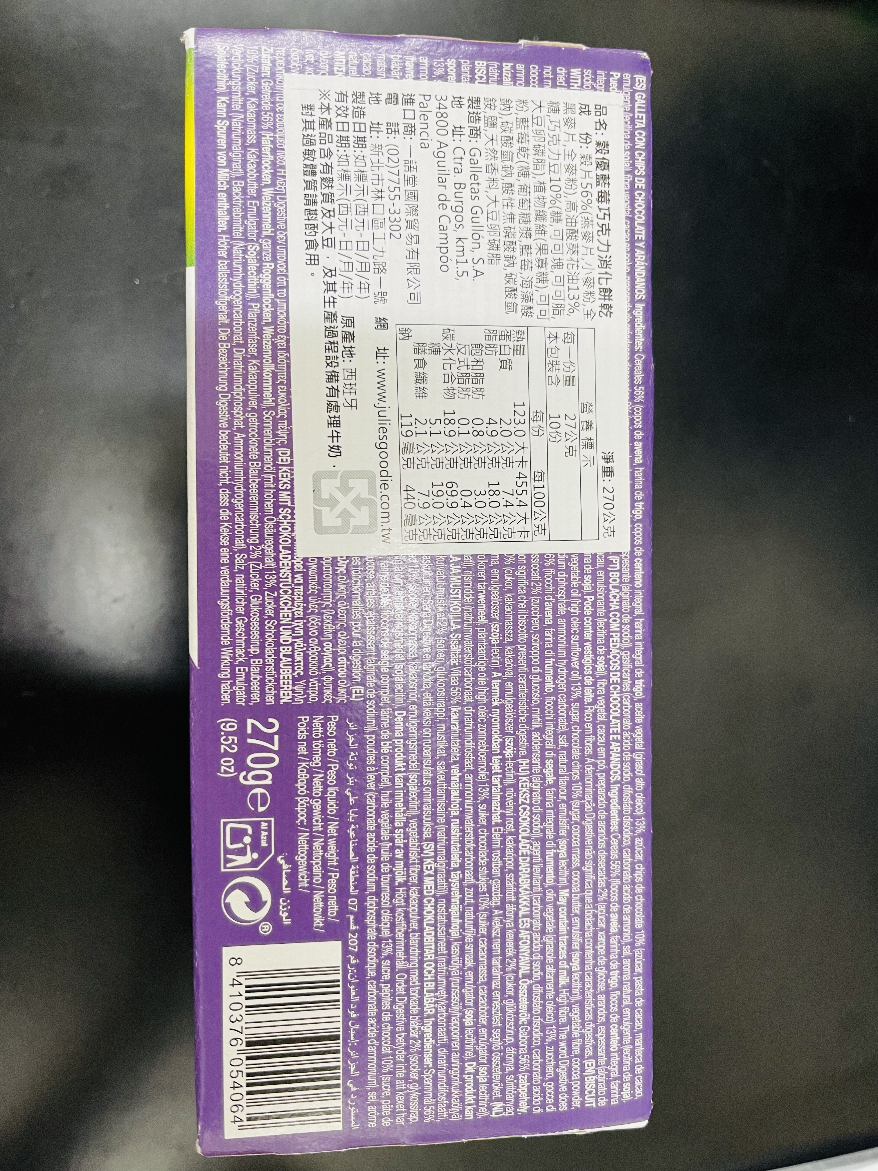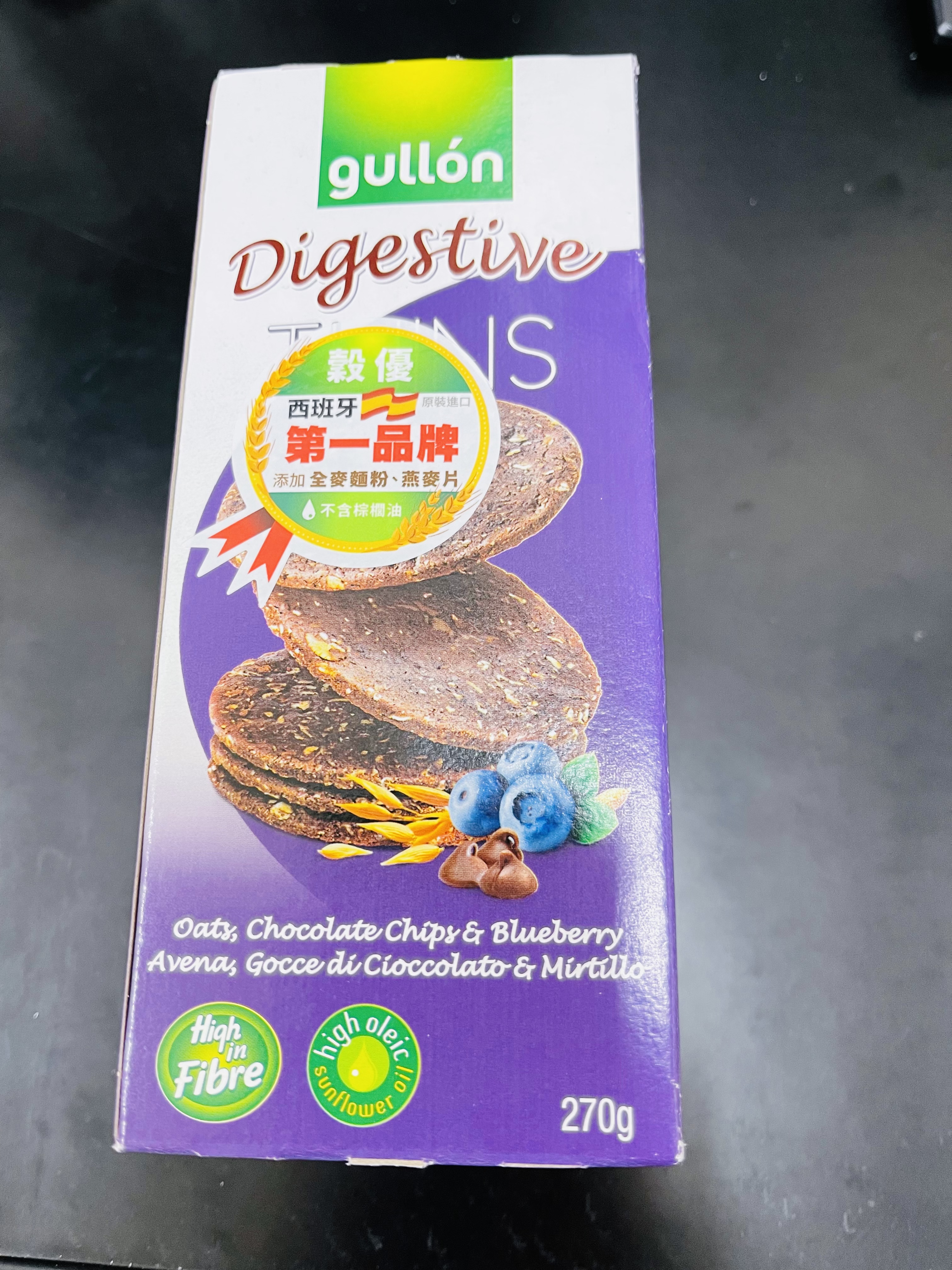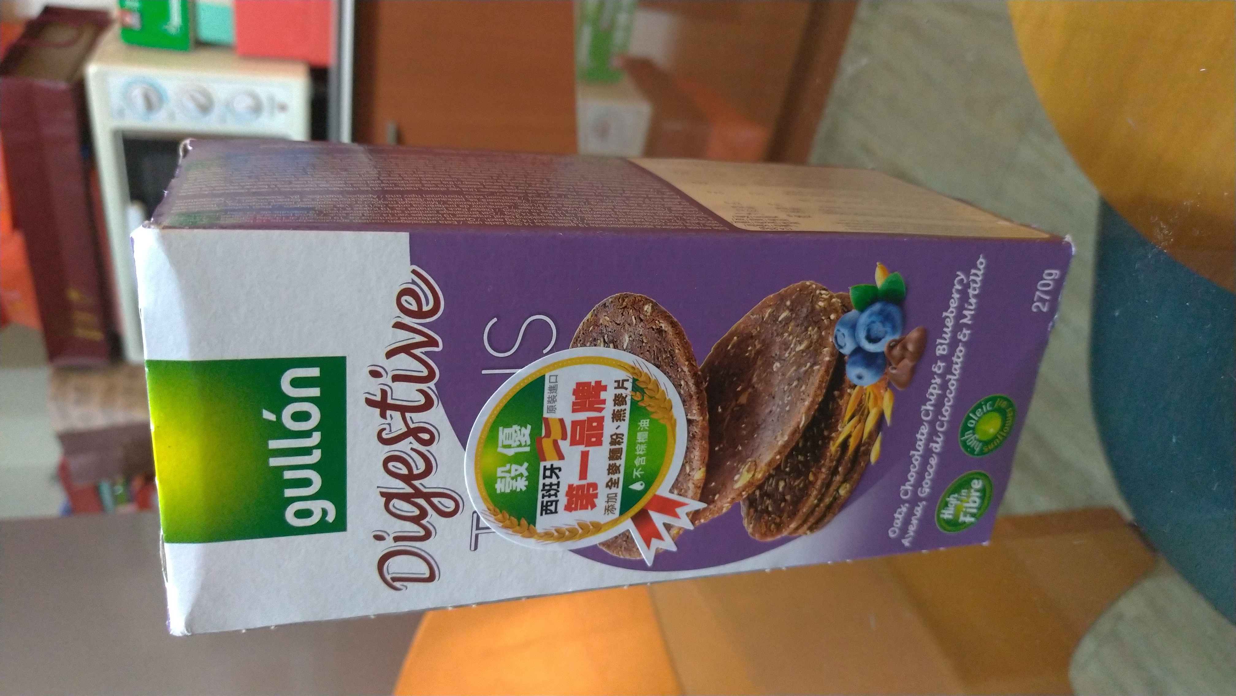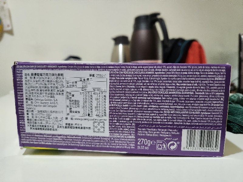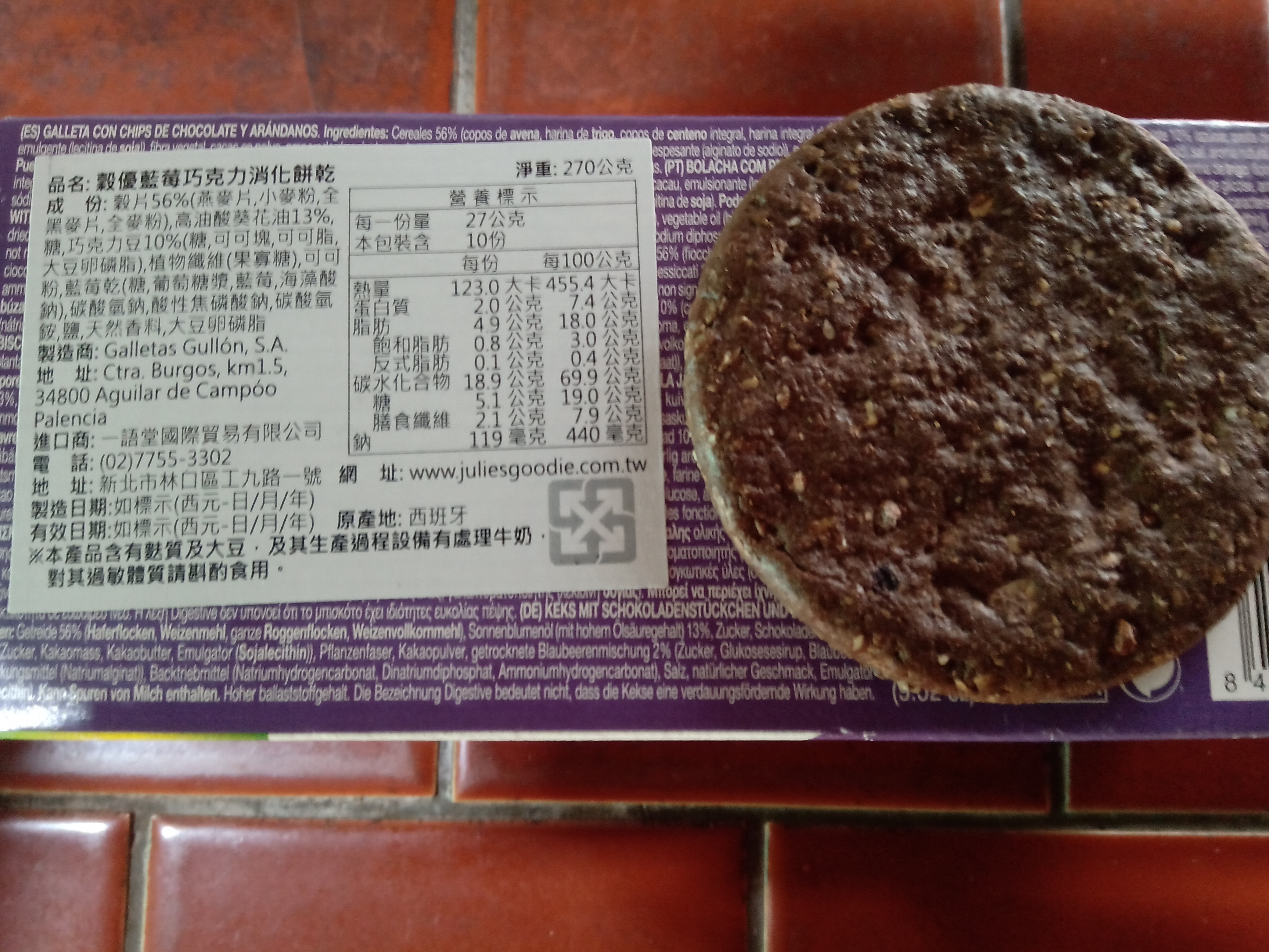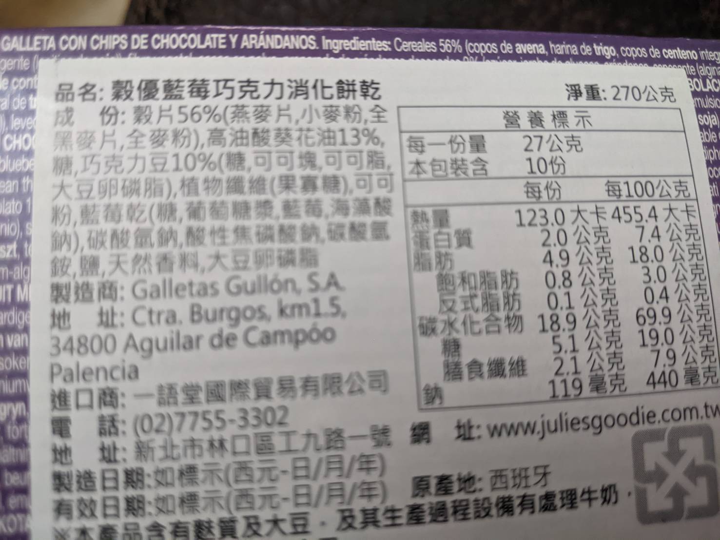 穀片56%(燕麥片、小麥粉、全黑麥片、全麥粉),高油酸葵花油13%,糖,巧克力豆10%(糖、可可塊、可可脂、大豆卵磷脂),植物纖維(果寡糖),可可粉,藍莓乾(糖、葡萄糖漿、藍莓、海藻酸鈉),碳酸氫鈉,酸性焦磷酸鈉,碳酸氫銨,鹽,天然香料,大豆卵磷脂。