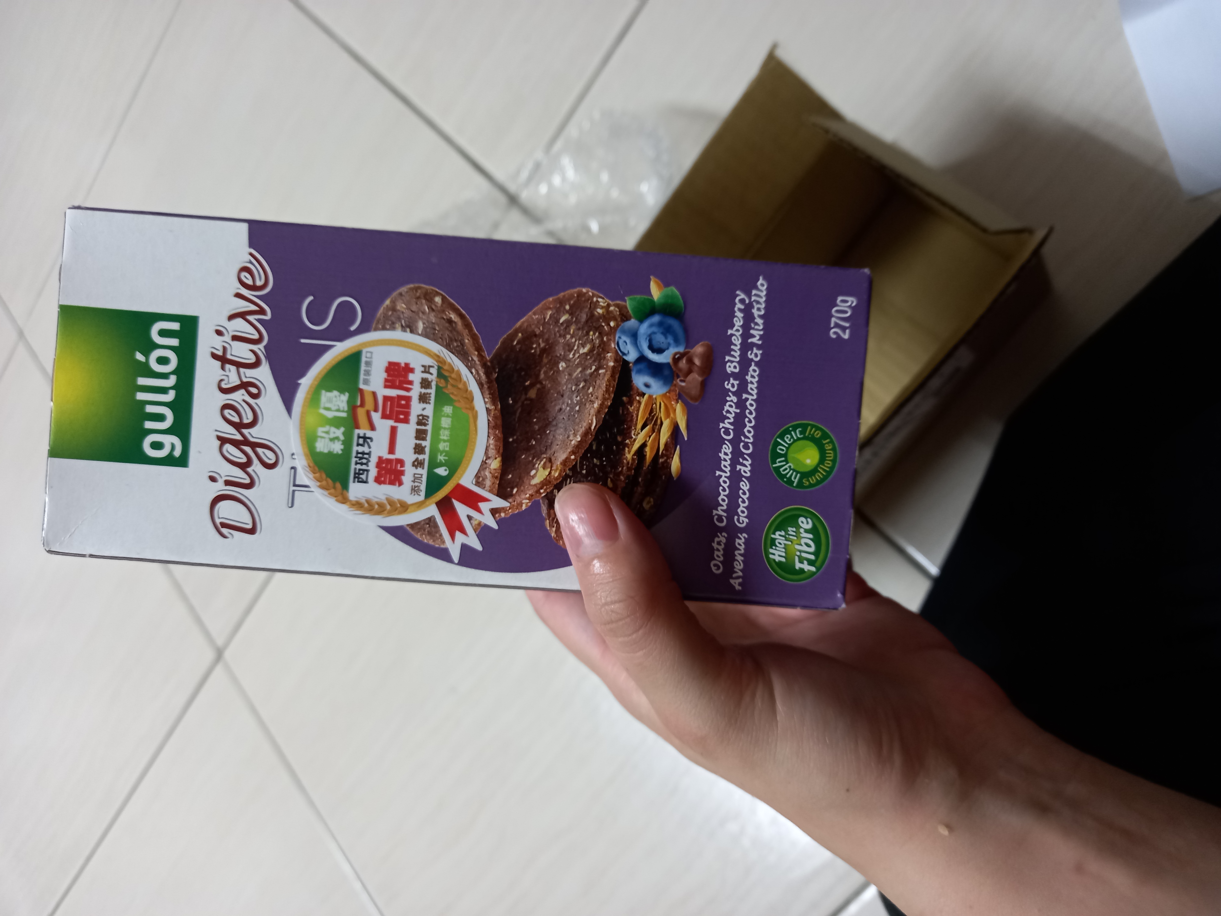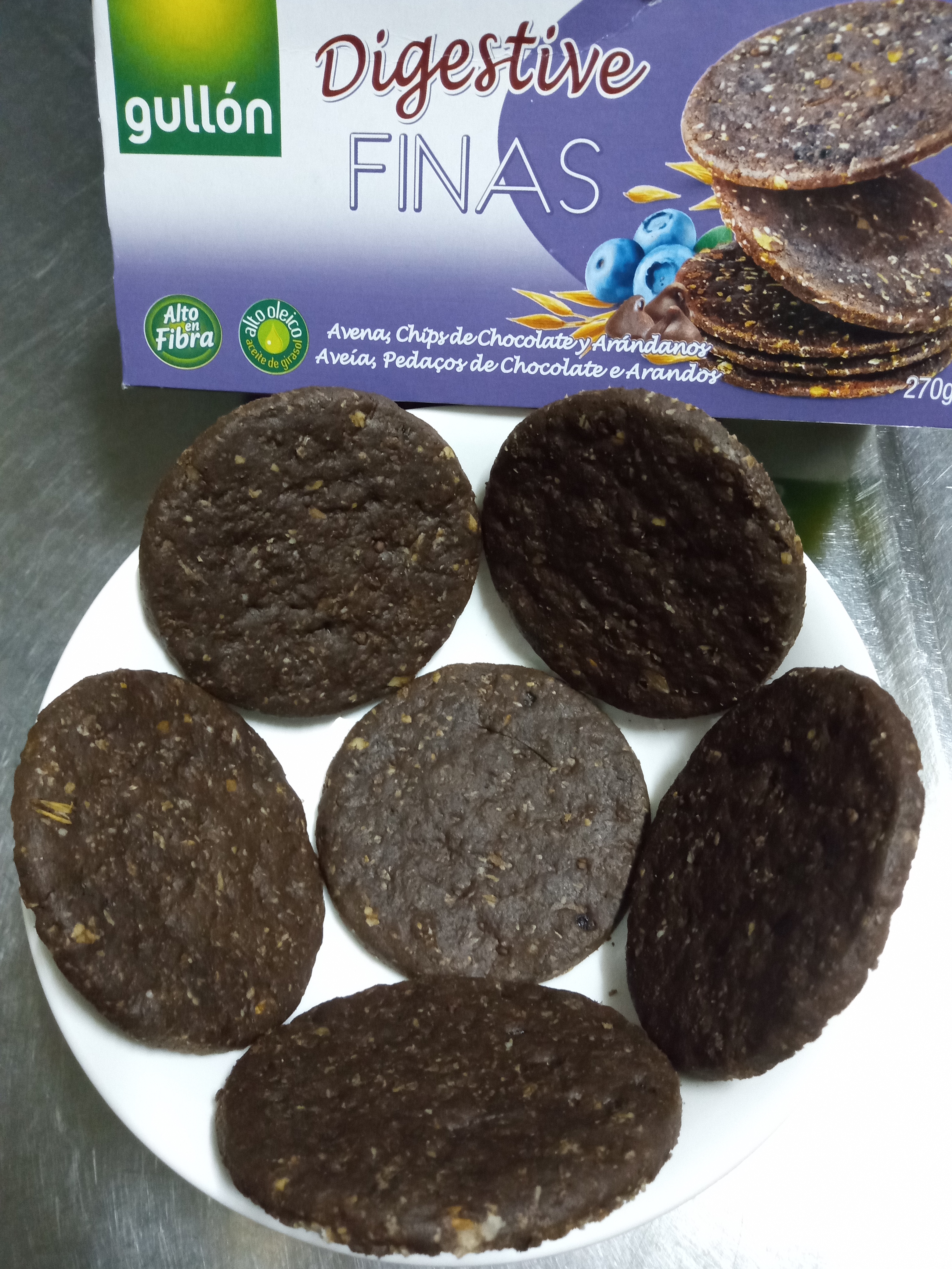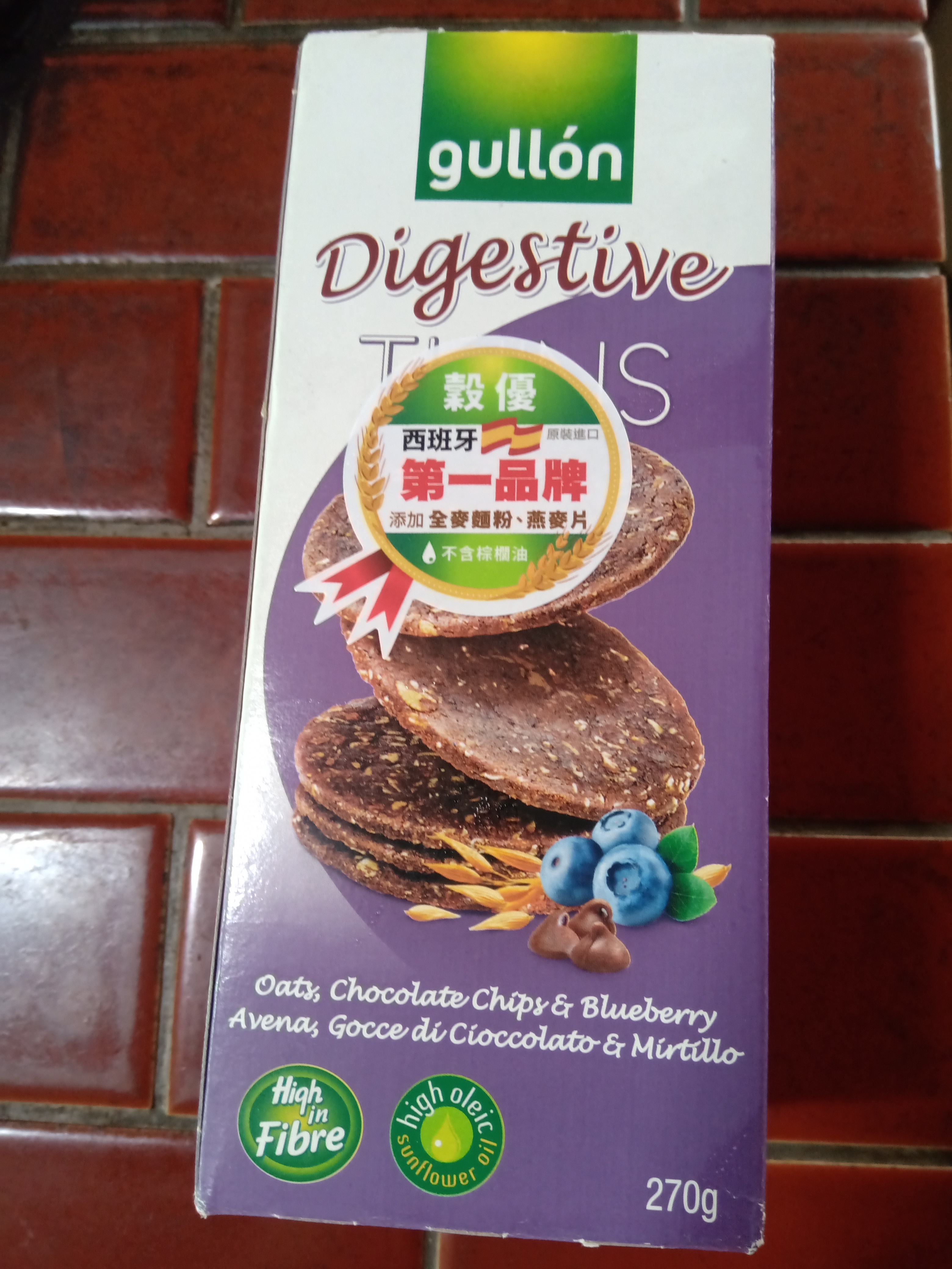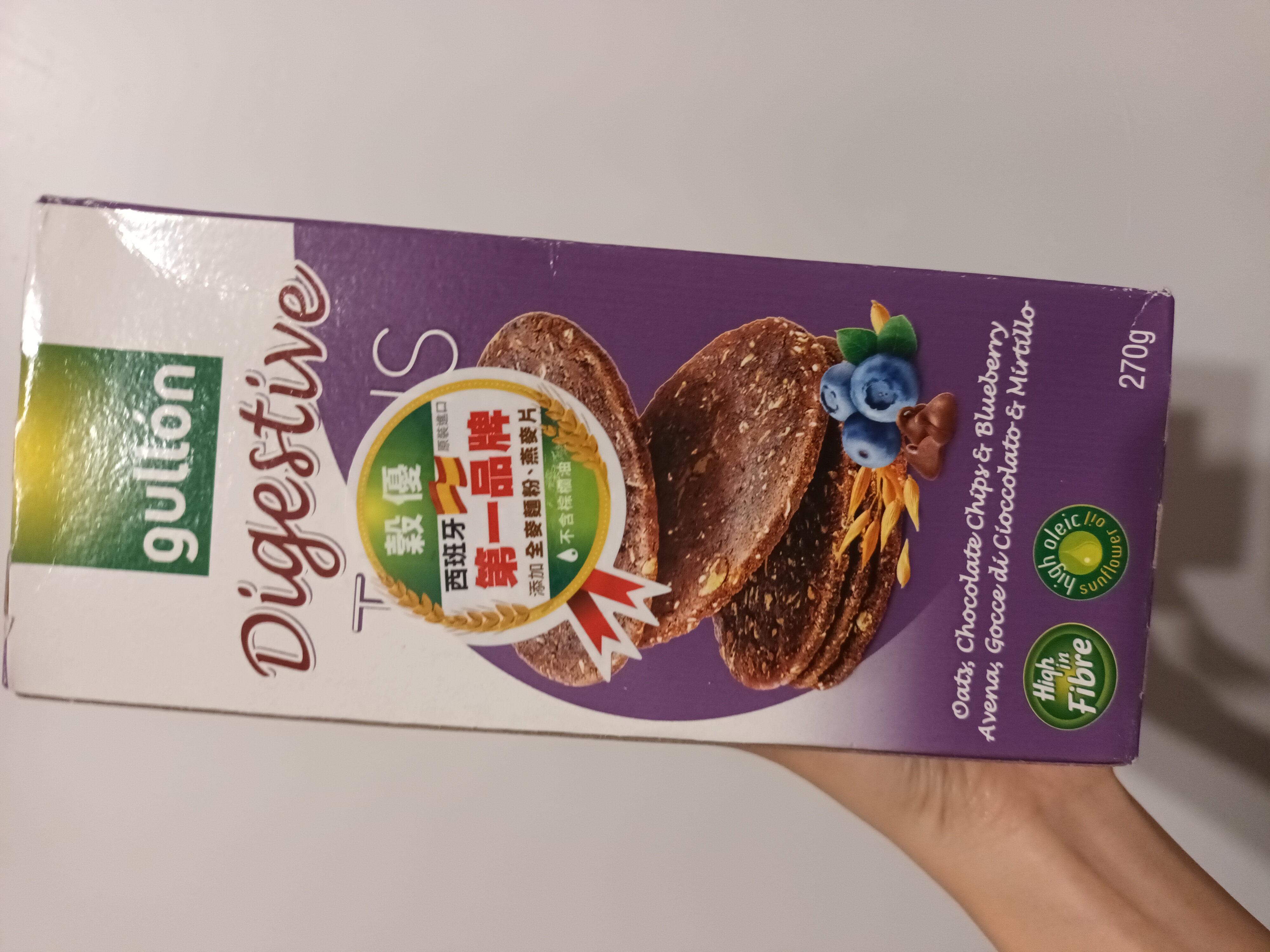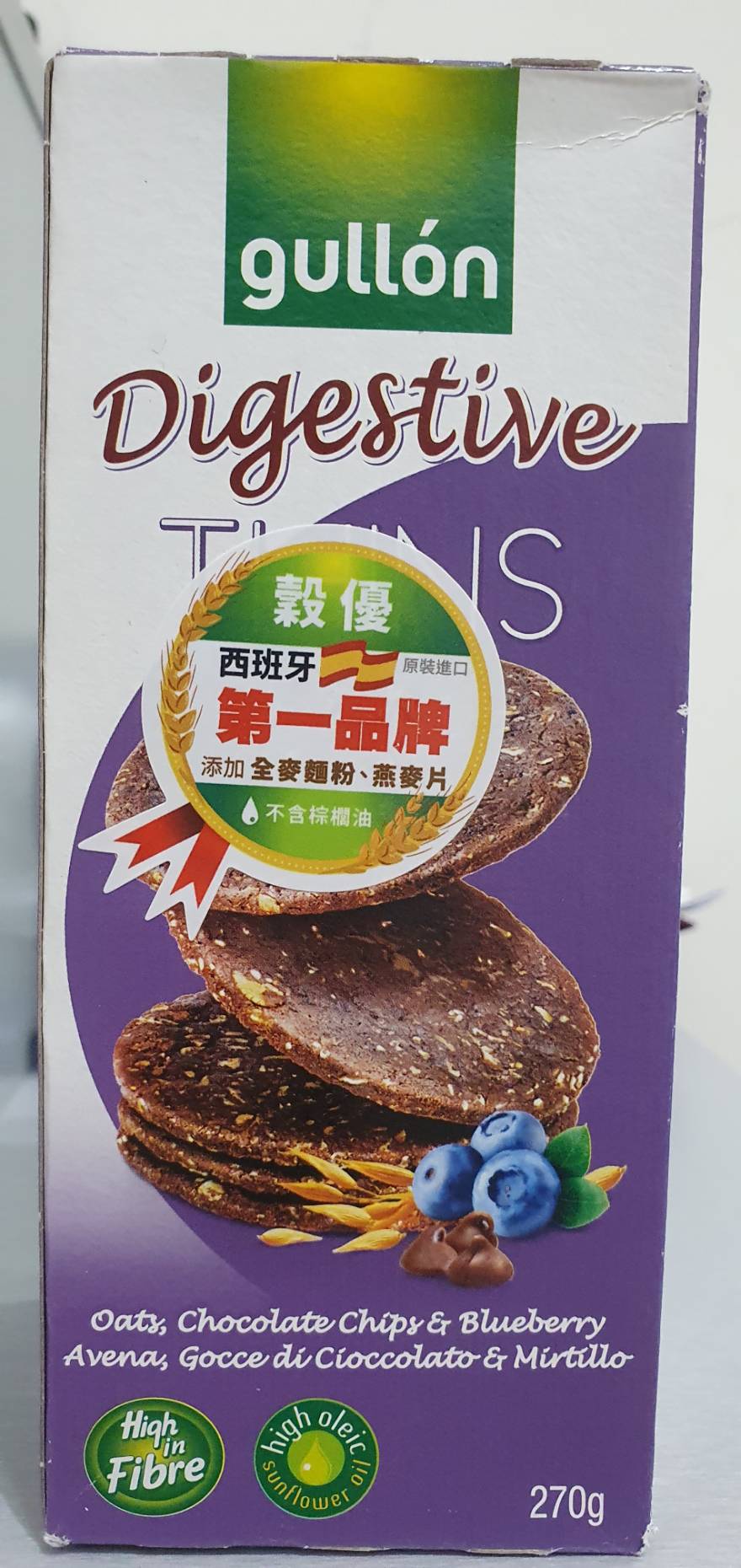 穀片56%(燕麥片、小麥粉、全黑麥片、全麥粉),高油酸葵花油13%,糖,巧克力豆10%(糖、可可塊、可可脂、大豆卵磷脂),植物纖維(果寡糖),可可粉,藍莓乾(糖、葡萄糖漿、藍莓、海藻酸鈉),碳酸氫鈉,酸性焦磷酸鈉,碳酸氫銨,鹽,天然香料,大豆卵磷脂。