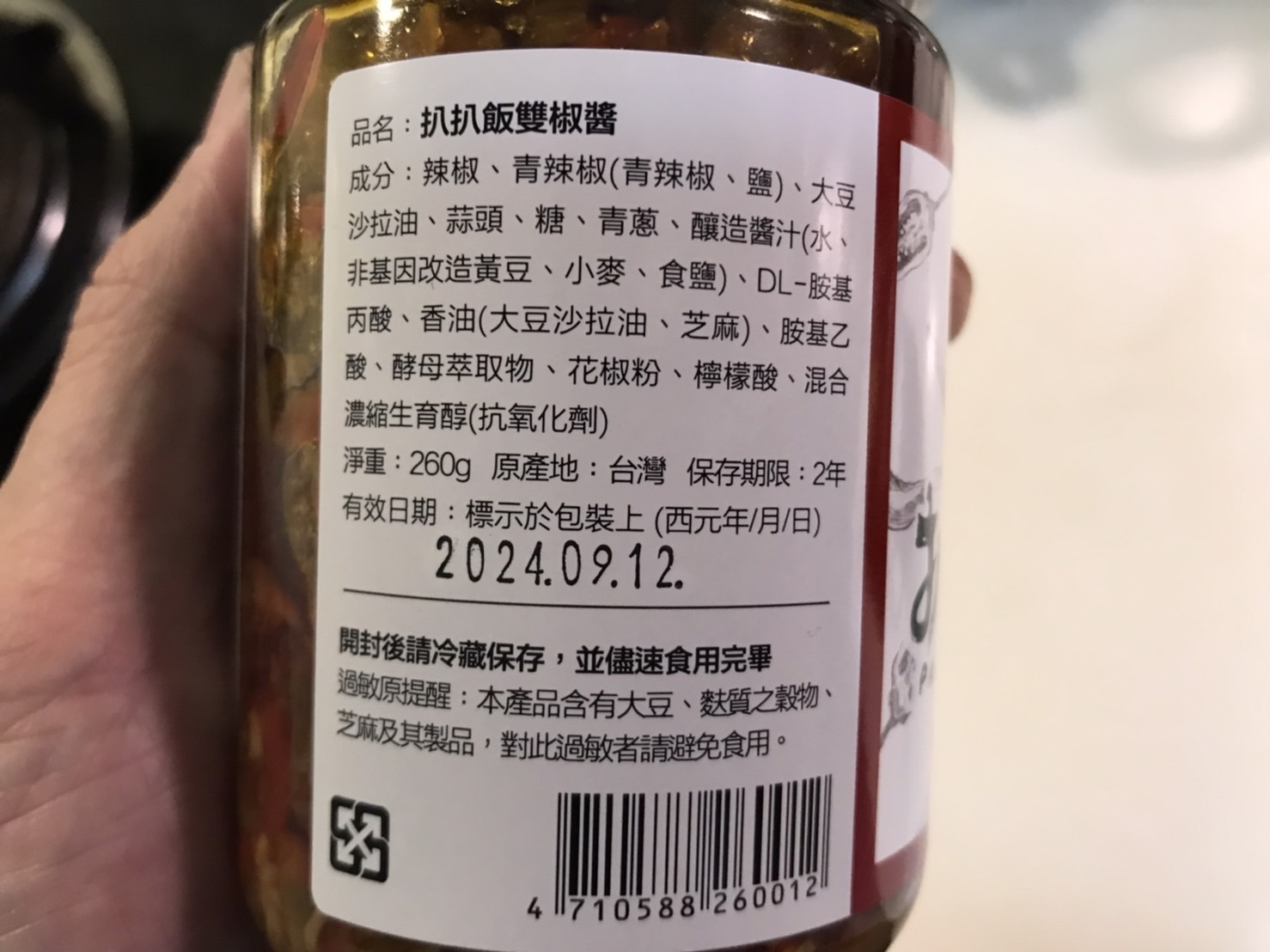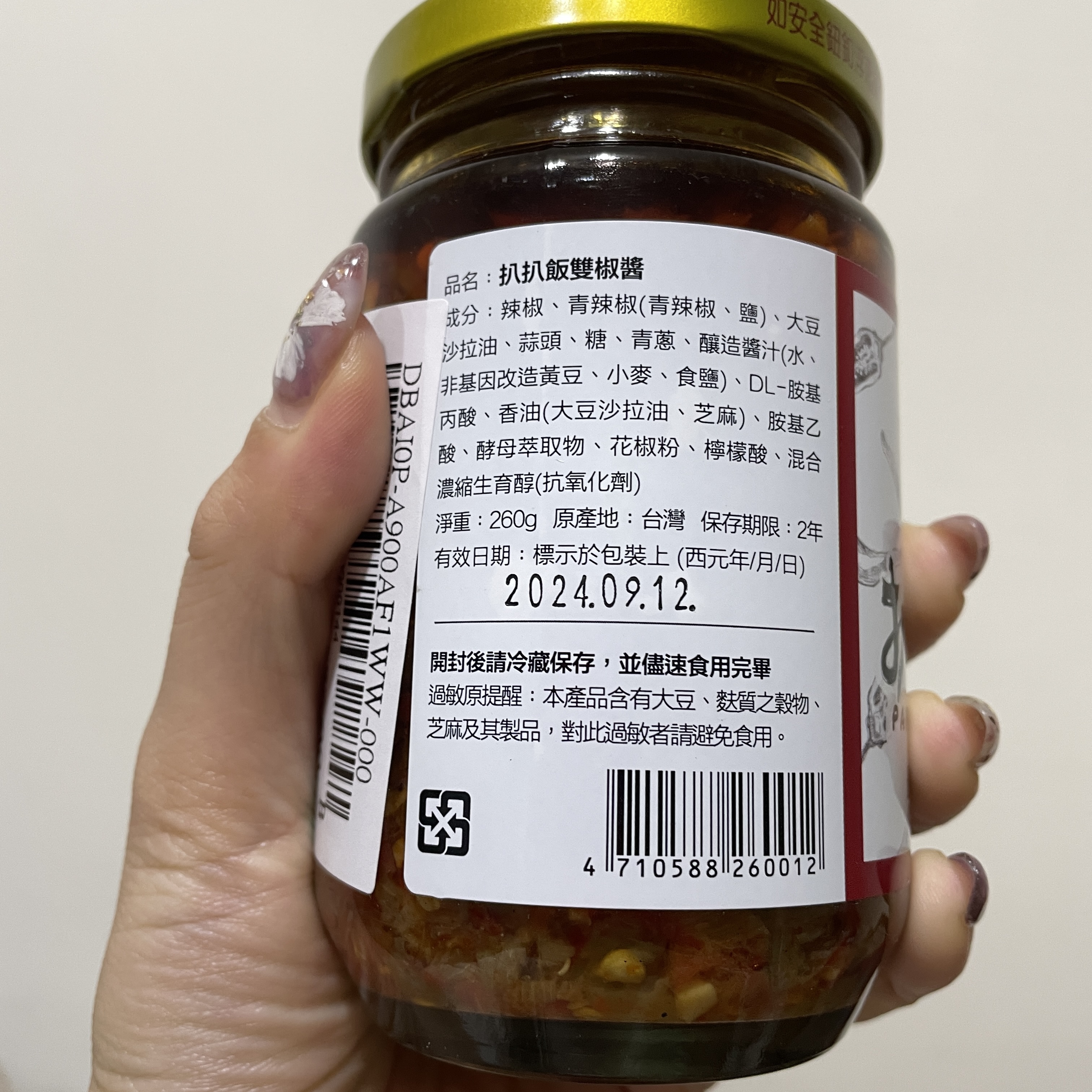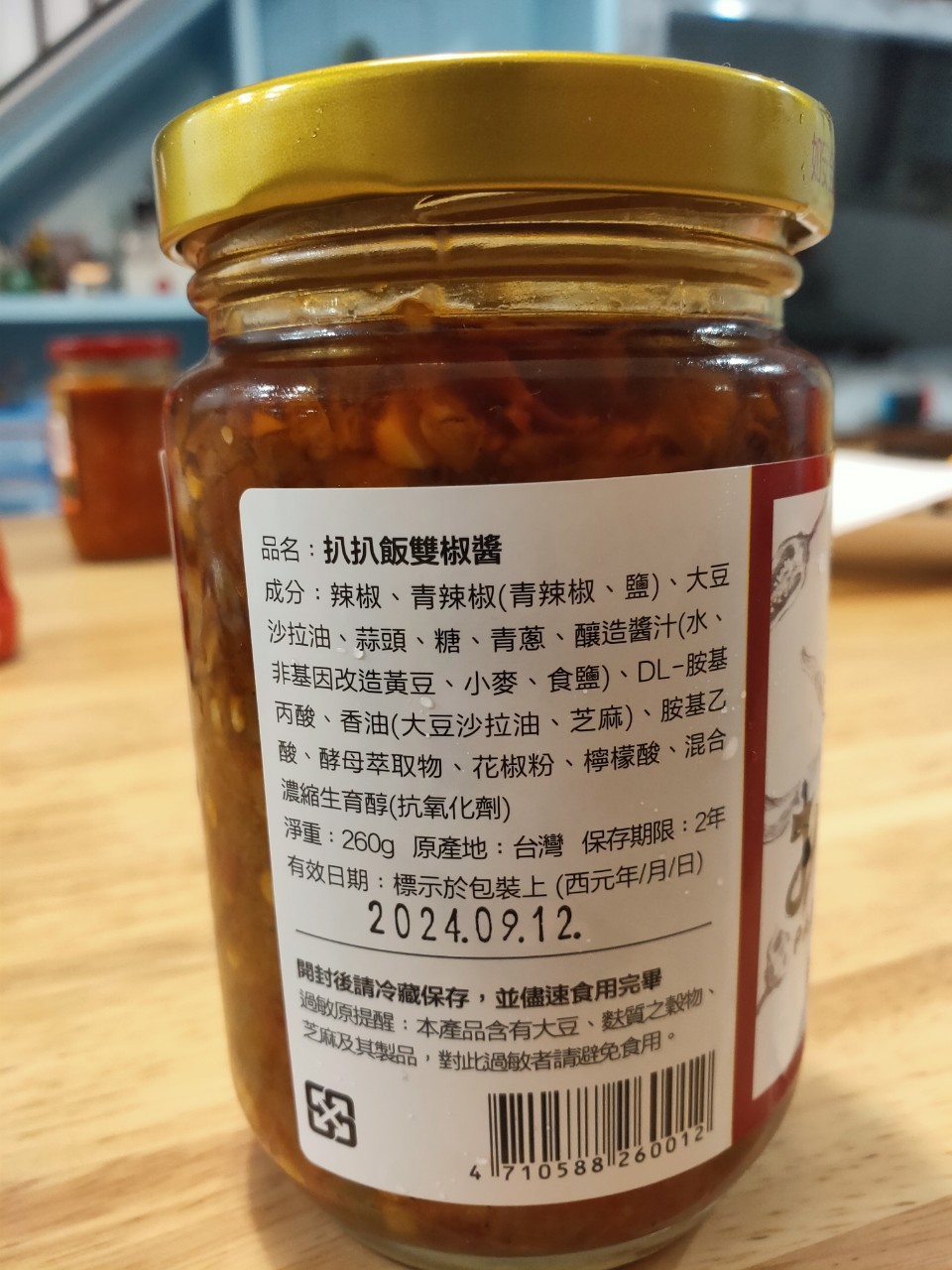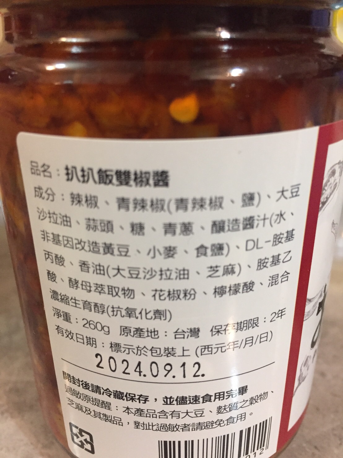經典雙椒醬 (五辛素):辣椒、沙拉油、蒜頭、鹽、糖、青蔥、釀造醬油、香油、花椒粉、酵母萃取物、DL-胺基丙酸、胺基乙酸、檸檬酸、混合濃縮生育醇