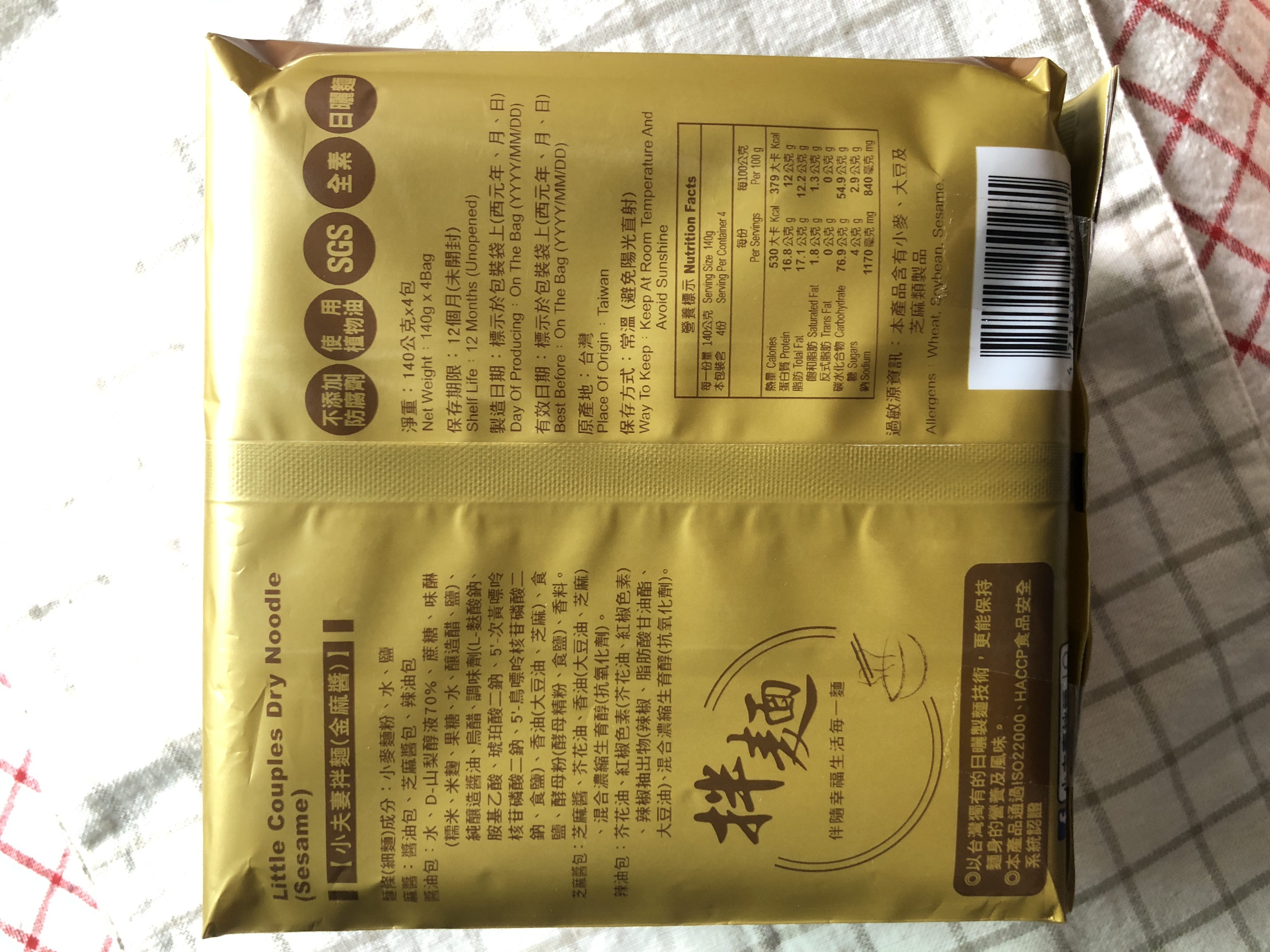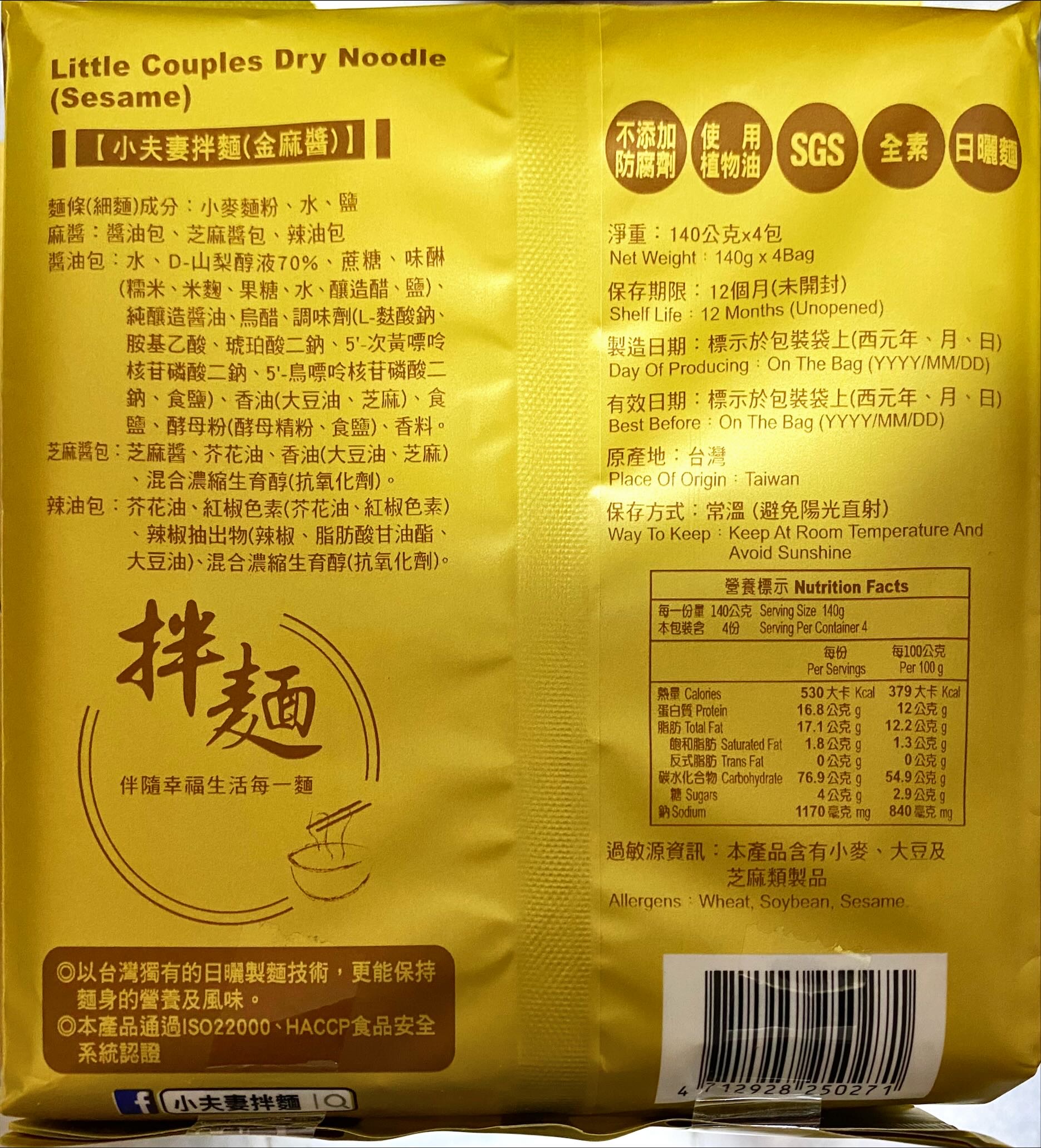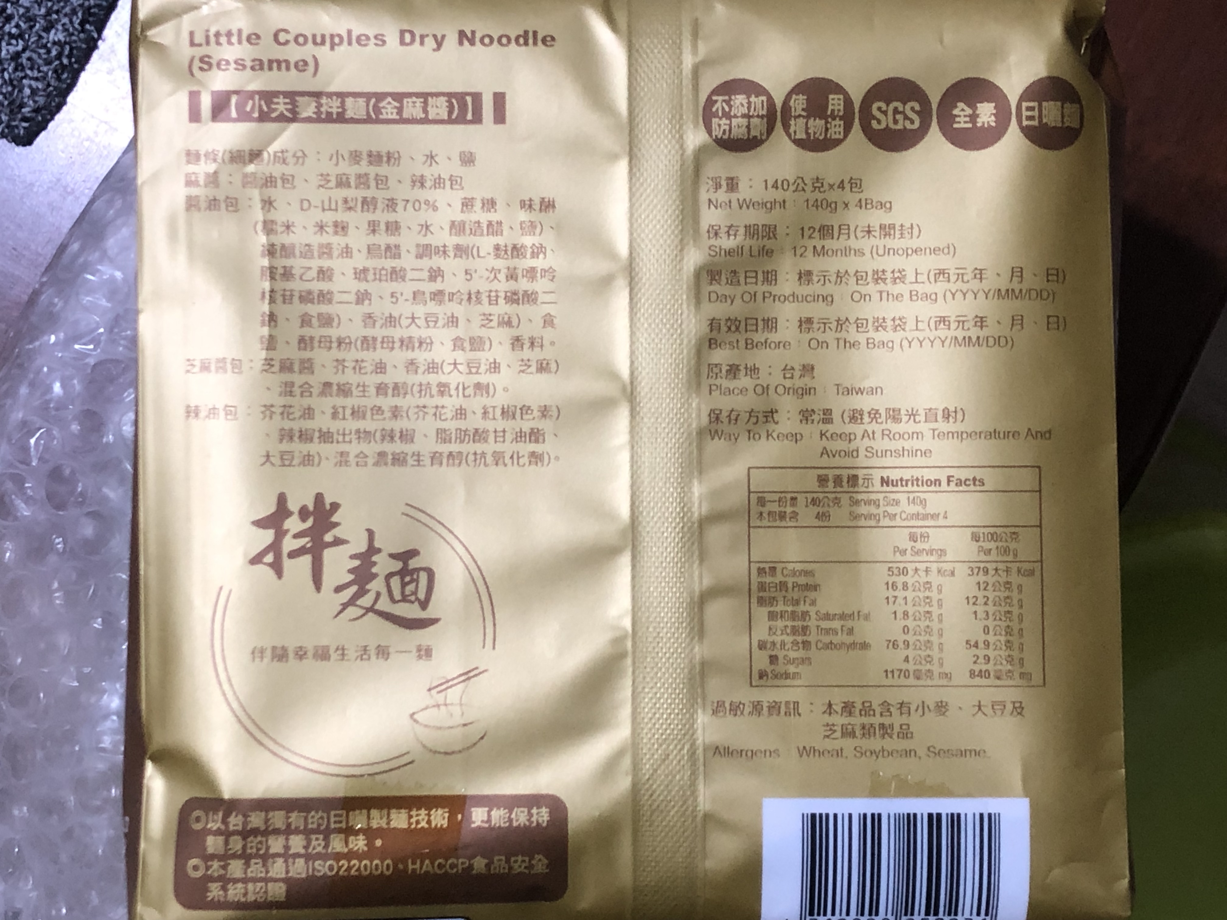 芝麻醬包:芝麻醬、芥花油、香油(大豆油、白芝麻)、維生素E(抗氧化劑) 。