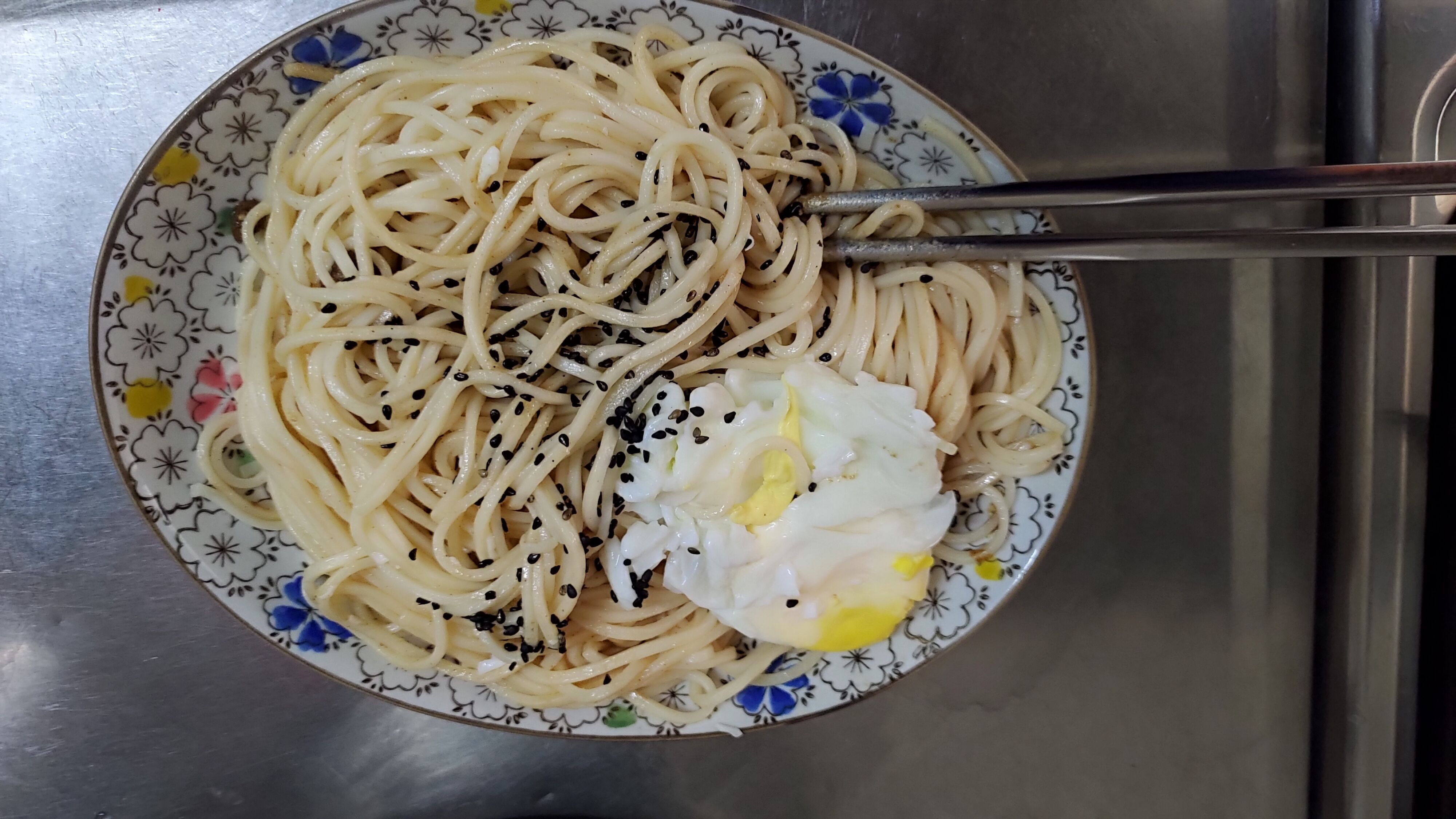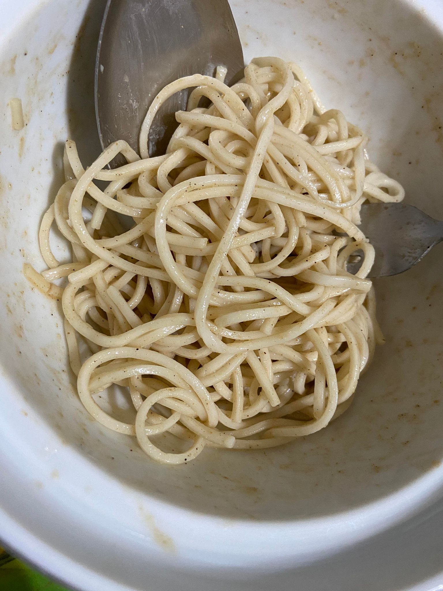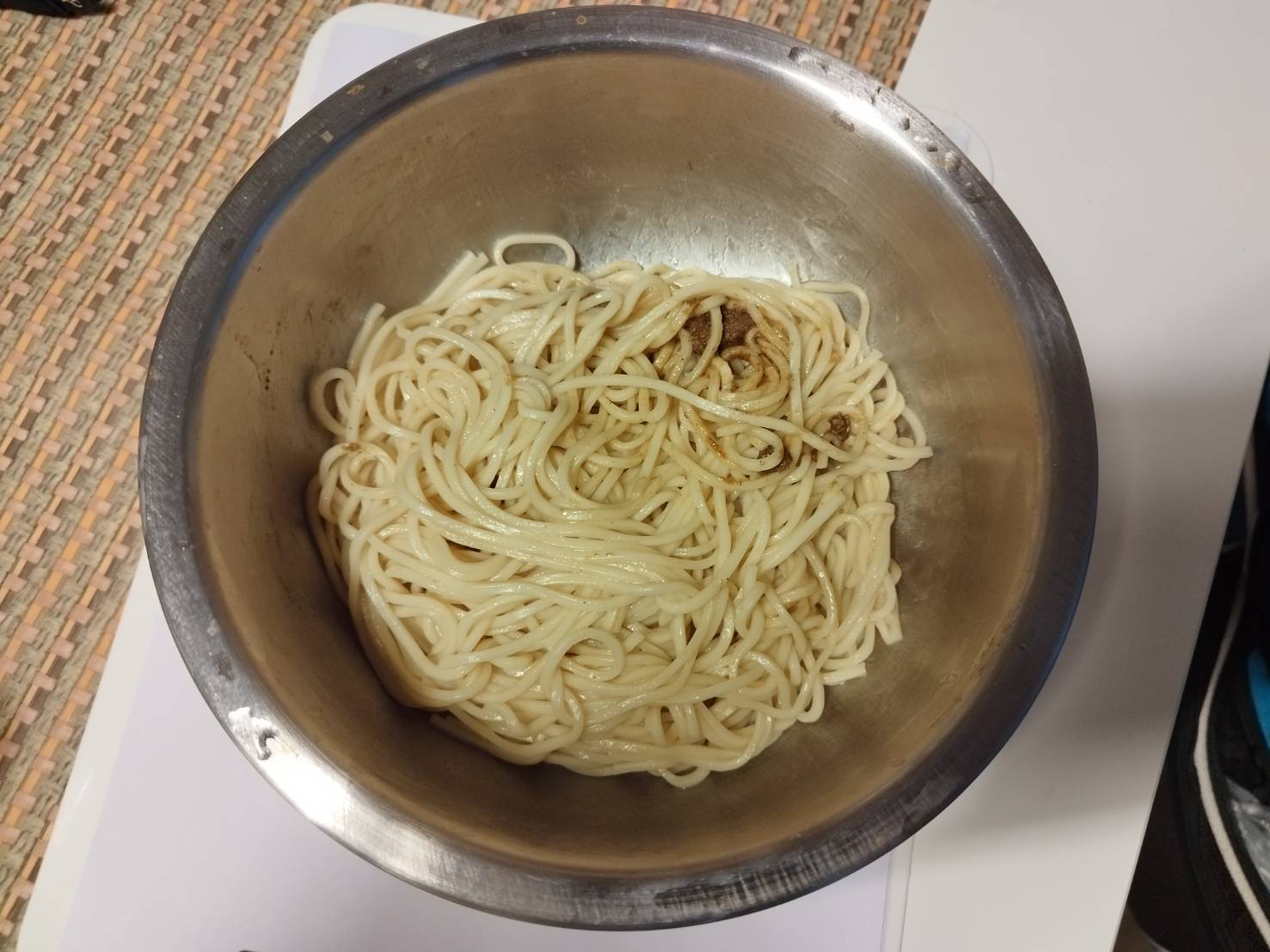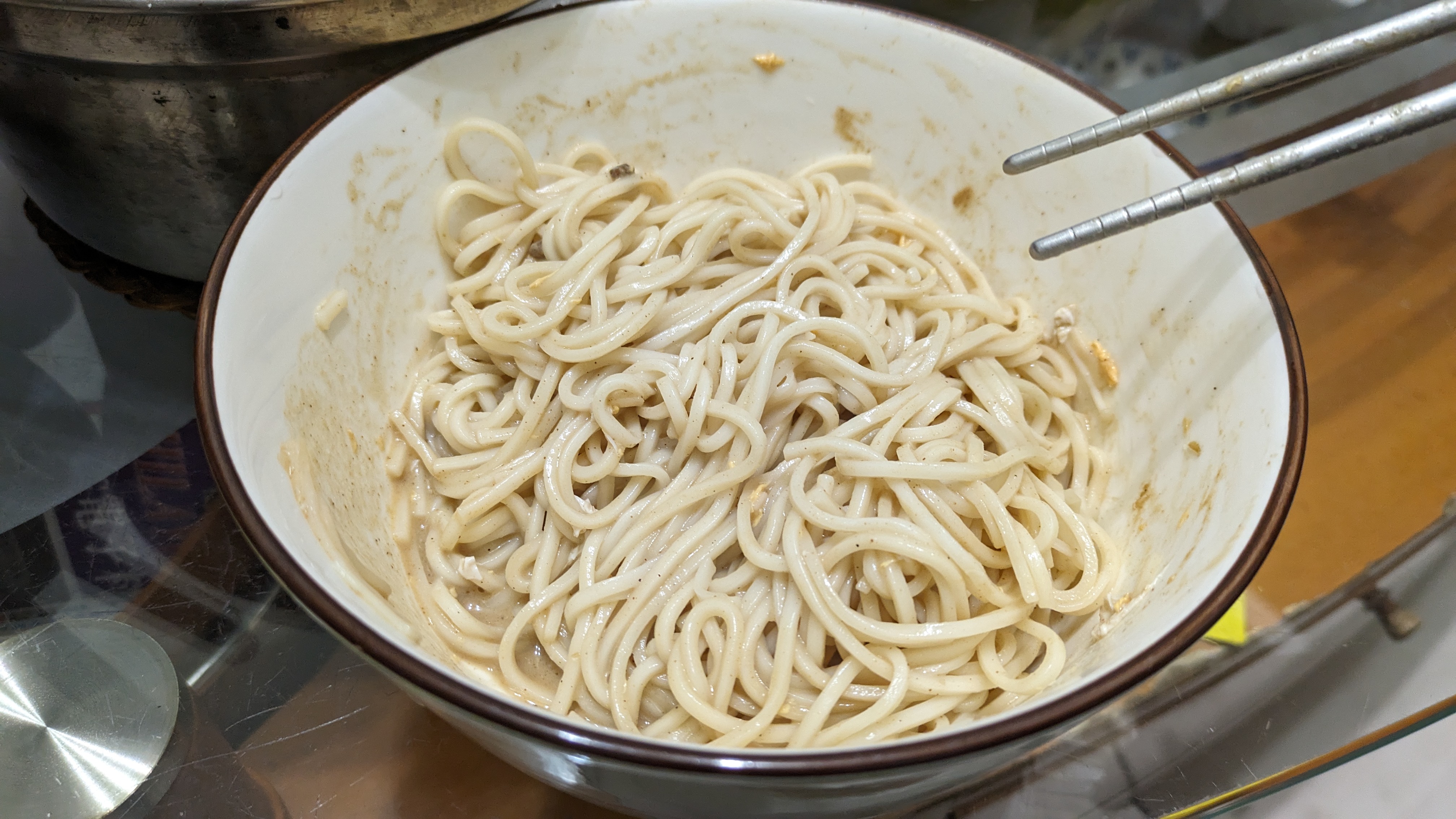 3.將麵體撈起後放置碗內,記得加入些許煮麵湯(可以使麵體滑順)