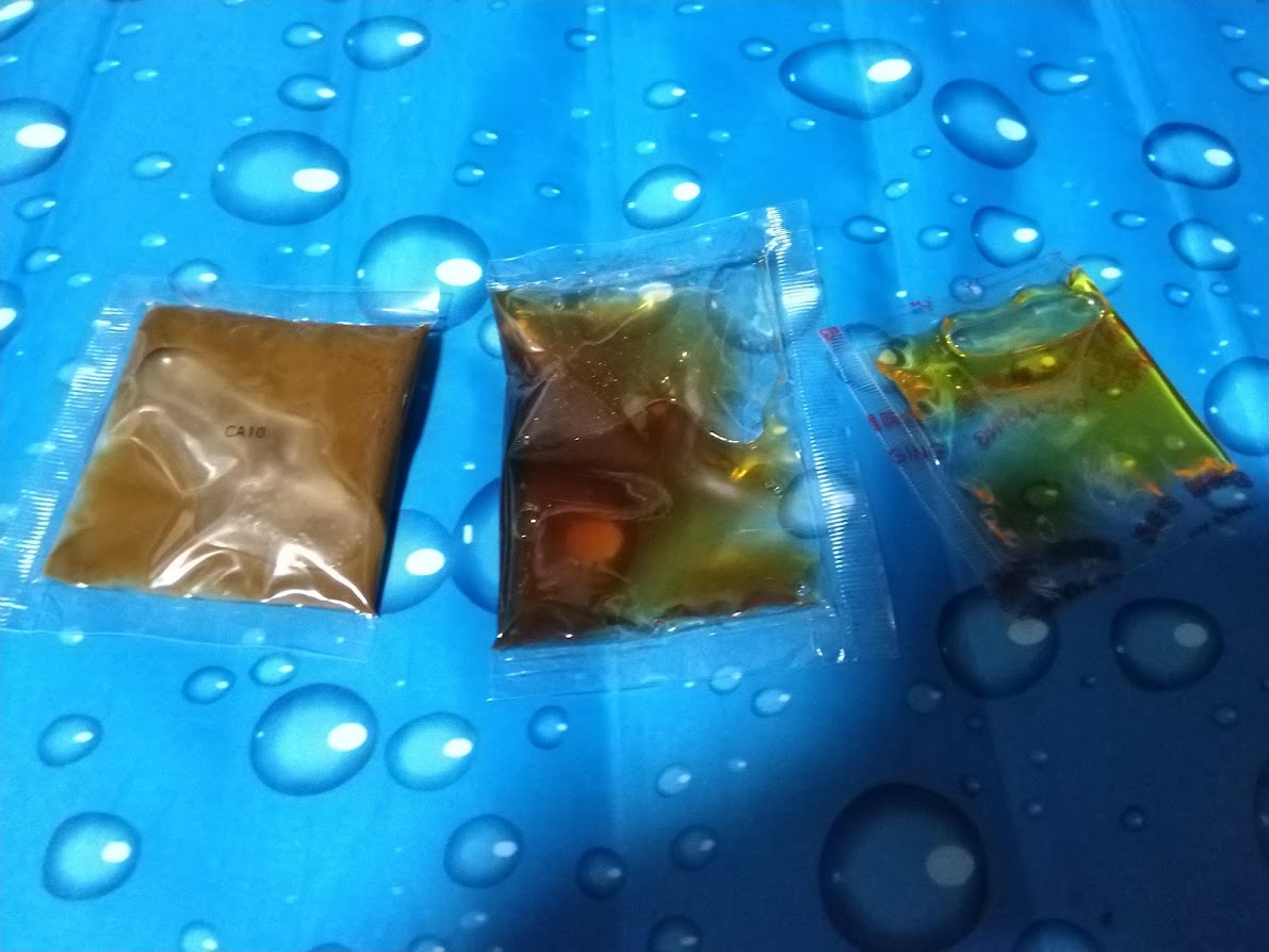 辣油包:芥花油、紅椒色素(紅辣椒、葵花油)、辣椒抽出物、維生素E(抗氧化劑)。