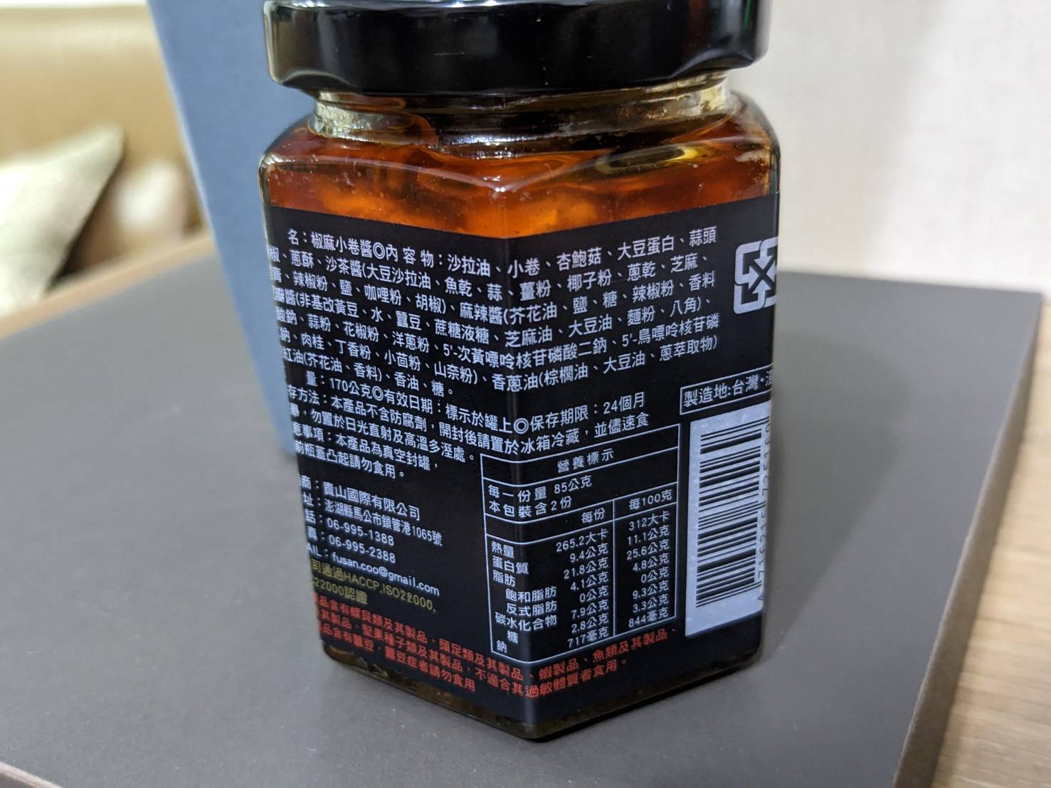 沙拉油、小卷、杏鮑菇、大豆蛋白、蒜頭、麻辣醬【芥花油、鹽、糖、辣椒粉、香料、豆瓣醬(非基改黃豆、水、蠶豆、蔗糖液糖、芝麻油、大豆油、麵粉、八角)、L-麩酸鈉、蒜粉、花椒粉、洋蔥粉、5'-次黃嘌呤核苷磷酸二鈉、5'-鳥嘌呤核苷磷酸二鈉、肉桂、丁香粉、小茴粉、山奈粉】、辣椒、蔥酥、香油(芝麻、大豆)、沙茶醬(大豆沙拉油、魚乾、蒜、薑粉、椰子粉、蔥乾、芝麻、赤尾青、辣椒粉、鹽、咖哩粉、胡椒)、糖、香蔥油(棕櫚油、大豆油、蔥萃取物)、辣紅油(芥花油、香料)