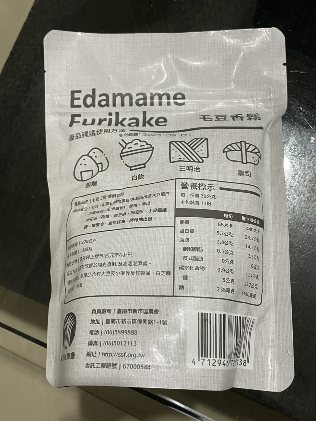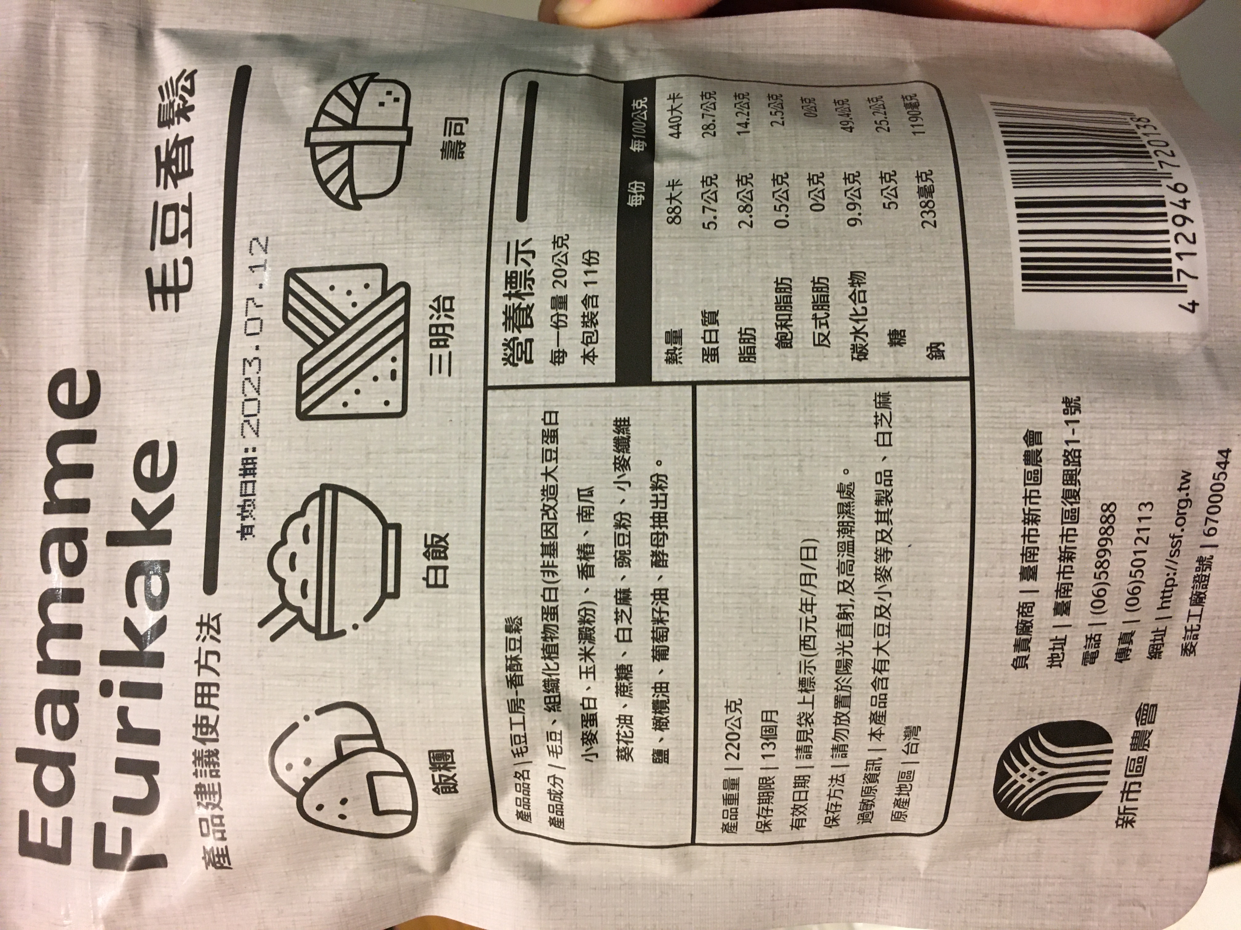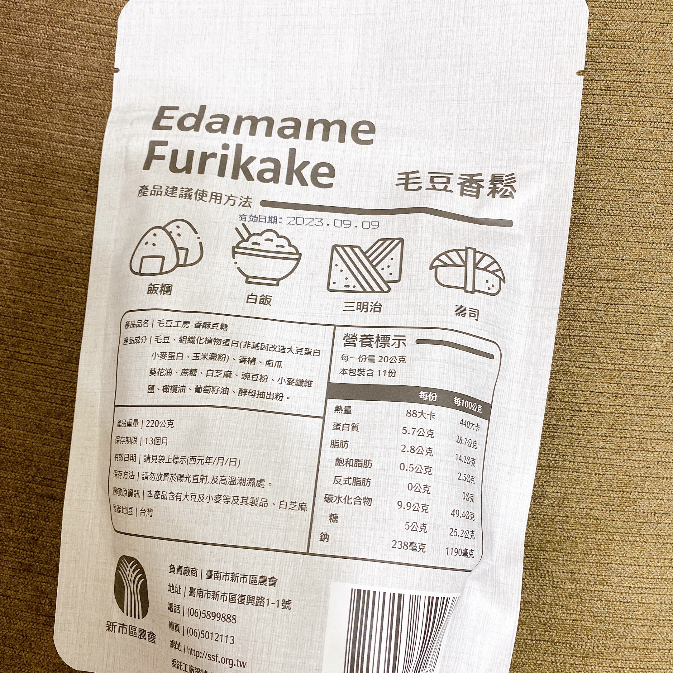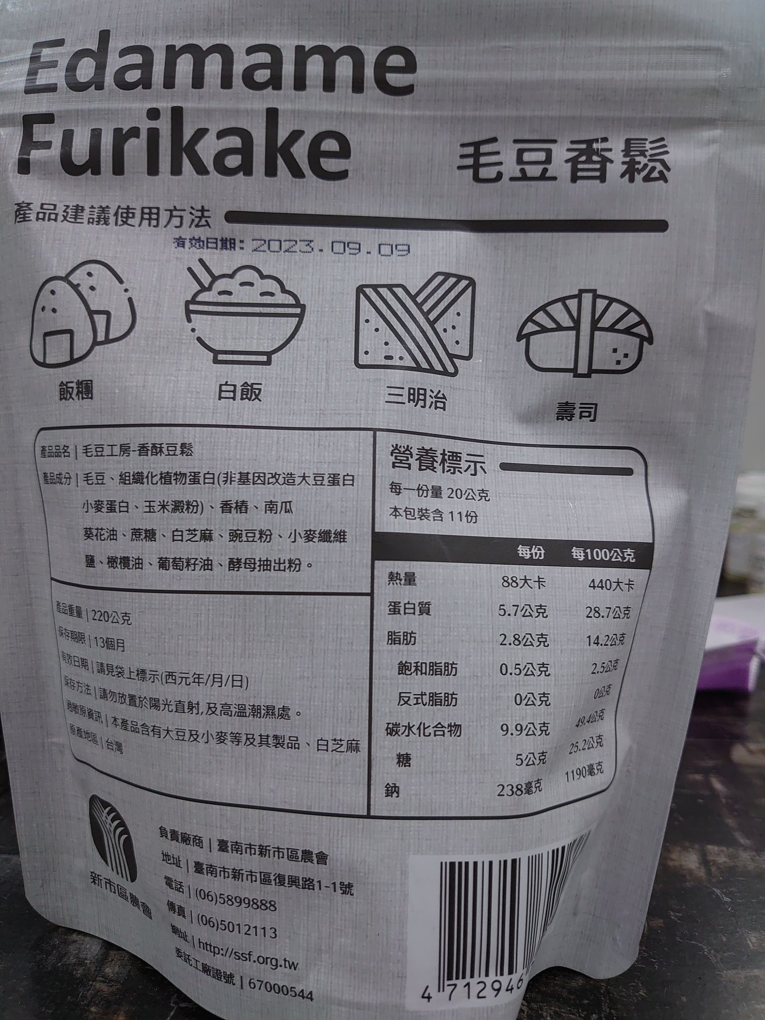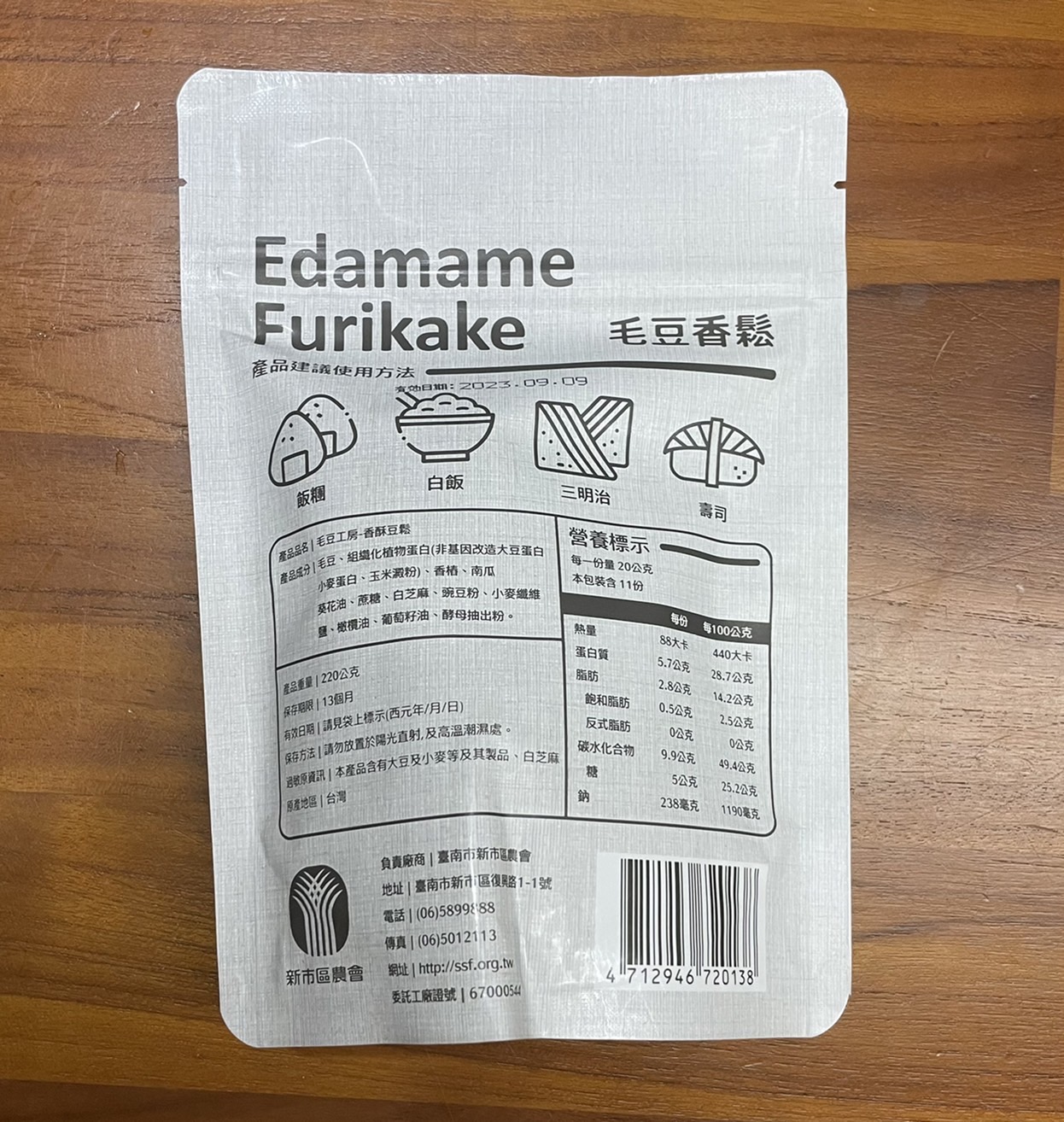 回列表 新市區農會 毛豆香鬆 嚴選台南新市新鮮毛豆製作 非油炸製成 純素可食 市價250元 所需等級 一般會員以上 所需學分 70 體驗份數 15 關注人數 1396 申請人數 348 申請截止 品牌業者:新市區農會 負責廠商 臺南市新市區農會 廠商地址 台南市新市區新市里復興路1-1號 產地 台灣 試用產品規格 220公克/包 食品業者登錄字號 D-173296000-00000-8 投保產品責任險字號 富邦產物0506字第19AML0000901號 心得分享 商品介紹 商品成分 使用方法 注意事項 體驗名單 9.1 新市區農會 毛豆香鬆 包裝美學 9.1 風味香氣 9.2 口感酥脆 9.1 成分天然 9.2 建議推薦 8.6 心得分享 14則 莊 銀食達人 39歲 桃園市 2022/09/12 對新市區農會 毛豆香鬆留下評價 8 在試吃毛豆香鬆之前,沒有想過這是一款既是配菜也可當調味料、甚是零食的食品,香香甜甜的味道,比肉品肉鬆更脆的口感,又具有毛豆的高營養,不是素食者也很適合必備在家裡喔,早餐煮個白粥,早午餐做個三明治,晚餐吃個生菜沙拉,一日三餐都百搭。 張若君 鑽石達人 57歲 新北市 2022/09/11 對新市區農會 毛豆香鬆留下評價 10 令人意外的毛豆香鬆,單吃就很好吃,有點停不下來的感覺。不似市售的香鬆,魚鬆,肉鬆等,味道濃郁。毛豆香鬆有著淺淺的,不會給口腔多餘負擔的口感及香氣。咬起來不硬不軟的脆度,也讓咀嚼成了享受。包裝設計適得其分,讓人一眼明瞭綠色的部分代表毛豆,而此產品是白飯的好搭配,整體非常吸睛。 張杏英 鑽石達人 70歲 彰化縣 2022/09/12 對新市區農會 毛豆香鬆留下評價 10 新市區農會出品的極品毛豆香鬆,是嚴選台南新市新鮮毛豆,把握黃金4小時加工完成,保留了毛豆的新鮮風味,收到食驗品時打開包裝袋,就有聞到毛豆的香氣,而且細細的香鬆不管是老人家或者小朋友皆可簡單的食用,我試用了包饅頭,製成三明治,還有小飯團,大人小孩皆說好吃也美味,只香鬆吃在口裏有著毛豆的香甜,而且即開即食可多孌的料理方式,是植物界的高蛋白食品,可補充人體所需8種氨基酸,對身體無負擔,以後將會常食用的肉鬆改為毛豆香鬆,為家人健康把關。 楊祖安 鑽石達人 44歲 臺北市 2022/09/13 對新市區農會 毛豆香鬆留下評價 9 感謝食力和臺南市新市區農會的試吃活動,讓我有機會嘗試到全素且非油炸添加高含量毛豆粉的毛豆香鬆,打開包裝後,就可以聞到淡淡的毛豆香氣,在剛加熱的餐點上,撒上一大匙綿密酥香的香鬆,不鹹不膩,越嚼越香,獨特的酥脆口感,細膩中散發毛豆的香氣,讓人不禁想要一口接一口,很適合全家大小一同享用的優質健康的食物。 Erica 金食達人 36歲 臺北市 2022/09/14 對新市區農會 毛豆香鬆留下評價 9 什麼肉鬆、魚鬆、素鬆都吃過,還真的第一次看到毛豆香鬆產品,完全勾起了我的好奇心,而且加上家人有在吃素,也想讓他的菜色多點變化,所以就按下了申請鍵,想嚐嚐台南新市區農會的毛豆香鬆。打開夾鏈包裝,就可以聞到豆香味,可以單吃當零食吃,也可以當成一道配菜來吃,非常下飯且清爽,調味也不會太重鹹,酥脆口感讓人一嚼再嚼,之後也會嘗試拿它來製作三明治看看~ 黃育琳 鑽石達人 31歲 臺中市 2022/09/09 對新市區農會 毛豆香鬆留下評價 7 從未吃過毛豆香鬆,第一次品嚐,跟大豆香鬆風味相去不遠。可能成分比較天然沒有加香料的關係,豆味會比較明顯一點,我是喜歡豆味的所以還好,不過有點像傳統素食製品的味道在。沒有油炸,口感卻意外得酥脆。然後很適合配飯吃,或是加進飯糰、粥、壽司、三明治或捲餅裡增添風味、口感。包裝很好看,有夾鏈封口也很方便,最後謝謝食力提供這次的體驗機會! 吳佳霓 鑽石達人 35歲 雲林縣 2022/09/12 對新市區農會 毛豆香鬆留下評價 9 感恩獲取新市區農會毛豆香鬆,過去只知道毛豆是營養健康食物,每每僅吃毛豆做的小菜或用毛豆仁打成豆漿,此次獲得毛豆香鬆試吃,內心雀躍。將毛豆香鬆袋打開時,一陣豆香完全無油耗味,小時記憶就是稀飯加肉鬆,此時立馬煮一鍋稀飯,搭配香鬆一起,當香鬆入口時,首先感受到的是香鬆的酥,咀嚼起來是豆子香,感覺無論是單吃還是入菜,無論吃素或吃葷都會愛,值得推薦。 游家東 鑽石達人 47歲 桃園市 2022/09/12 對新市區農會 毛豆香鬆留下評價 9 包裝設計簡單明瞭,綠色帶著清新感,讓人第一眼就覺得是素食。濃厚的豆香,吃起來甜鹹有層次,吃得到酥脆的顆粒,也吃得到綿密的纖維,口感還蠻豐富的,使用前可以搖一搖讓它均勻一點。簡單煎個蛋餅,燙點高麗菜擠掉水分,加上毛豆香鬆,捲起來就是個簡單快速的早餐,我覺得也適合包潤餅,完全可以取代肉鬆,健康好吃。 余敏娜 鑽石達人 62歲 臺北市 2022/09/13 對新市區農會 毛豆香鬆留下評價 9 台南市新市區農會生產的毛豆香鬆,一包220公克,夾鏈袋包裝,一半豆漿白一半毛豆綠的包裝,意象鮮明,包裝上英文"Edamame Furikake"字體比中文"毛豆香鬆"字體還大,也讓我學到了新的英文單字。一打開包裝,很新鮮的豆酥香味撲鼻,不是那種油炸過的味道,是清新自然的乾燥豆香,可見其真的是採用嚴選台南新市新鮮毛豆製作,拿來撒在白飯上,自然的口味令人一口接一口。豆酥香味給我新的點子,下次要來試試作一道豆酥鱈魚。 陳柔 鑽石達人 33歲 新北市 2022/09/14 對新市區農會 毛豆香鬆留下評價 10 毛豆香鬆一吃驚為天人!單看名稱以為會有滿滿的豆味,不好吃的素食感或是沒有味道等等,但味道完全跳脫自己想像的