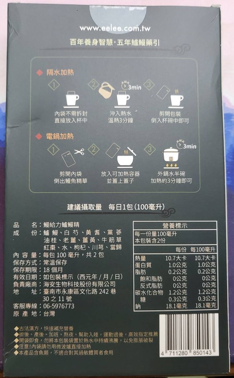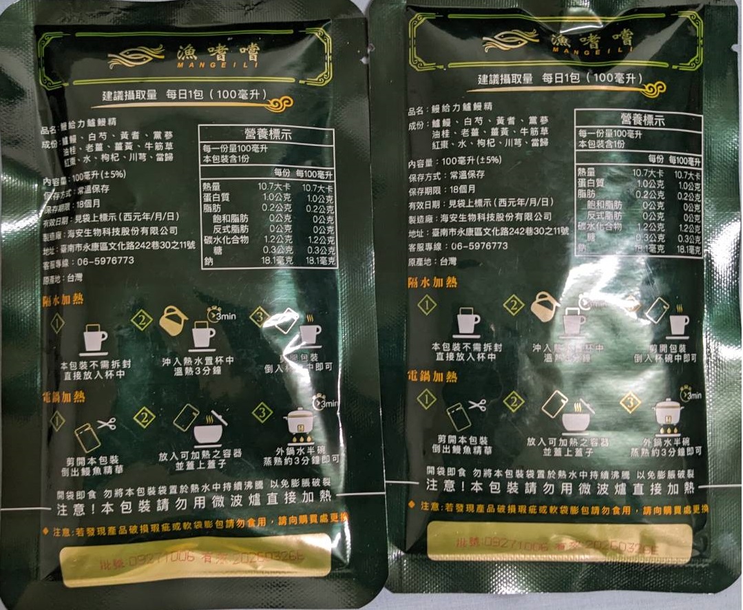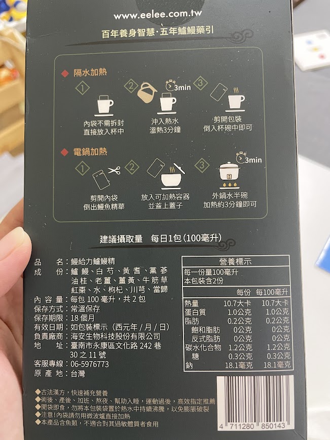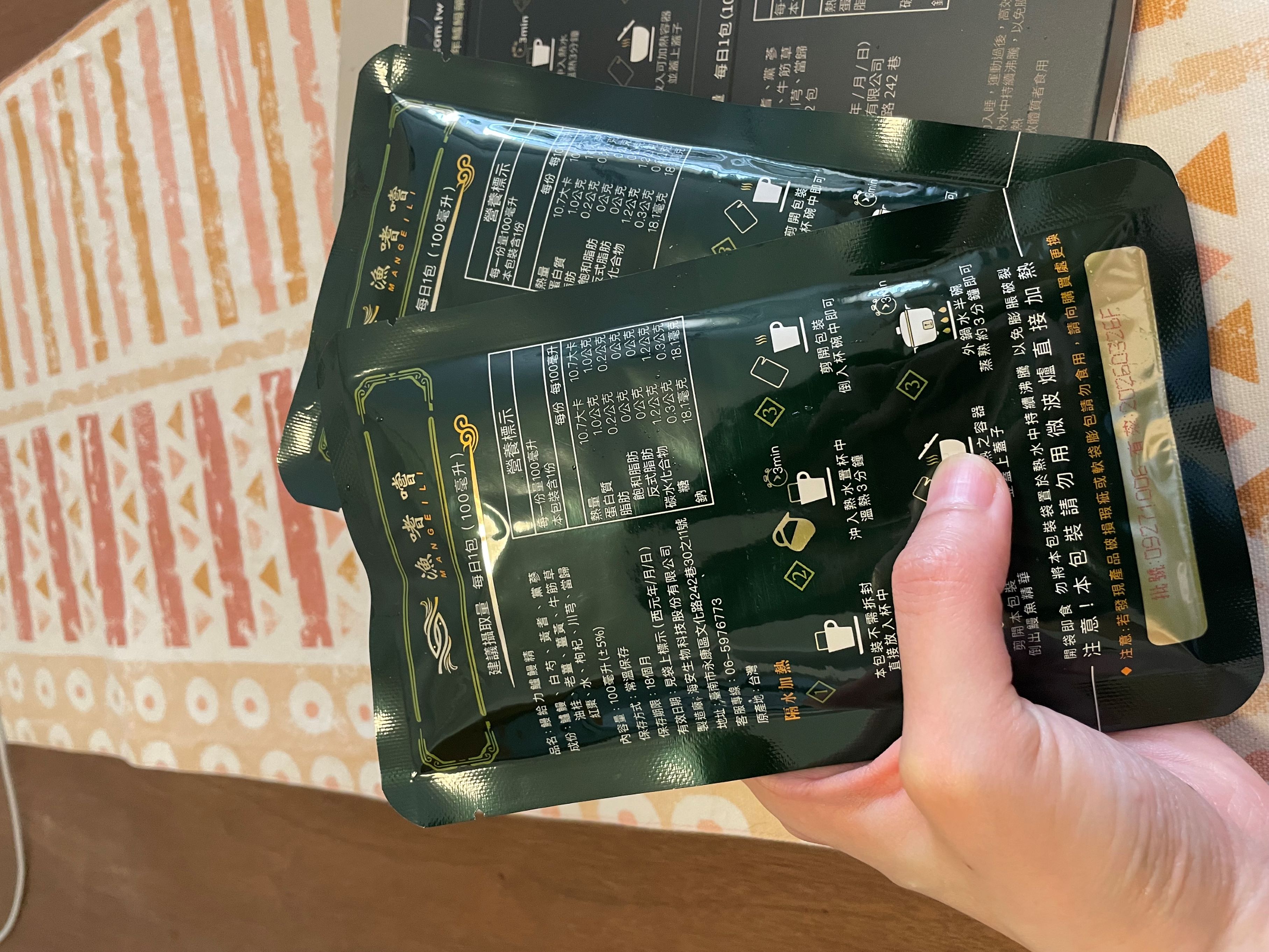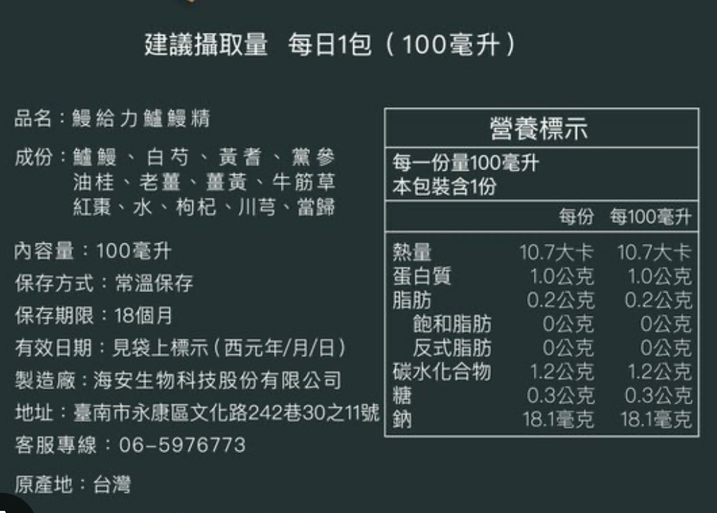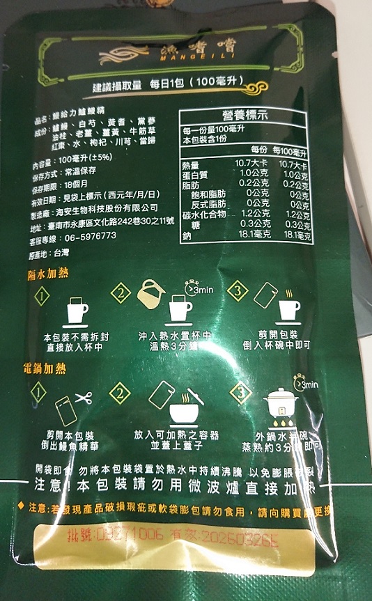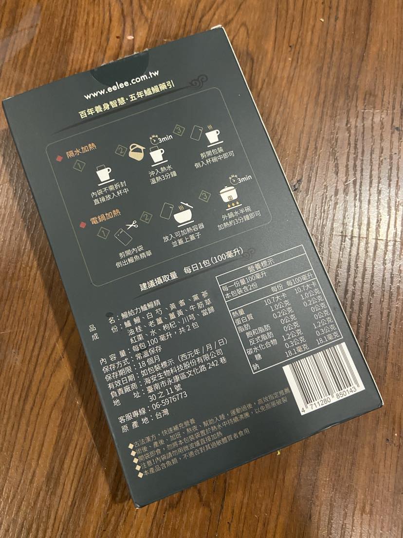 回列表 【漁嗜嚐】鰻給力鱸鰻精 - 術後恢復、產後無力、身體虛弱最佳營養補充品 市價768元 (免費申請) 所需等級 一般會員以上 所需學分 30 體驗份數 200 關注人數 1633 申請人數 302 申請截止 立即購買 品牌業者:漁嗜嚐 負責廠商 海安生物科技股份有限公司 廠商地址 台南市永康區文化路242巷30之11號 產地 台灣 試用產品規格 100毫克/包(共2包) 食品業者登錄字號 D-189176446-00000-6 投保產品責任險字號 華南產物保險1402-132050105 心得分享 商品介紹 商品成分 使用方法 注意事項 體驗名單 9.0 海安生技 鰻給力鱸鰻精 好喝無腥味 9.1 適合年節送禮/探病 9.3 有助於元氣補充 9.1 整體風味喜好 8.8 建議推薦 8.9 心得分享 193則 黃秀雯 鑽石達人 50歲 新北市 2024/10/18 對海安生技 鰻給力鱸鰻精留下評價 10 這次真的很謝謝食力和廠商提供的 鰻給力鱸鰻精,正好秋季,是最適合補益氣的時節,所以當下收到鱸鰻精時,就馬上拆封,準備好好的補一下,正好最近也覺得人累累的,所以喝下去一定最有感覺。於是乎就照著包裝上的說明,用熱泡的方式隔水加熱三分鐘,一打開包裝,就有香味撲鼻而來,真的是有當歸的香味,真的香氣四溢,讓人迫不及待的想要喝上一口。入口時的溫潤,不會讓人覺得強烈的剌鼻味,很好入喉,溫和的中藥味並不讓人討厭,其實敝人是很不能接受中藥味,所以幾乎是不喝,但是這個鱸鰻精是讓人接受度很高的產品,而且喝完,真的會覺得元氣滿滿,本來還覺得身體有些疲勞,喝完沒多久後,就覺得精神變好了不少,謝謝廠商和食力提供的鱸鰻精! 陳奕丞 鑽石達人 37歲 新北市 2024/10/20 對海安生技 鰻給力鱸鰻精留下評價 10 首先謝謝 【食力】 & 【海安生物科技股份有限公司】提供這次試用【鰻給力鱸鰻精】的機會,因為我常常熬夜加班工作,只要熬夜的隔日一早,我都有服用雞精或是鱸魚精的習慣,看到這次的鰻魚精,特別的感興趣,尤其是由【海安生物科技股份有限公司】推出的產品,更是品質保證,因為是第一次喝鱸鰻精,我特別到官網做了一下功課(如下),經由自身的體驗後,分享心得給大家。我特別到網路搜尋了一下相關資料^^(取自官網及網頁相關資料)養殖五年以上鱸鰻與老中醫傳承中藥複方結合。專利『甕粹工法』,炭火熬製12小時。鱸鰻歷經獨有淨化程序,無腥味、無土味。為術後、產後、虛弱無體力的你,補足每日所需能量。親自拿到試吃品後,『鰻給力鱸鰻精』喝起來口感像濃郁的藥膳魚湯,但完全沒有油脂和魚腥味,十分爽口,每一包獨立包裝,加熱十分容易,立即打開水即可喝完,收到試吃品的同時,小弟我剛好在感冒的恢復期,食用後,感覺病後的恢復比較快,疲勞感有明顯減輕,精神變得比較好。如果您跟我一樣常常熬夜加班,偶而不小心感冒,需要補充元氣時,那我真心覺得的【海安生物科技股份有限公司】這款【鰻給力鱸鰻精】不錯。真心推薦給您。PS很高興參加本次的試吃活動,謝謝 張佑安(yuanchang) 鑽石達人 63歲 臺中市 2024/10/27 對海安生技 鰻給力鱸鰻精留下評價 10 很高興有此機會試吃「鰻給力鱸鰻精」這款保健食品,是一個令人愉快的「吃」體驗。這款試飲配方看起來包含了不少補氣補血、溫補驅寒的成分,像是當歸、川芎、黨蔘和黃耆等都是中藥材中常見的補品。而鱸鰻則提供蛋白質,搭配牛筋草(馬齒莧)可增加一些清熱去火的效果;加上老薑、薑黃、油桂等暖身成分,整體應該偏向溫潤、稍帶辛香的滋補風味。這樣的配方可能會帶有中藥材的特有香氣,帶著薑黃和老薑的微辣辛香,當歸和川芎則有一點濃郁的土味。枸杞、紅棗可能讓湯頭有淡淡的甘甜,平衡藥材的苦味。因為含有鱸鰻,可能帶有一些鮮甜的底味,尤其是經過長時間熬煮,湯頭應該會變得滑順。若牛筋草用量較多,可能會增加些微的植物清香。這款湯應該有溫補驅寒、補氣補血的效果,適合在天氣較涼的季節或身體疲勞、需要補氣時飲用。尤其適合手腳容易冰冷、氣血虛弱的人飲用,長期飲用可能有改善氣色和提振體力的效果。 林雅文 鑽石達人 45歲 新北市 2024/10/28 對海安生技 鰻給力鱸鰻精留下評價 10 作為一名長期加班的科技業工程師,我最近試用了【漁嗜嚐】的鰻給力鱸鰻精,這款產品讓我在忙碌的工作中感受到了一絲滋養,特別適合像我這樣的上班族。首先,這款鰻精的好喝無腥味讓我驚喜。通常對於海鮮類產品,總是有些顧慮。但這款鰻精的口感非常順滑,完全沒有腥味,反而帶有淡淡的香氣,讓我在繁忙的工作中也能享受美味。在元氣補充方面,我感覺到明顯的提升。經過長時間的加班,身體常常感到疲憊,喝了這款鰻精後,精神狀態有了很大的改善,讓我能夠更專注於工作。整體風味上,這款鰻精的配方非常講究,除了鱸鰻,還添加了多種中藥材,如老薑和枸杞,讓整體風味更加豐富,喝起來不會感到單調。最後,我認為這款產品非常適合送禮自用,特別是在年節或探病時,帶上一盒,既體面又實用。對於忙碌的上班族來說,這是一個很好的食補選擇,讓我們能夠在工作中保持最佳狀態! 盧鳴 金食達人 40歲 新北市 2024/10/29 對海安生技 鰻給力鱸鰻精留下評價 9 非常開心可以收到食力的試用商品:【漁嗜嚐】鰻給力鱸鰻精。收到的試用品為墨綠色的小盒包裝,搭配金色的品牌字樣,裡面內裝兩份鰻給力鱸鰻精,很雅致的包裝設計。官方網站看到大盒裝的設計,整體相當典雅精緻,送人自用兩相