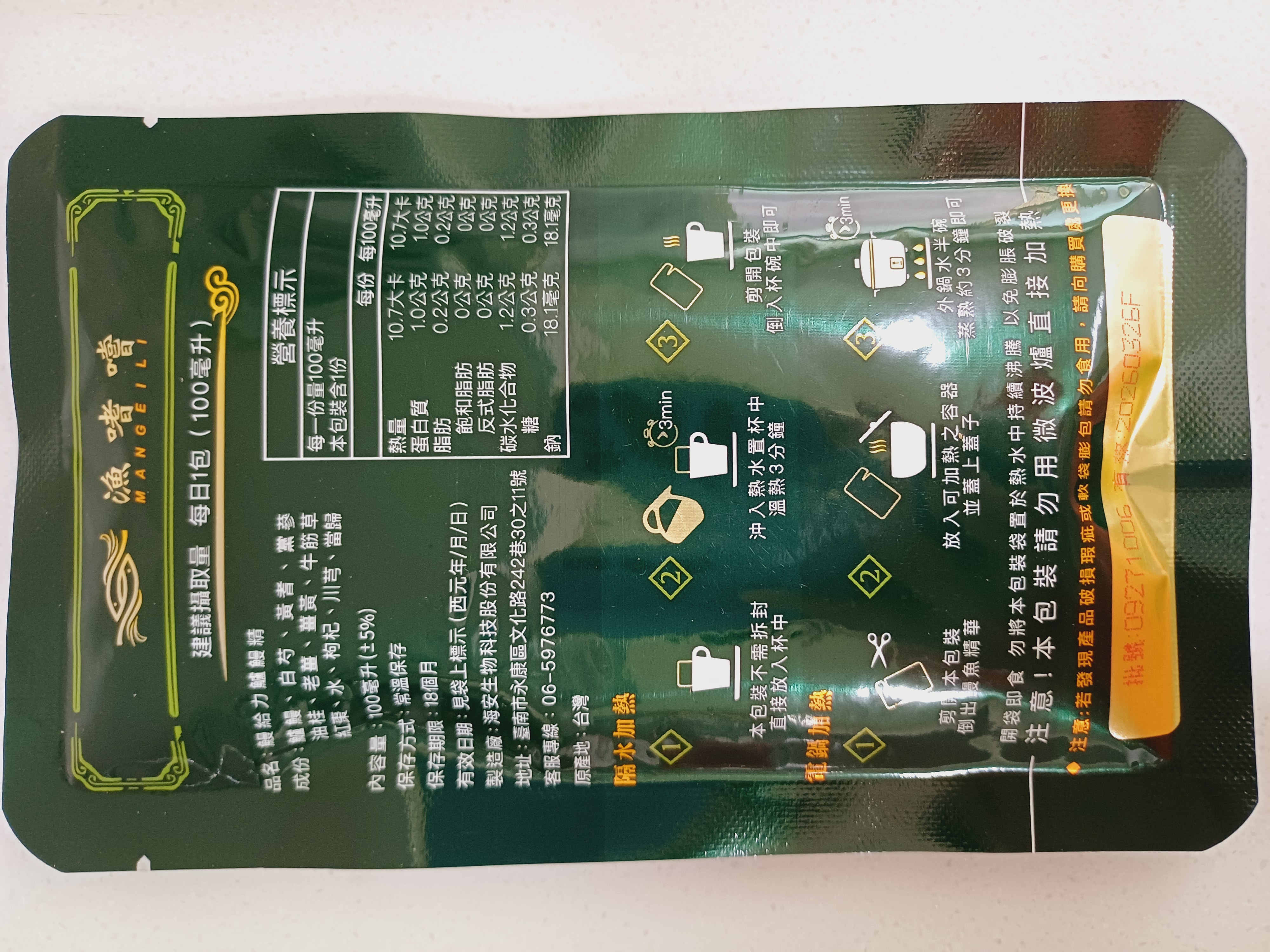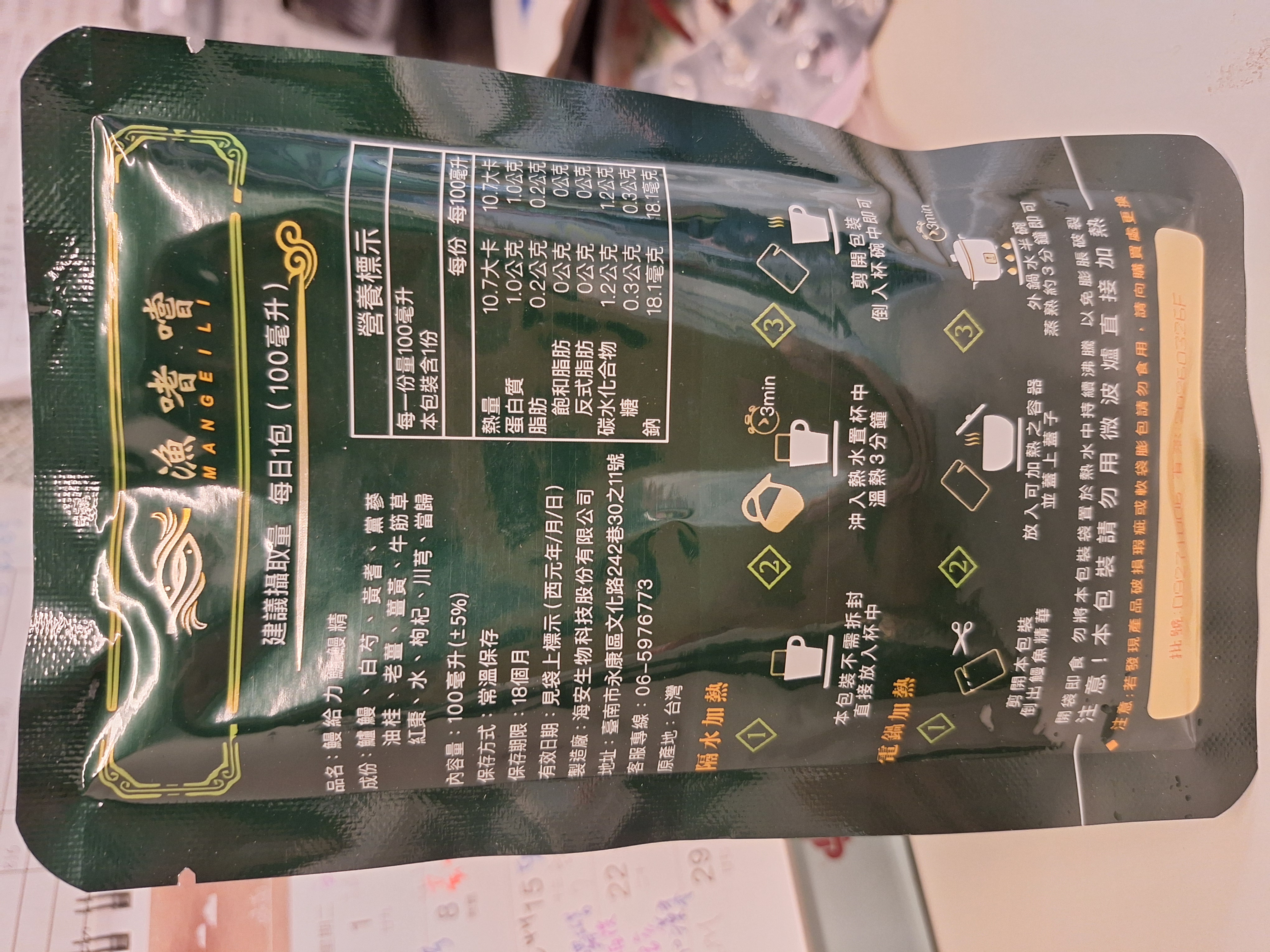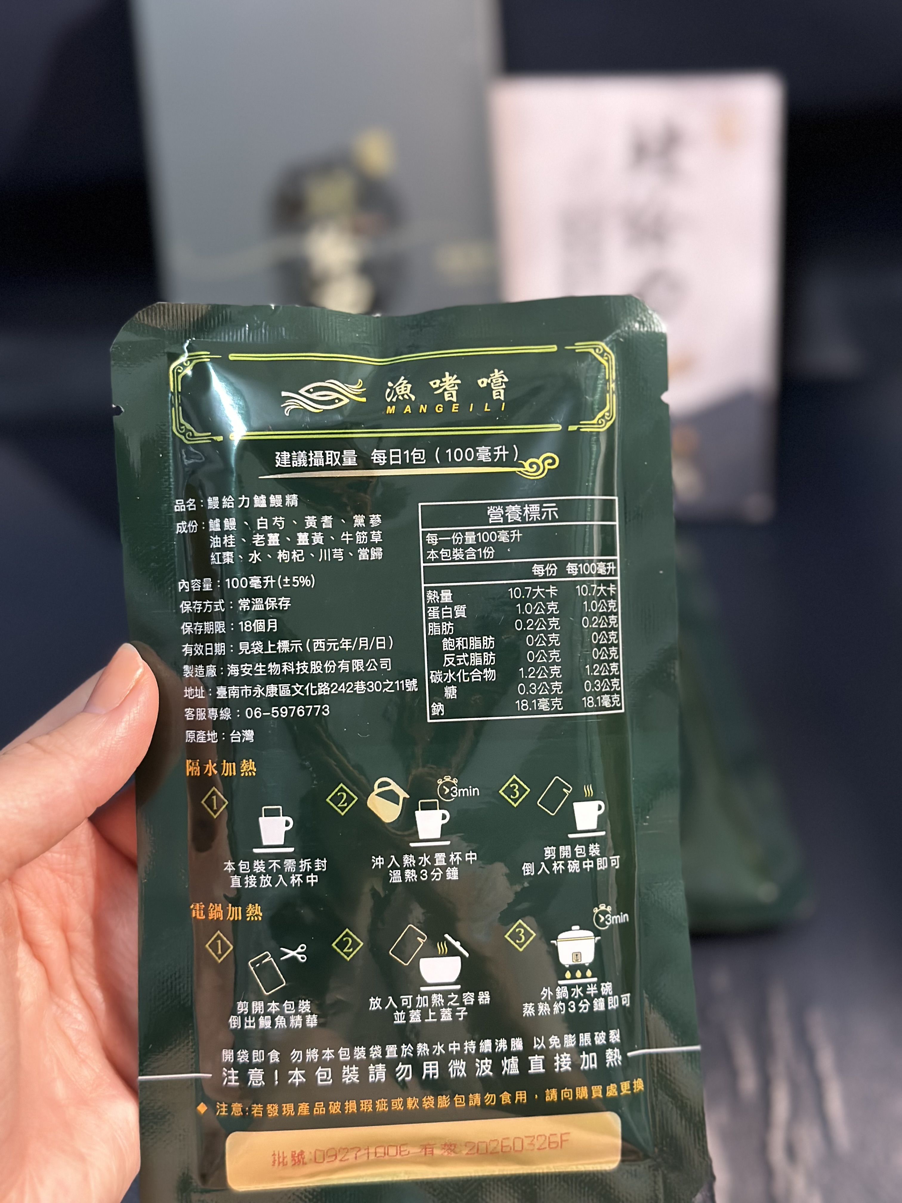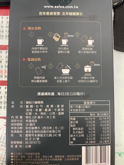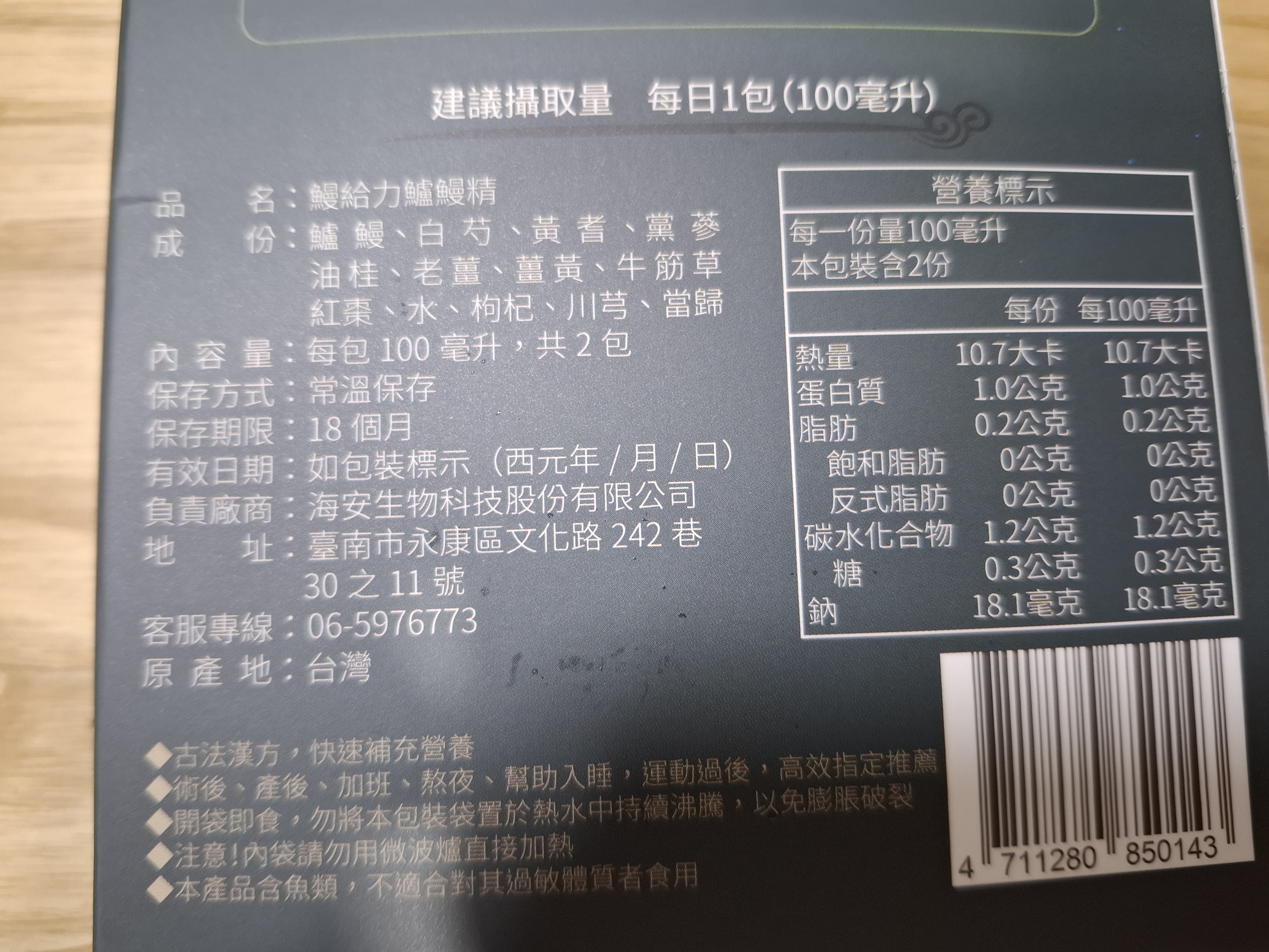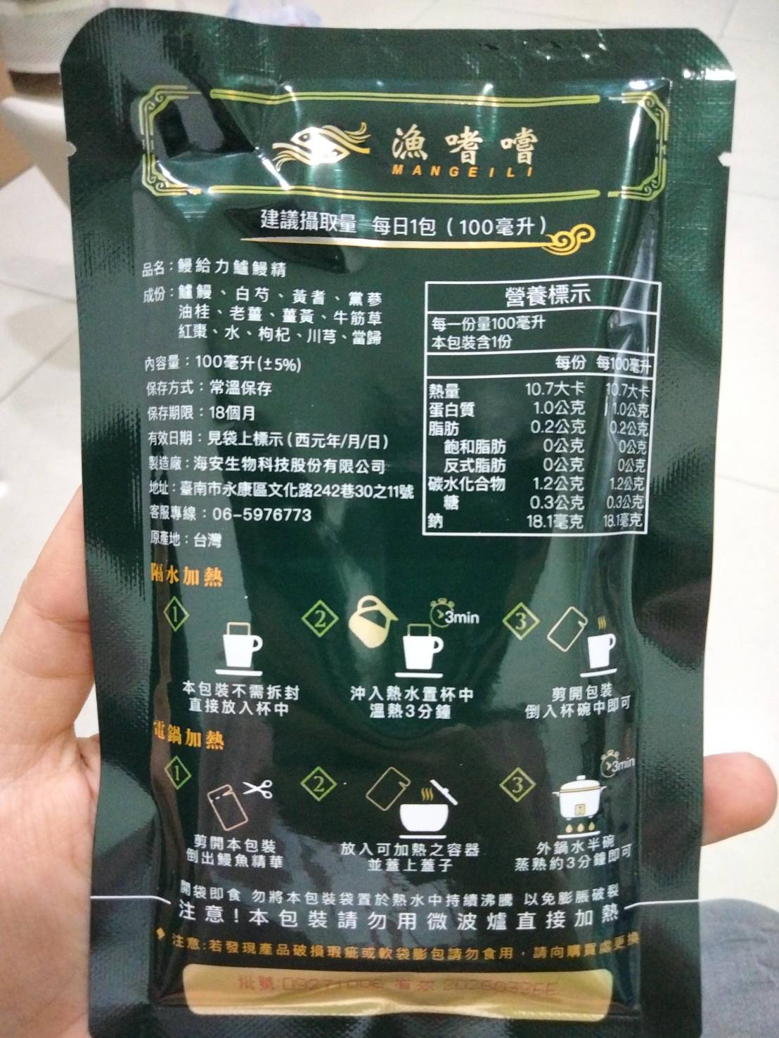 回列表 【漁嗜嚐】鰻給力鱸鰻精 - 術後恢復、產後無力、身體虛弱最佳營養補充品 市價768元 (免費申請) 所需等級 一般會員以上 所需學分 30 體驗份數 200 關注人數 1633 申請人數 302 申請截止 立即購買 品牌業者:漁嗜嚐 負責廠商 海安生物科技股份有限公司 廠商地址 台南市永康區文化路242巷30之11號 產地 台灣 試用產品規格 100毫克/包(共2包) 食品業者登錄字號 D-189176446-00000-6 投保產品責任險字號 華南產物保險1402-132050105 心得分享 商品介紹 商品成分 使用方法 注意事項 體驗名單 9.0 海安生技 鰻給力鱸鰻精 好喝無腥味 9.1 適合年節送禮/探病 9.3 有助於元氣補充 9.1 整體風味喜好 8.8 建議推薦 8.9 心得分享 193則 黃秀雯 鑽石達人 50歲 新北市 2024/10/18 對海安生技 鰻給力鱸鰻精留下評價 10 這次真的很謝謝食力和廠商提供的 鰻給力鱸鰻精,正好秋季,是最適合補益氣的時節,所以當下收到鱸鰻精時,就馬上拆封,準備好好的補一下,正好最近也覺得人累累的,所以喝下去一定最有感覺。於是乎就照著包裝上的說明,用熱泡的方式隔水加熱三分鐘,一打開包裝,就有香味撲鼻而來,真的是有當歸的香味,真的香氣四溢,讓人迫不及待的想要喝上一口。入口時的溫潤,不會讓人覺得強烈的剌鼻味,很好入喉,溫和的中藥味並不讓人討厭,其實敝人是很不能接受中藥味,所以幾乎是不喝,但是這個鱸鰻精是讓人接受度很高的產品,而且喝完,真的會覺得元氣滿滿,本來還覺得身體有些疲勞,喝完沒多久後,就覺得精神變好了不少,謝謝廠商和食力提供的鱸鰻精! 陳奕丞 鑽石達人 37歲 新北市 2024/10/20 對海安生技 鰻給力鱸鰻精留下評價 10 首先謝謝 【食力】 & 【海安生物科技股份有限公司】提供這次試用【鰻給力鱸鰻精】的機會,因為我常常熬夜加班工作,只要熬夜的隔日一早,我都有服用雞精或是鱸魚精的習慣,看到這次的鰻魚精,特別的感興趣,尤其是由【海安生物科技股份有限公司】推出的產品,更是品質保證,因為是第一次喝鱸鰻精,我特別到官網做了一下功課(如下),經由自身的體驗後,分享心得給大家。我特別到網路搜尋了一下相關資料^^(取自官網及網頁相關資料)養殖五年以上鱸鰻與老中醫傳承中藥複方結合。專利『甕粹工法』,炭火熬製12小時。鱸鰻歷經獨有淨化程序,無腥味、無土味。為術後、產後、虛弱無體力的你,補足每日所需能量。親自拿到試吃品後,『鰻給力鱸鰻精』喝起來口感像濃郁的藥膳魚湯,但完全沒有油脂和魚腥味,十分爽口,每一包獨立包裝,加熱十分容易,立即打開水即可喝完,收到試吃品的同時,小弟我剛好在感冒的恢復期,食用後,感覺病後的恢復比較快,疲勞感有明顯減輕,精神變得比較好。如果您跟我一樣常常熬夜加班,偶而不小心感冒,需要補充元氣時,那我真心覺得的【海安生物科技股份有限公司】這款【鰻給力鱸鰻精】不錯。真心推薦給您。PS很高興參加本次的試吃活動,謝謝 張佑安(yuanchang) 鑽石達人 63歲 臺中市 2024/10/27 對海安生技 鰻給力鱸鰻精留下評價 10 很高興有此機會試吃「鰻給力鱸鰻精」這款保健食品,是一個令人愉快的「吃」體驗。這款試飲配方看起來包含了不少補氣補血、溫補驅寒的成分,像是當歸、川芎、黨蔘和黃耆等都是中藥材中常見的補品。而鱸鰻則提供蛋白質,搭配牛筋草(馬齒莧)可增加一些清熱去火的效果;加上老薑、薑黃、油桂等暖身成分,整體應該偏向溫潤、稍帶辛香的滋補風味。這樣的配方可能會帶有中藥材的特有香氣,帶著薑黃和老薑的微辣辛香,當歸和川芎則有一點濃郁的土味。枸杞、紅棗可能讓湯頭有淡淡的甘甜,平衡藥材的苦味。因為含有鱸鰻,可能帶有一些鮮甜的底味,尤其是經過長時間熬煮,湯頭應該會變得滑順。若牛筋草用量較多,可能會增加些微的植物清香。這款湯應該有溫補驅寒、補氣補血的效果,適合在天氣較涼的季節或身體疲勞、需要補氣時飲用。尤其適合手腳容易冰冷、氣血虛弱的人飲用,長期飲用可能有改善氣色和提振體力的效果。 林雅文 鑽石達人 45歲 新北市 2024/10/28 對海安生技 鰻給力鱸鰻精留下評價 10 作為一名長期加班的科技業工程師,我最近試用了【漁嗜嚐】的鰻給力鱸鰻精,這款產品讓我在忙碌的工作中感受到了一絲滋養,特別適合像我這樣的上班族。首先,這款鰻精的好喝無腥味讓我驚喜。通常對於海鮮類產品,總是有些顧慮。但這款鰻精的口感非常順滑,完全沒有腥味,反而帶有淡淡的香氣,讓我在繁忙的工作中也能享受美味。在元氣補充方面,我感覺到明顯的提升。經過長時間的加班,身體常常感到疲憊,喝了這款鰻精後,精神狀態有了很大的改善,讓我能夠更專注於工作。整體風味上,這款鰻精的配方非常講究,除了鱸鰻,還添加了多種中藥材,如老薑和枸杞,讓整體風味更加豐富,喝起來不會感到單調。最後,我認為這款產品非常適合送禮自用,特別是在年節或探病時,帶上一盒,既體面又實用。對於忙碌的上班族來說,這是一個很好的食補選擇,讓我們能夠在工作中保持最佳狀態! 盧鳴 金食達人 40歲 新北市 2024/10/29 對海安生技 鰻給力鱸鰻精留下評價 9 非常開心可以收到食力的試用商品:【漁嗜嚐】鰻給力鱸鰻精。收到的試用品為墨綠色的小盒包裝,搭配金色的品牌字樣,裡面內裝兩份鰻給力鱸鰻精,很雅致的包裝設計。官方網站看到大盒裝的設計,整體相當典雅精緻,送人自用兩相