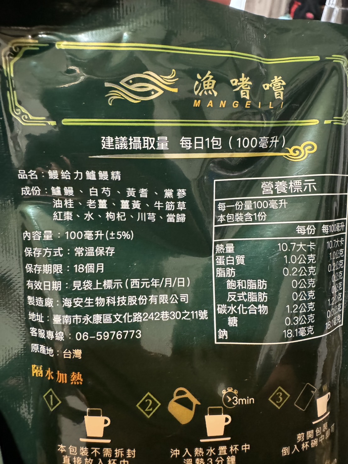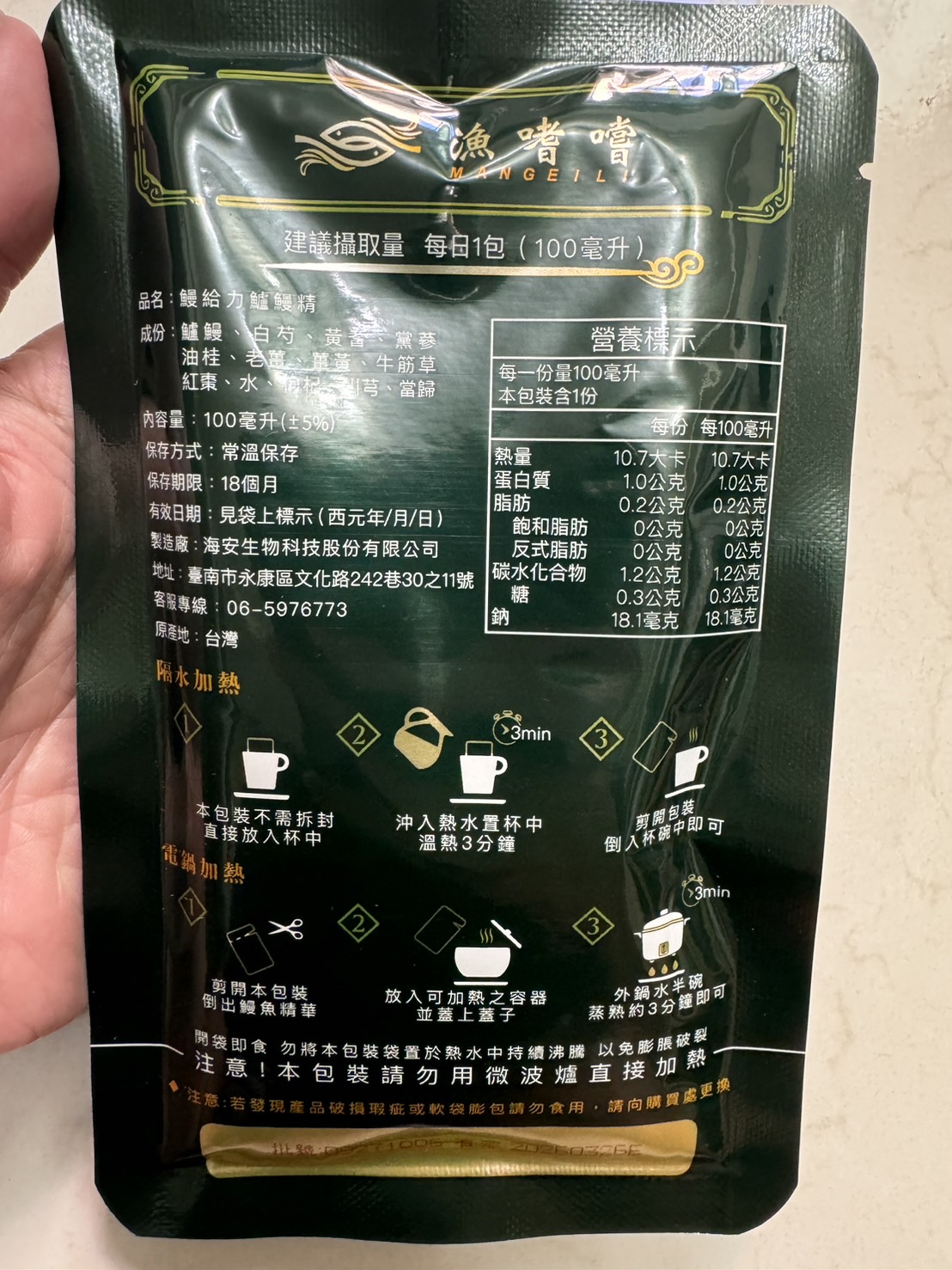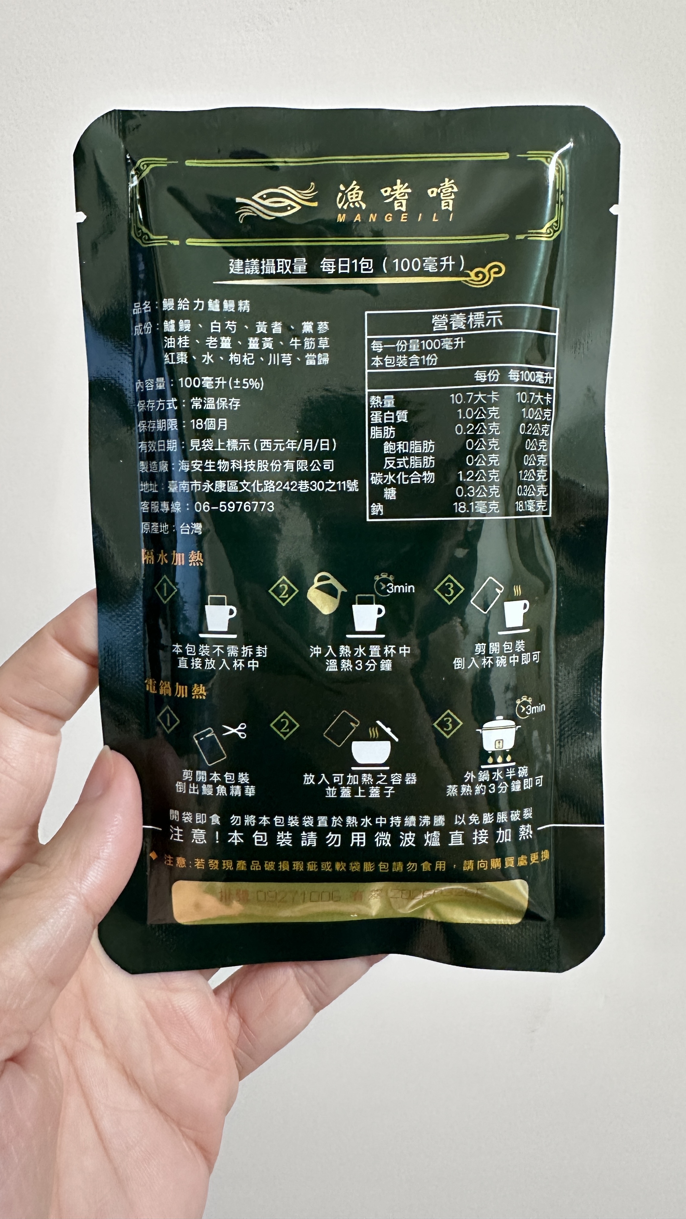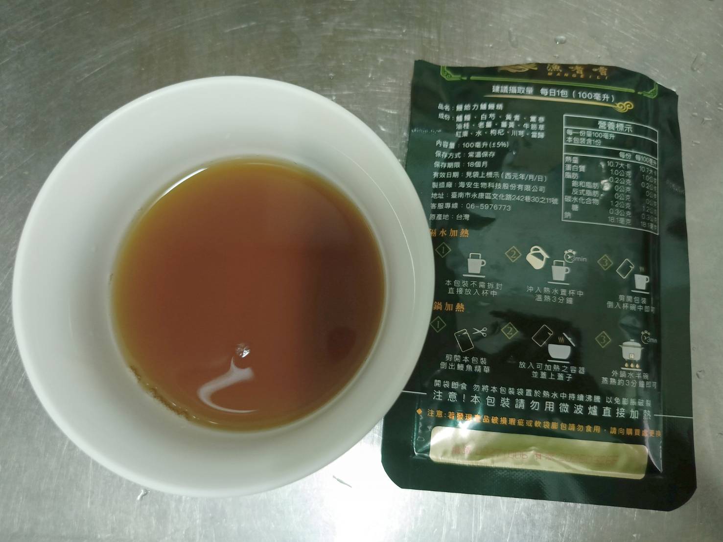 回列表 【漁嗜嚐】鰻給力鱸鰻精 - 術後恢復、產後無力、身體虛弱最佳營養補充品 市價768元 (免費申請) 所需等級 一般會員以上 所需學分 30 體驗份數 200 關注人數 1633 申請人數 302 申請截止 立即購買 品牌業者:漁嗜嚐 負責廠商 海安生物科技股份有限公司 廠商地址 台南市永康區文化路242巷30之11號 產地 台灣 試用產品規格 100毫克/包(共2包) 食品業者登錄字號 D-189176446-00000-6 投保產品責任險字號 華南產物保險1402-132050105 心得分享 商品介紹 商品成分 使用方法 注意事項 體驗名單 9.0 海安生技 鰻給力鱸鰻精 好喝無腥味 9.1 適合年節送禮/探病 9.3 有助於元氣補充 9.1 整體風味喜好 8.8 建議推薦 8.9 心得分享 193則 黃秀雯 鑽石達人 50歲 新北市 2024/10/18 對海安生技 鰻給力鱸鰻精留下評價 10 這次真的很謝謝食力和廠商提供的 鰻給力鱸鰻精,正好秋季,是最適合補益氣的時節,所以當下收到鱸鰻精時,就馬上拆封,準備好好的補一下,正好最近也覺得人累累的,所以喝下去一定最有感覺。於是乎就照著包裝上的說明,用熱泡的方式隔水加熱三分鐘,一打開包裝,就有香味撲鼻而來,真的是有當歸的香味,真的香氣四溢,讓人迫不及待的想要喝上一口。入口時的溫潤,不會讓人覺得強烈的剌鼻味,很好入喉,溫和的中藥味並不讓人討厭,其實敝人是很不能接受中藥味,所以幾乎是不喝,但是這個鱸鰻精是讓人接受度很高的產品,而且喝完,真的會覺得元氣滿滿,本來還覺得身體有些疲勞,喝完沒多久後,就覺得精神變好了不少,謝謝廠商和食力提供的鱸鰻精! 陳奕丞 鑽石達人 37歲 新北市 2024/10/20 對海安生技 鰻給力鱸鰻精留下評價 10 首先謝謝 【食力】 & 【海安生物科技股份有限公司】提供這次試用【鰻給力鱸鰻精】的機會,因為我常常熬夜加班工作,只要熬夜的隔日一早,我都有服用雞精或是鱸魚精的習慣,看到這次的鰻魚精,特別的感興趣,尤其是由【海安生物科技股份有限公司】推出的產品,更是品質保證,因為是第一次喝鱸鰻精,我特別到官網做了一下功課(如下),經由自身的體驗後,分享心得給大家。我特別到網路搜尋了一下相關資料^^(取自官網及網頁相關資料)養殖五年以上鱸鰻與老中醫傳承中藥複方結合。專利『甕粹工法』,炭火熬製12小時。鱸鰻歷經獨有淨化程序,無腥味、無土味。為術後、產後、虛弱無體力的你,補足每日所需能量。親自拿到試吃品後,『鰻給力鱸鰻精』喝起來口感像濃郁的藥膳魚湯,但完全沒有油脂和魚腥味,十分爽口,每一包獨立包裝,加熱十分容易,立即打開水即可喝完,收到試吃品的同時,小弟我剛好在感冒的恢復期,食用後,感覺病後的恢復比較快,疲勞感有明顯減輕,精神變得比較好。如果您跟我一樣常常熬夜加班,偶而不小心感冒,需要補充元氣時,那我真心覺得的【海安生物科技股份有限公司】這款【鰻給力鱸鰻精】不錯。真心推薦給您。PS很高興參加本次的試吃活動,謝謝 張佑安(yuanchang) 鑽石達人 63歲 臺中市 2024/10/27 對海安生技 鰻給力鱸鰻精留下評價 10 很高興有此機會試吃「鰻給力鱸鰻精」這款保健食品,是一個令人愉快的「吃」體驗。這款試飲配方看起來包含了不少補氣補血、溫補驅寒的成分,像是當歸、川芎、黨蔘和黃耆等都是中藥材中常見的補品。而鱸鰻則提供蛋白質,搭配牛筋草(馬齒莧)可增加一些清熱去火的效果;加上老薑、薑黃、油桂等暖身成分,整體應該偏向溫潤、稍帶辛香的滋補風味。這樣的配方可能會帶有中藥材的特有香氣,帶著薑黃和老薑的微辣辛香,當歸和川芎則有一點濃郁的土味。枸杞、紅棗可能讓湯頭有淡淡的甘甜,平衡藥材的苦味。因為含有鱸鰻,可能帶有一些鮮甜的底味,尤其是經過長時間熬煮,湯頭應該會變得滑順。若牛筋草用量較多,可能會增加些微的植物清香。這款湯應該有溫補驅寒、補氣補血的效果,適合在天氣較涼的季節或身體疲勞、需要補氣時飲用。尤其適合手腳容易冰冷、氣血虛弱的人飲用,長期飲用可能有改善氣色和提振體力的效果。 林雅文 鑽石達人 45歲 新北市 2024/10/28 對海安生技 鰻給力鱸鰻精留下評價 10 作為一名長期加班的科技業工程師,我最近試用了【漁嗜嚐】的鰻給力鱸鰻精,這款產品讓我在忙碌的工作中感受到了一絲滋養,特別適合像我這樣的上班族。首先,這款鰻精的好喝無腥味讓我驚喜。通常對於海鮮類產品,總是有些顧慮。但這款鰻精的口感非常順滑,完全沒有腥味,反而帶有淡淡的香氣,讓我在繁忙的工作中也能享受美味。在元氣補充方面,我感覺到明顯的提升。經過長時間的加班,身體常常感到疲憊,喝了這款鰻精後,精神狀態有了很大的改善,讓我能夠更專注於工作。整體風味上,這款鰻精的配方非常講究,除了鱸鰻,還添加了多種中藥材,如老薑和枸杞,讓整體風味更加豐富,喝起來不會感到單調。最後,我認為這款產品非常適合送禮自用,特別是在年節或探病時,帶上一盒,既體面又實用。對於忙碌的上班族來說,這是一個很好的食補選擇,讓我們能夠在工作中保持最佳狀態! 盧鳴 金食達人 40歲 新北市 2024/10/29 對海安生技 鰻給力鱸鰻精留下評價 9 非常開心可以收到食力的試用商品:【漁嗜嚐】鰻給力鱸鰻精。收到的試用品為墨綠色的小盒包裝,搭配金色的品牌字樣,裡面內裝兩份鰻給力鱸鰻精,很雅致的包裝設計。官方網站看到大盒裝的設計,整體相當典雅精緻,送人自用兩相