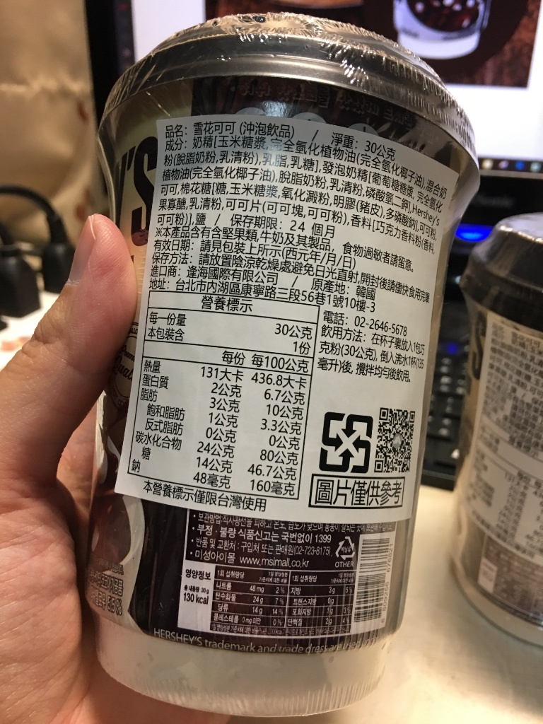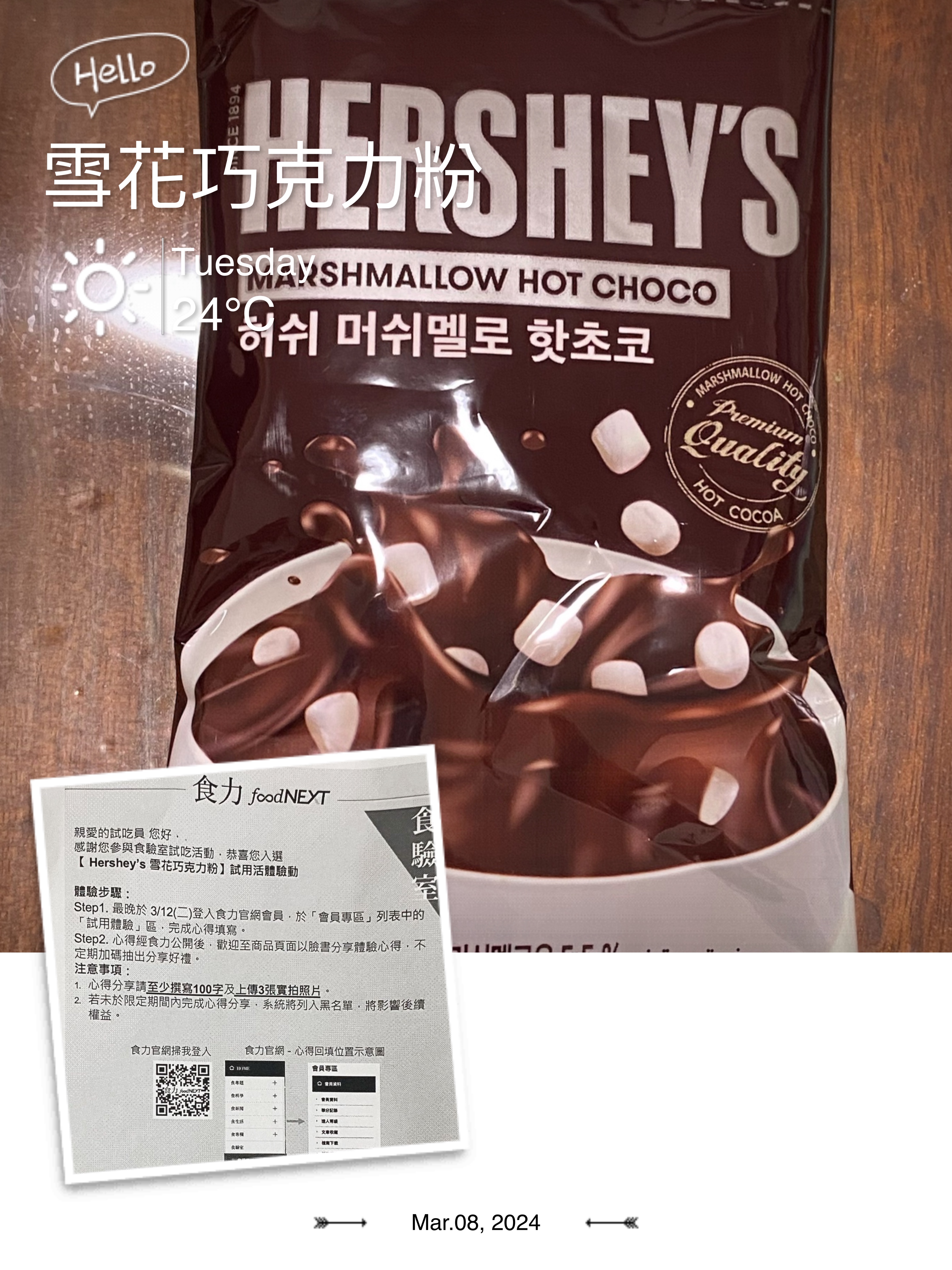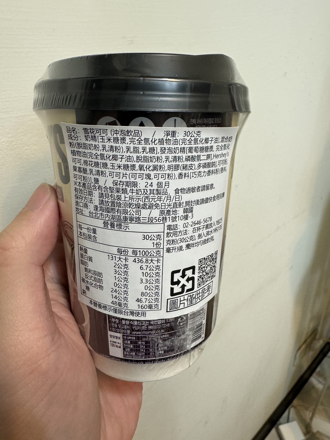 奶精(玉米糖漿、完全氫化植物油(完全氫化椰子油)、混合奶粉(脫脂奶粉、乳清粉)、乳脂、乳糖)、發泡奶精(葡萄糖糖漿、 完全氫化植物油(完全氫化椰子油)、脫脂奶粉、乳清粉、磷酸氫二鉀)、Hershey's可可、棉花糖(糖、玉米糖漿、氧化澱粉、明膠(豬皮)、多磷酸鈉)、可可粉、果寡醣、乳清粉、可可片(可可塊、可可粉)、香料(巧克力香料粉(香料、可可粉))、鹽