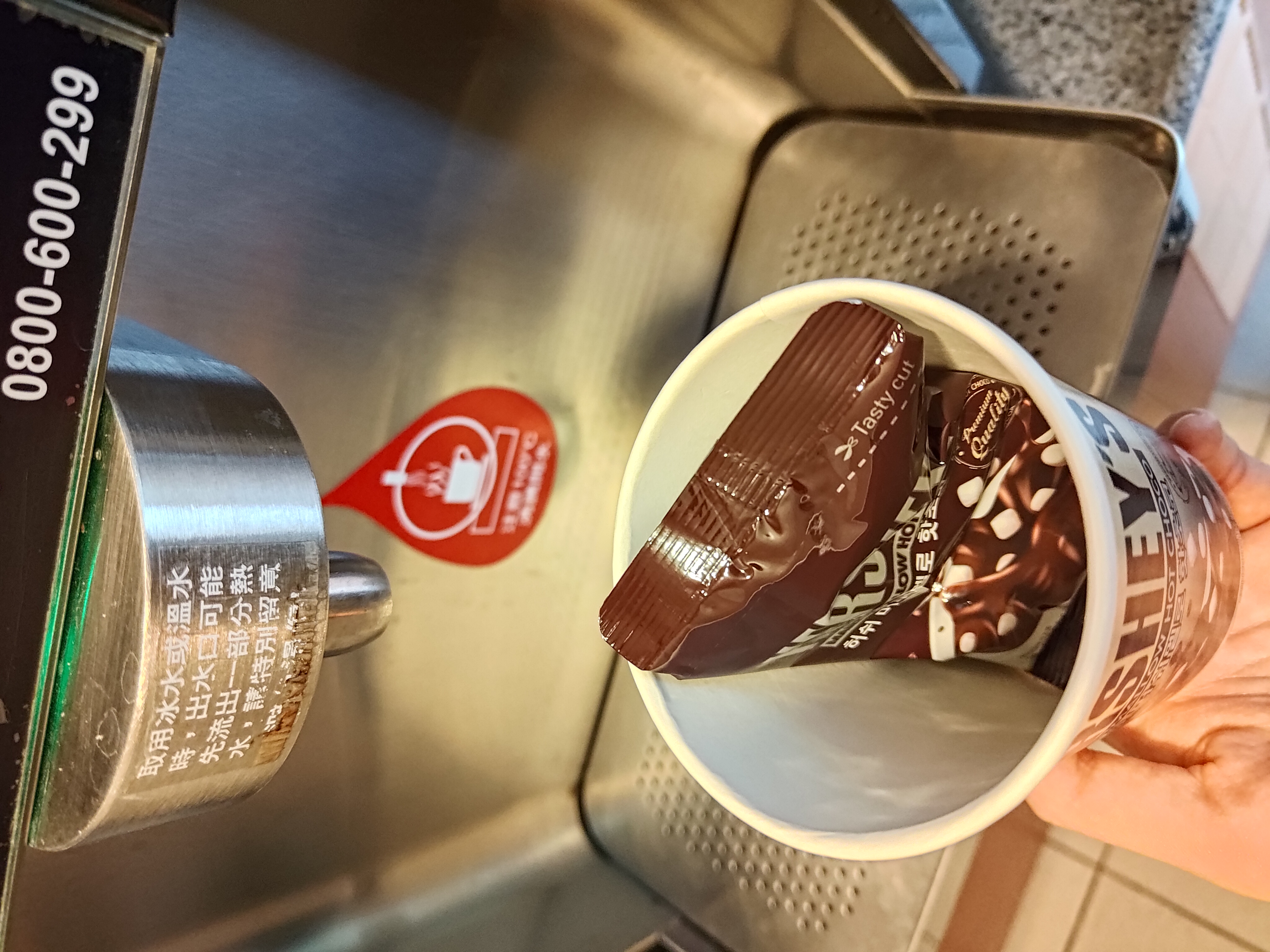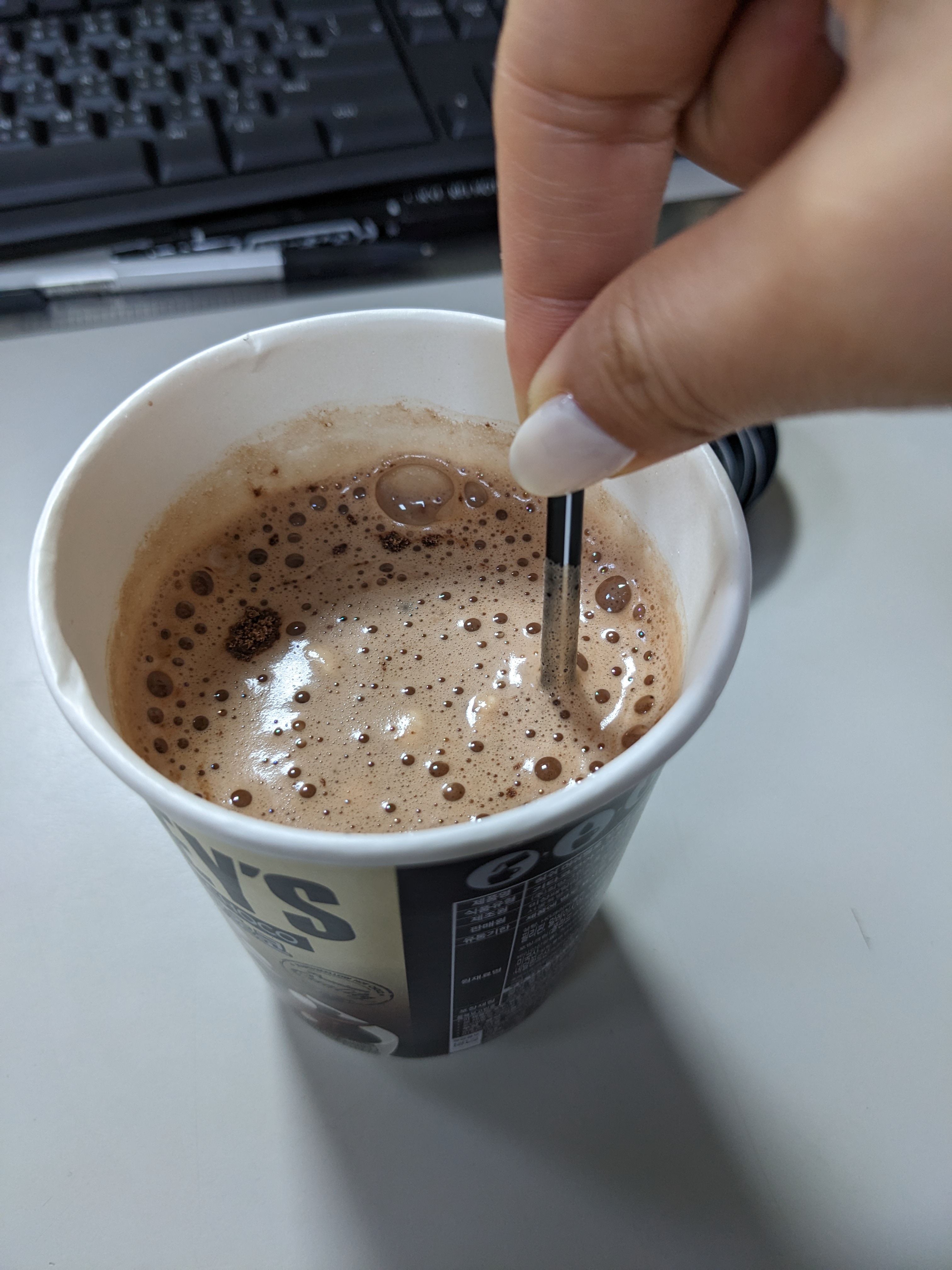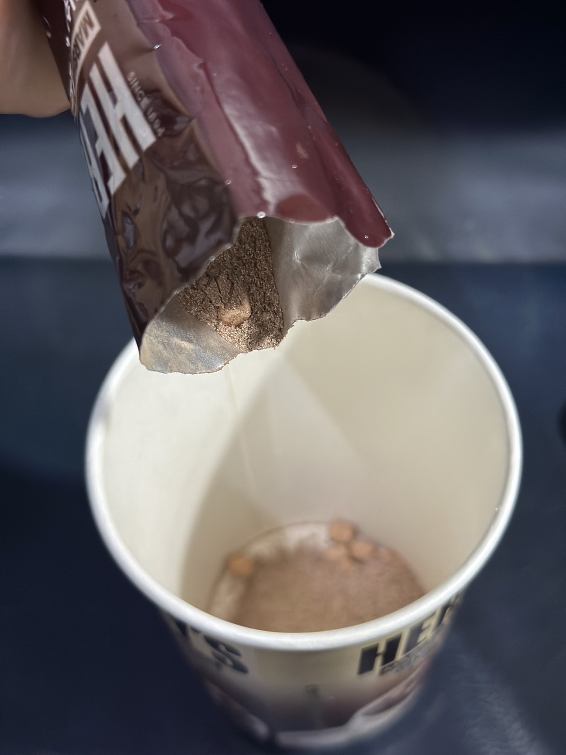 在杯子裡面放入一包巧克力粉(30公克),倒入沸水一杯(135毫升)後,攪拌均勻後飲用