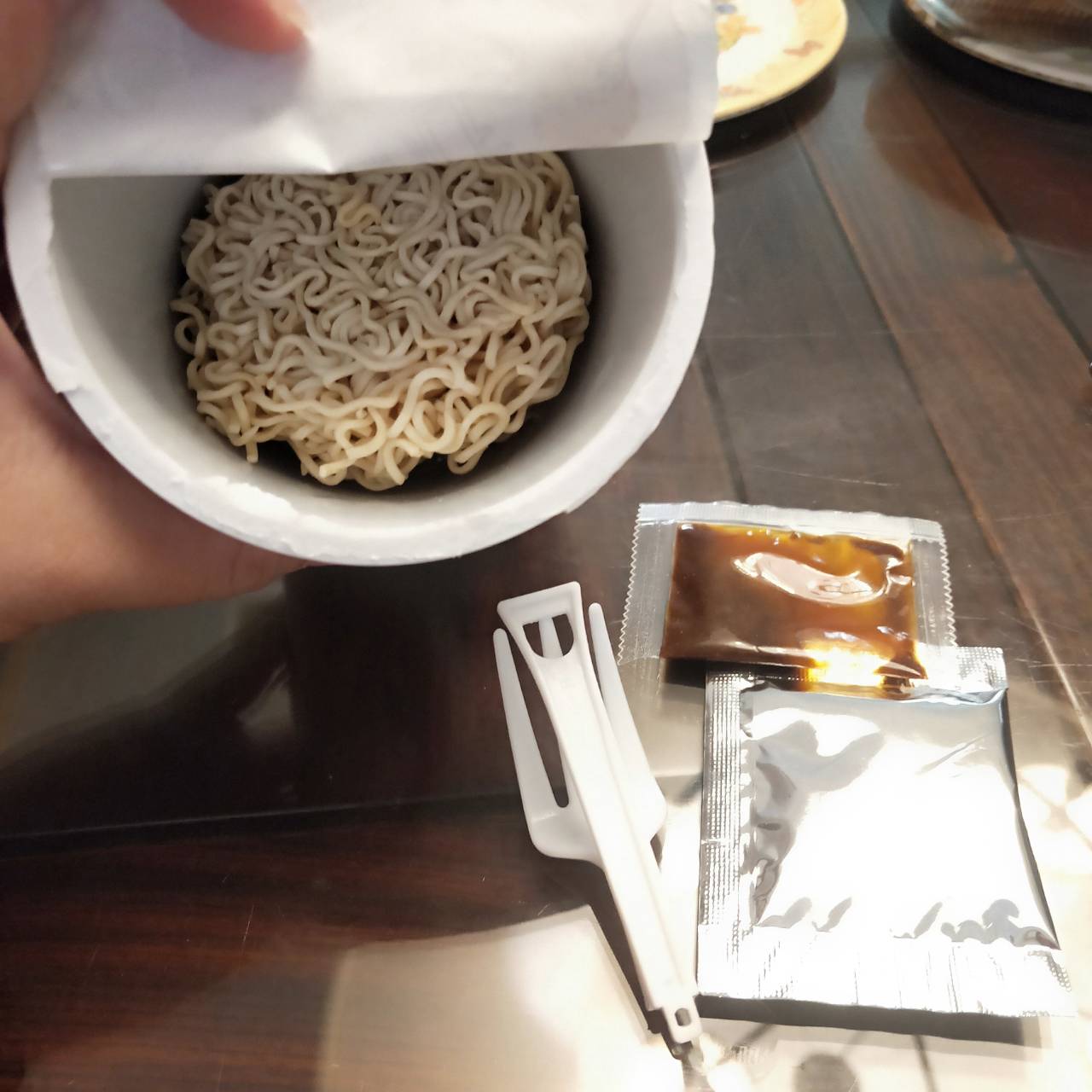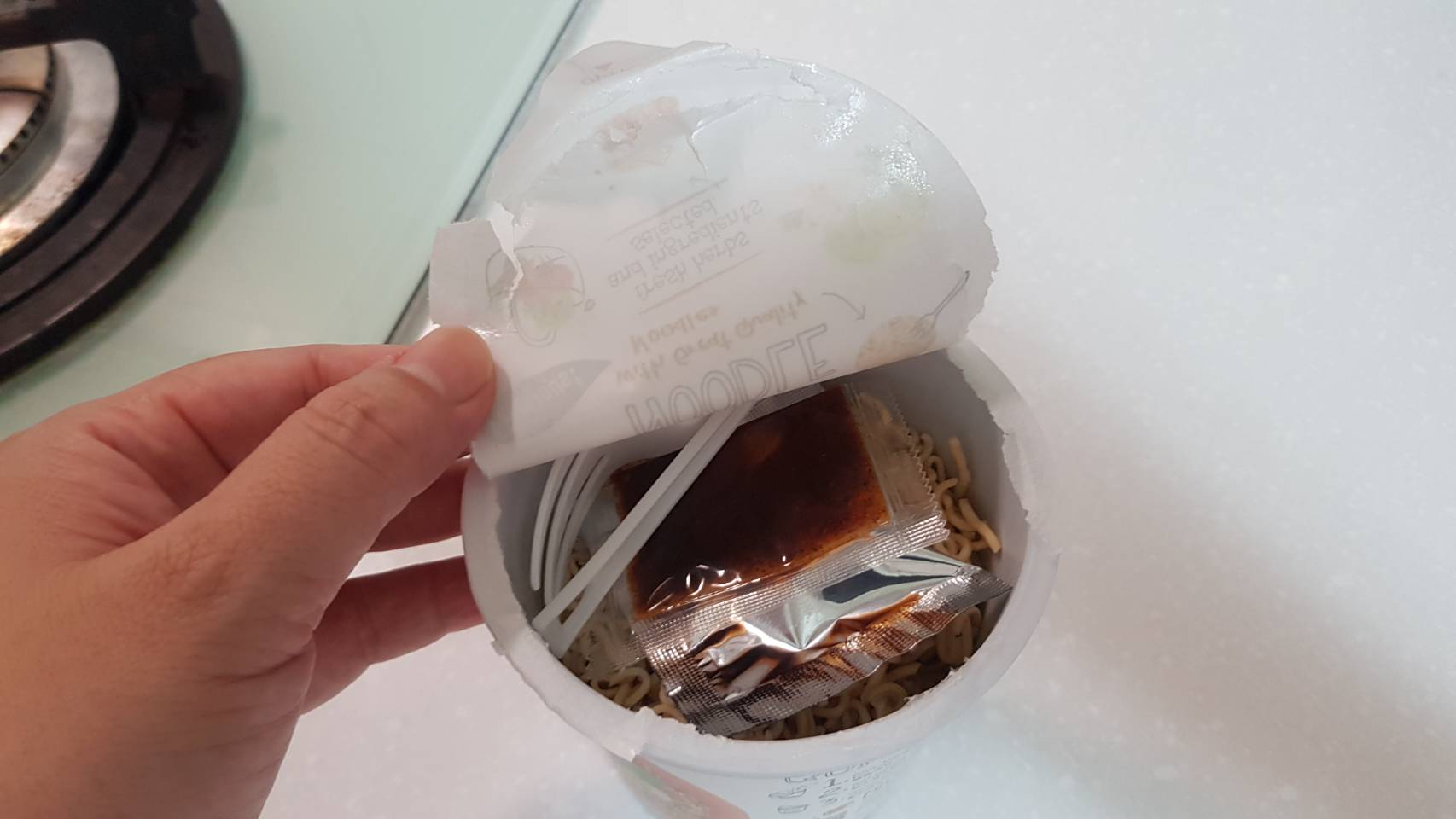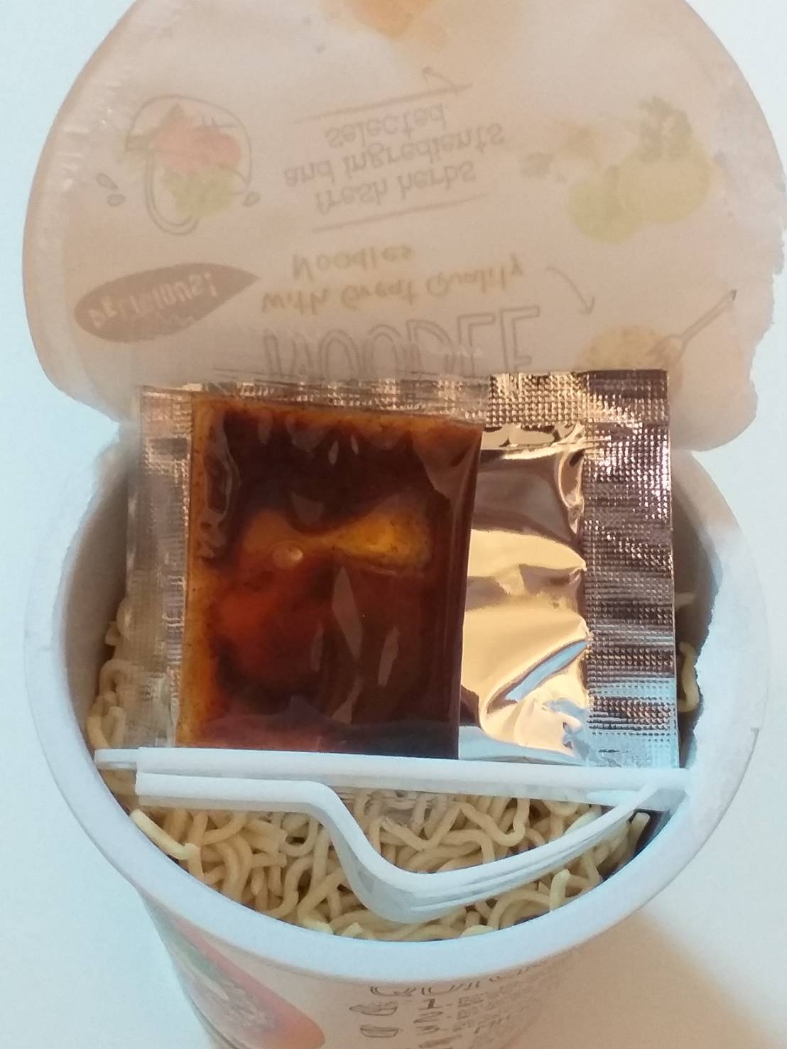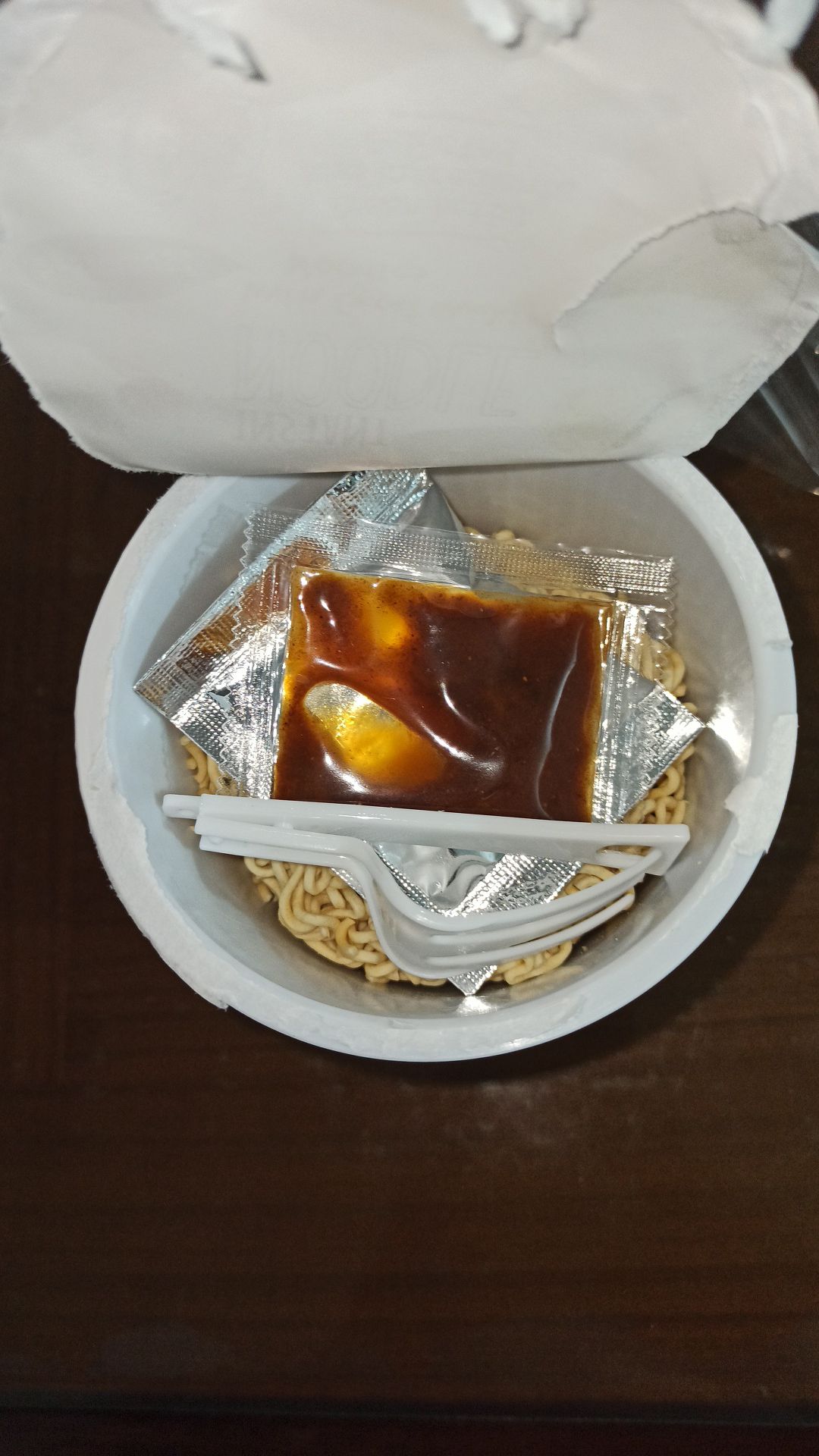 將油包、粉包倒入杯中,注入沸水,蓋上燜煮3分鐘,即可食用。