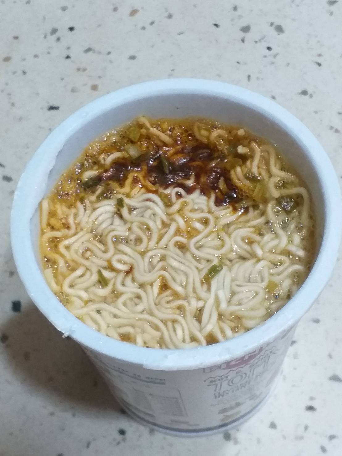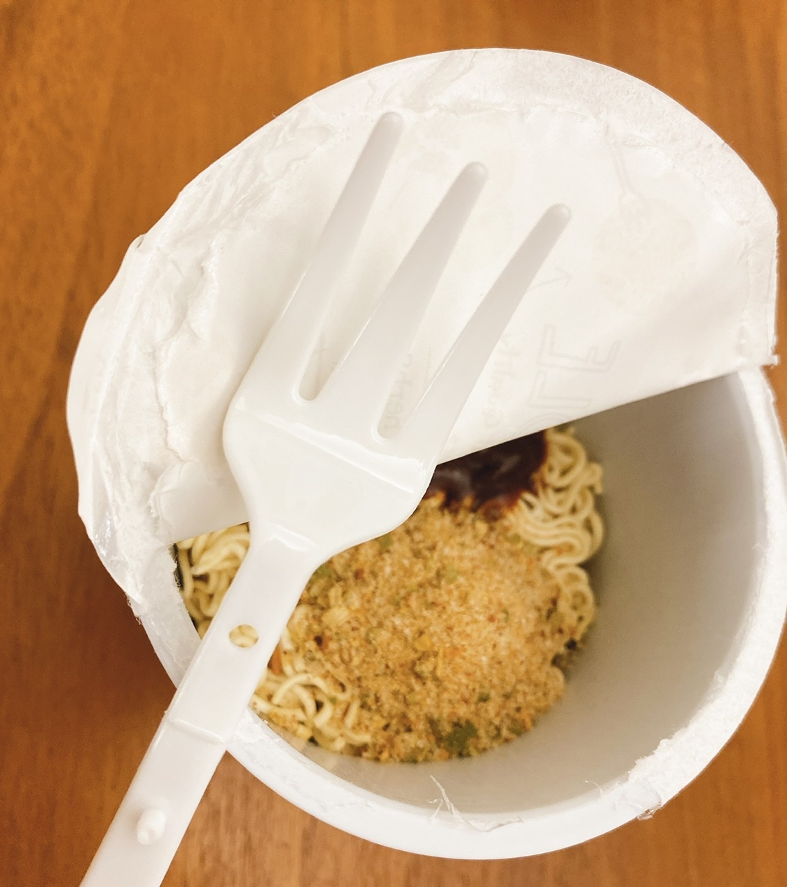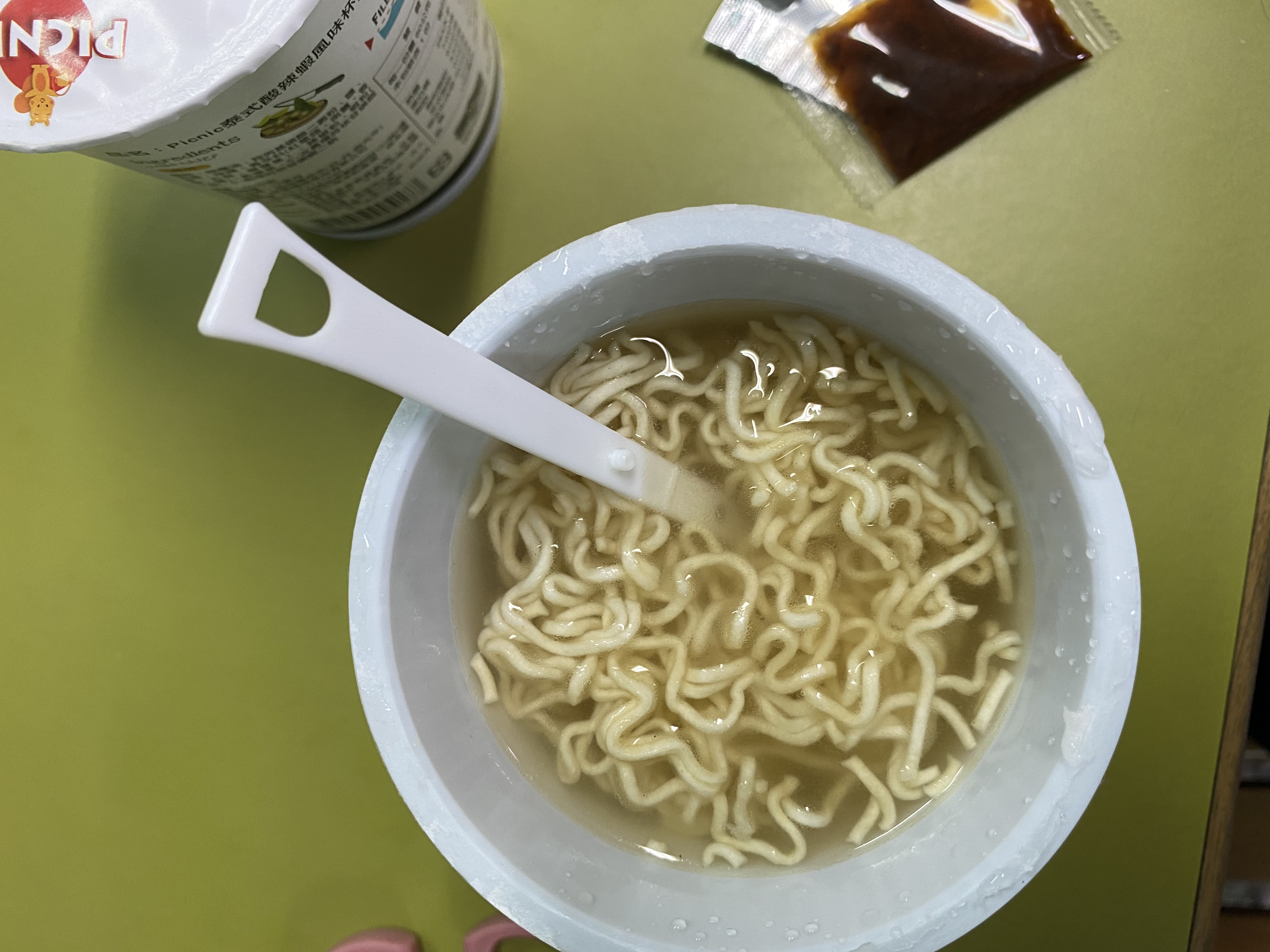 將油包、粉包倒入杯中,注入沸水,蓋上燜煮3分鐘,即可食用。