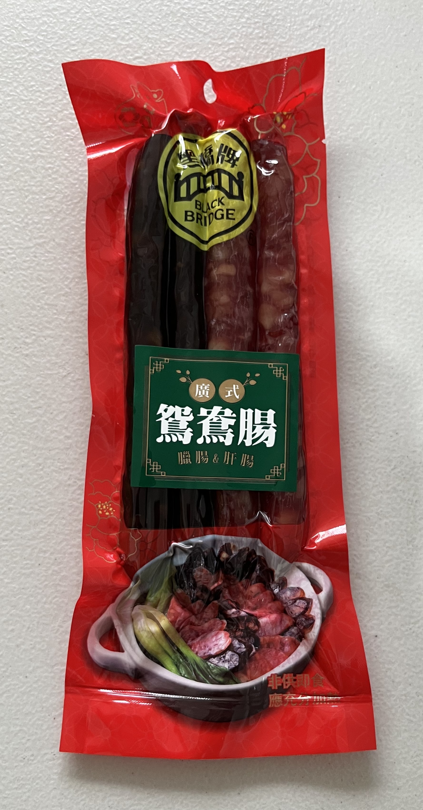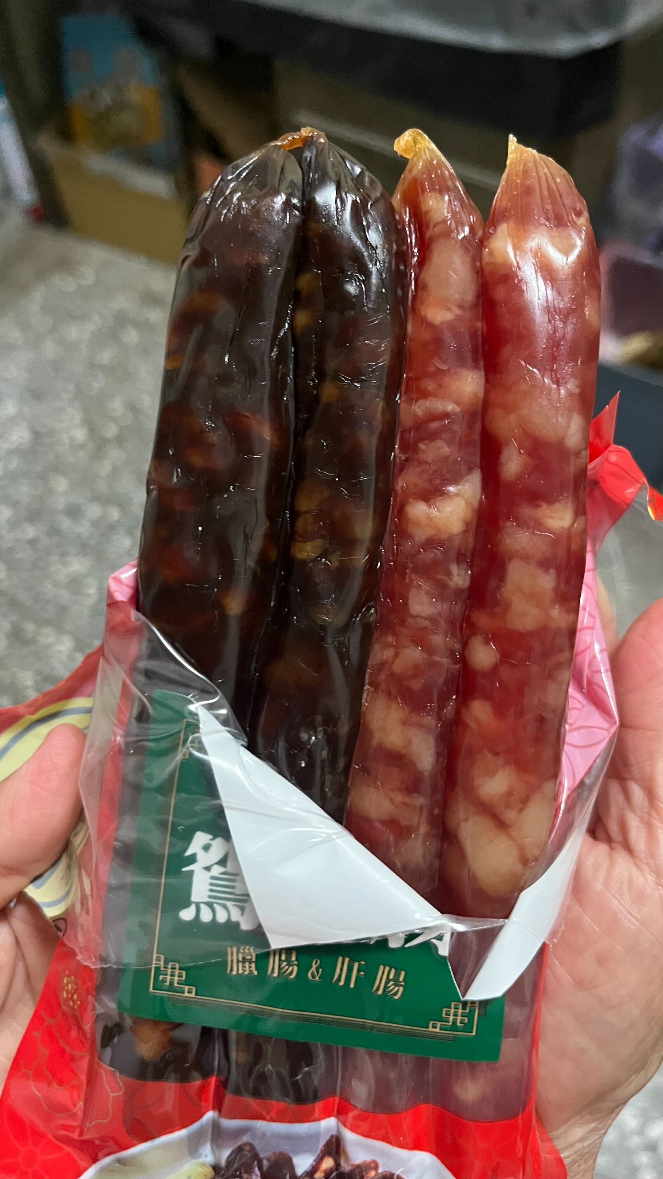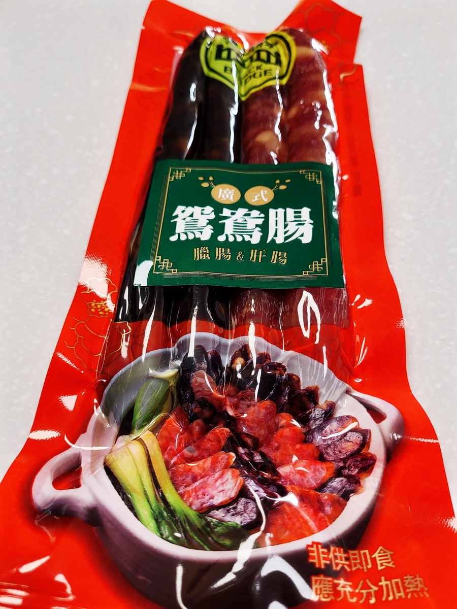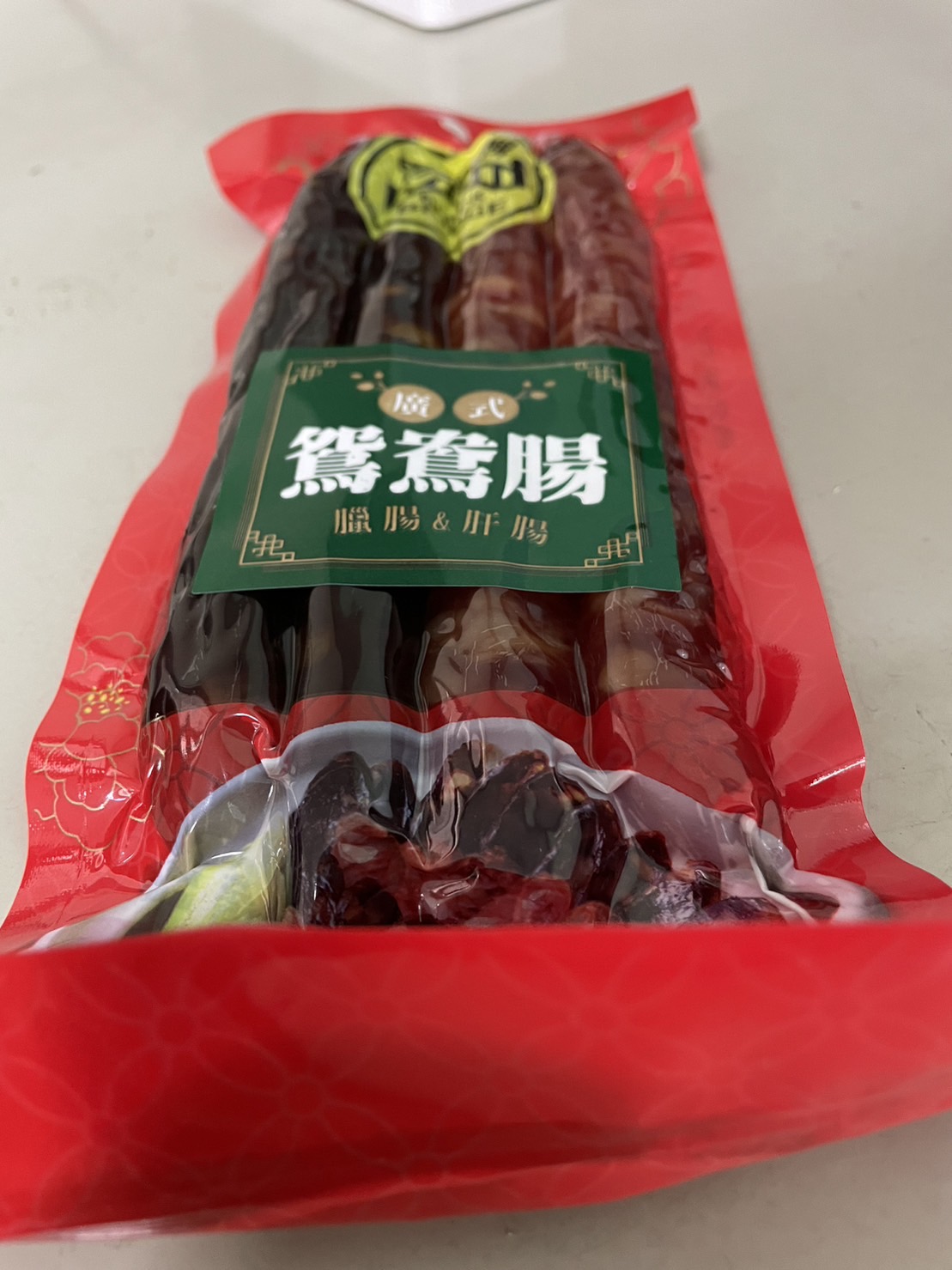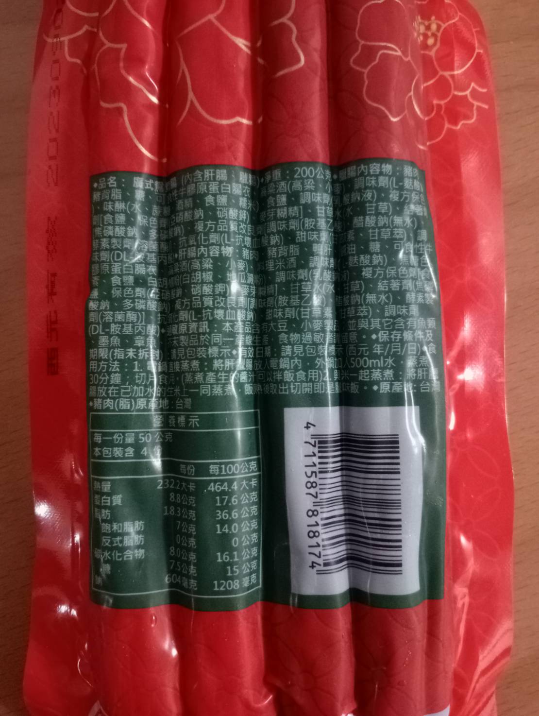 肝腸:豬肉、豬背脂、鴨肝、醬油、糖、可食性牛膠原蛋白腸衣、高粱酒(高粱、小麥)、料理米酒、調味劑( L-麩酸鈉)、焦糖色素、食鹽、白胡椒粉(白胡椒、地瓜澱粉)、調味劑(乳酸鈉液)、複方保色劑[食鹽、保色劑(亞硝酸鈉、硝酸鉀)、麥芽糊精]、甘草水(水、甘草)、結著劑(焦磷酸鈉、多磷酸鈉)、複方品質改良劑[調味劑(胺基乙酸)、醋酸鈉(無水)、酵素製劑(溶菌酶)]、抗氧化劑(L-抗壞血酸鈉)、甜味劑(甘草素、甘草萃)、調味劑(DL-胺基丙酸)