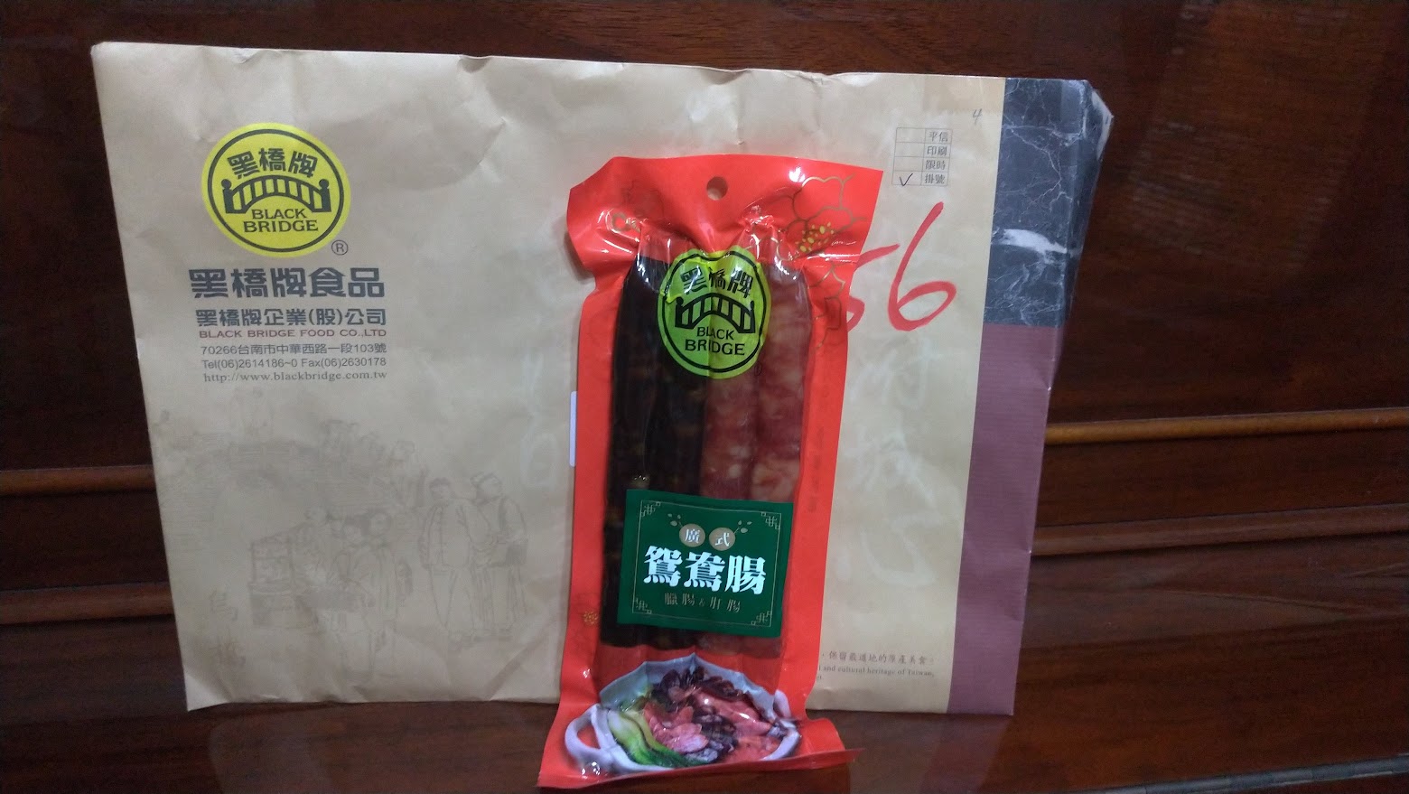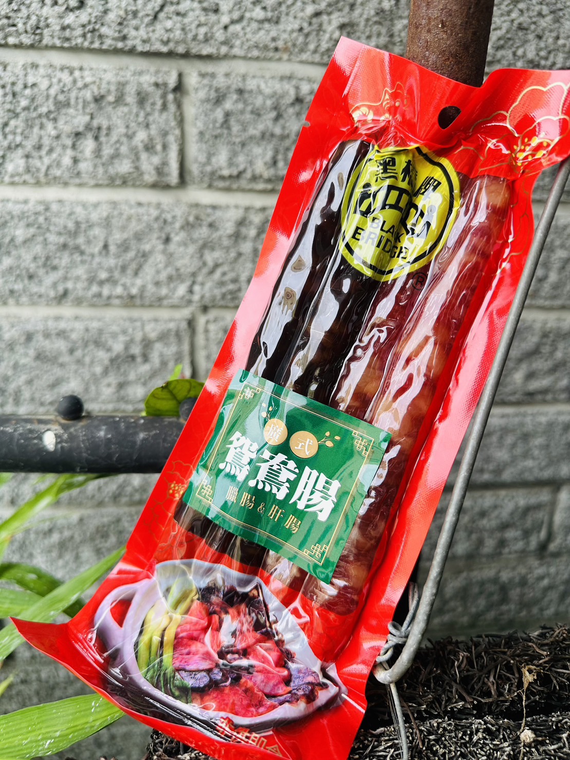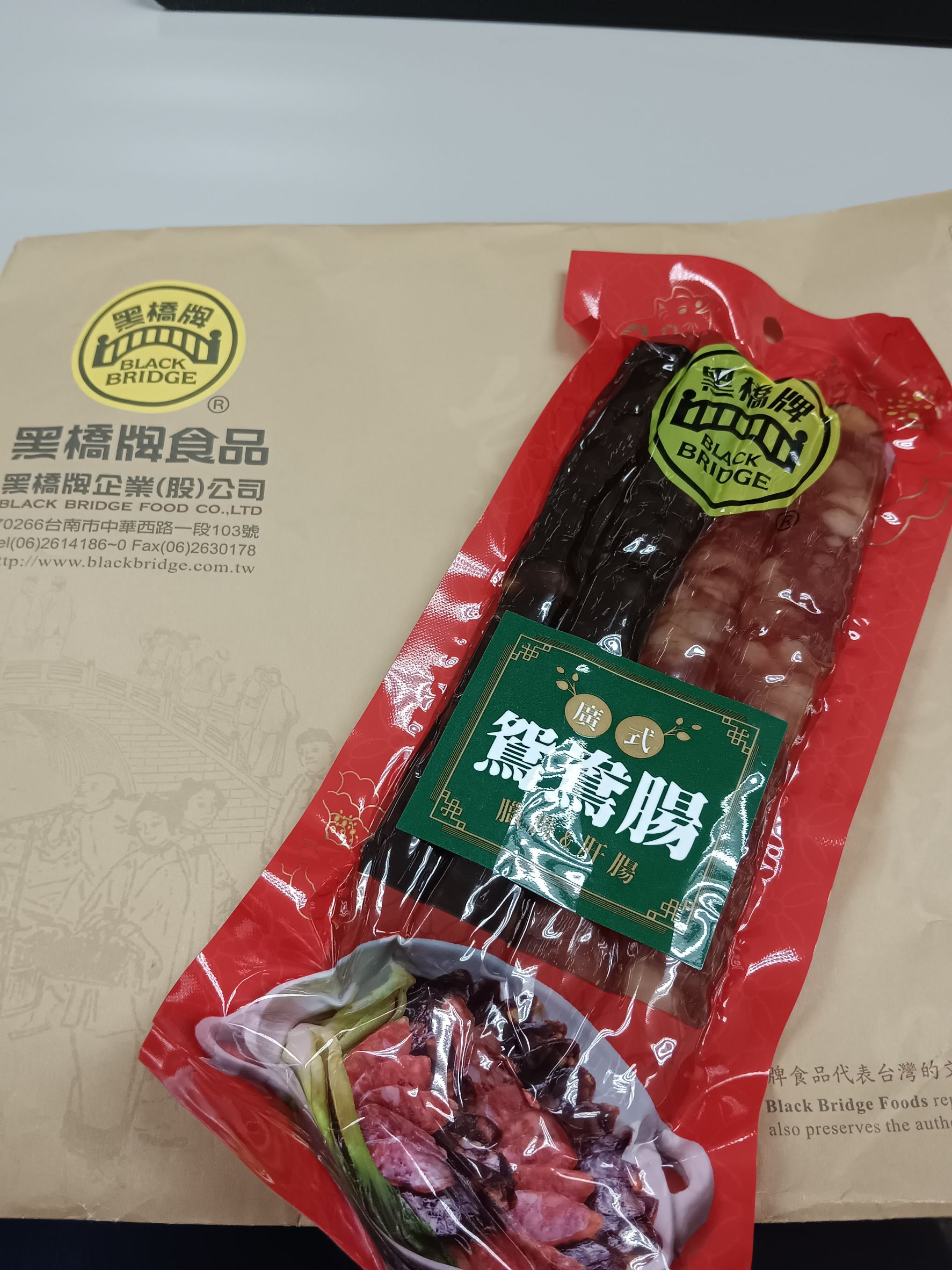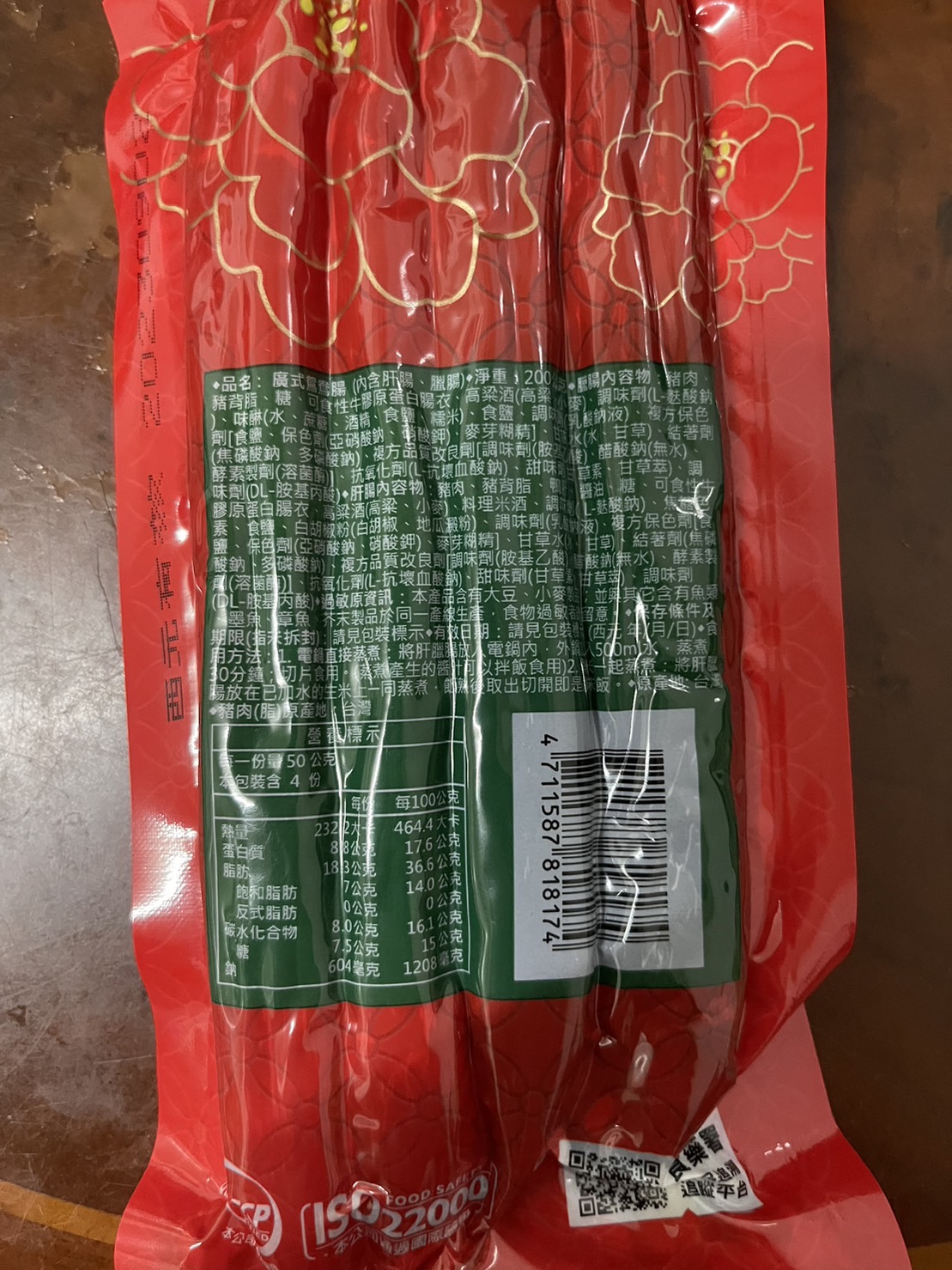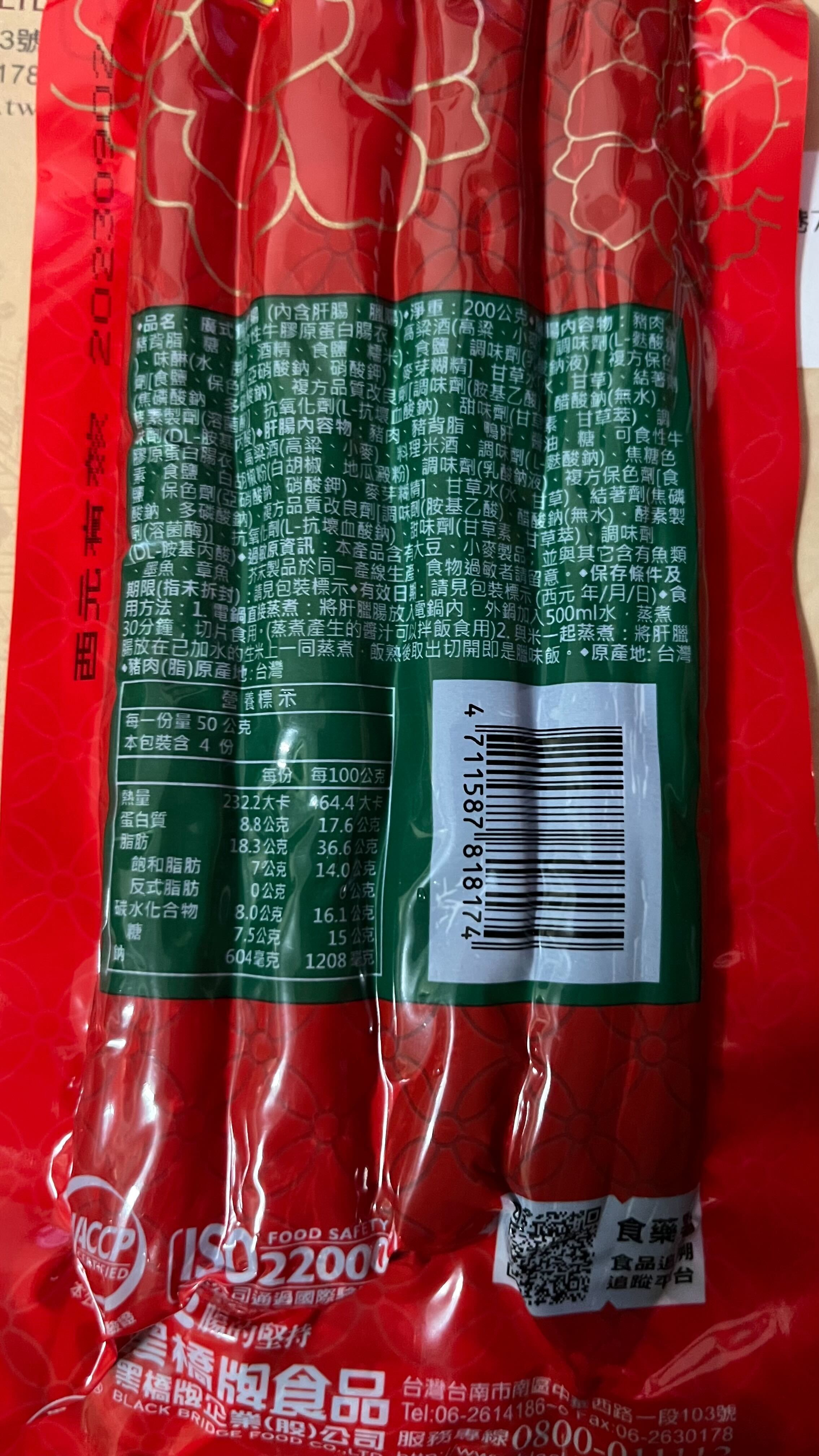 肝腸:豬肉、豬背脂、鴨肝、醬油、糖、可食性牛膠原蛋白腸衣、高粱酒(高粱、小麥)、料理米酒、調味劑( L-麩酸鈉)、焦糖色素、食鹽、白胡椒粉(白胡椒、地瓜澱粉)、調味劑(乳酸鈉液)、複方保色劑[食鹽、保色劑(亞硝酸鈉、硝酸鉀)、麥芽糊精]、甘草水(水、甘草)、結著劑(焦磷酸鈉、多磷酸鈉)、複方品質改良劑[調味劑(胺基乙酸)、醋酸鈉(無水)、酵素製劑(溶菌酶)]、抗氧化劑(L-抗壞血酸鈉)、甜味劑(甘草素、甘草萃)、調味劑(DL-胺基丙酸)