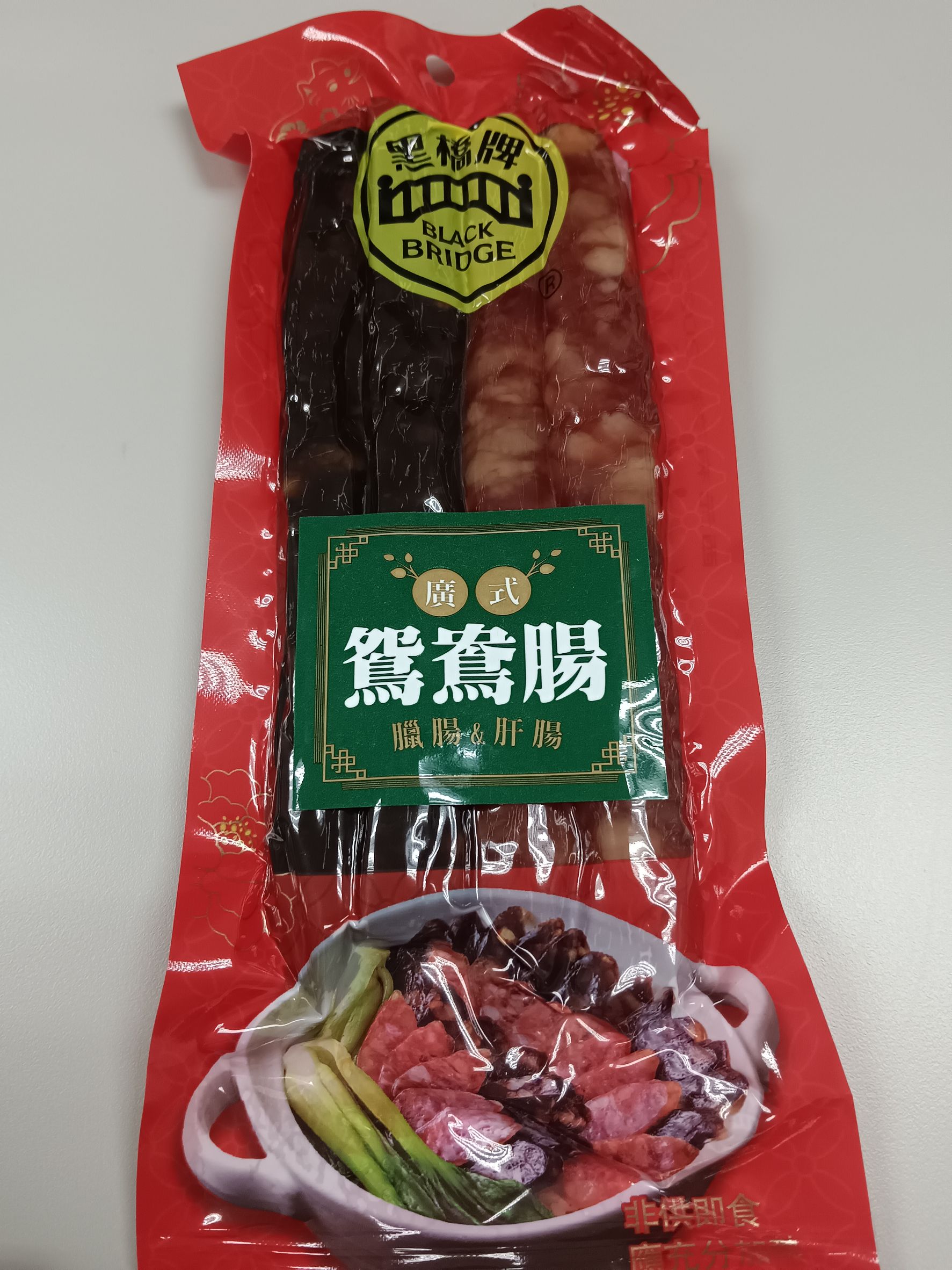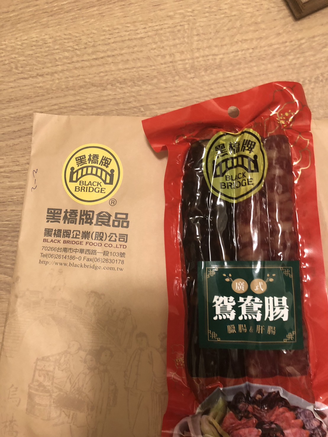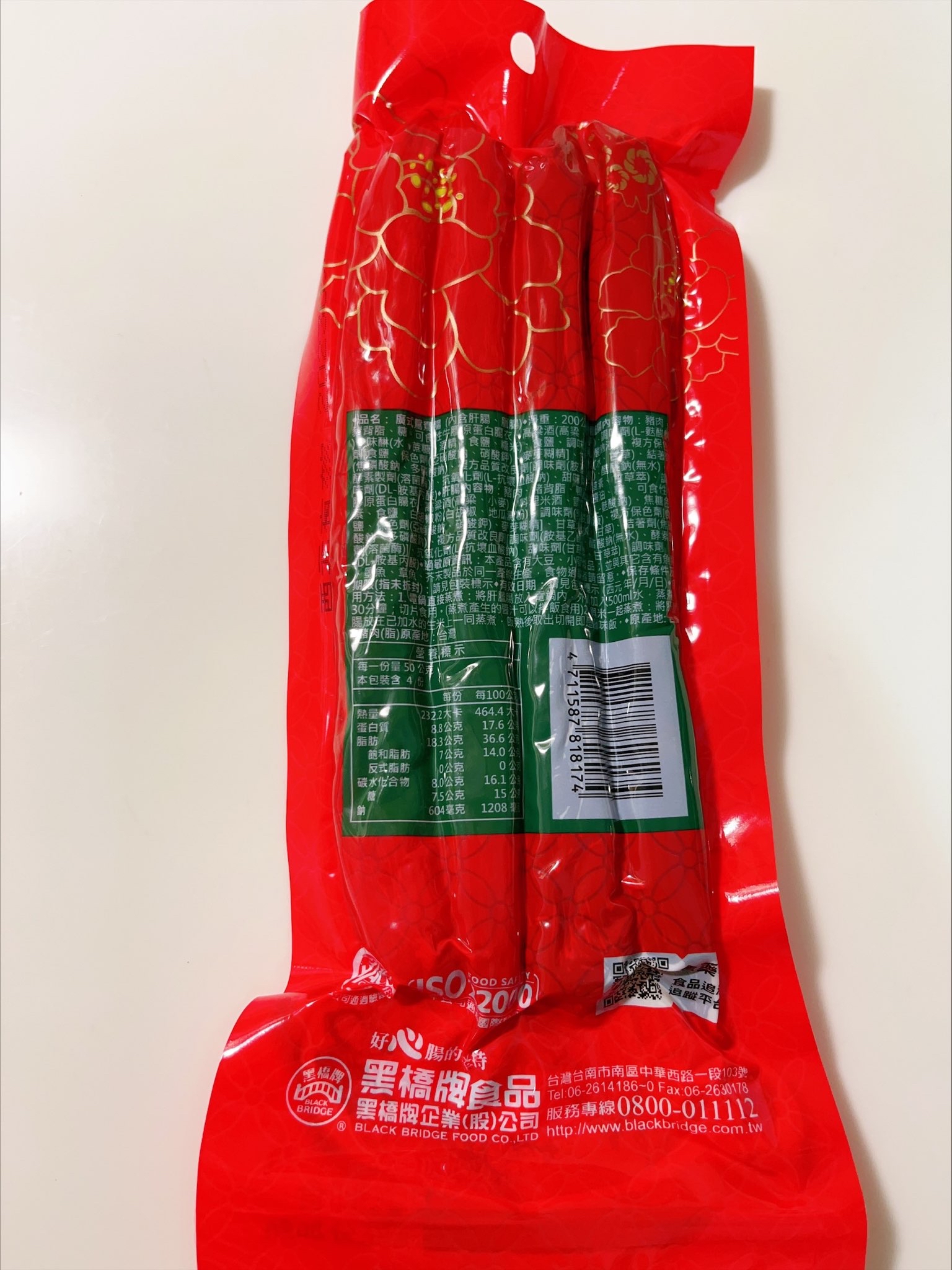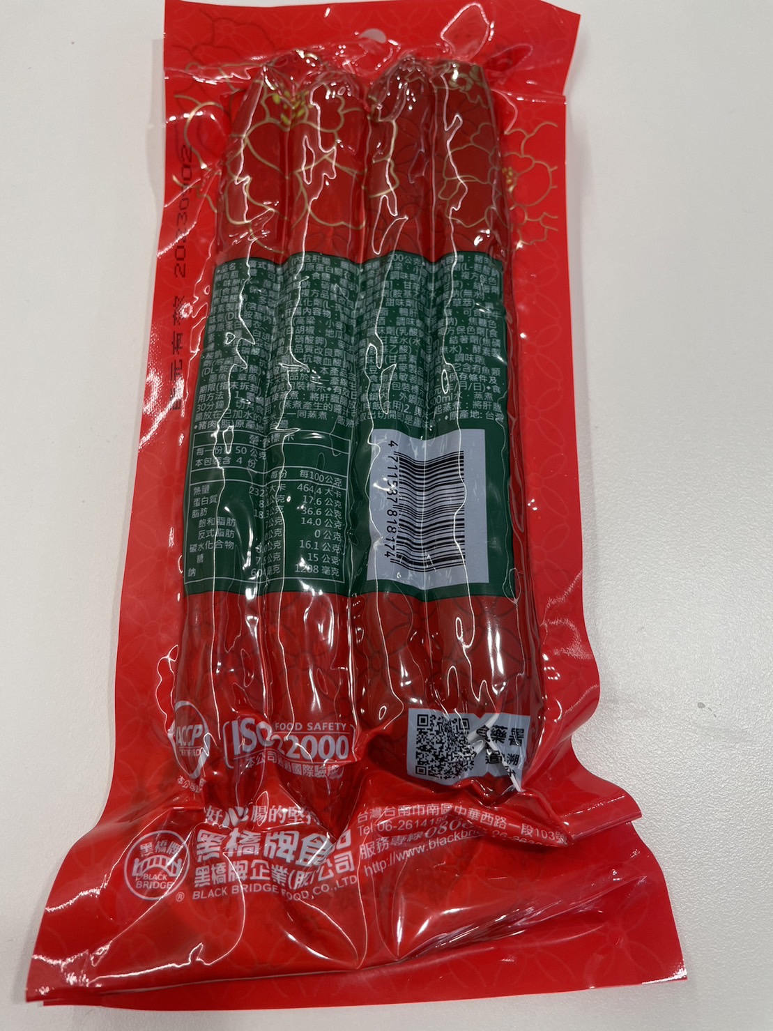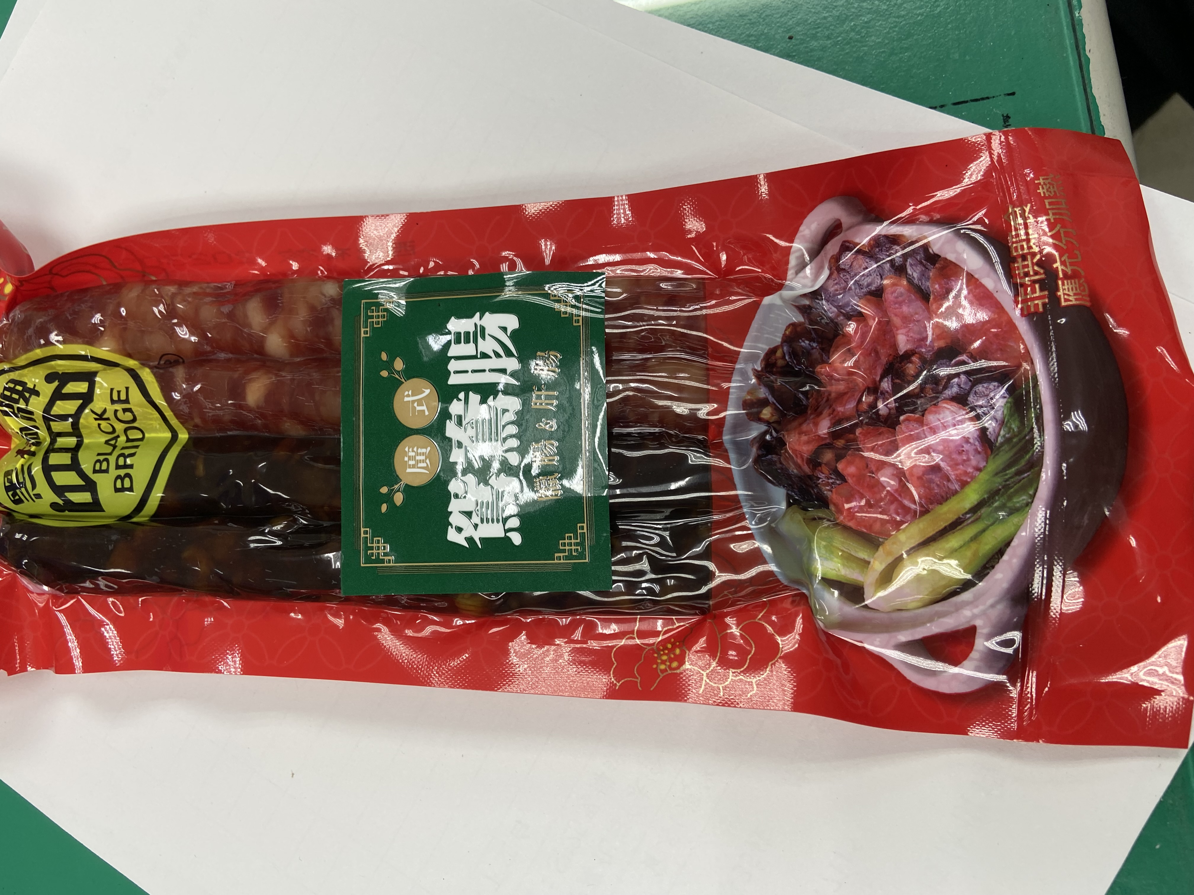 肝腸:豬肉、豬背脂、鴨肝、醬油、糖、可食性牛膠原蛋白腸衣、高粱酒(高粱、小麥)、料理米酒、調味劑( L-麩酸鈉)、焦糖色素、食鹽、白胡椒粉(白胡椒、地瓜澱粉)、調味劑(乳酸鈉液)、複方保色劑[食鹽、保色劑(亞硝酸鈉、硝酸鉀)、麥芽糊精]、甘草水(水、甘草)、結著劑(焦磷酸鈉、多磷酸鈉)、複方品質改良劑[調味劑(胺基乙酸)、醋酸鈉(無水)、酵素製劑(溶菌酶)]、抗氧化劑(L-抗壞血酸鈉)、甜味劑(甘草素、甘草萃)、調味劑(DL-胺基丙酸)