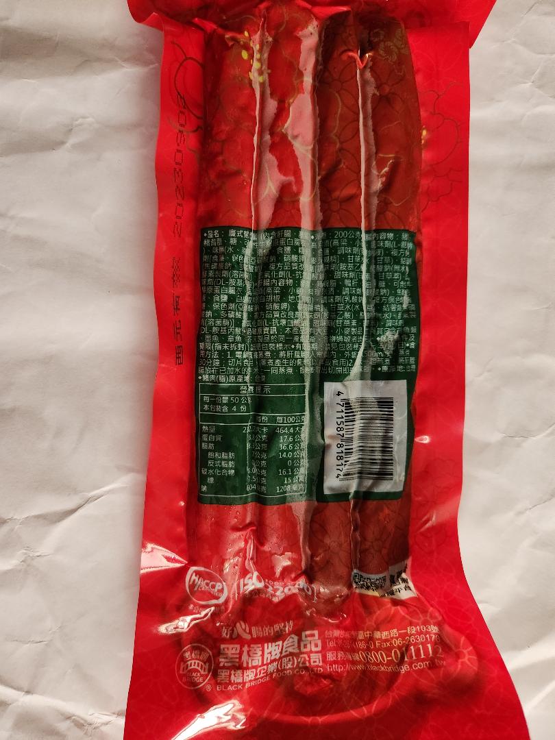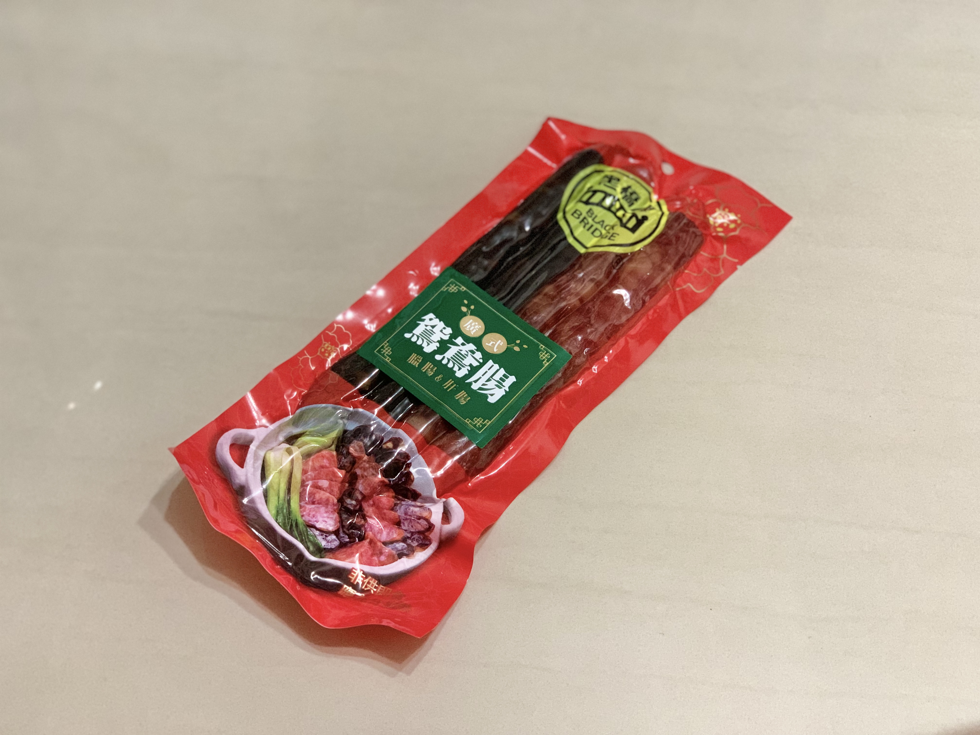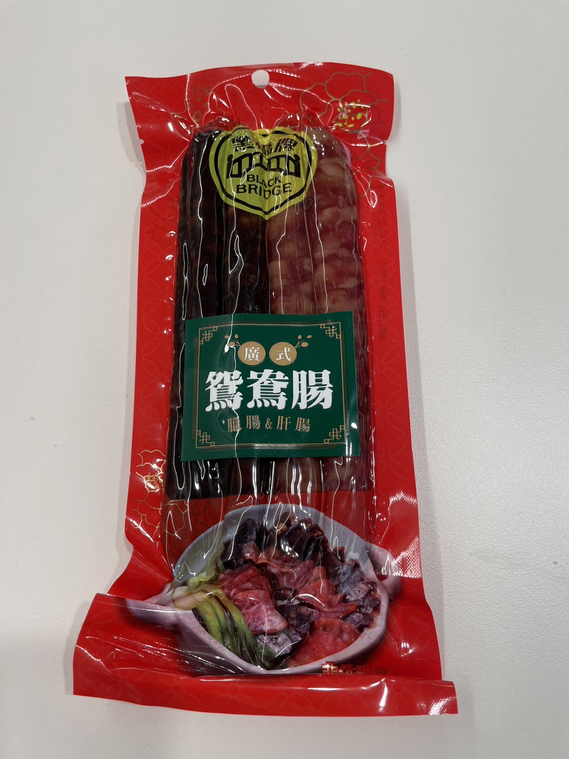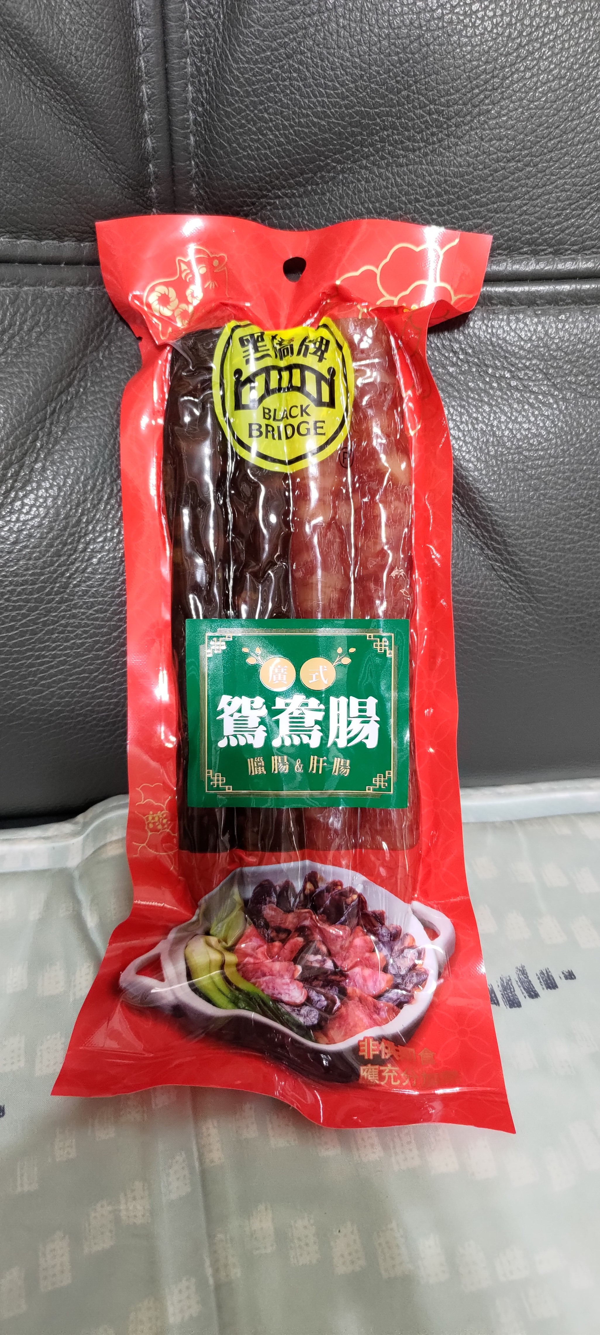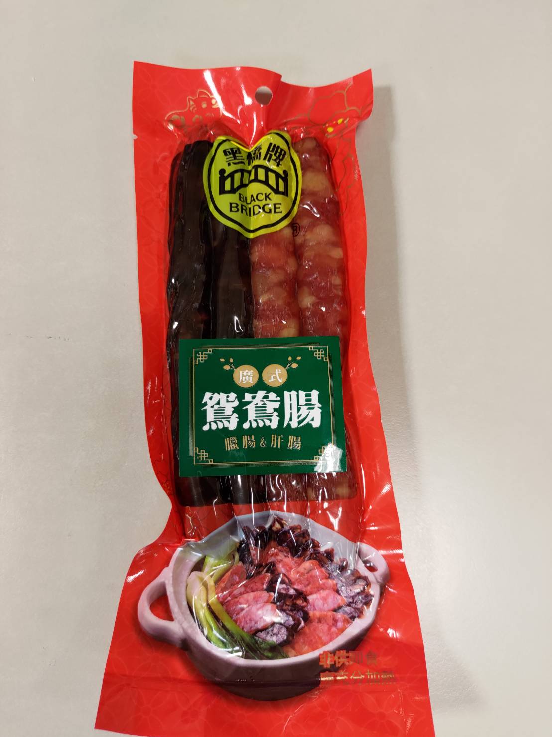 肝腸:豬肉、豬背脂、鴨肝、醬油、糖、可食性牛膠原蛋白腸衣、高粱酒(高粱、小麥)、料理米酒、調味劑( L-麩酸鈉)、焦糖色素、食鹽、白胡椒粉(白胡椒、地瓜澱粉)、調味劑(乳酸鈉液)、複方保色劑[食鹽、保色劑(亞硝酸鈉、硝酸鉀)、麥芽糊精]、甘草水(水、甘草)、結著劑(焦磷酸鈉、多磷酸鈉)、複方品質改良劑[調味劑(胺基乙酸)、醋酸鈉(無水)、酵素製劑(溶菌酶)]、抗氧化劑(L-抗壞血酸鈉)、甜味劑(甘草素、甘草萃)、調味劑(DL-胺基丙酸)