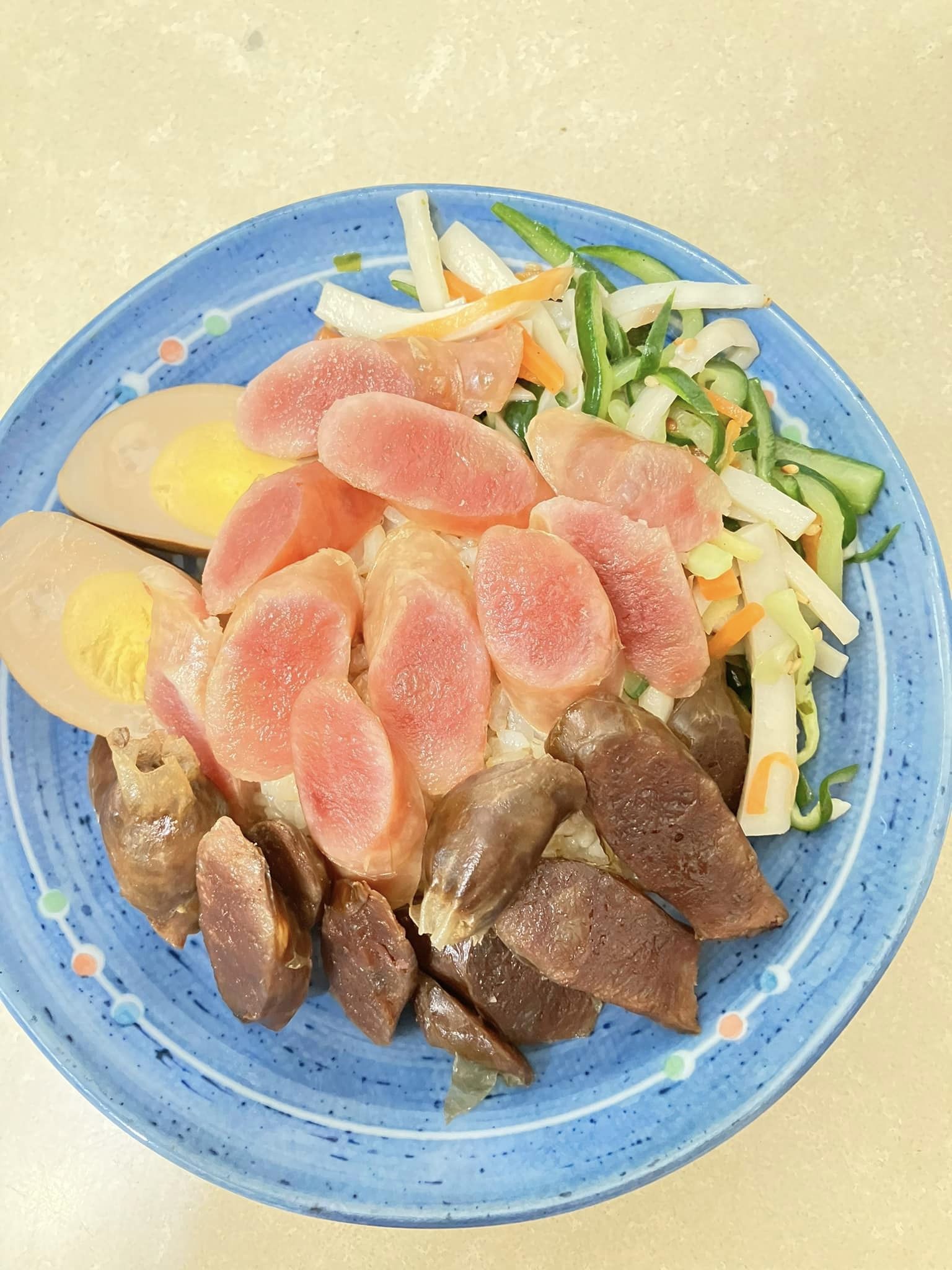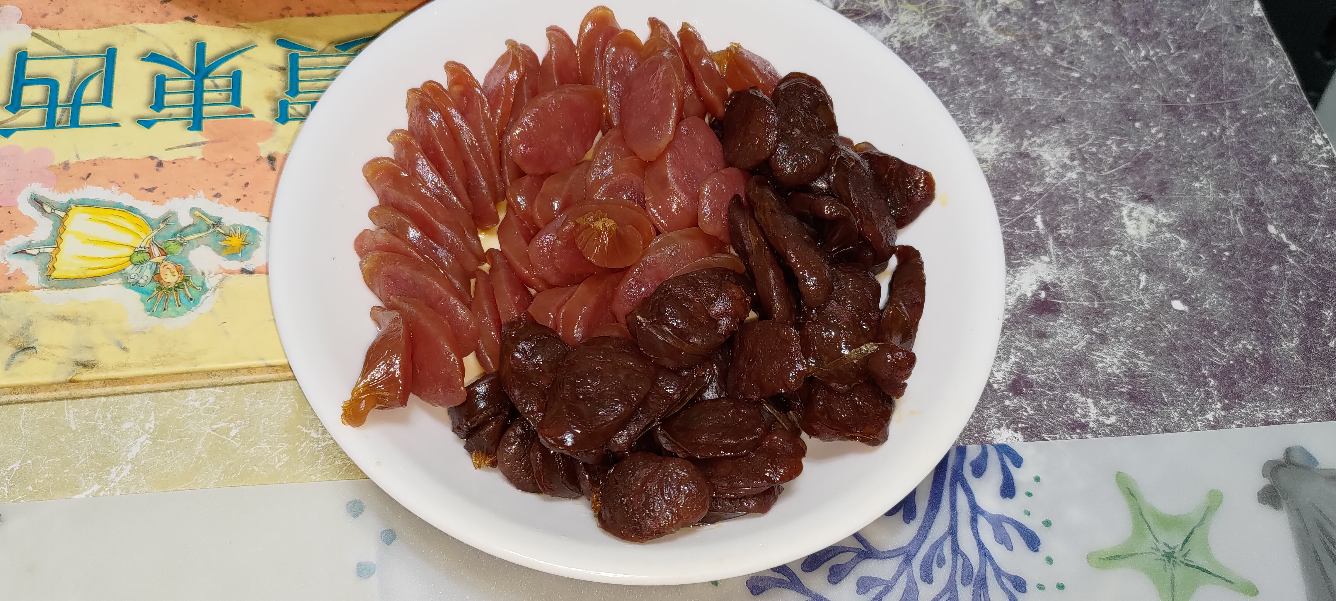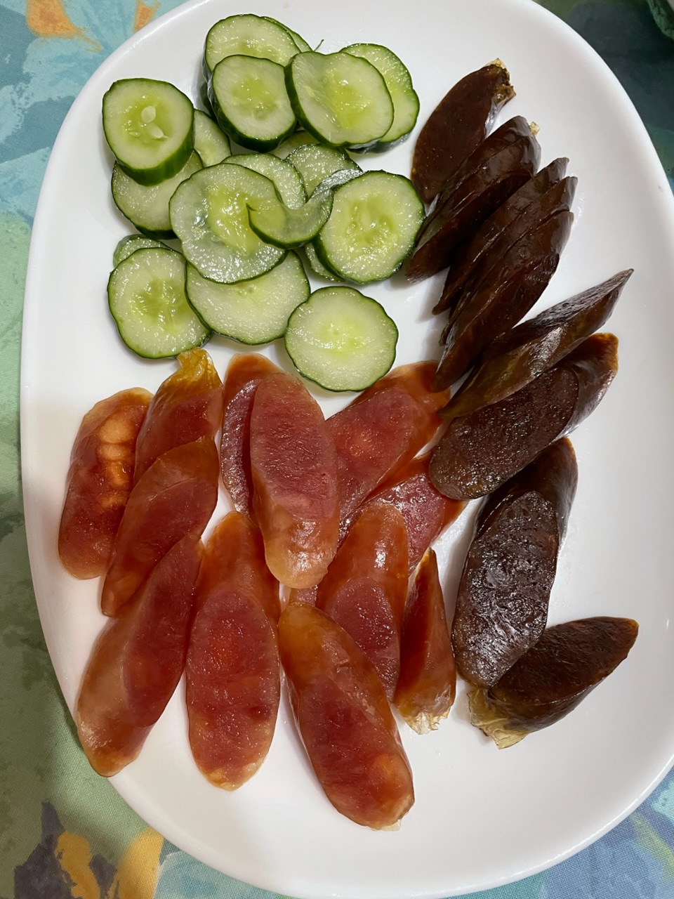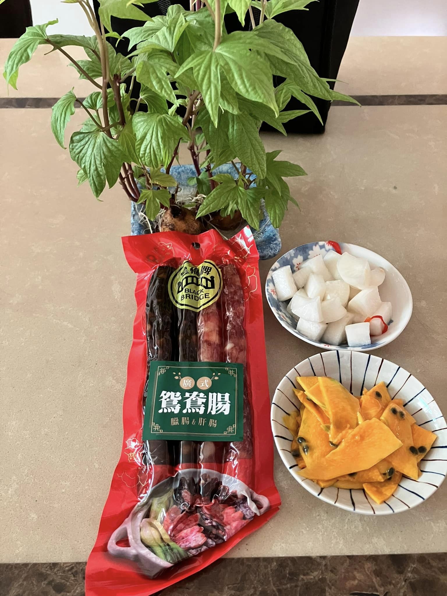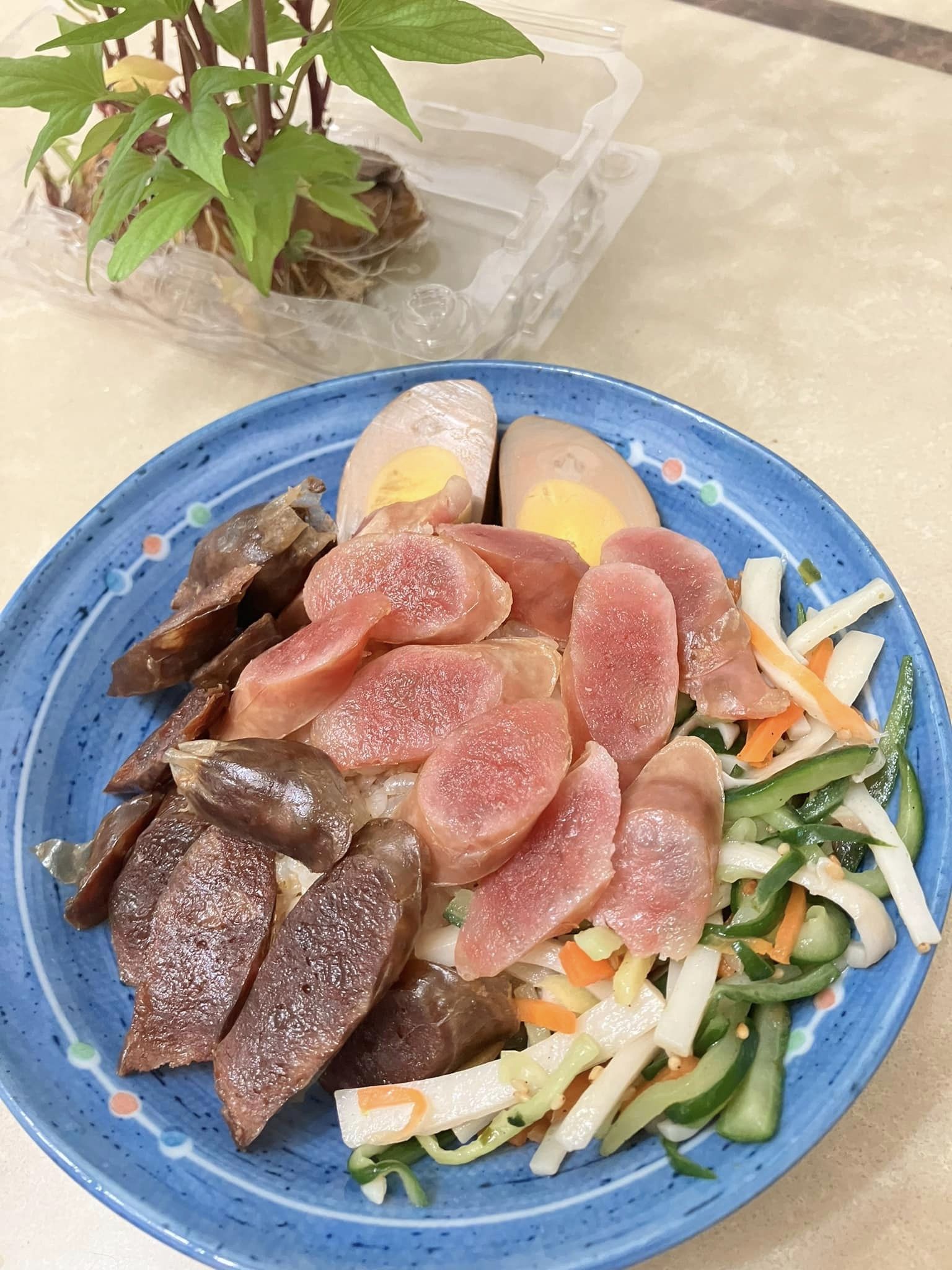 肝腸:豬肉、豬背脂、鴨肝、醬油、糖、可食性牛膠原蛋白腸衣、高粱酒(高粱、小麥)、料理米酒、調味劑( L-麩酸鈉)、焦糖色素、食鹽、白胡椒粉(白胡椒、地瓜澱粉)、調味劑(乳酸鈉液)、複方保色劑[食鹽、保色劑(亞硝酸鈉、硝酸鉀)、麥芽糊精]、甘草水(水、甘草)、結著劑(焦磷酸鈉、多磷酸鈉)、複方品質改良劑[調味劑(胺基乙酸)、醋酸鈉(無水)、酵素製劑(溶菌酶)]、抗氧化劑(L-抗壞血酸鈉)、甜味劑(甘草素、甘草萃)、調味劑(DL-胺基丙酸)