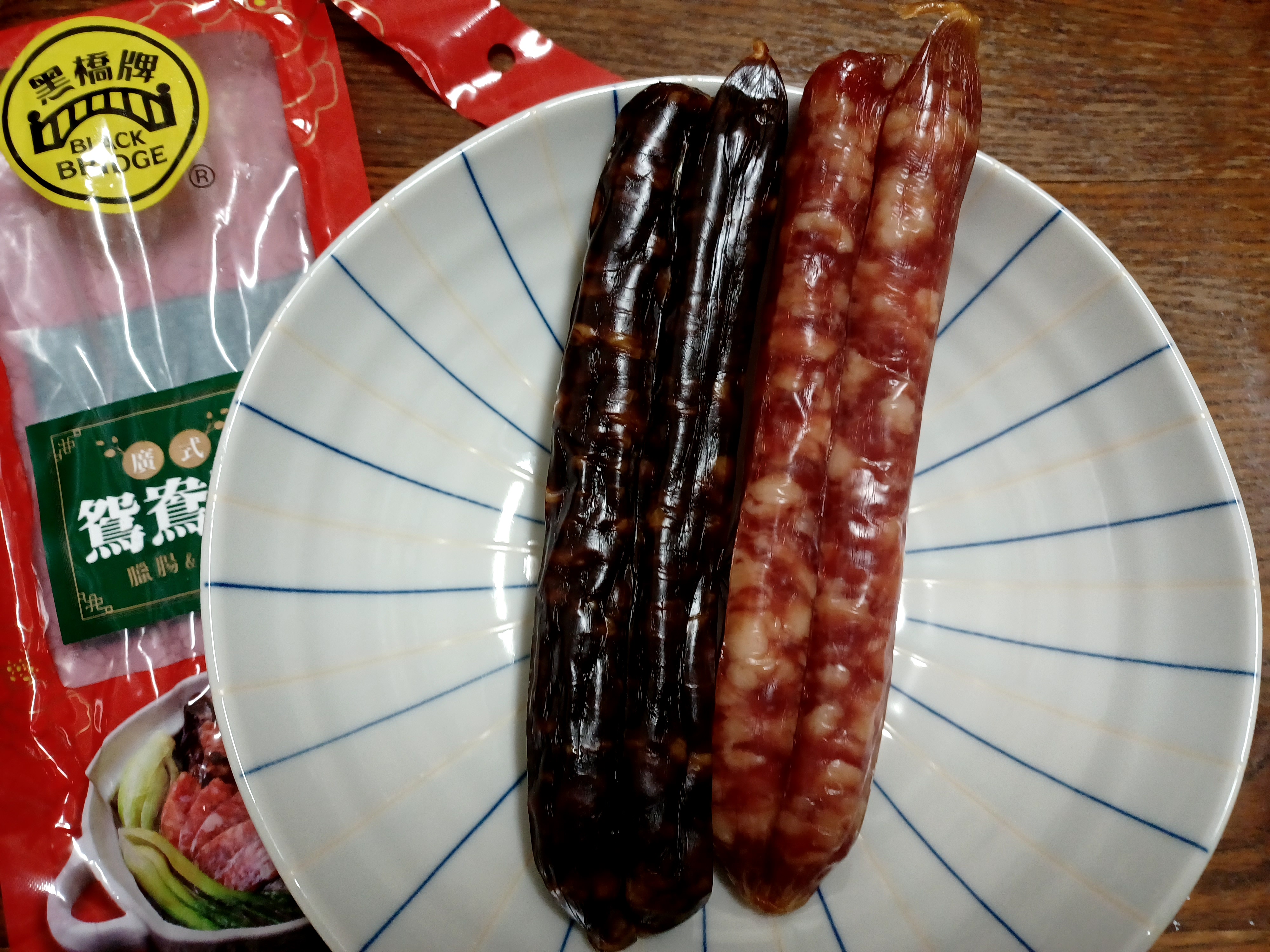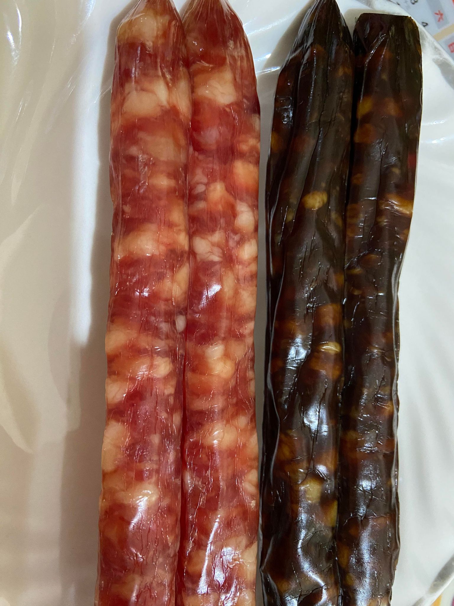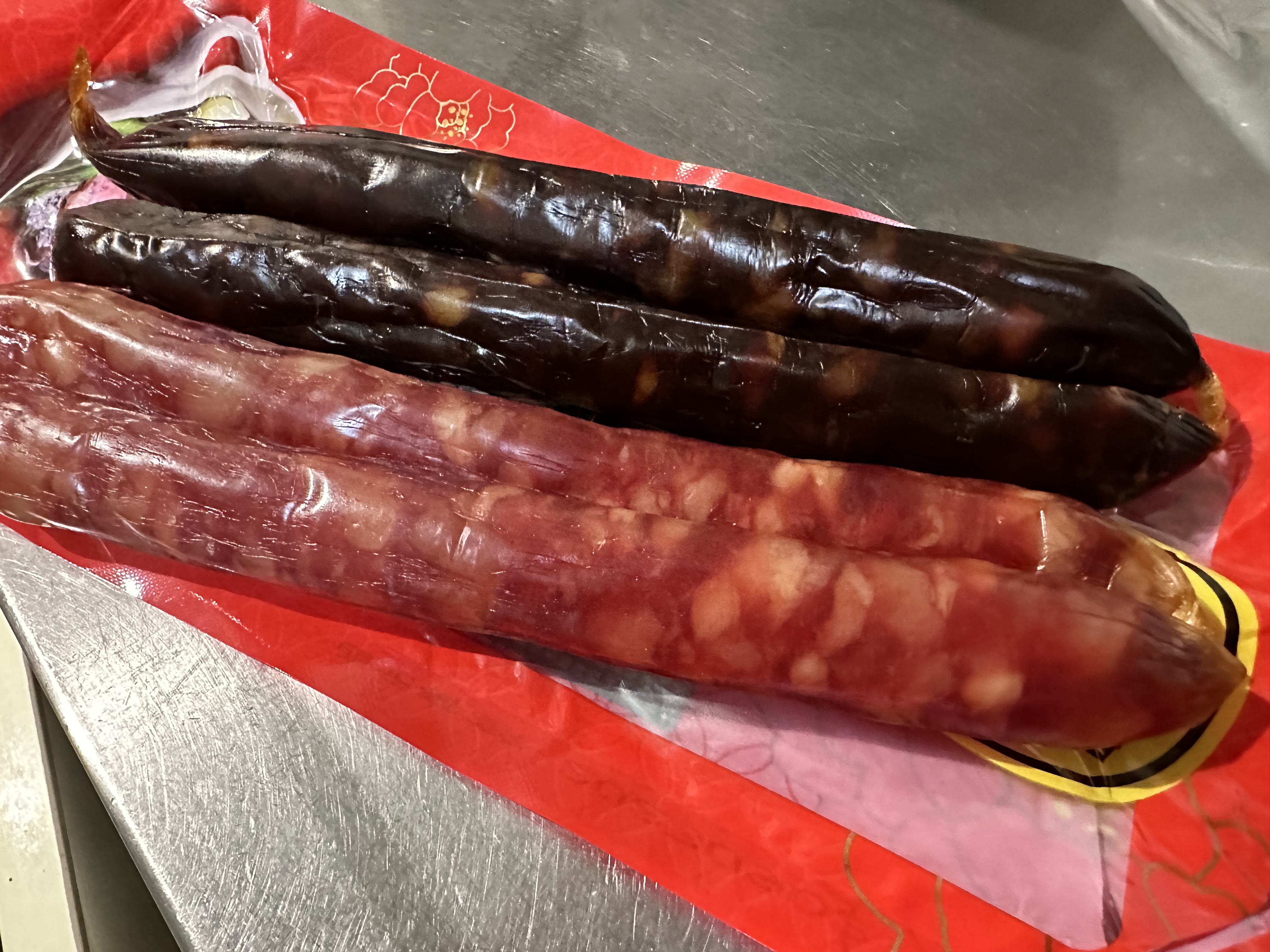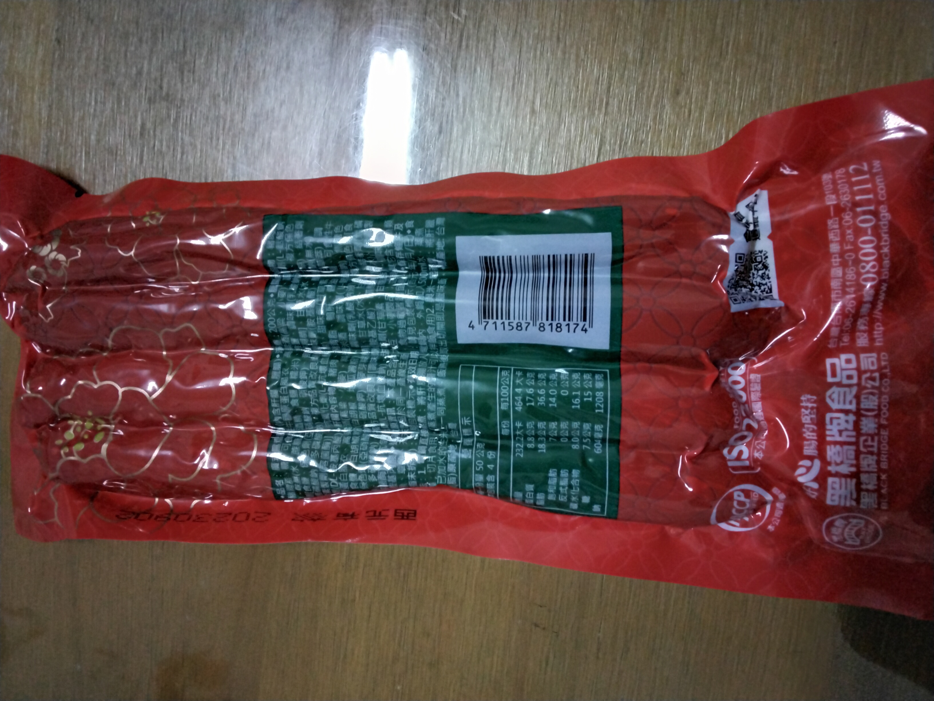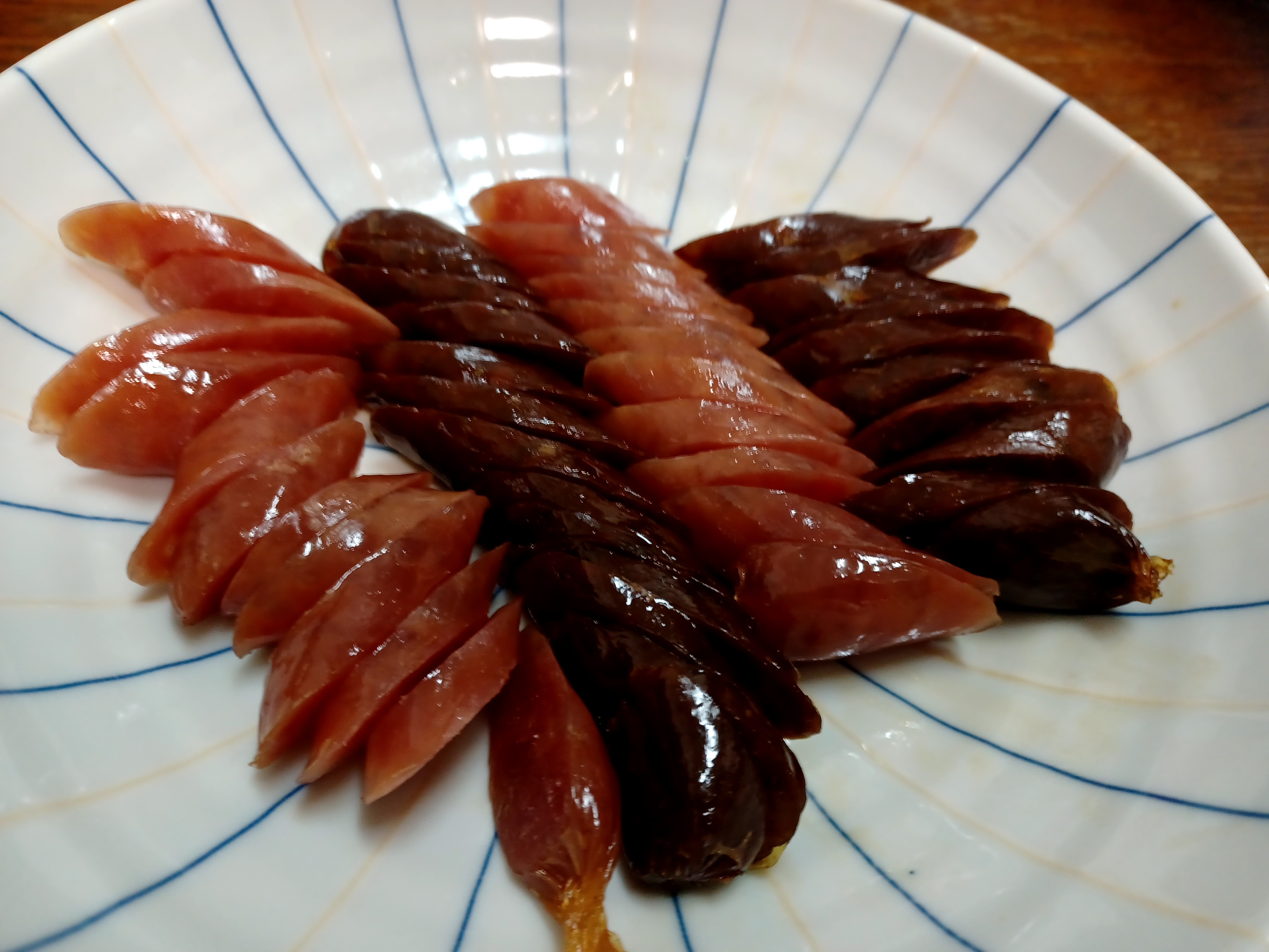 臘腸:豬肉、豬背脂、糖、可食性牛膠原蛋白腸衣、高粱酒(高粱、小麥)、調味劑(L-麩酸鈉)、味醂(水、蔗糖、酒精、食鹽、糯米)、食鹽、調味劑(乳酸鈉液)、複方保色劑[食鹽、保色劑(亞硝酸鈉、硝酸鉀)、麥芽糊精]、甘草水(水、甘草)、結著劑(焦磷酸鈉、多磷酸鈉)、複方品質改良劑[調味劑(胺基乙酸)、醋酸鈉(無水)、酵素製劑(溶菌酶)]、抗氧化劑(L-抗壞血酸鈉)、甜味劑(甘草素、甘草萃)、調味劑(DL-胺基丙酸)