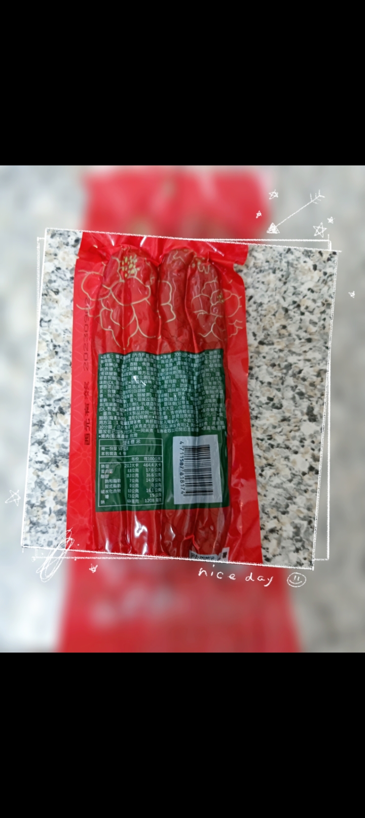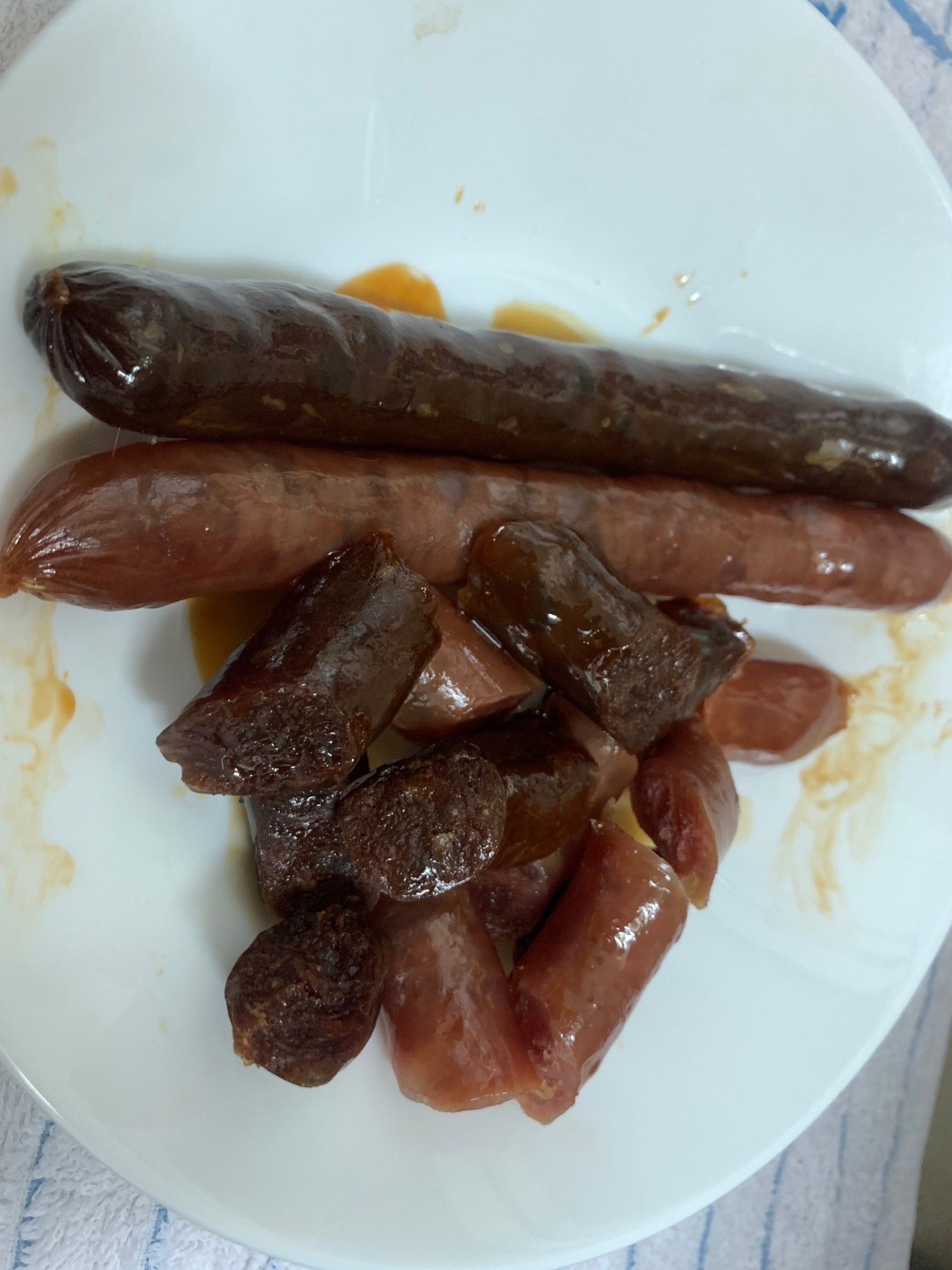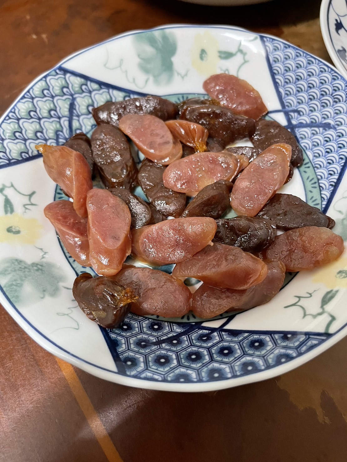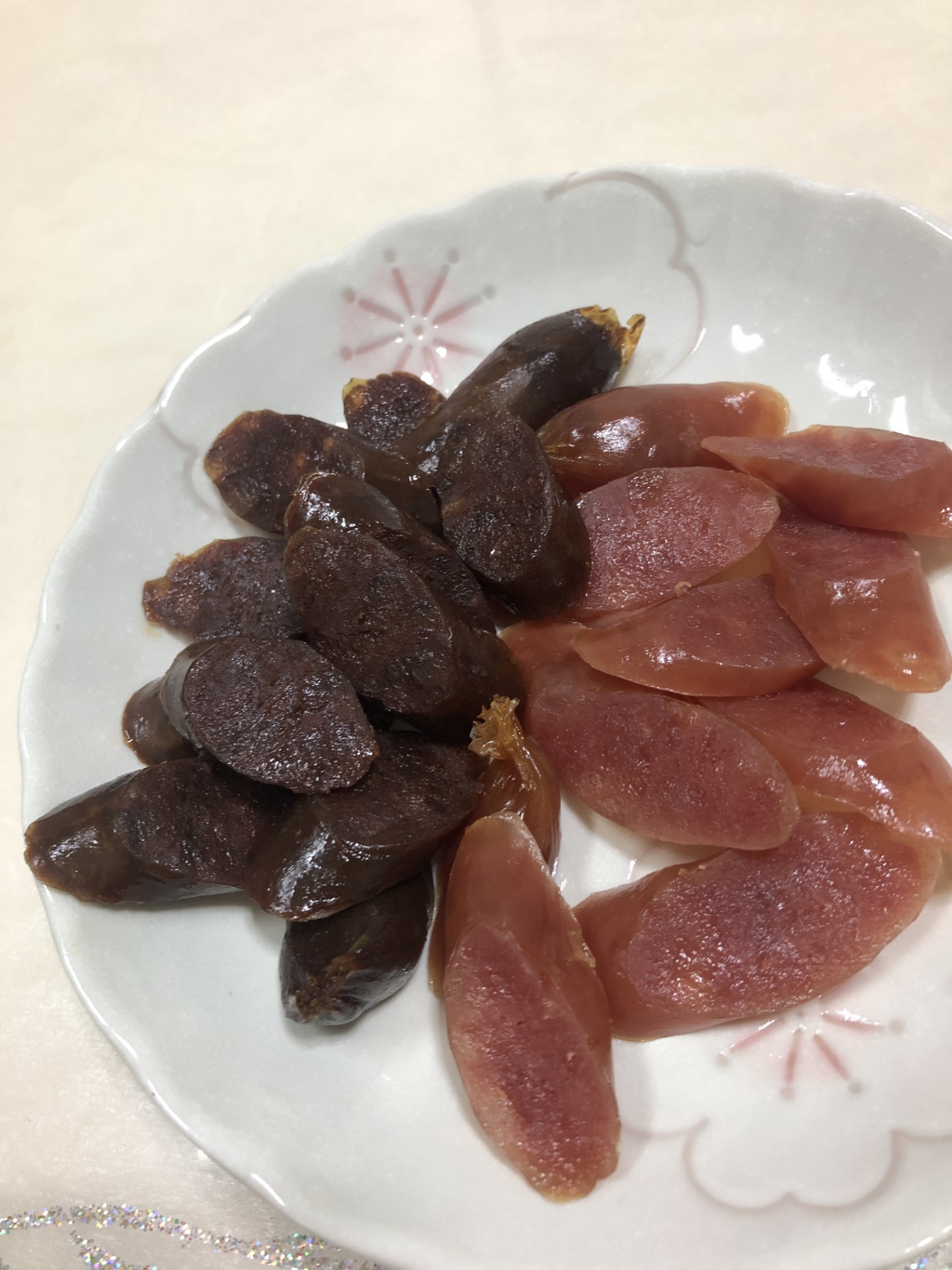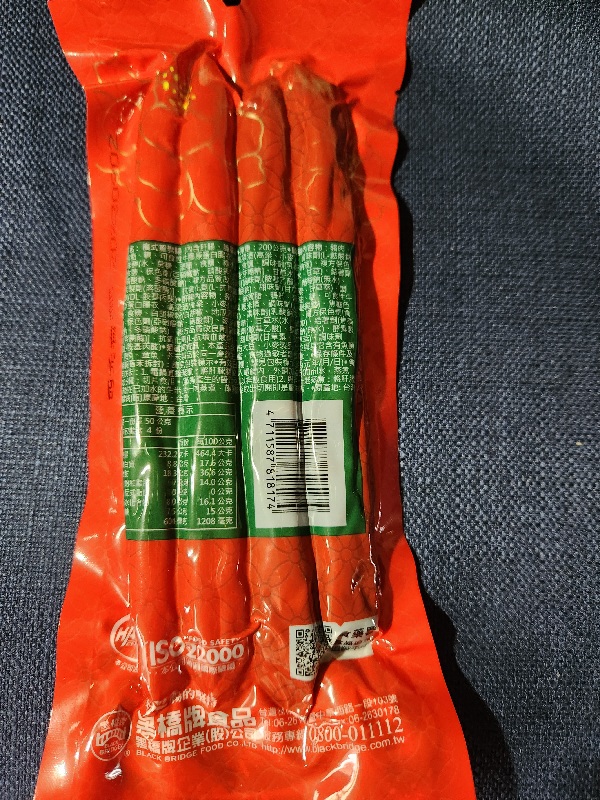 臘腸:豬肉、豬背脂、糖、可食性牛膠原蛋白腸衣、高粱酒(高粱、小麥)、調味劑(L-麩酸鈉)、味醂(水、蔗糖、酒精、食鹽、糯米)、食鹽、調味劑(乳酸鈉液)、複方保色劑[食鹽、保色劑(亞硝酸鈉、硝酸鉀)、麥芽糊精]、甘草水(水、甘草)、結著劑(焦磷酸鈉、多磷酸鈉)、複方品質改良劑[調味劑(胺基乙酸)、醋酸鈉(無水)、酵素製劑(溶菌酶)]、抗氧化劑(L-抗壞血酸鈉)、甜味劑(甘草素、甘草萃)、調味劑(DL-胺基丙酸)