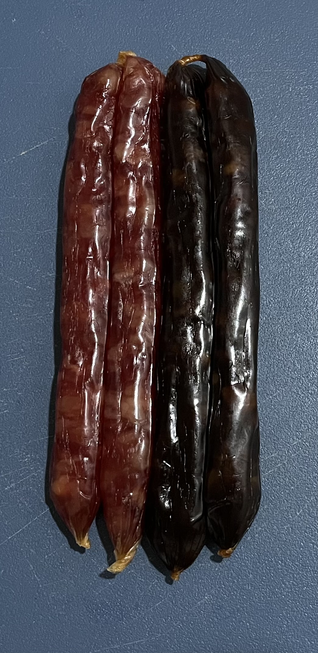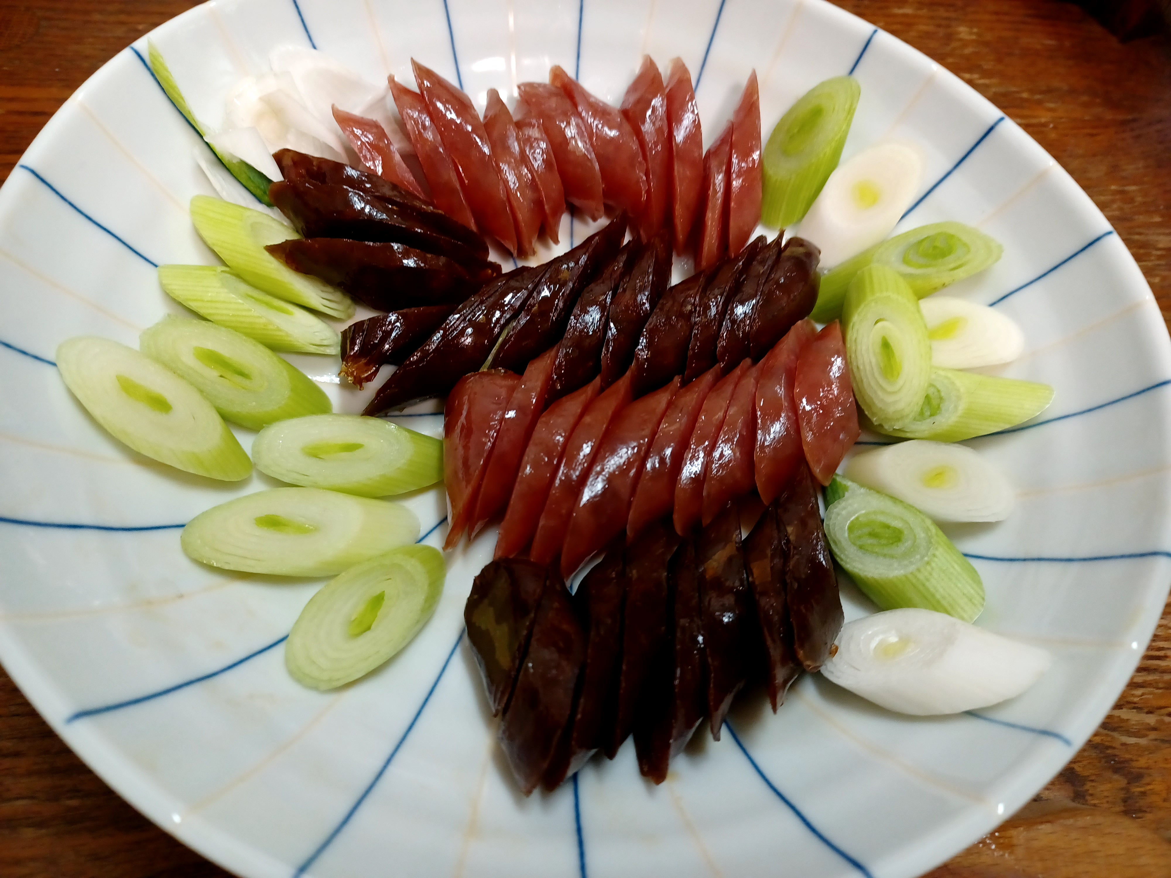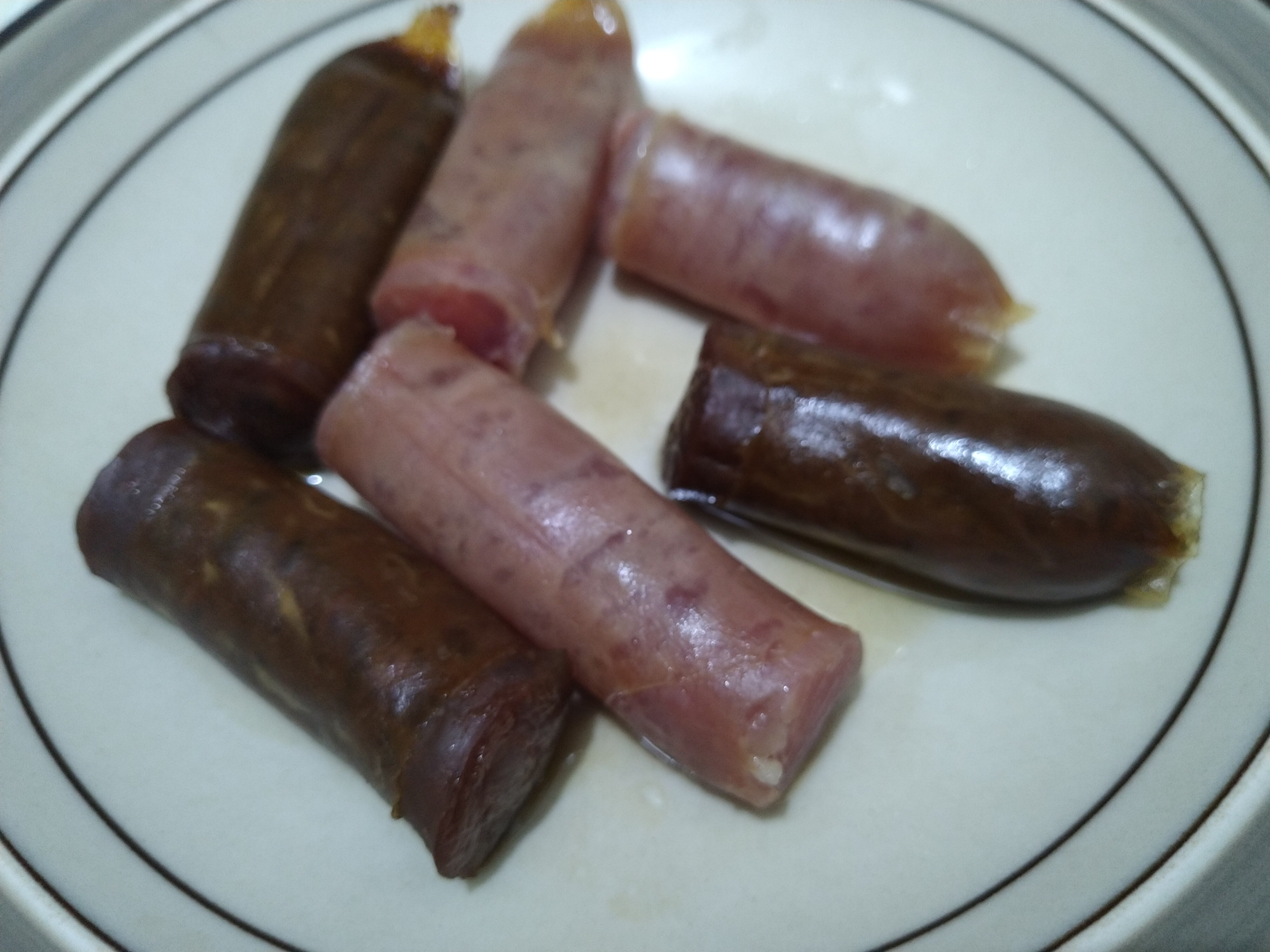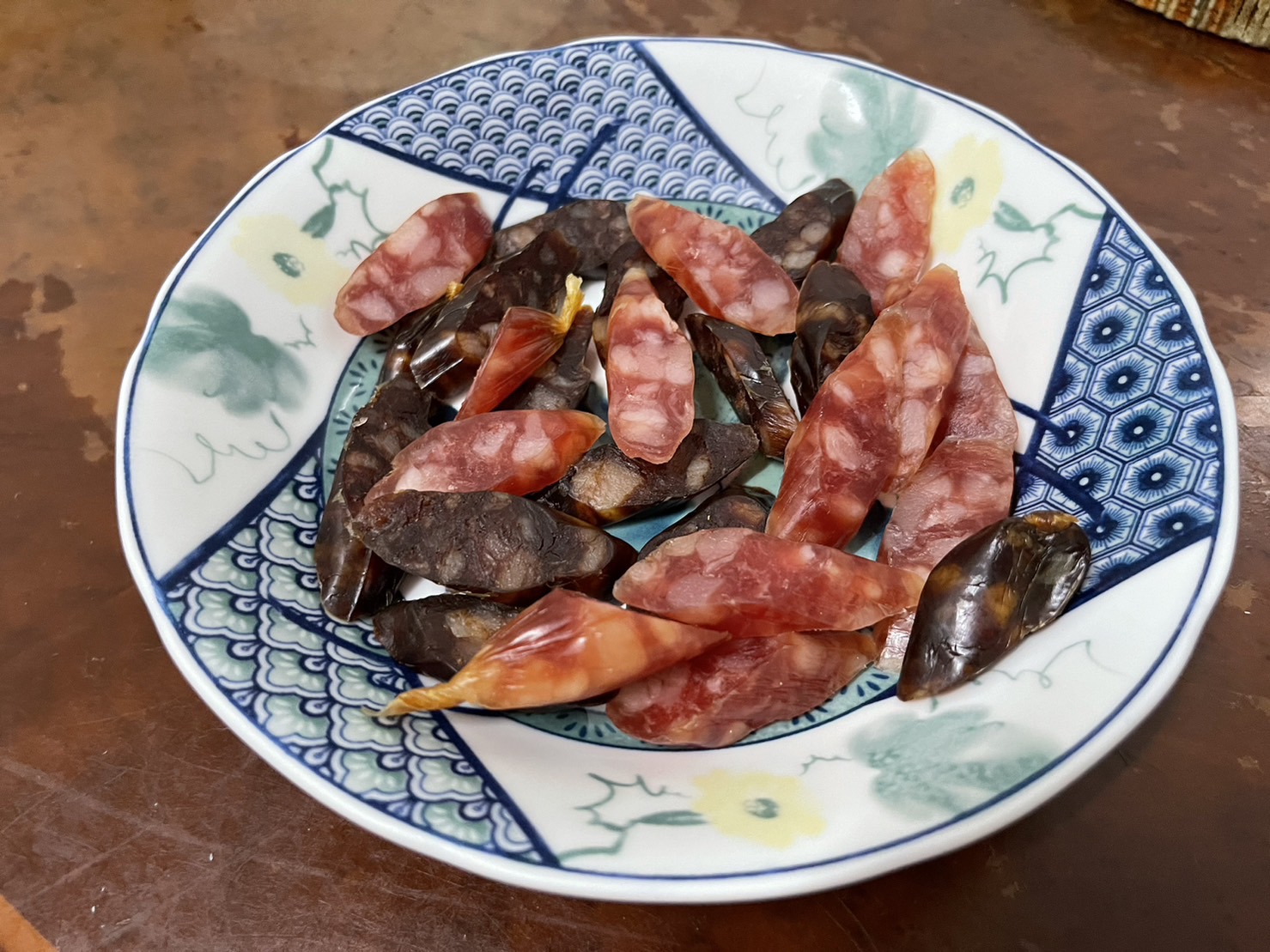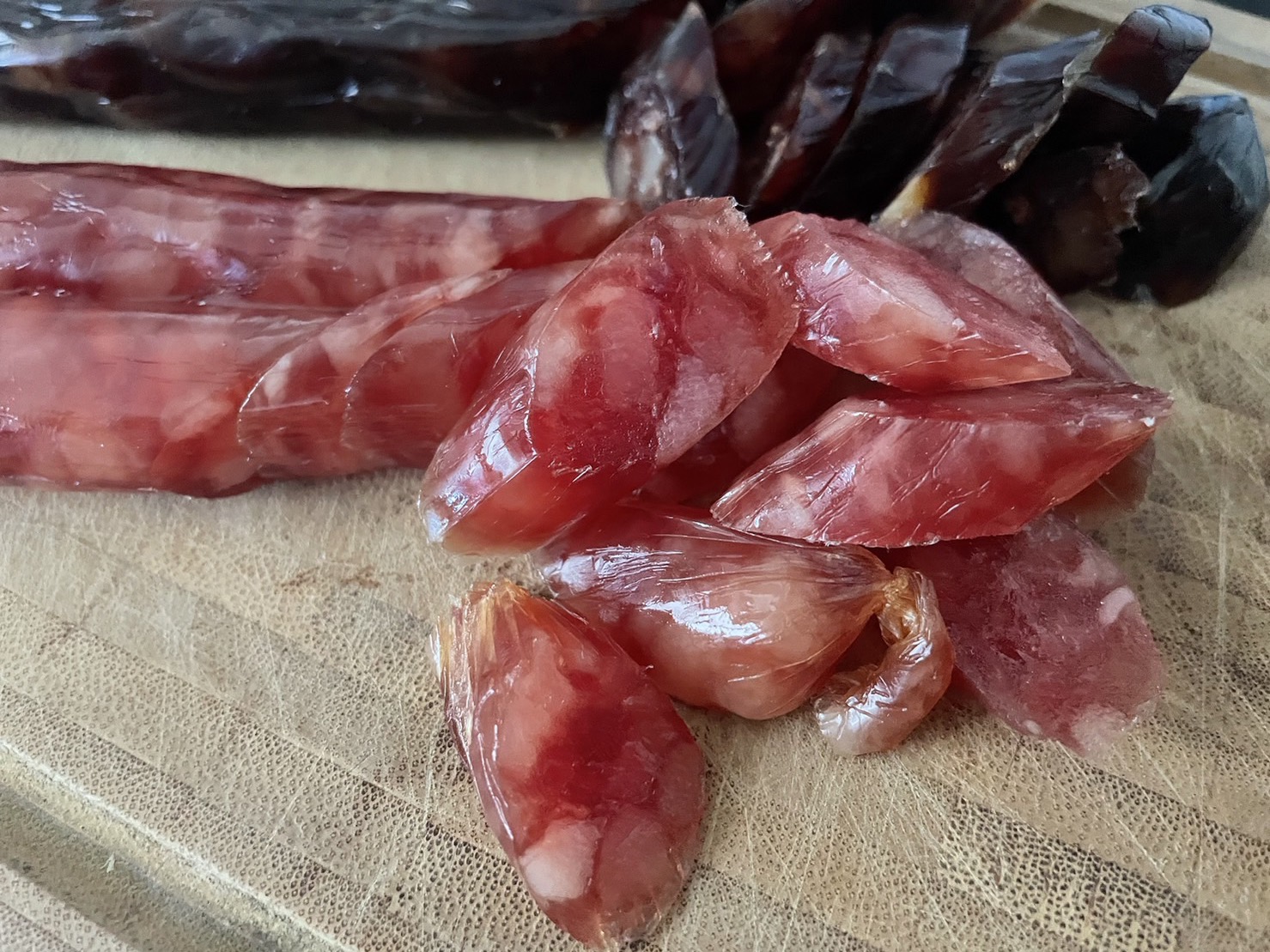 臘腸:豬肉、豬背脂、糖、可食性牛膠原蛋白腸衣、高粱酒(高粱、小麥)、調味劑(L-麩酸鈉)、味醂(水、蔗糖、酒精、食鹽、糯米)、食鹽、調味劑(乳酸鈉液)、複方保色劑[食鹽、保色劑(亞硝酸鈉、硝酸鉀)、麥芽糊精]、甘草水(水、甘草)、結著劑(焦磷酸鈉、多磷酸鈉)、複方品質改良劑[調味劑(胺基乙酸)、醋酸鈉(無水)、酵素製劑(溶菌酶)]、抗氧化劑(L-抗壞血酸鈉)、甜味劑(甘草素、甘草萃)、調味劑(DL-胺基丙酸)