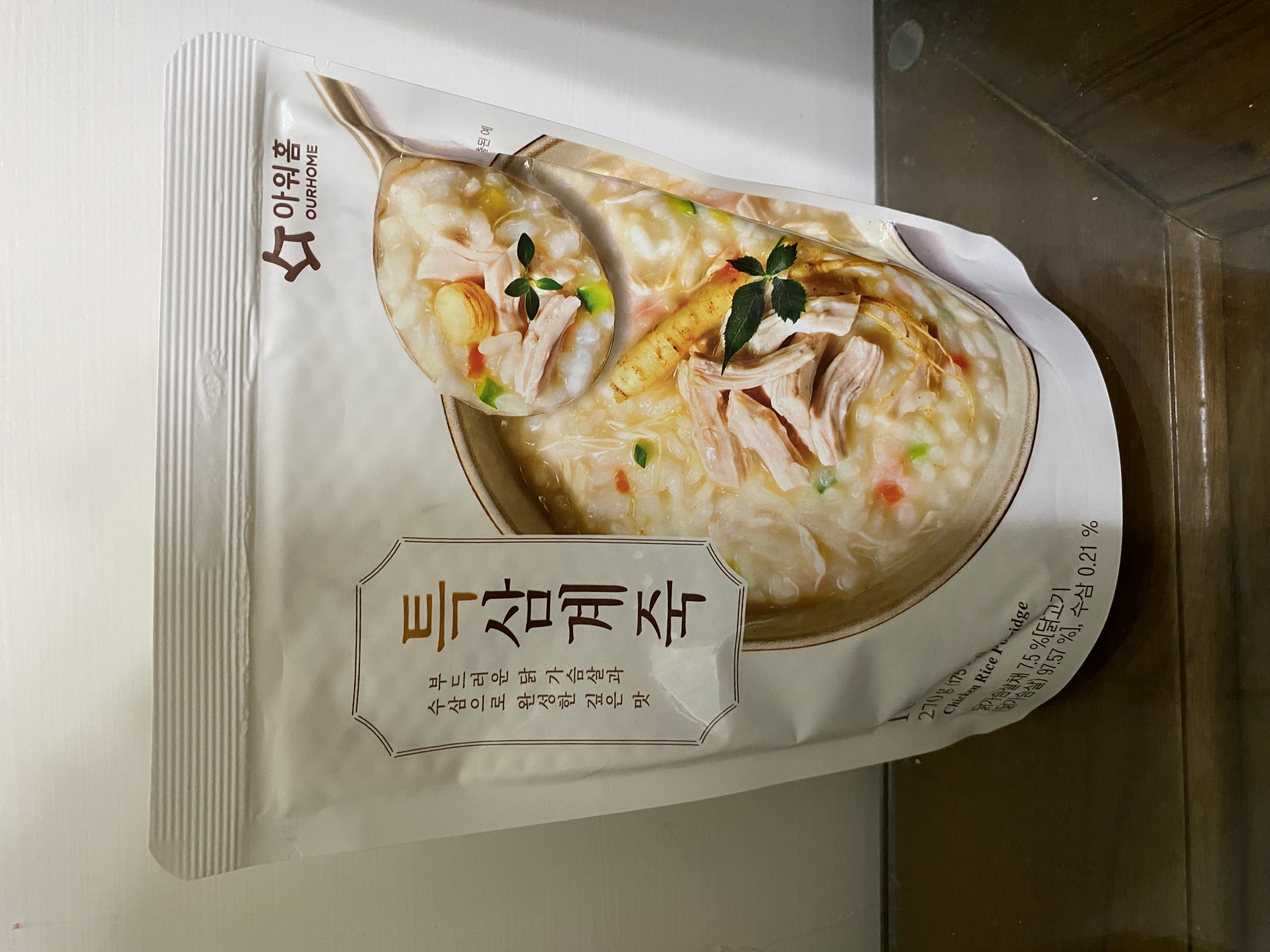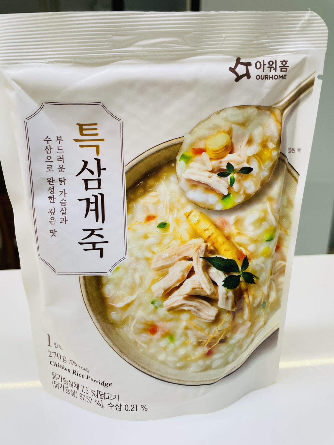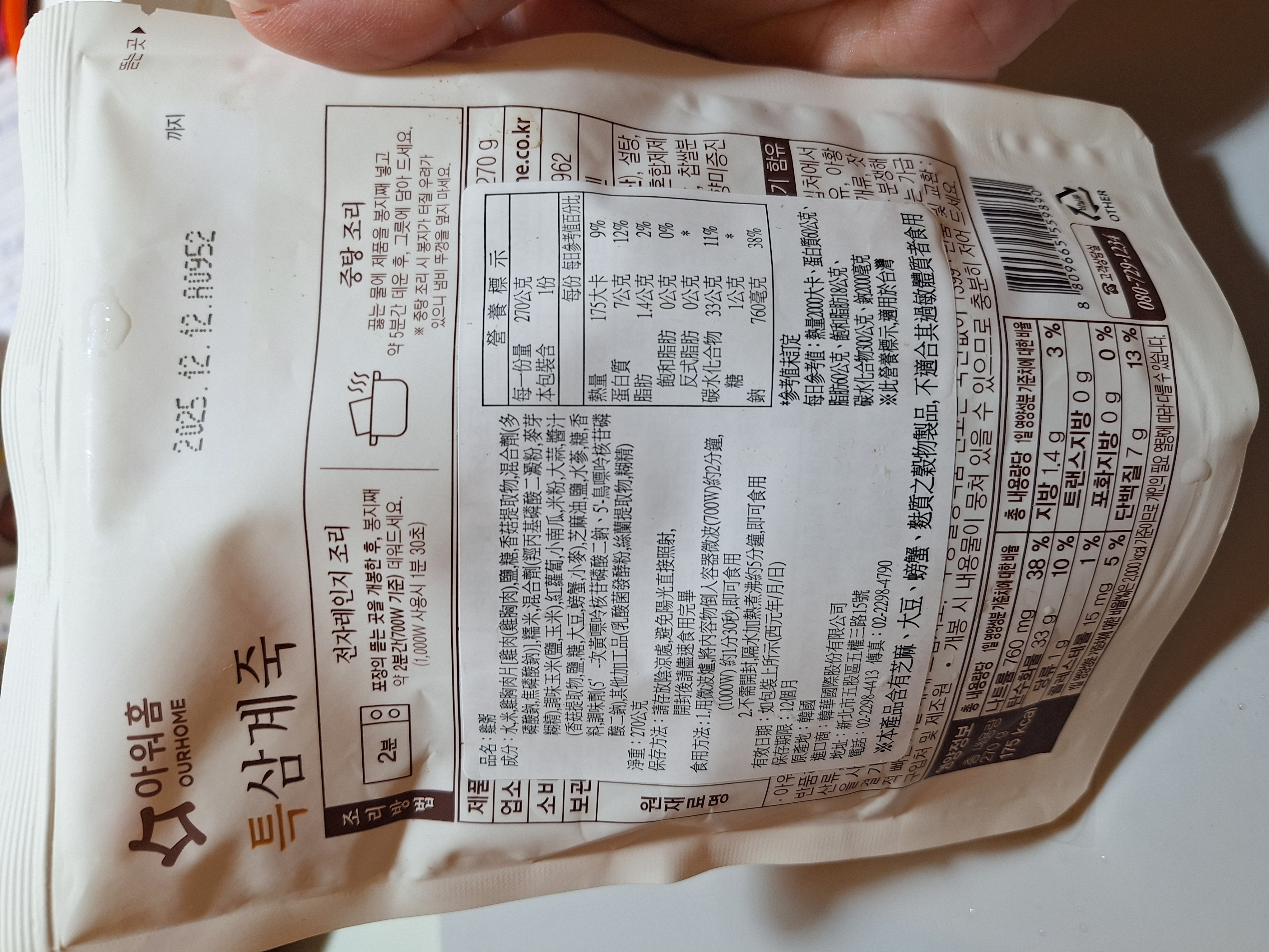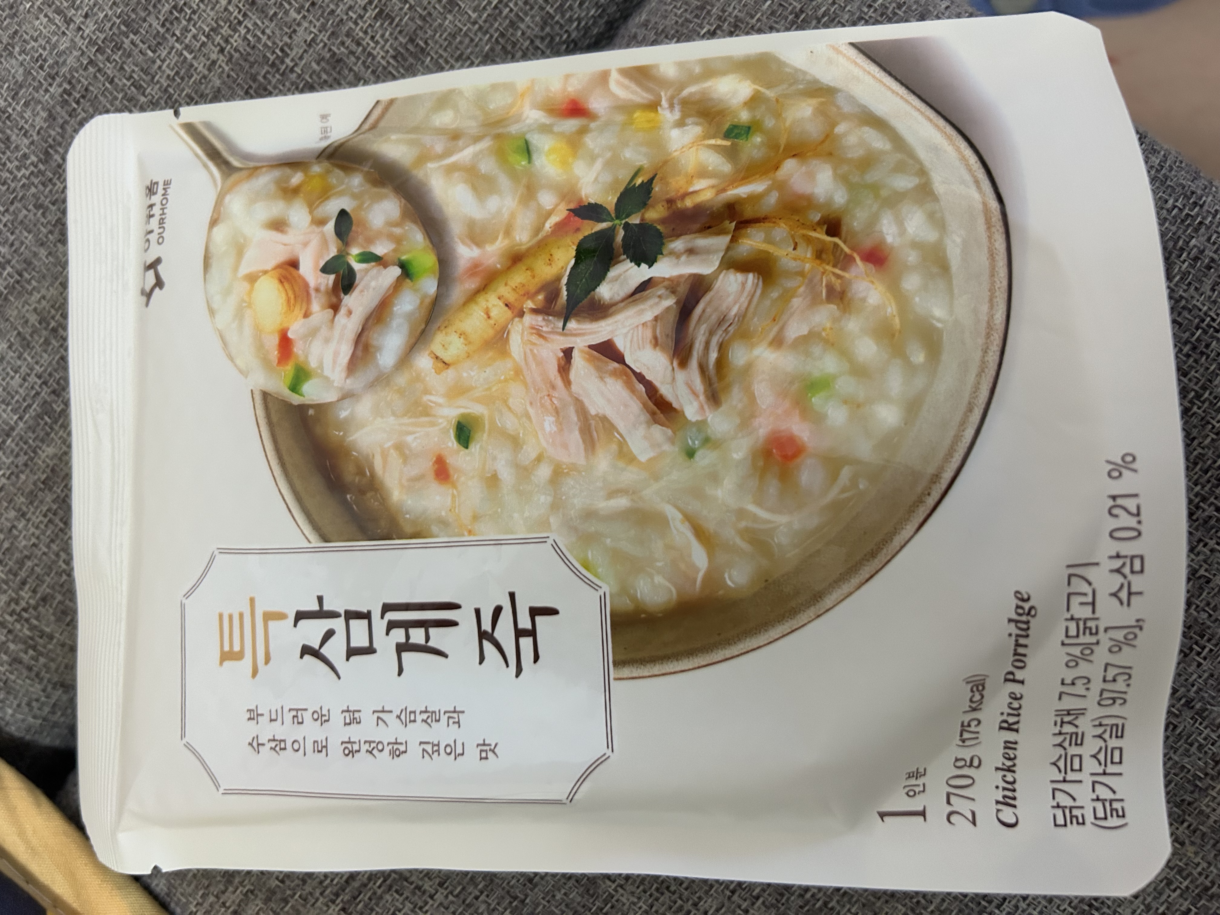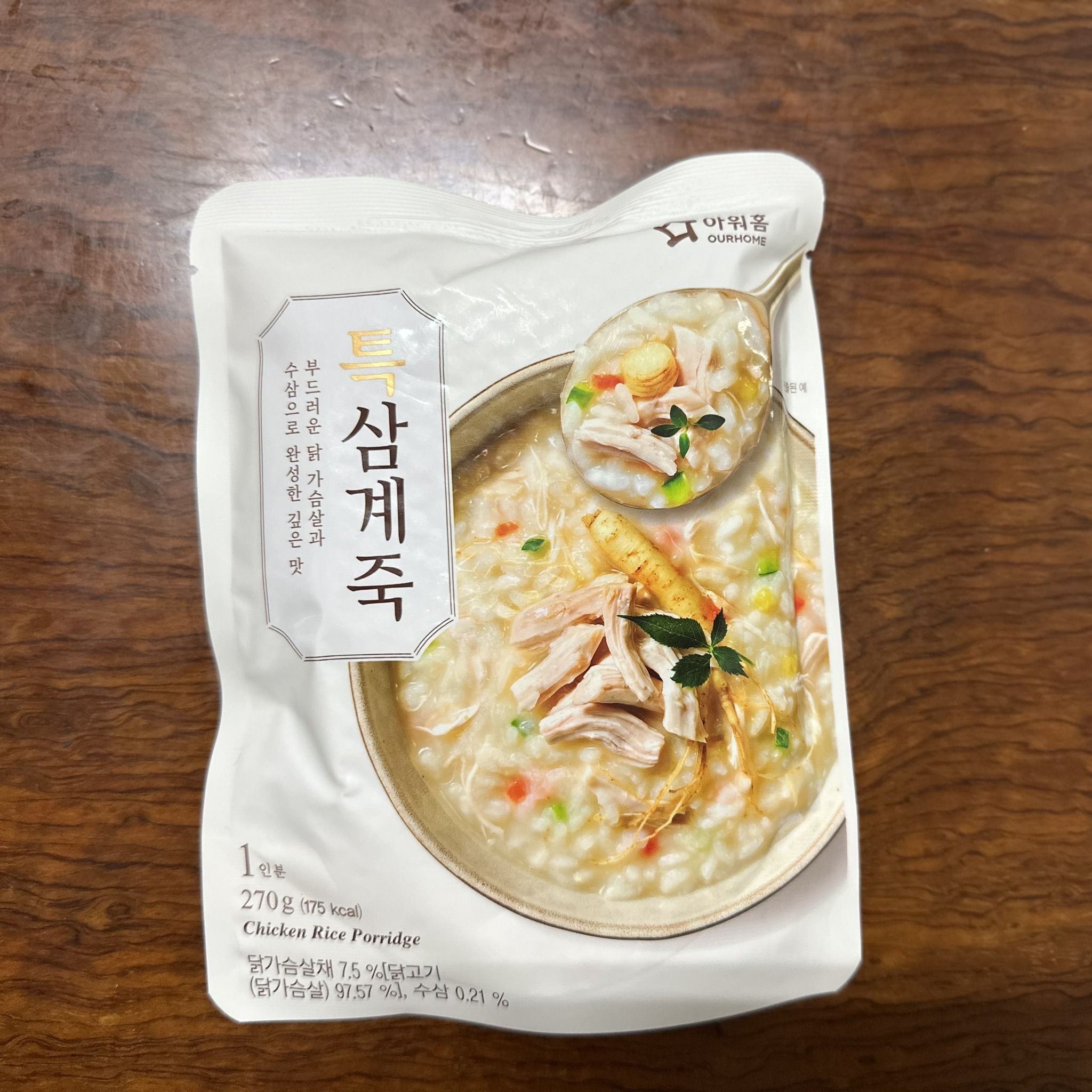 水、雞胸肉片[雞肉(雞胸肉)、鹽、糖、香菇提取物,混合劑(多磷酸鈉、焦磷酸鈉)]、米、調味玉米(鹽、玉米)、紅蘿蔔、小南瓜、糯米、混合劑(羥丙基磷酸二澱粉、麥芽糊精)、米粉、大蒜、牛骨提取物、芝麻油、醬汁(香菇提取物、鹽、糖、大豆、螃蟹、小麥)、鹽、水蔘、混合劑[丙二醇、混合劑(丙二醇、天然香料、酒精、甘油、人工香料)、甘油]、調味劑(5’-次黃嘌呤核苷磷酸二鈉、5'-鳥嘌呤核苷磷酸二鈉)