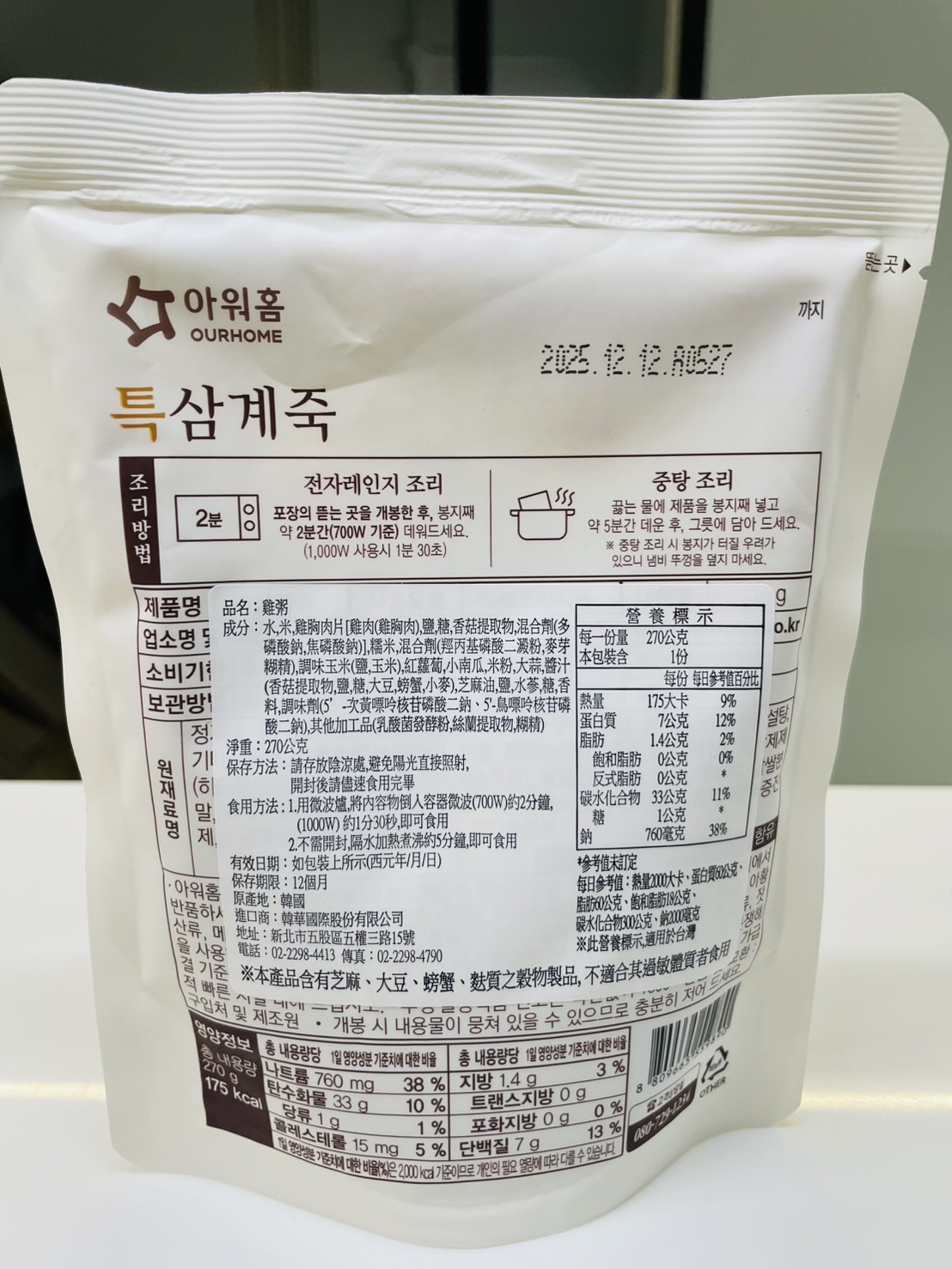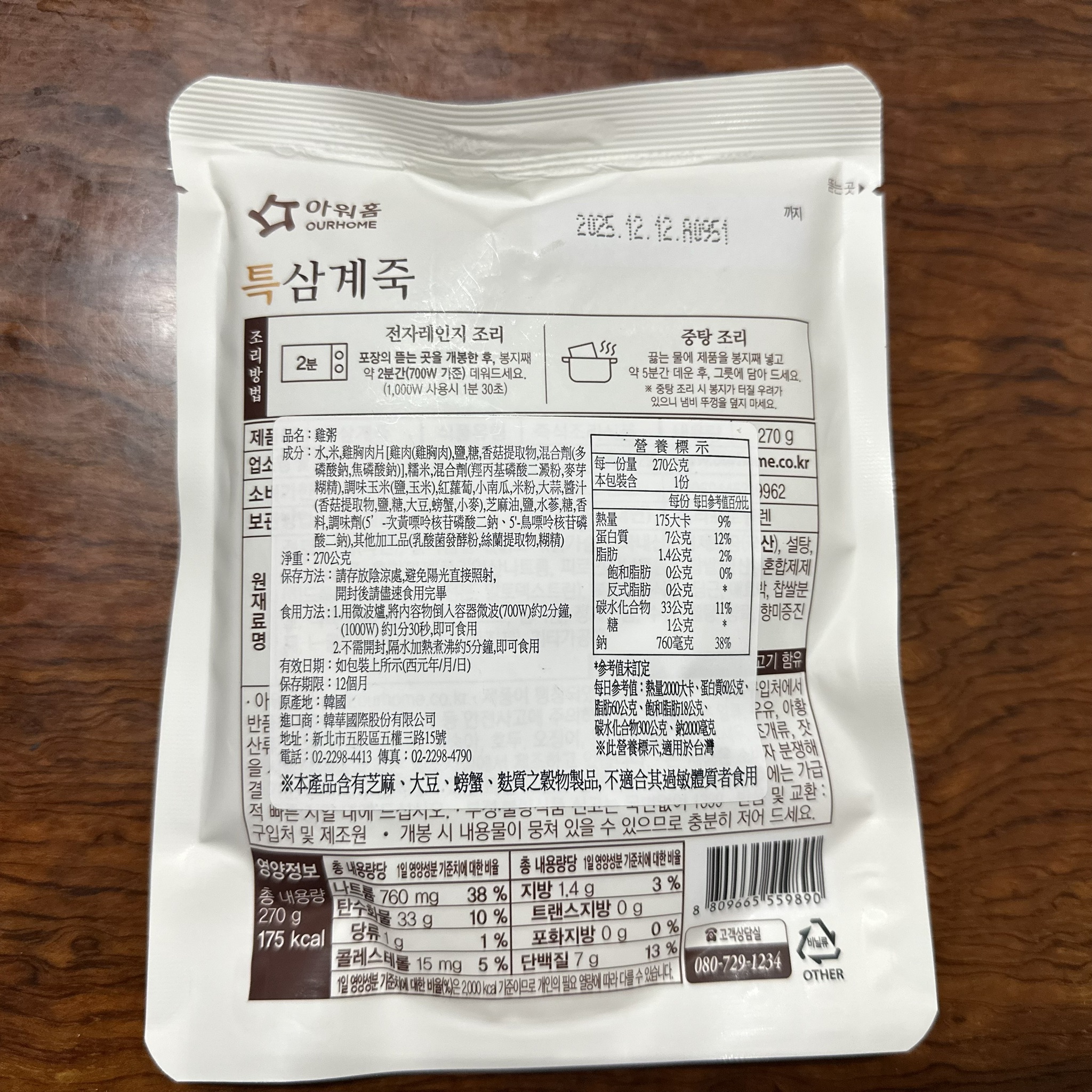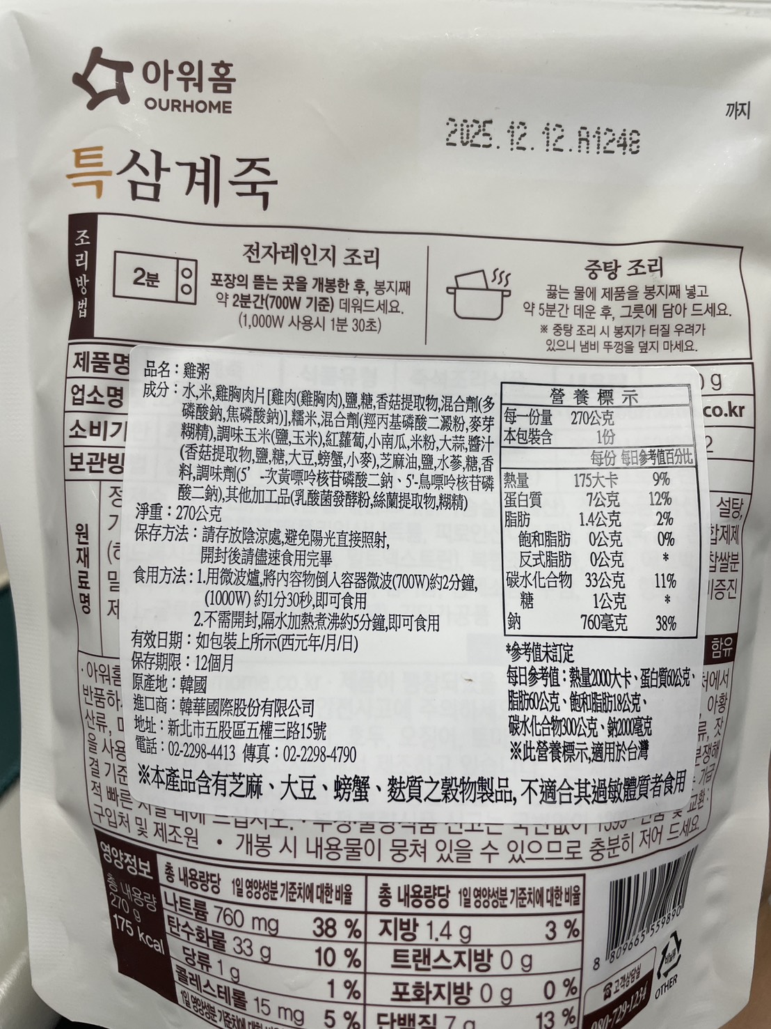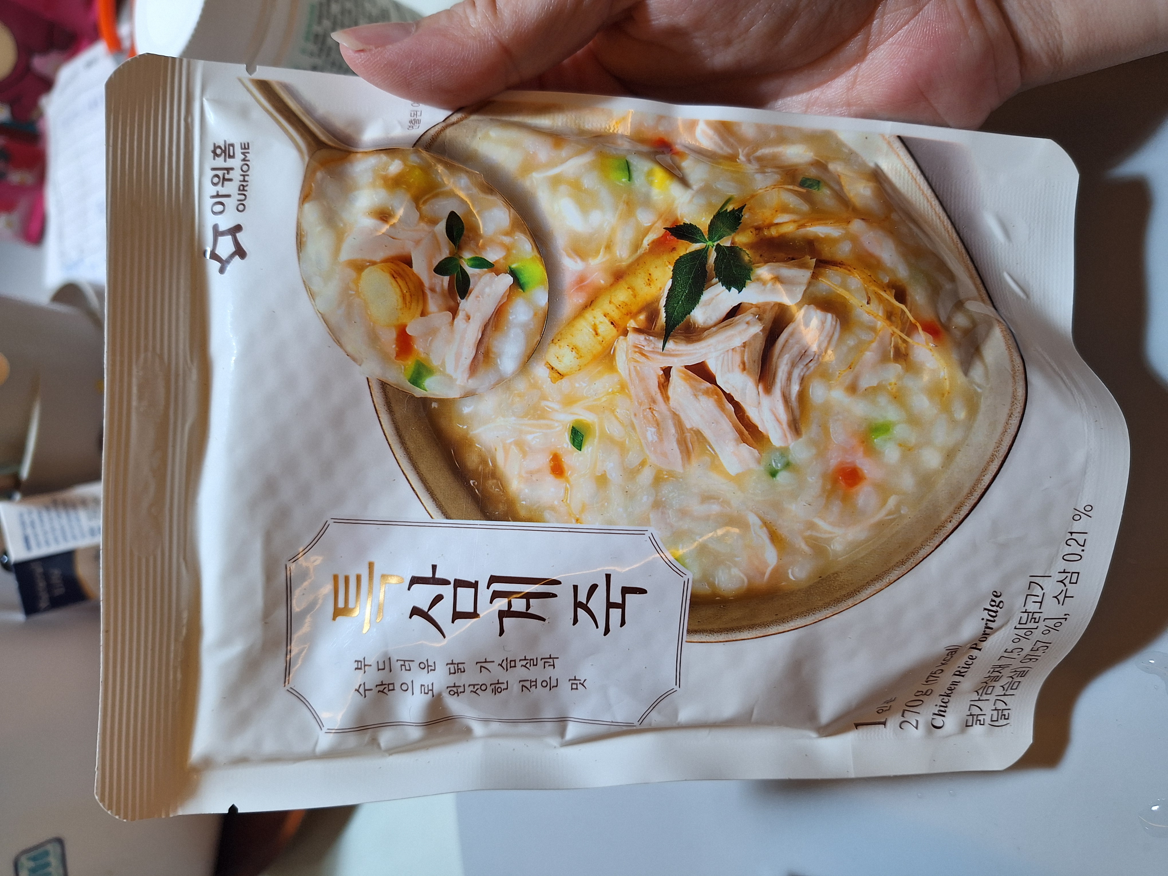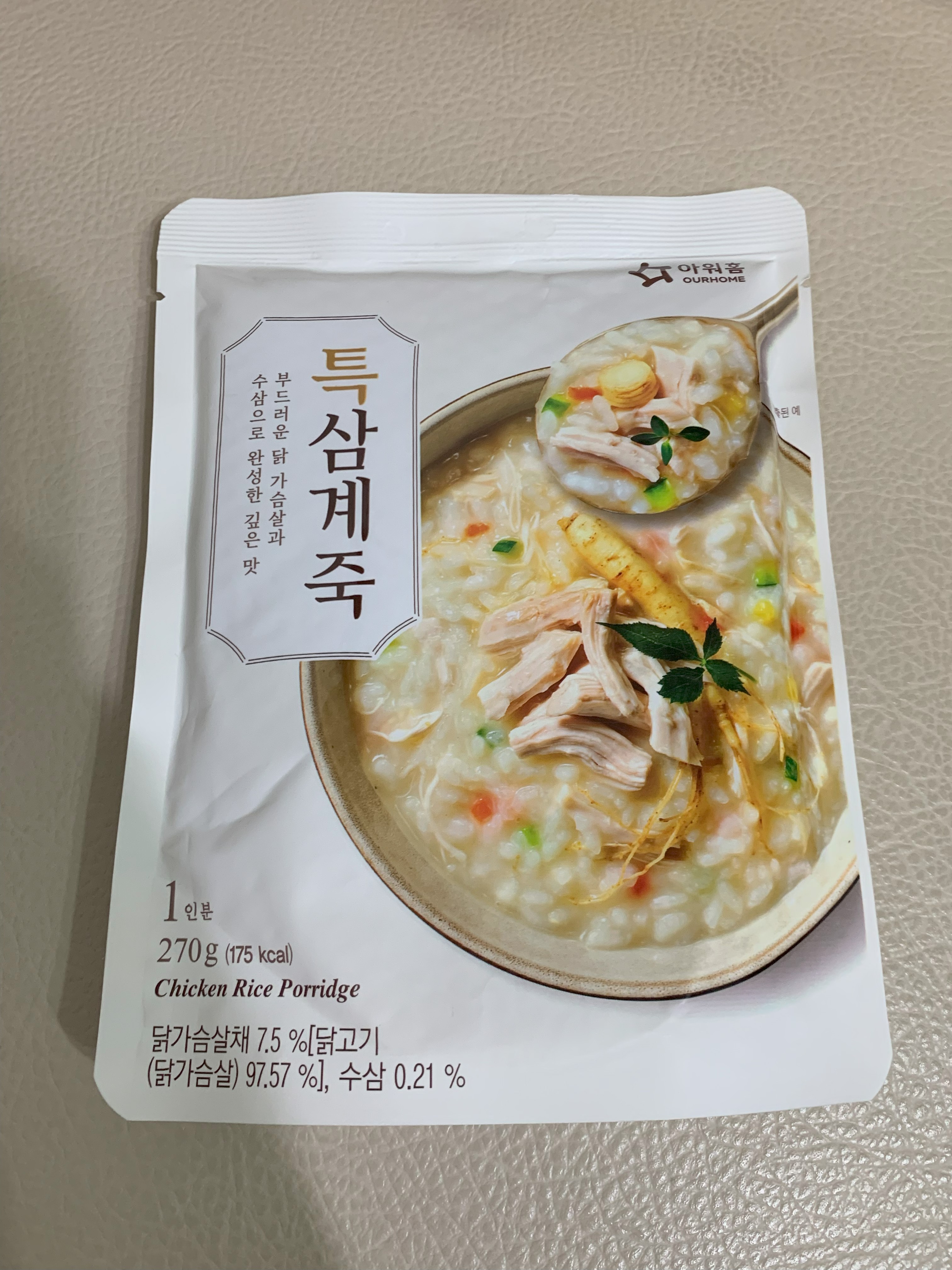 水、雞胸肉片[雞肉(雞胸肉)、鹽、糖、香菇提取物,混合劑(多磷酸鈉、焦磷酸鈉)]、米、調味玉米(鹽、玉米)、紅蘿蔔、小南瓜、糯米、混合劑(羥丙基磷酸二澱粉、麥芽糊精)、米粉、大蒜、牛骨提取物、芝麻油、醬汁(香菇提取物、鹽、糖、大豆、螃蟹、小麥)、鹽、水蔘、混合劑[丙二醇、混合劑(丙二醇、天然香料、酒精、甘油、人工香料)、甘油]、調味劑(5’-次黃嘌呤核苷磷酸二鈉、5'-鳥嘌呤核苷磷酸二鈉)