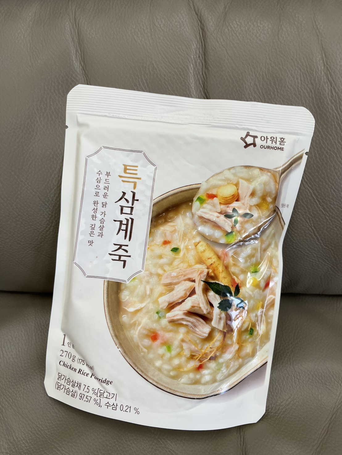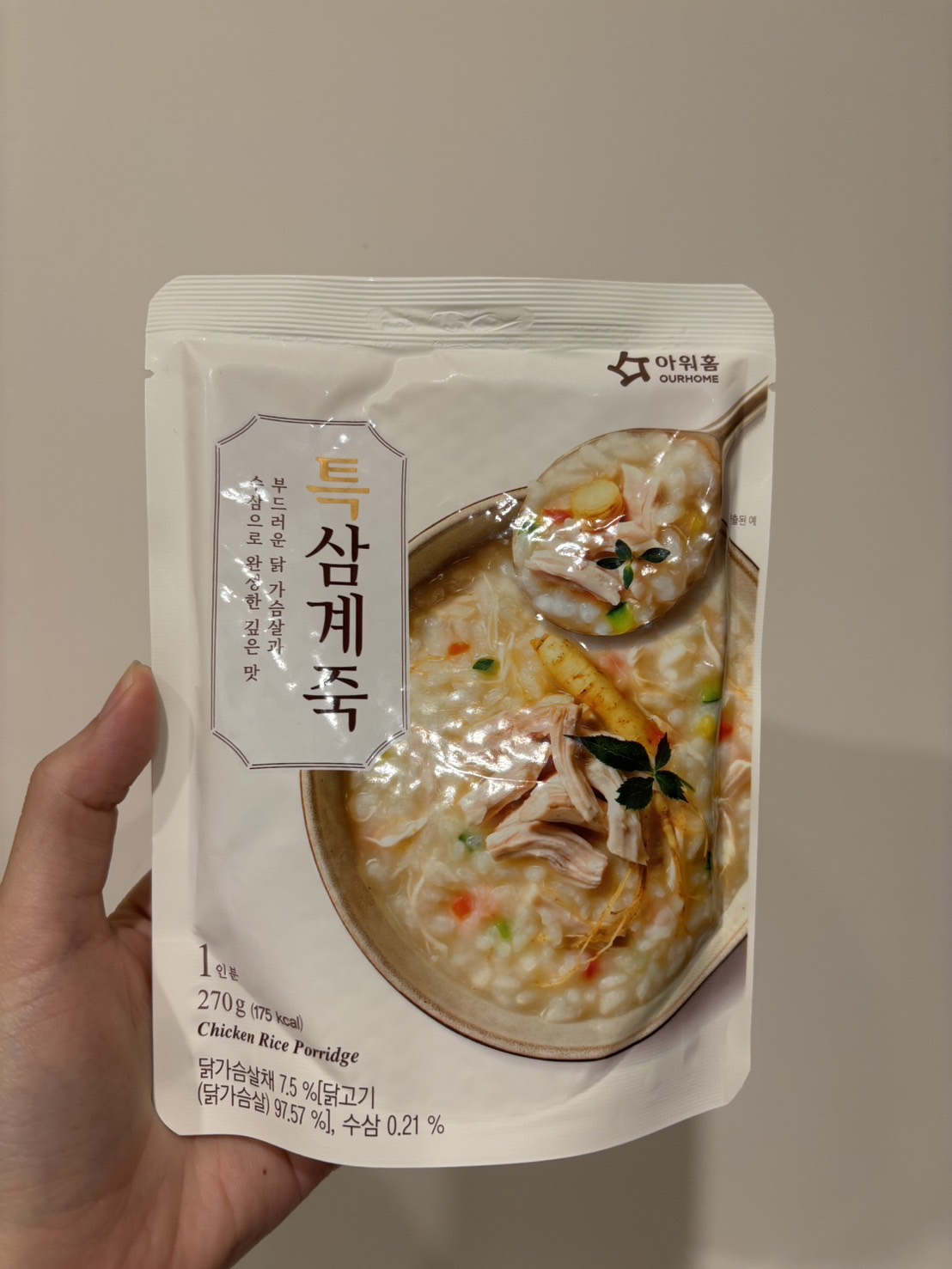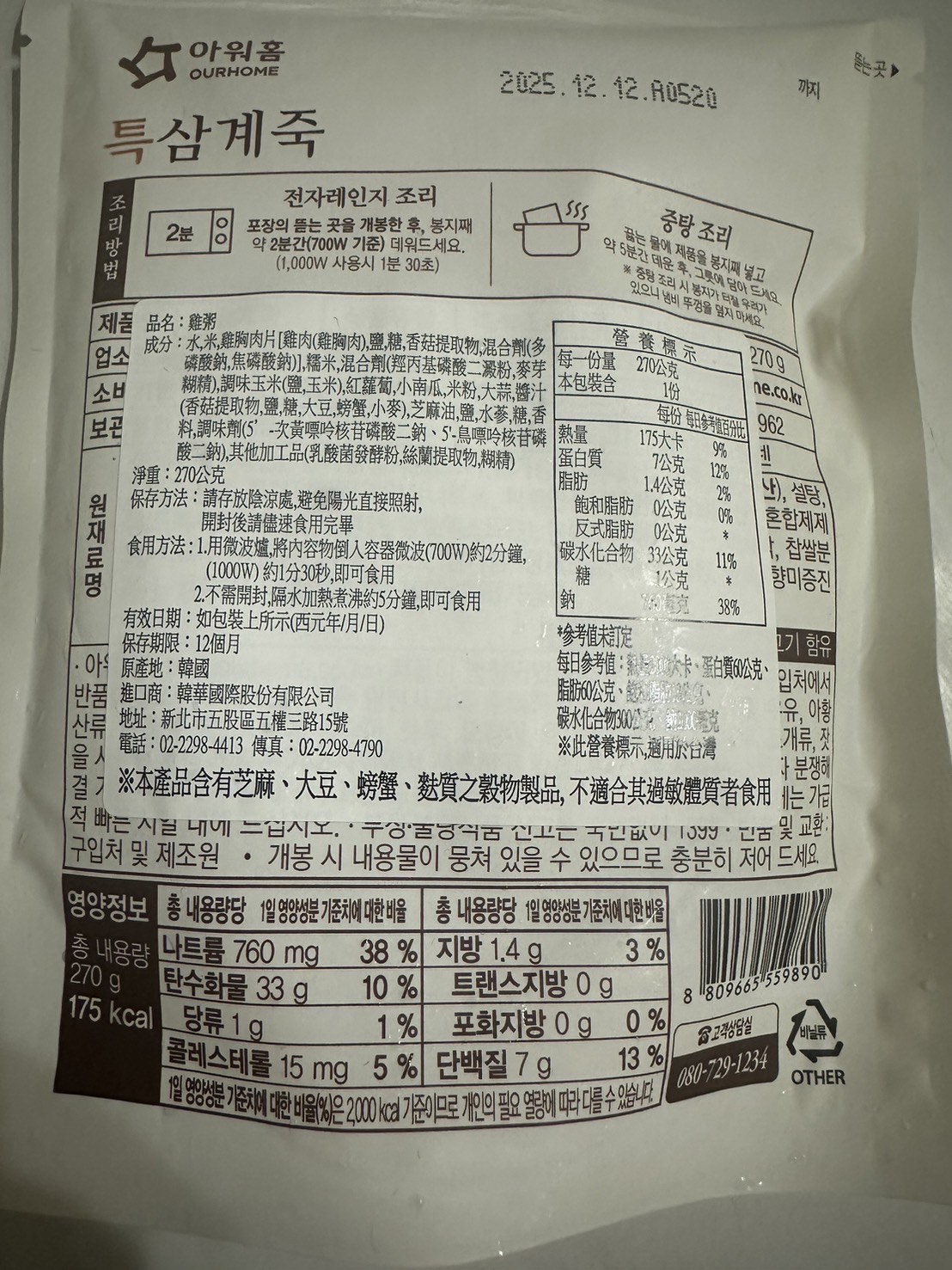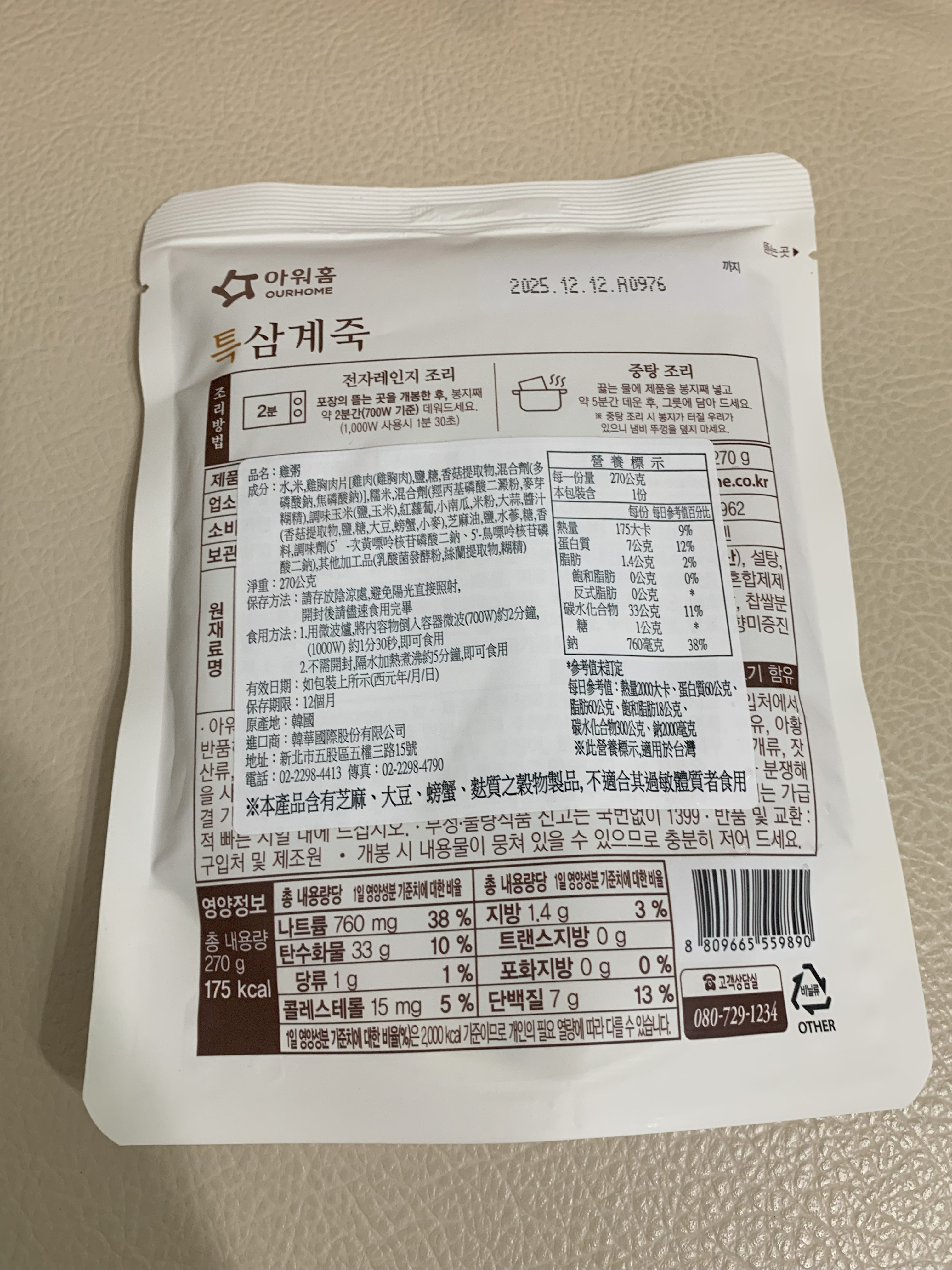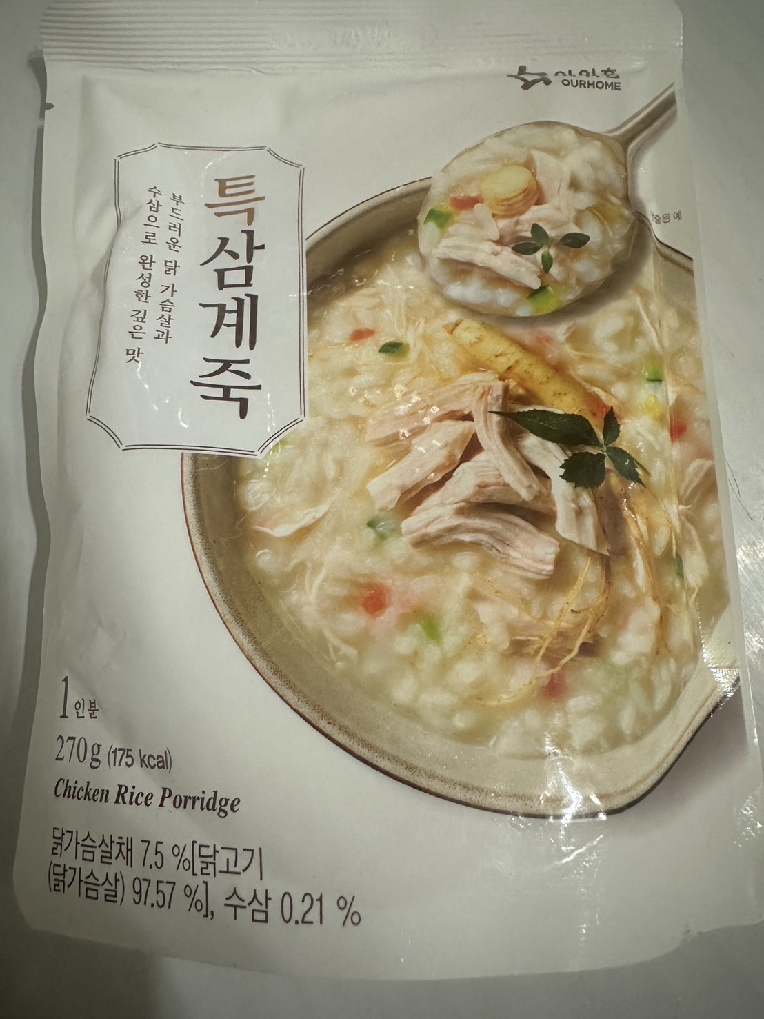 水、雞胸肉片[雞肉(雞胸肉)、鹽、糖、香菇提取物,混合劑(多磷酸鈉、焦磷酸鈉)]、米、調味玉米(鹽、玉米)、紅蘿蔔、小南瓜、糯米、混合劑(羥丙基磷酸二澱粉、麥芽糊精)、米粉、大蒜、牛骨提取物、芝麻油、醬汁(香菇提取物、鹽、糖、大豆、螃蟹、小麥)、鹽、水蔘、混合劑[丙二醇、混合劑(丙二醇、天然香料、酒精、甘油、人工香料)、甘油]、調味劑(5’-次黃嘌呤核苷磷酸二鈉、5'-鳥嘌呤核苷磷酸二鈉)
