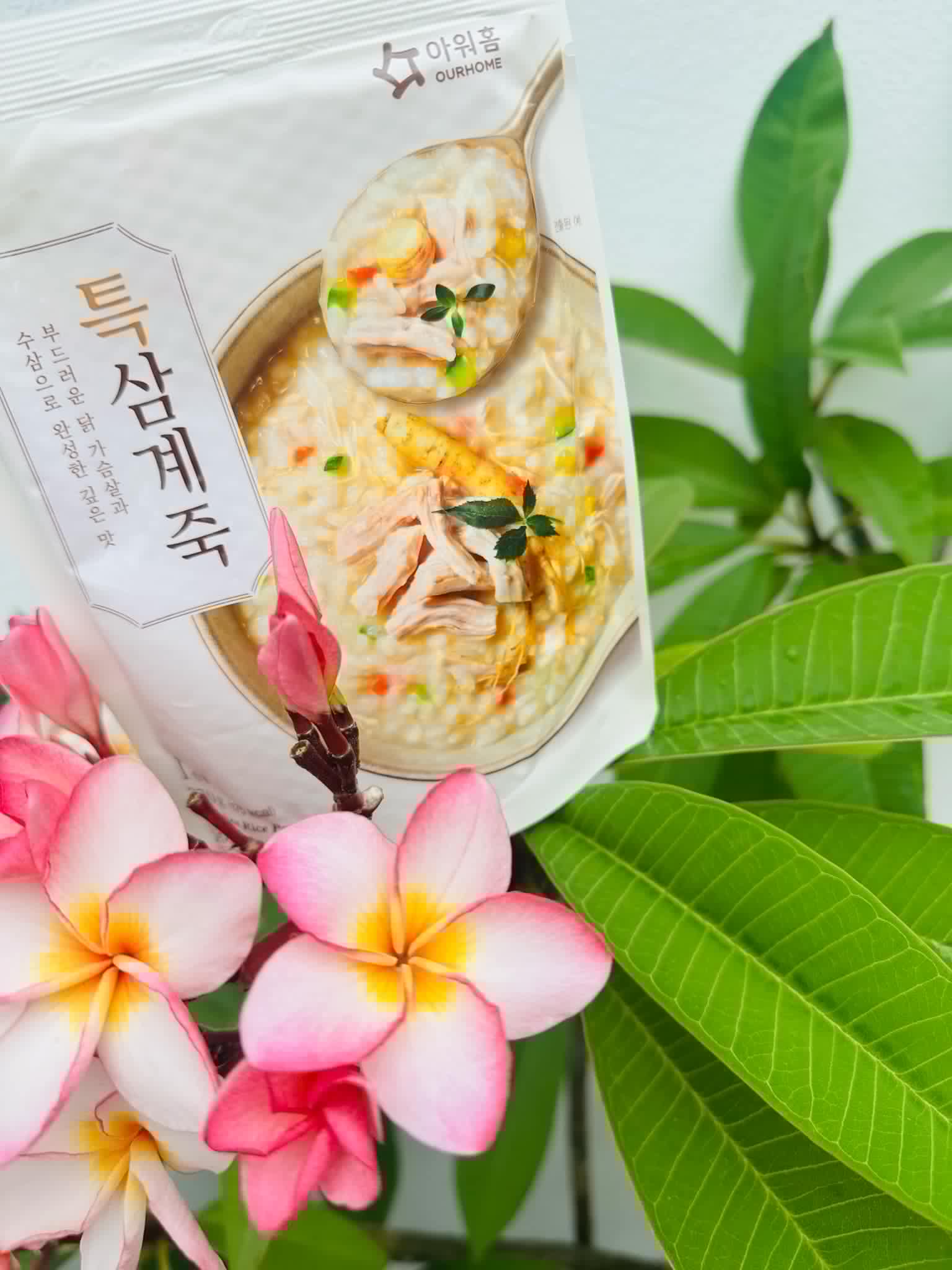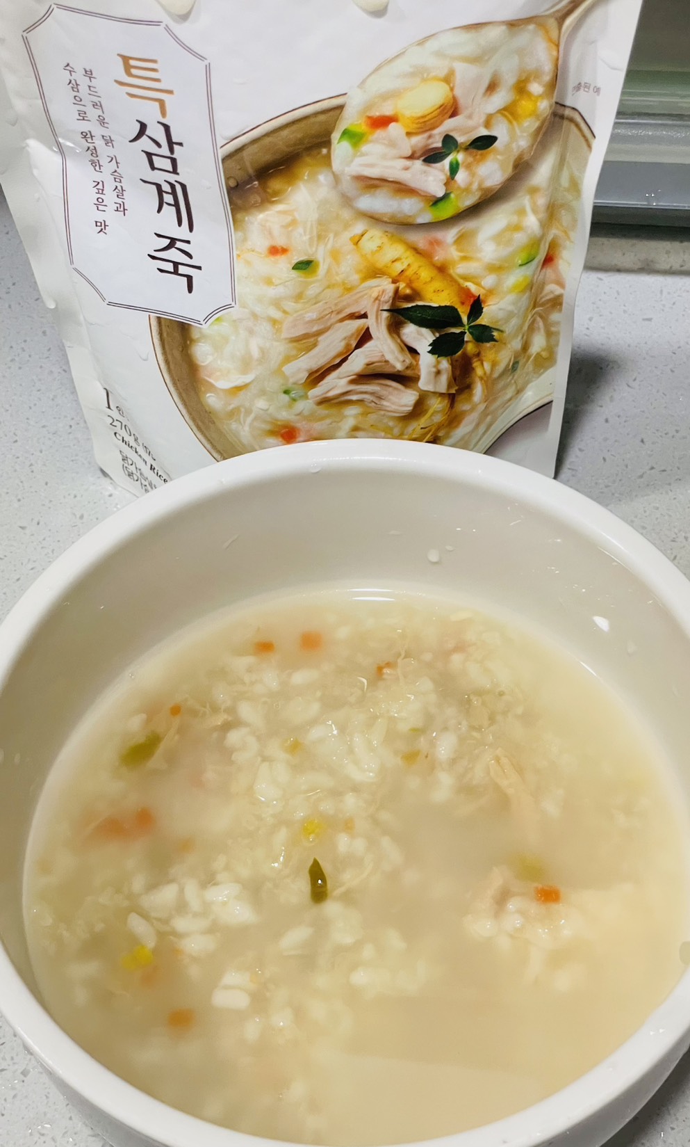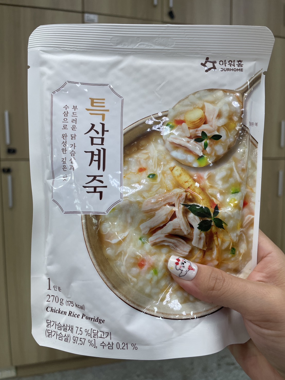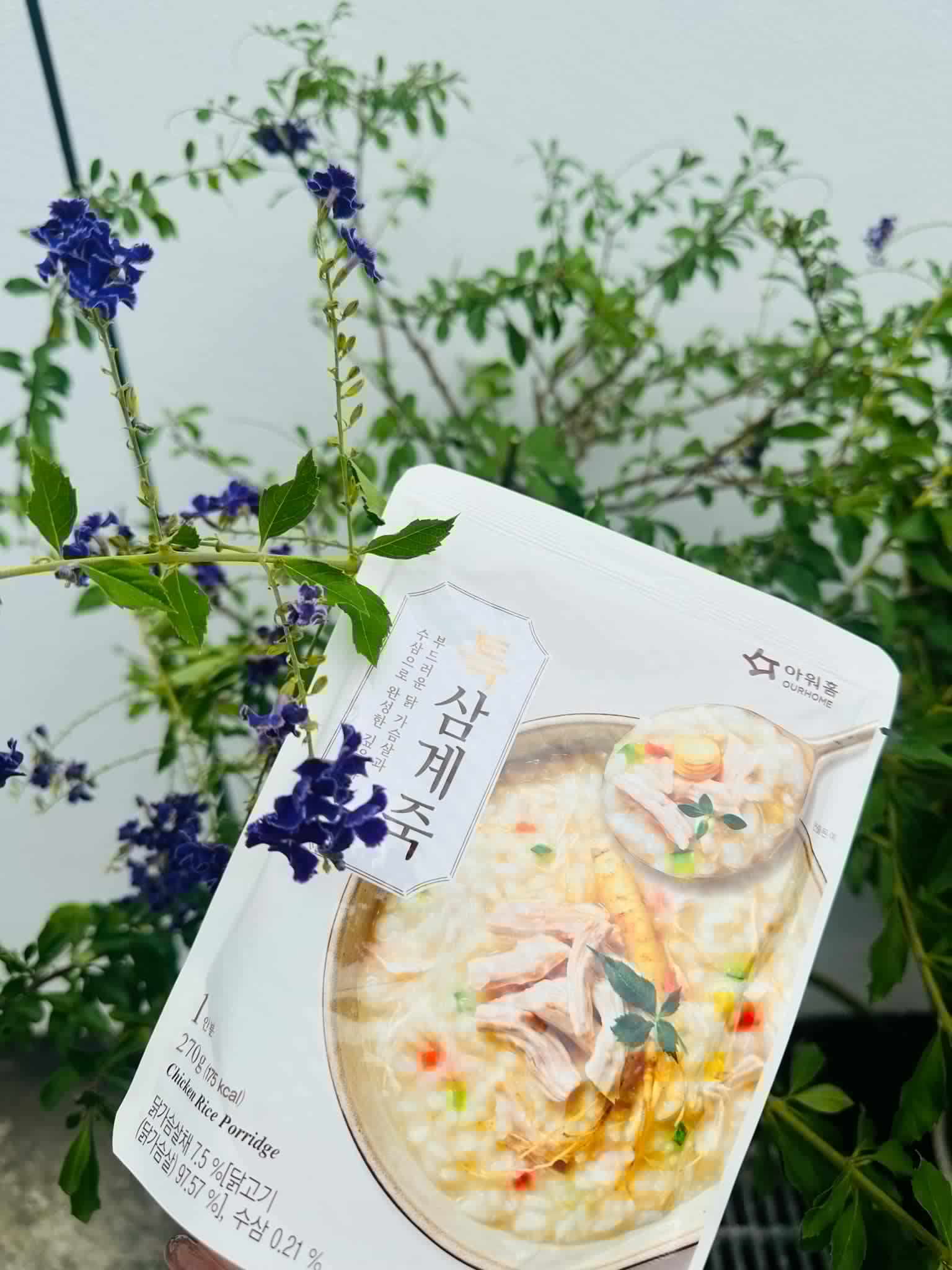 水、雞胸肉片[雞肉(雞胸肉)、鹽、糖、香菇提取物,混合劑(多磷酸鈉、焦磷酸鈉)]、米、調味玉米(鹽、玉米)、紅蘿蔔、小南瓜、糯米、混合劑(羥丙基磷酸二澱粉、麥芽糊精)、米粉、大蒜、牛骨提取物、芝麻油、醬汁(香菇提取物、鹽、糖、大豆、螃蟹、小麥)、鹽、水蔘、混合劑[丙二醇、混合劑(丙二醇、天然香料、酒精、甘油、人工香料)、甘油]、調味劑(5’-次黃嘌呤核苷磷酸二鈉、5'-鳥嘌呤核苷磷酸二鈉)