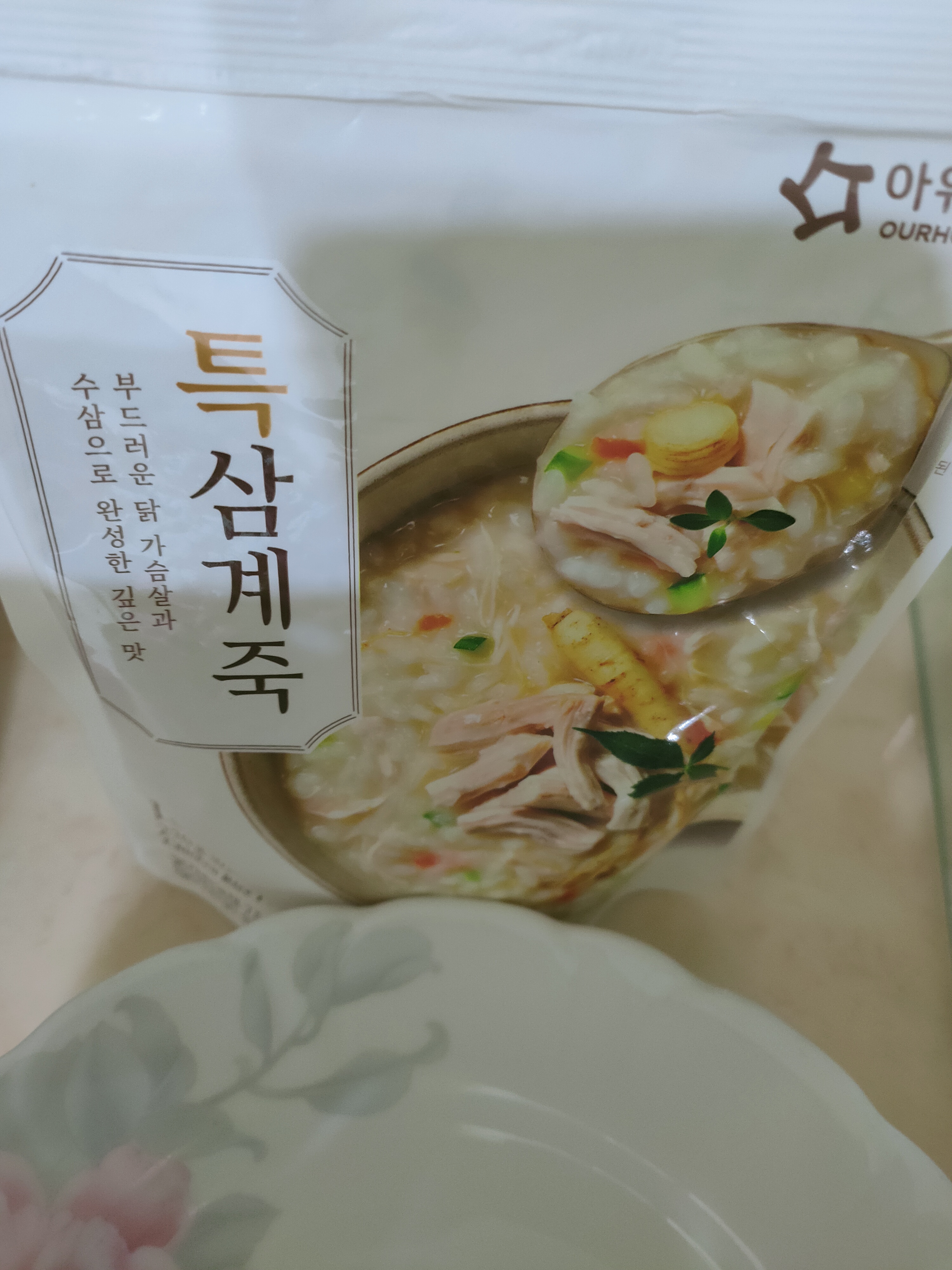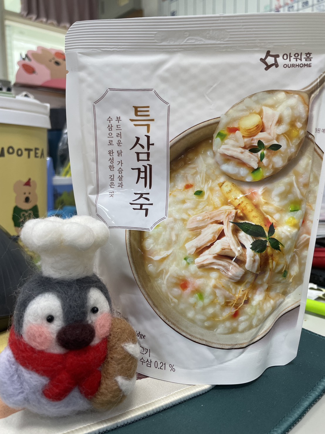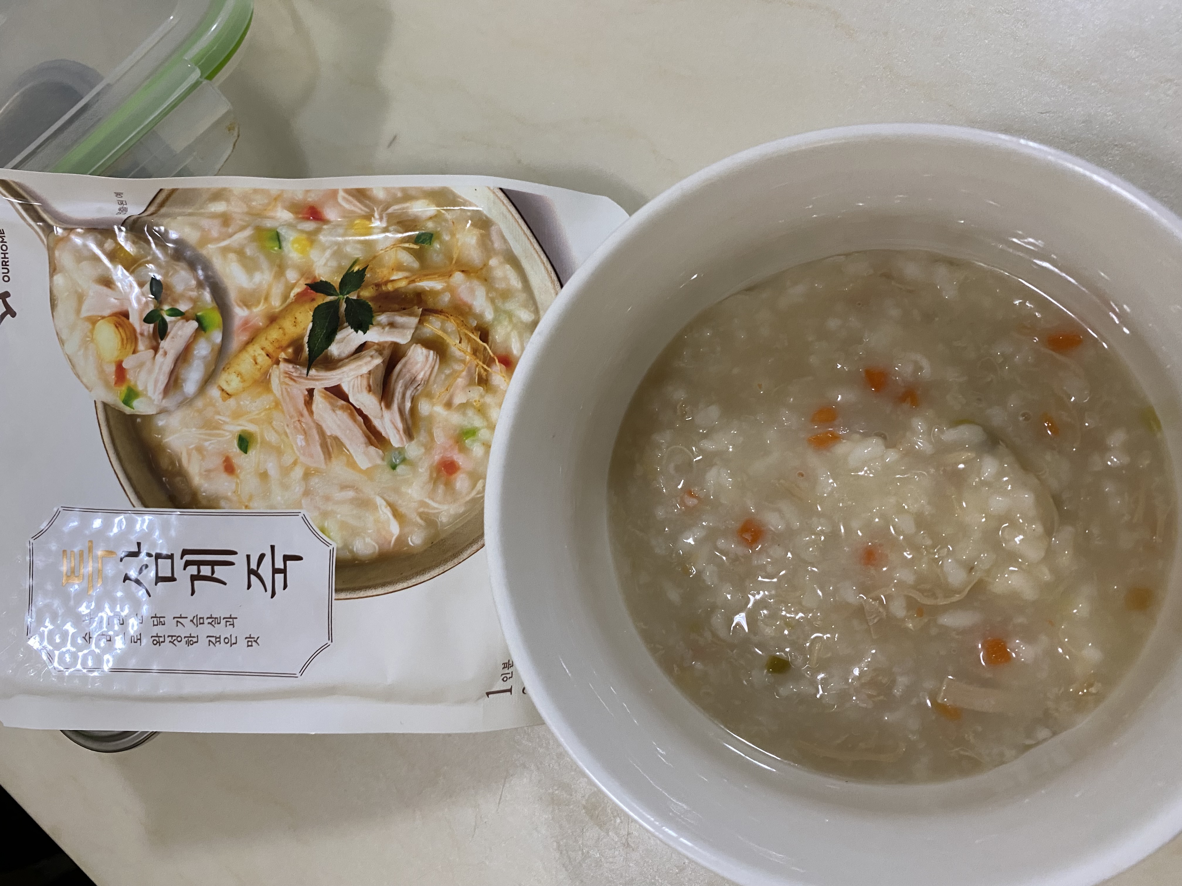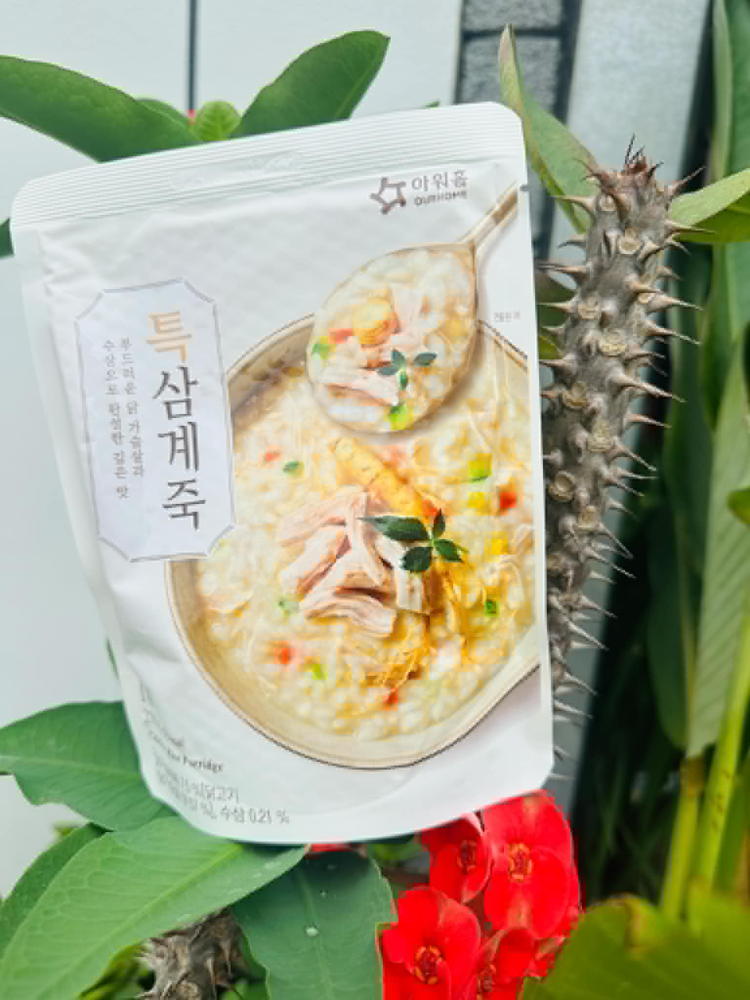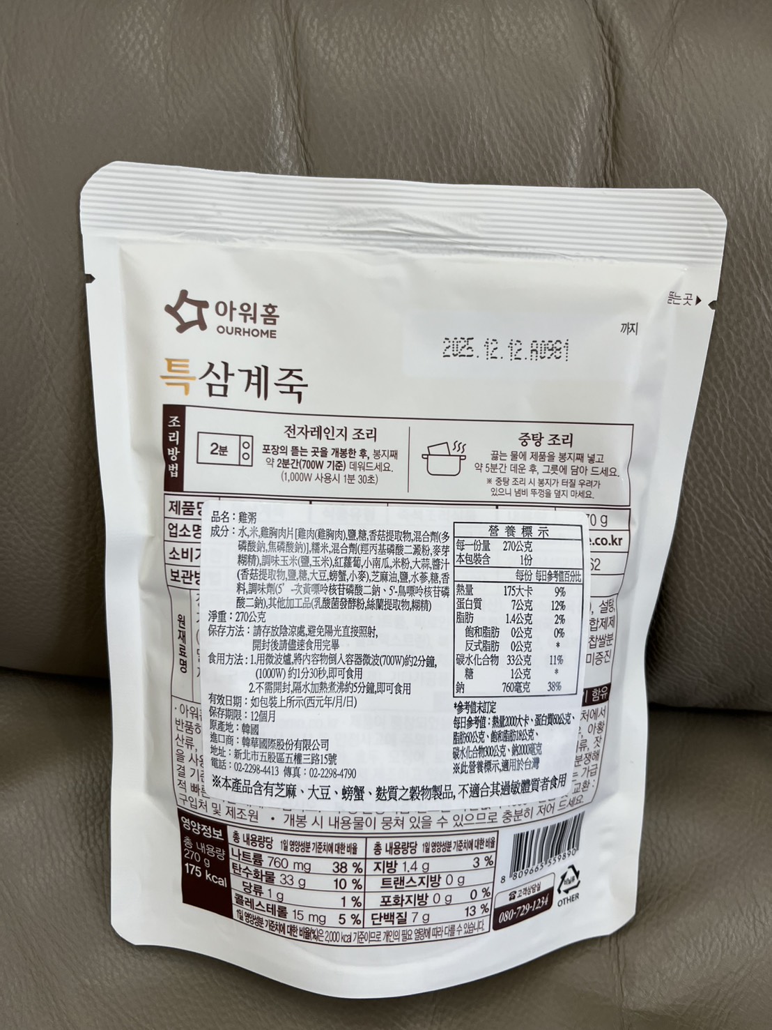 水、雞胸肉片[雞肉(雞胸肉)、鹽、糖、香菇提取物,混合劑(多磷酸鈉、焦磷酸鈉)]、米、調味玉米(鹽、玉米)、紅蘿蔔、小南瓜、糯米、混合劑(羥丙基磷酸二澱粉、麥芽糊精)、米粉、大蒜、牛骨提取物、芝麻油、醬汁(香菇提取物、鹽、糖、大豆、螃蟹、小麥)、鹽、水蔘、混合劑[丙二醇、混合劑(丙二醇、天然香料、酒精、甘油、人工香料)、甘油]、調味劑(5’-次黃嘌呤核苷磷酸二鈉、5'-鳥嘌呤核苷磷酸二鈉)