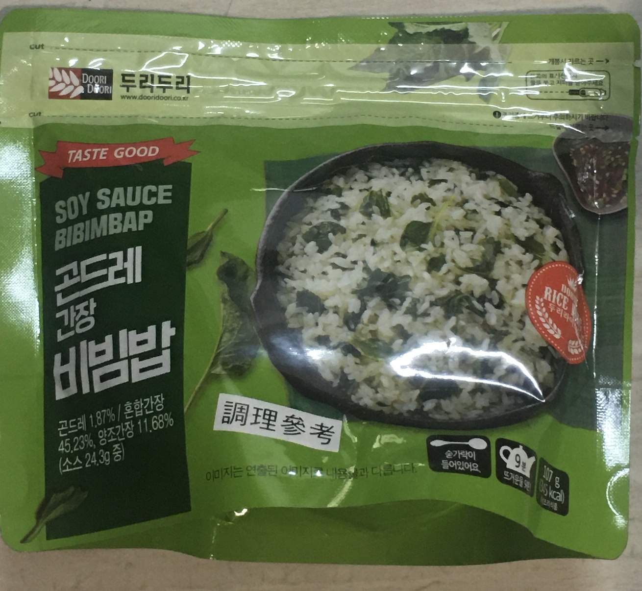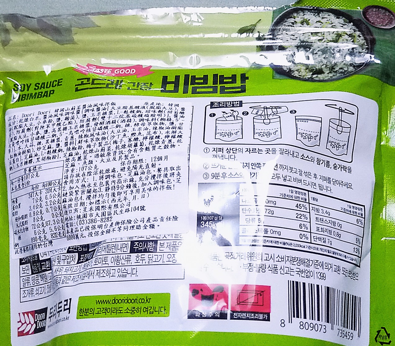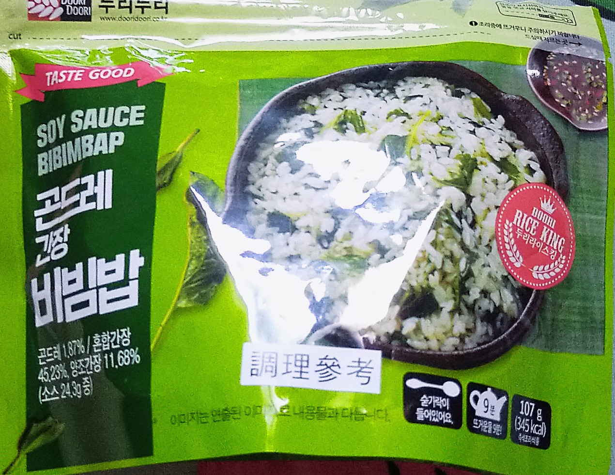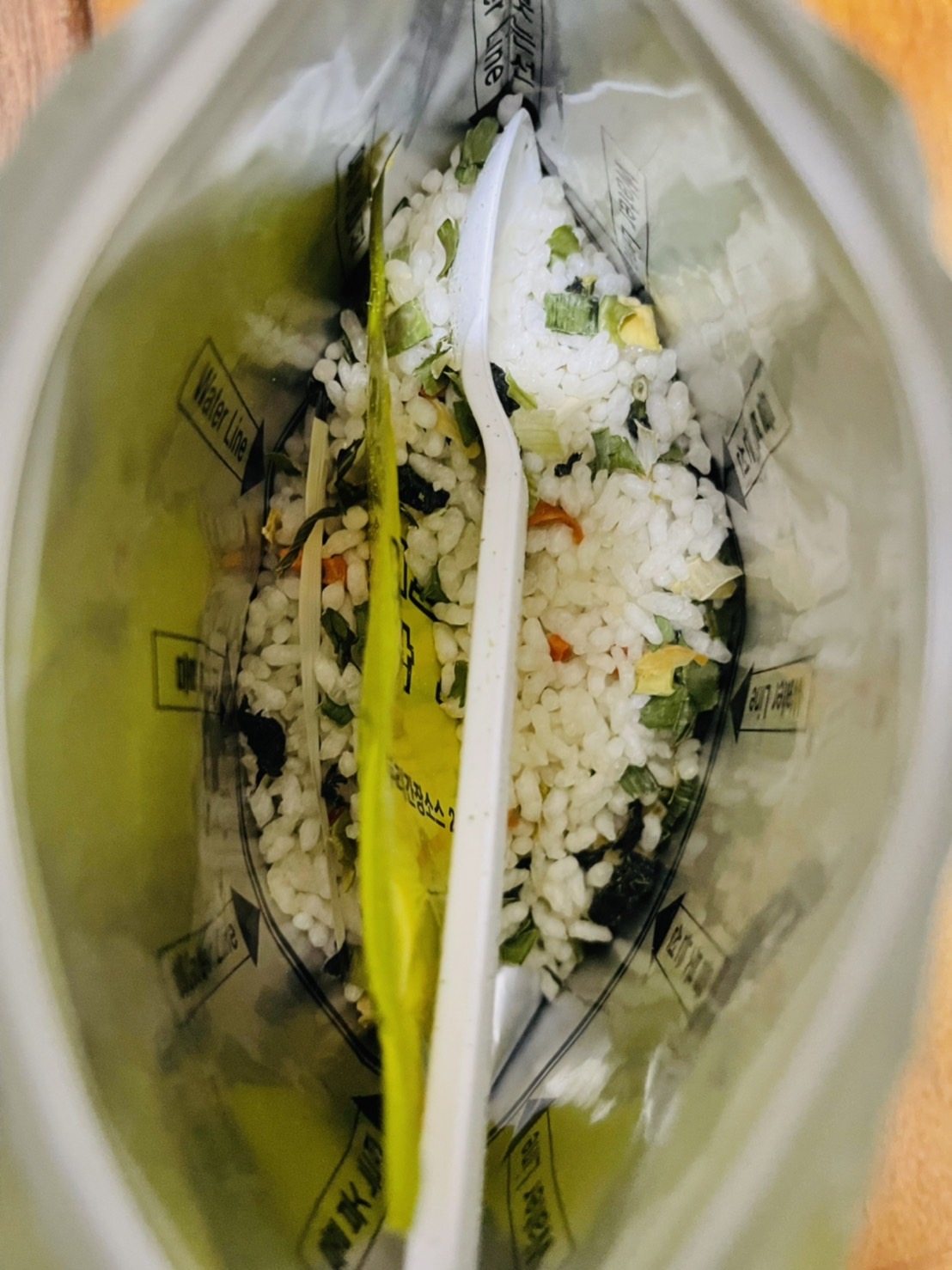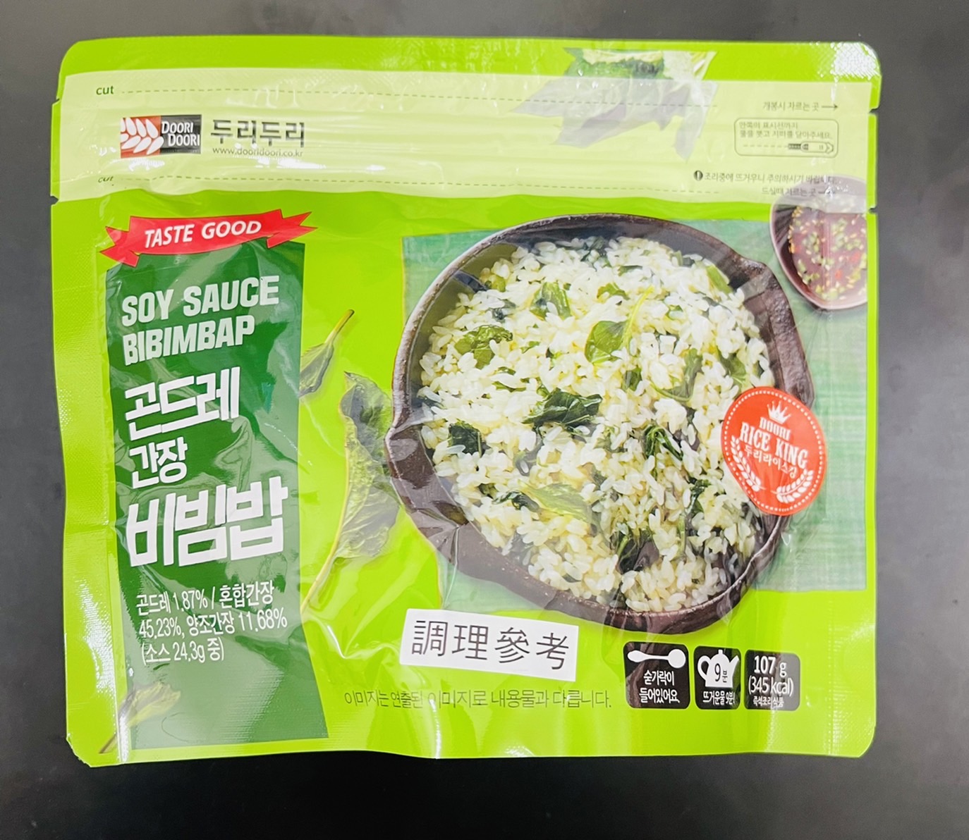 乾燥白米、醬油風味調味醬(大豆胺基酸液-脫脂大豆)、醬油(脫脂大豆,小麥粉,鹽,麴菌)、鹽、玉米糖漿、L-麩酸鈉、甜味劑(甜菊醣苷)、防腐劑(對羥苯甲酸乙酯)、防腐劑(雙十二烷基硫酸硫胺明)、醬油(脫脂大豆、小麥、鹽、高果糖玉米糖漿、發酵酒精(酒精)、調味料(糊精,5’-次黃嘌呤核苷磷酸二鈉、5’-鳥嘌呤核苷磷酸二鈉、糖、酵母萃取物、鹽、甘草)、水、大蒜、糖、果糖漿、青蔥、辣椒風味油(大豆油、玉米油、辣椒油樹脂、紅椒油樹脂)、炒芝麻、鹽、醬料(鮮味萃取物:沙丁魚、鰹魚、昆布)、水解大豆蛋白、芝麻油、L-麩酸鈉、辣椒粉、梅子製品(梅子、寡醣、檸檬酸、檸檬酸鈉)、玉米糖膠、黑胡椒粉、芝麻油、乾燥山薊菜、乾燥胡蘿蔔、乾燥青蔥、乾燥高麗菜。