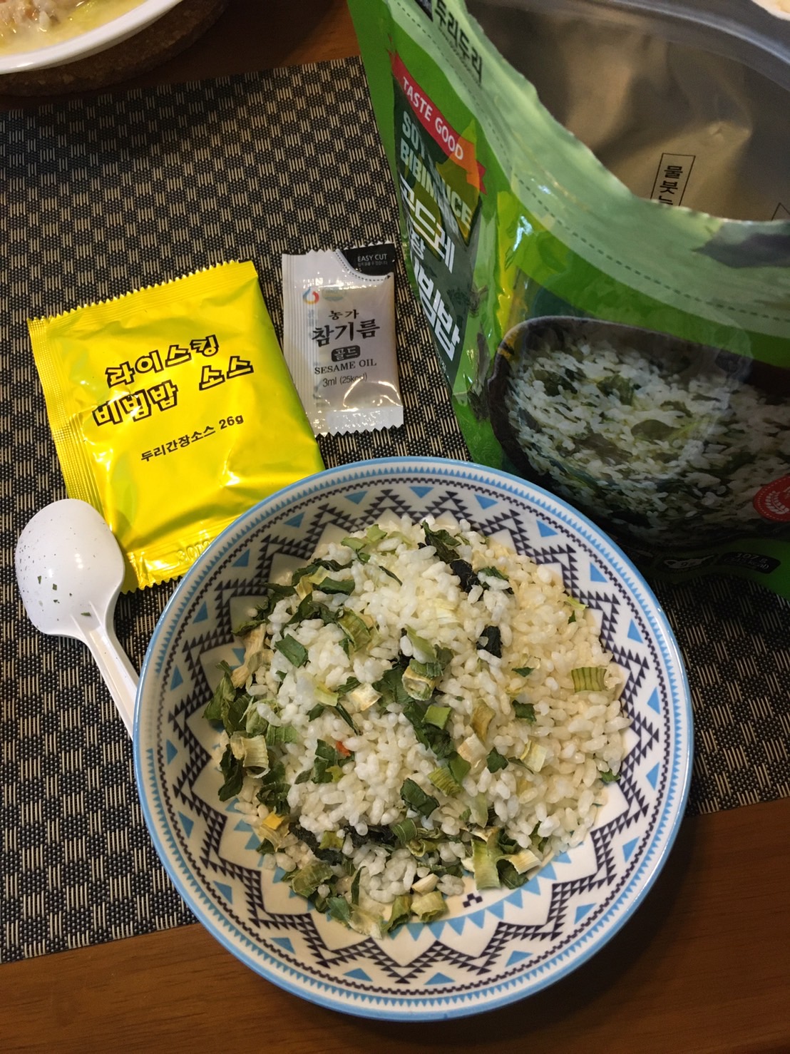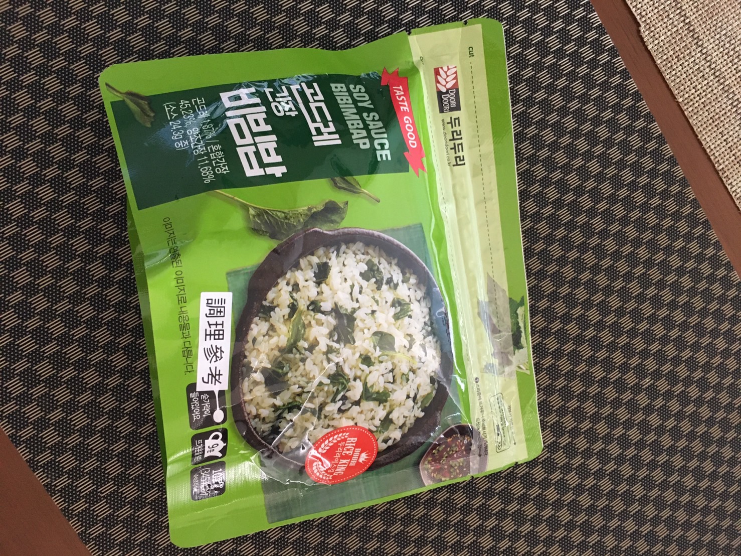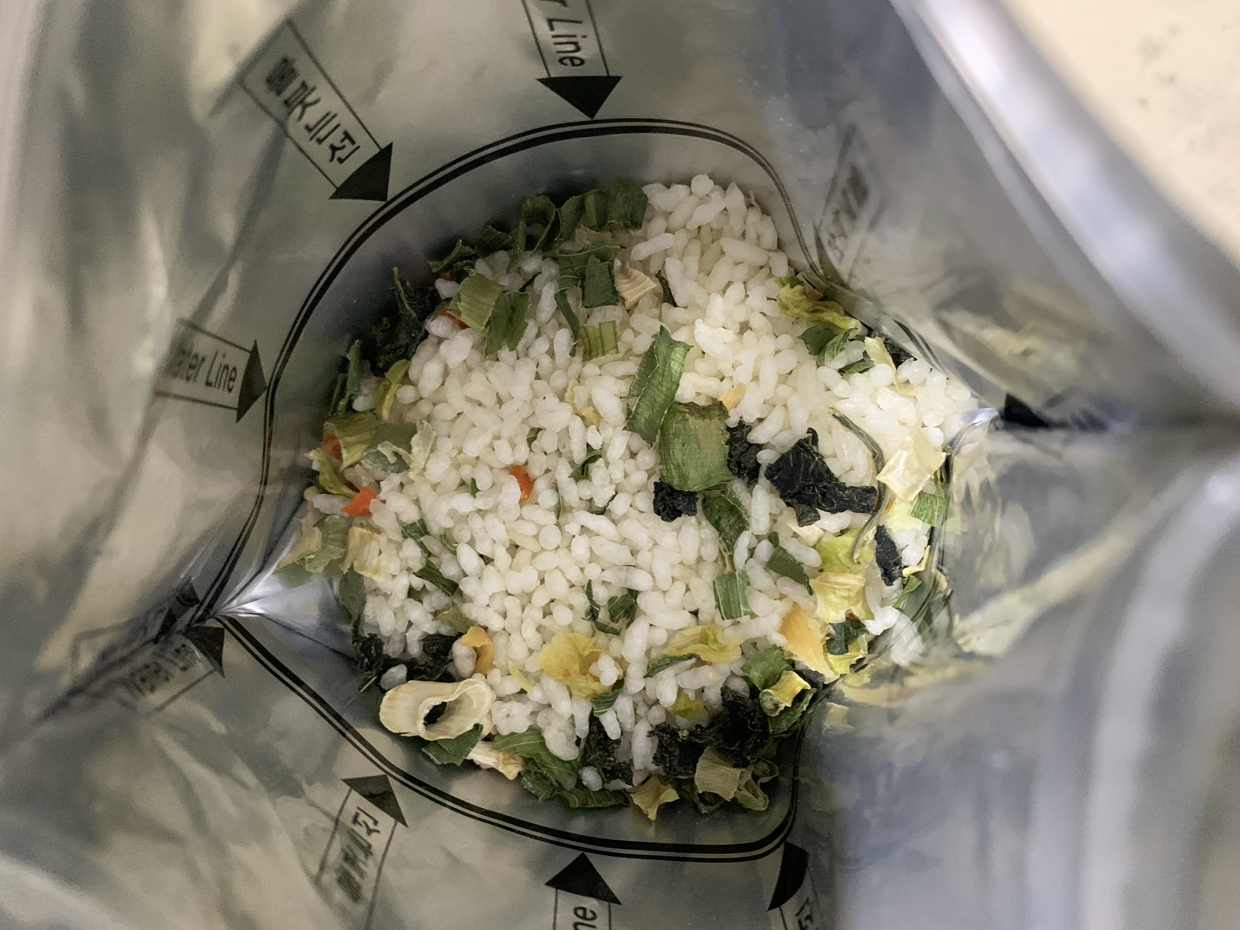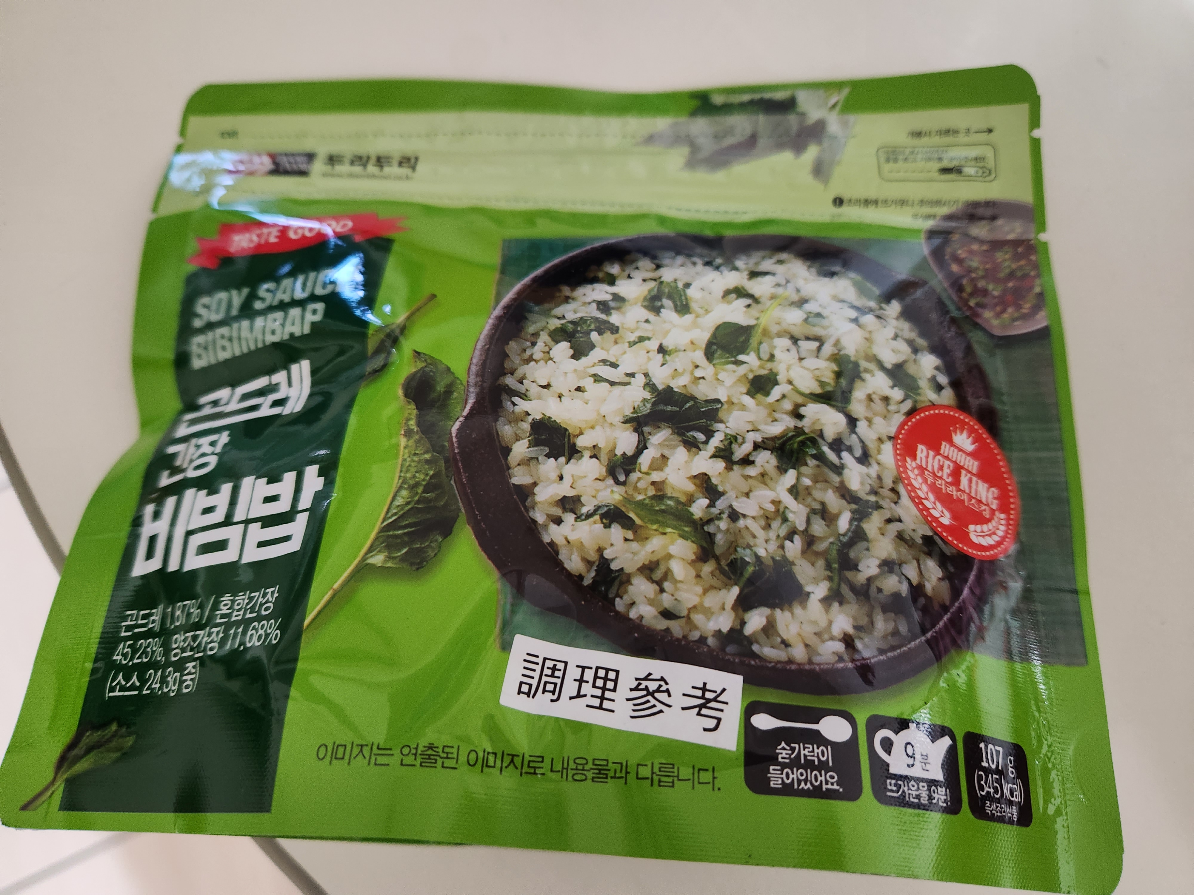 乾燥白米、醬油風味調味醬(大豆胺基酸液-脫脂大豆)、醬油(脫脂大豆,小麥粉,鹽,麴菌)、鹽、玉米糖漿、L-麩酸鈉、甜味劑(甜菊醣苷)、防腐劑(對羥苯甲酸乙酯)、防腐劑(雙十二烷基硫酸硫胺明)、醬油(脫脂大豆、小麥、鹽、高果糖玉米糖漿、發酵酒精(酒精)、調味料(糊精,5’-次黃嘌呤核苷磷酸二鈉、5’-鳥嘌呤核苷磷酸二鈉、糖、酵母萃取物、鹽、甘草)、水、大蒜、糖、果糖漿、青蔥、辣椒風味油(大豆油、玉米油、辣椒油樹脂、紅椒油樹脂)、炒芝麻、鹽、醬料(鮮味萃取物:沙丁魚、鰹魚、昆布)、水解大豆蛋白、芝麻油、L-麩酸鈉、辣椒粉、梅子製品(梅子、寡醣、檸檬酸、檸檬酸鈉)、玉米糖膠、黑胡椒粉、芝麻油、乾燥山薊菜、乾燥胡蘿蔔、乾燥青蔥、乾燥高麗菜。