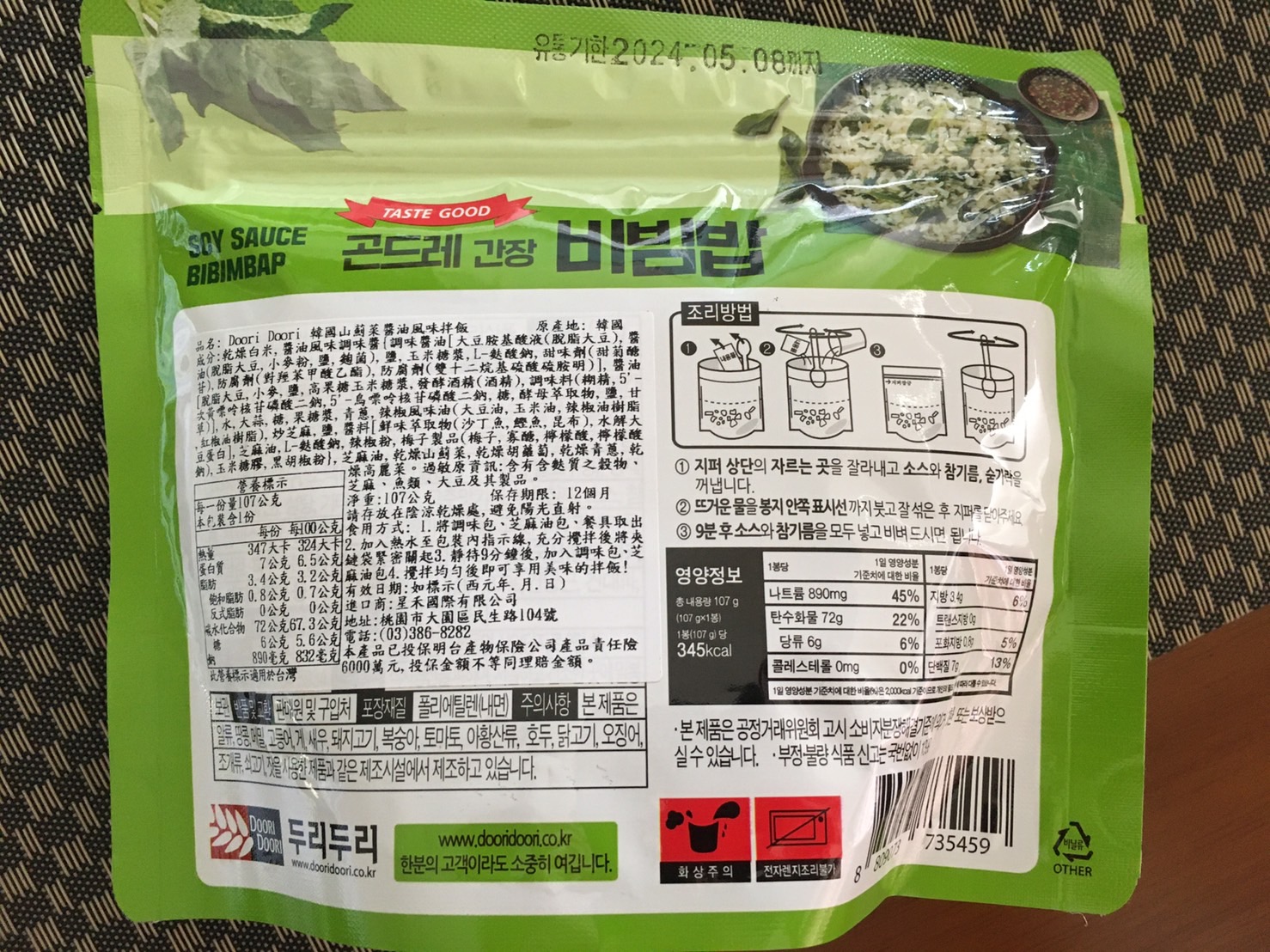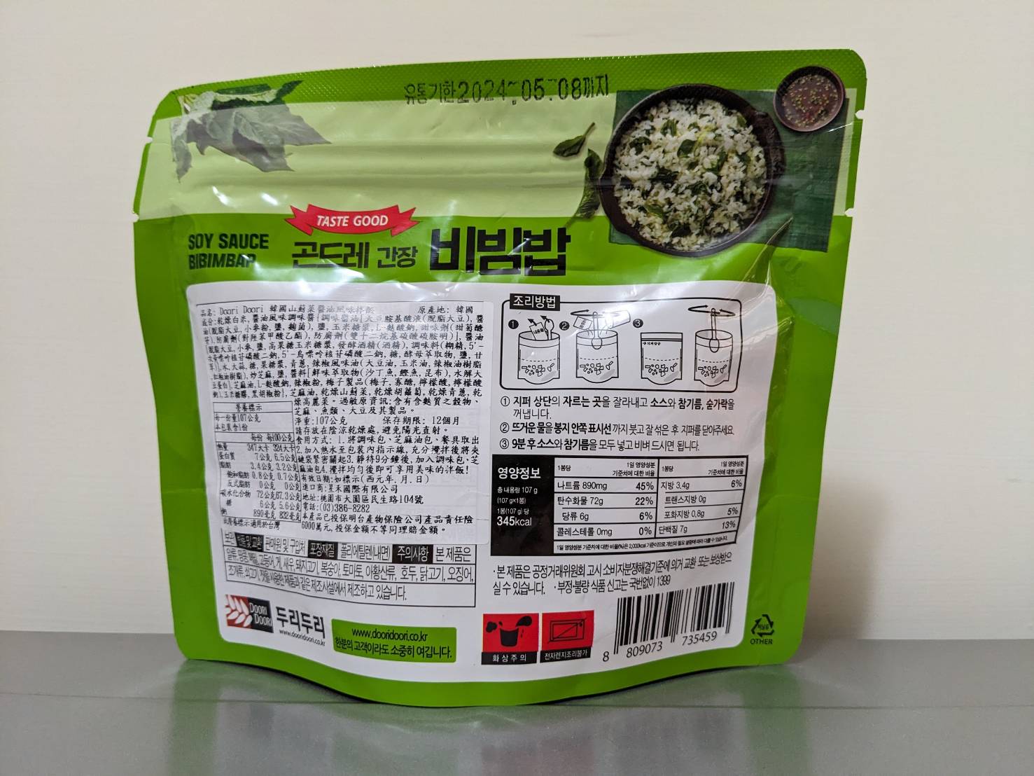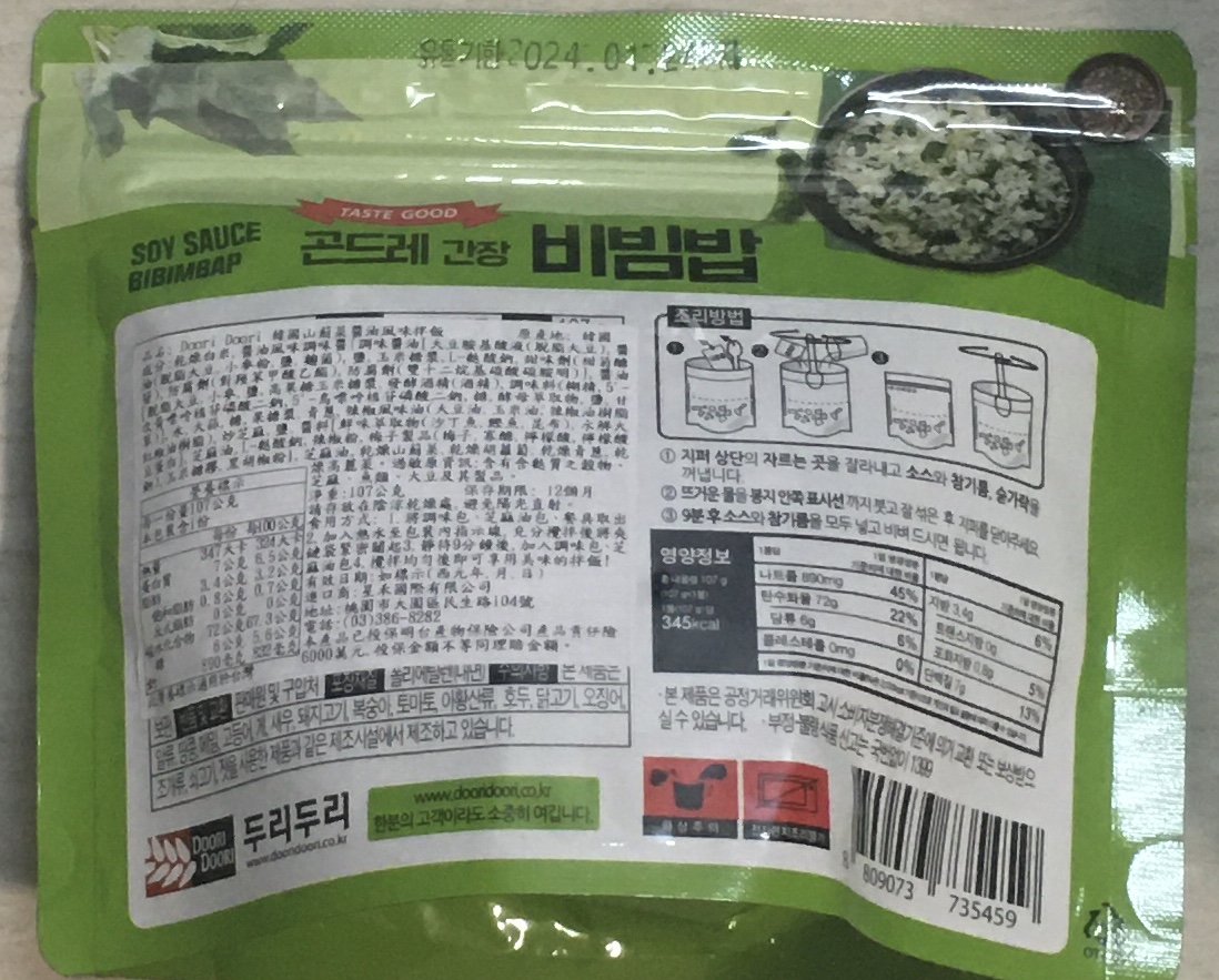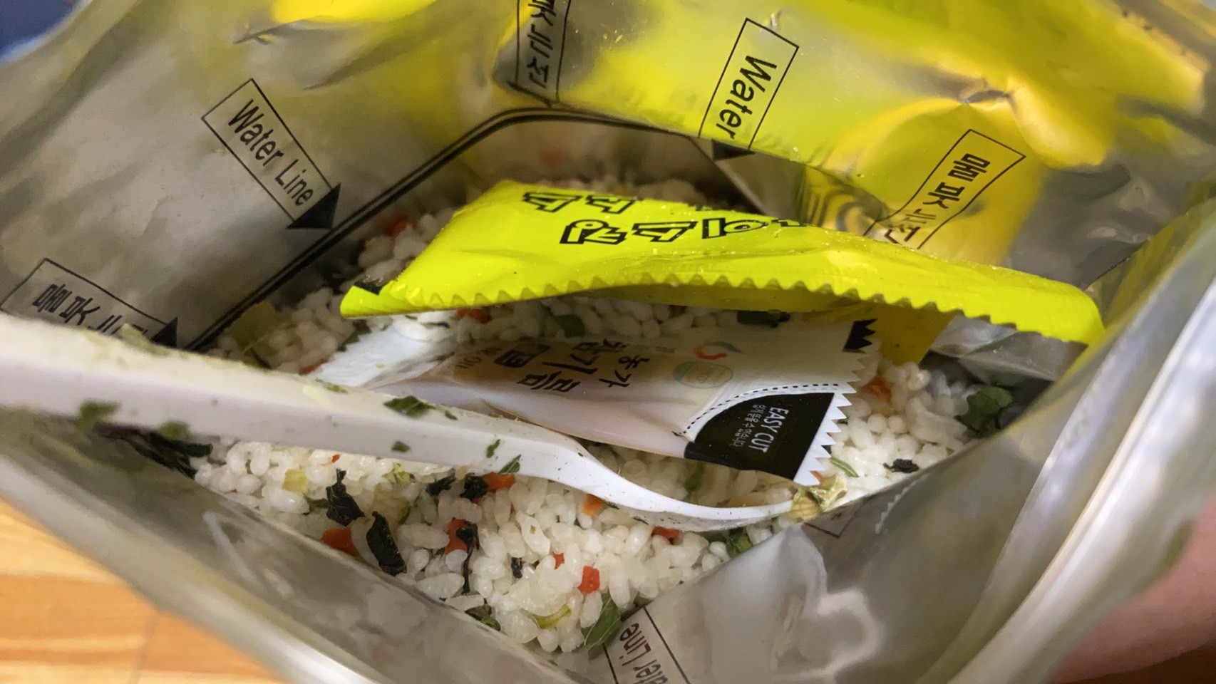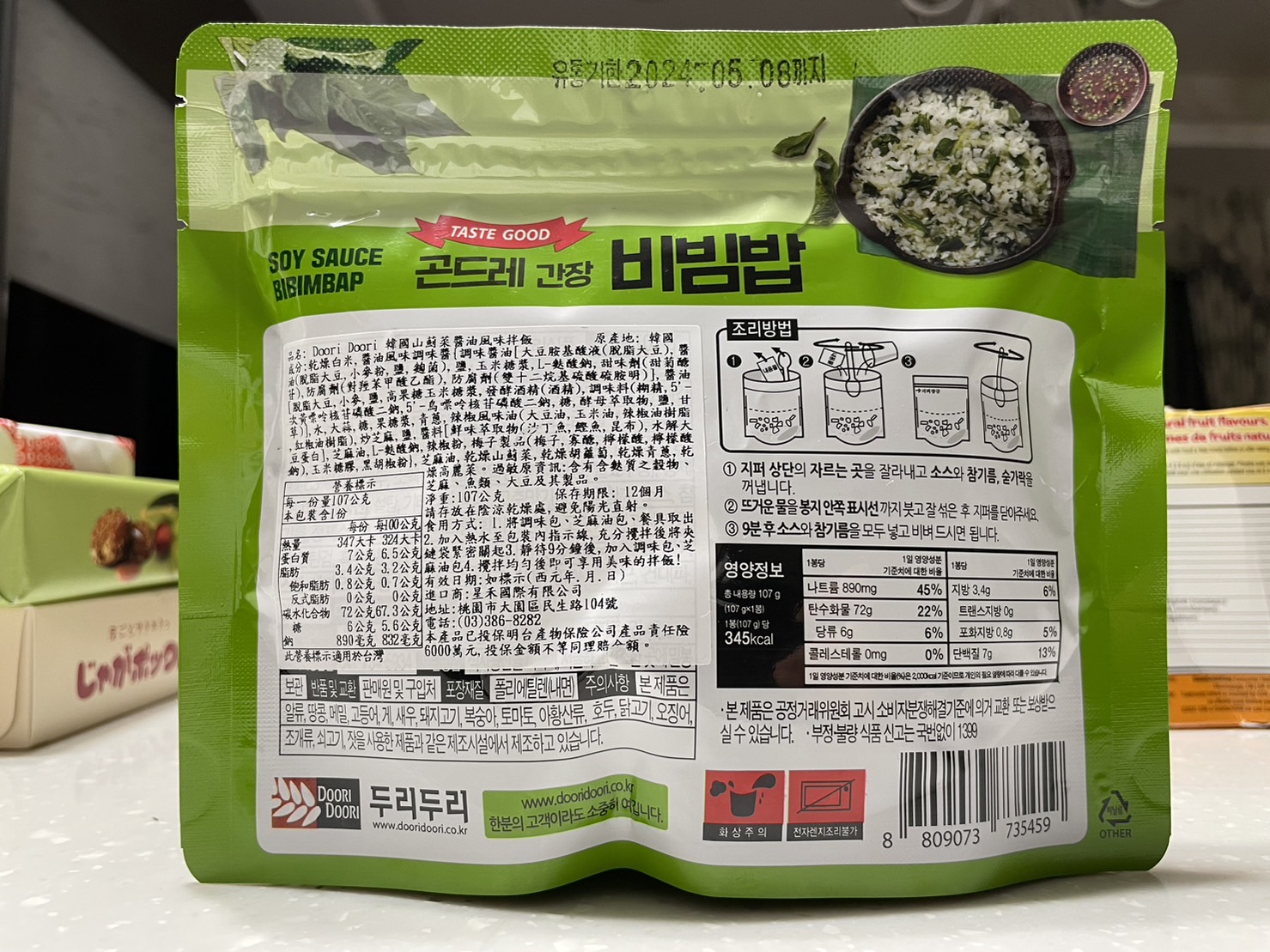 乾燥白米、醬油風味調味醬(大豆胺基酸液-脫脂大豆)、醬油(脫脂大豆,小麥粉,鹽,麴菌)、鹽、玉米糖漿、L-麩酸鈉、甜味劑(甜菊醣苷)、防腐劑(對羥苯甲酸乙酯)、防腐劑(雙十二烷基硫酸硫胺明)、醬油(脫脂大豆、小麥、鹽、高果糖玉米糖漿、發酵酒精(酒精)、調味料(糊精,5’-次黃嘌呤核苷磷酸二鈉、5’-鳥嘌呤核苷磷酸二鈉、糖、酵母萃取物、鹽、甘草)、水、大蒜、糖、果糖漿、青蔥、辣椒風味油(大豆油、玉米油、辣椒油樹脂、紅椒油樹脂)、炒芝麻、鹽、醬料(鮮味萃取物:沙丁魚、鰹魚、昆布)、水解大豆蛋白、芝麻油、L-麩酸鈉、辣椒粉、梅子製品(梅子、寡醣、檸檬酸、檸檬酸鈉)、玉米糖膠、黑胡椒粉、芝麻油、乾燥山薊菜、乾燥胡蘿蔔、乾燥青蔥、乾燥高麗菜。
