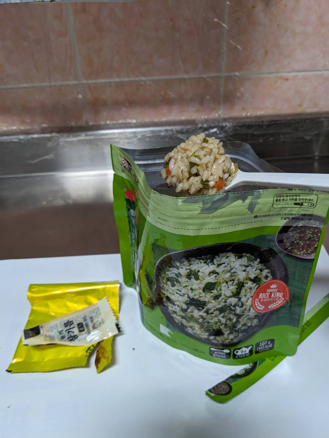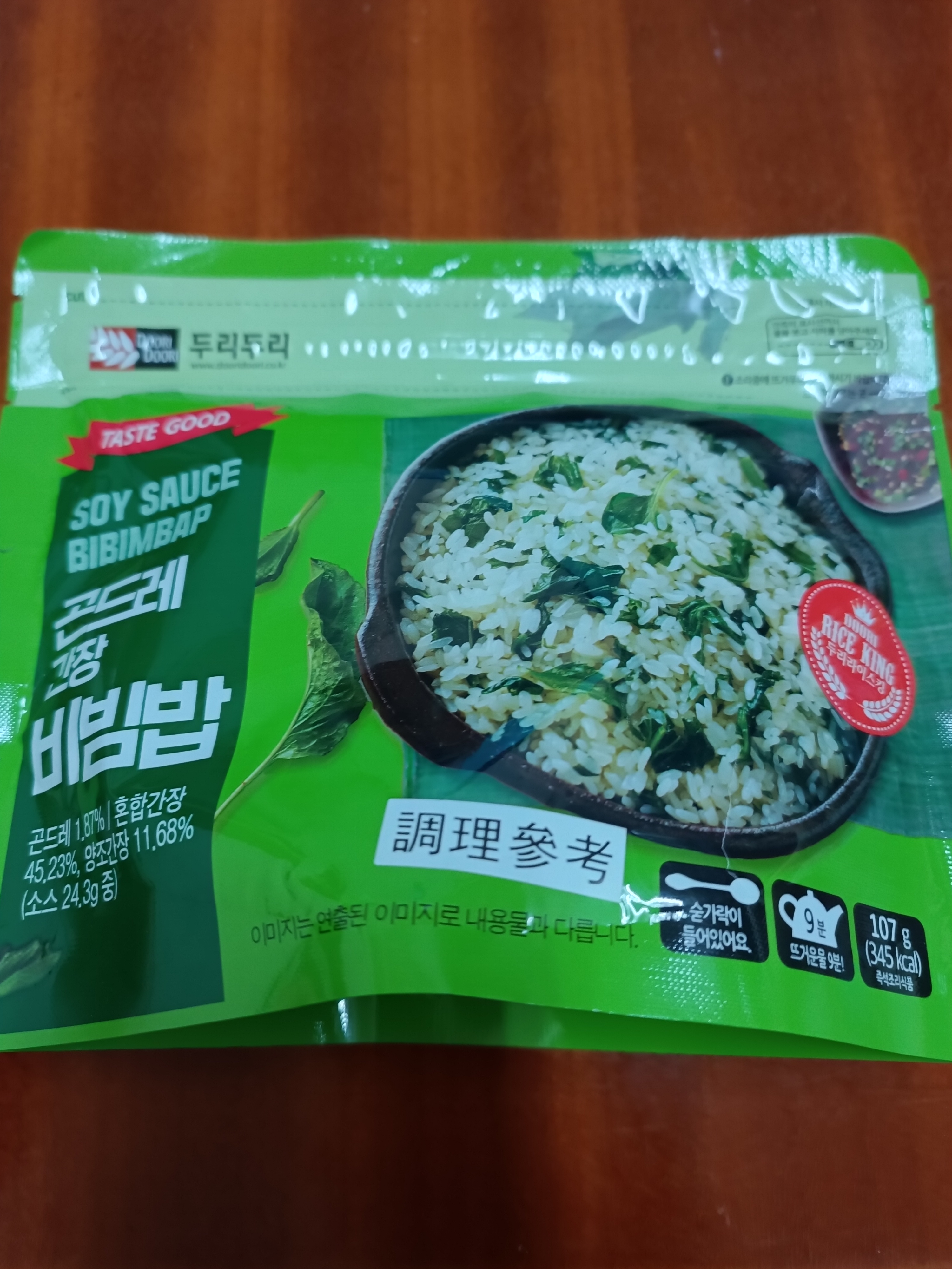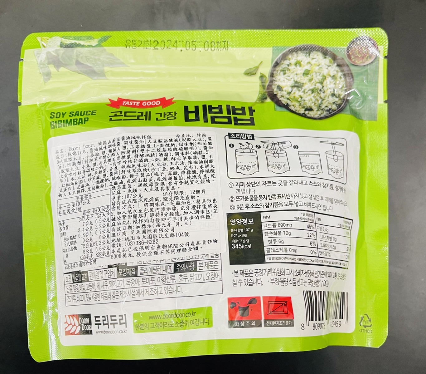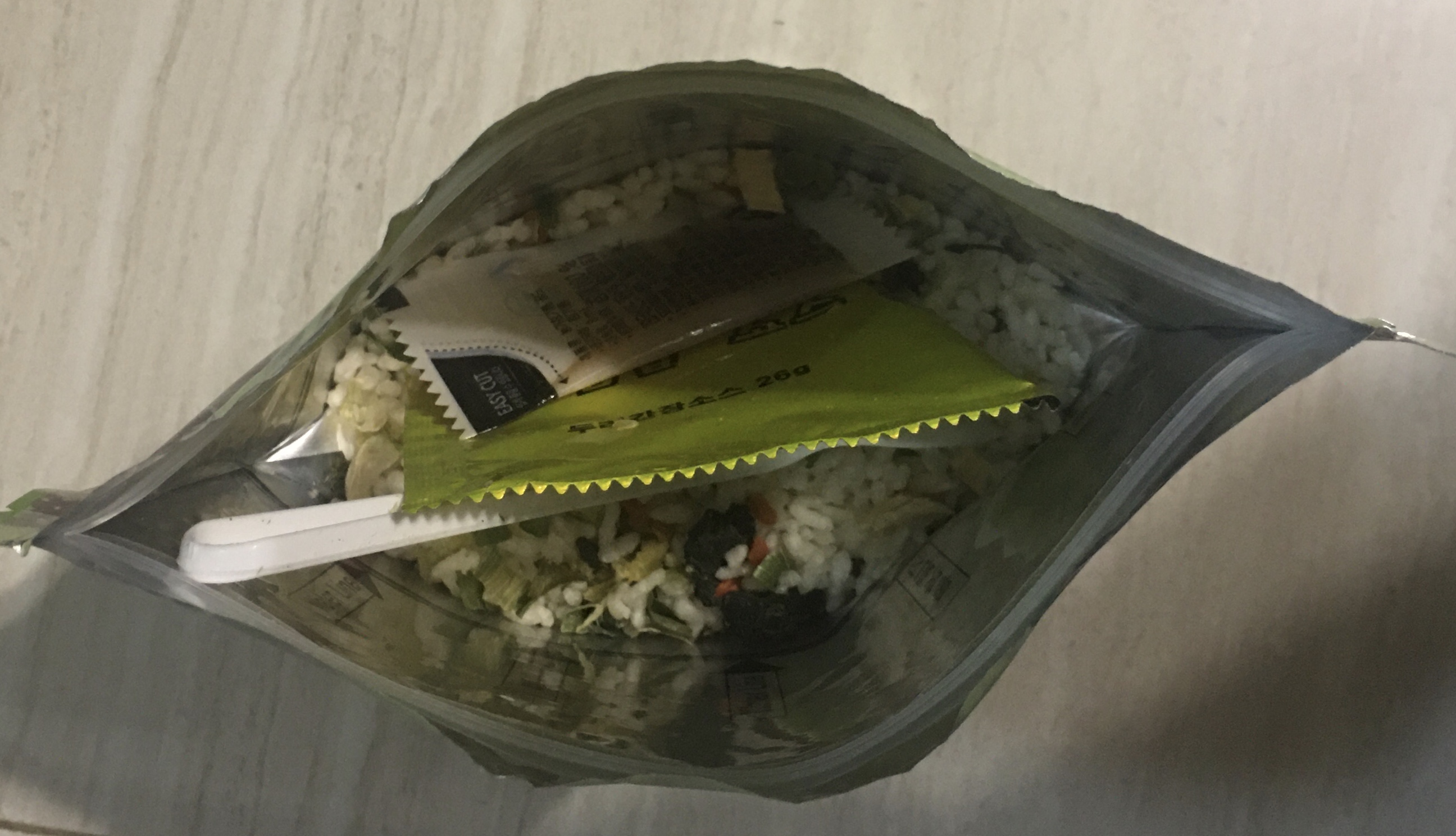 乾燥白米、醬油風味調味醬(大豆胺基酸液-脫脂大豆)、醬油(脫脂大豆,小麥粉,鹽,麴菌)、鹽、玉米糖漿、L-麩酸鈉、甜味劑(甜菊醣苷)、防腐劑(對羥苯甲酸乙酯)、防腐劑(雙十二烷基硫酸硫胺明)、醬油(脫脂大豆、小麥、鹽、高果糖玉米糖漿、發酵酒精(酒精)、調味料(糊精,5’-次黃嘌呤核苷磷酸二鈉、5’-鳥嘌呤核苷磷酸二鈉、糖、酵母萃取物、鹽、甘草)、水、大蒜、糖、果糖漿、青蔥、辣椒風味油(大豆油、玉米油、辣椒油樹脂、紅椒油樹脂)、炒芝麻、鹽、醬料(鮮味萃取物:沙丁魚、鰹魚、昆布)、水解大豆蛋白、芝麻油、L-麩酸鈉、辣椒粉、梅子製品(梅子、寡醣、檸檬酸、檸檬酸鈉)、玉米糖膠、黑胡椒粉、芝麻油、乾燥山薊菜、乾燥胡蘿蔔、乾燥青蔥、乾燥高麗菜。