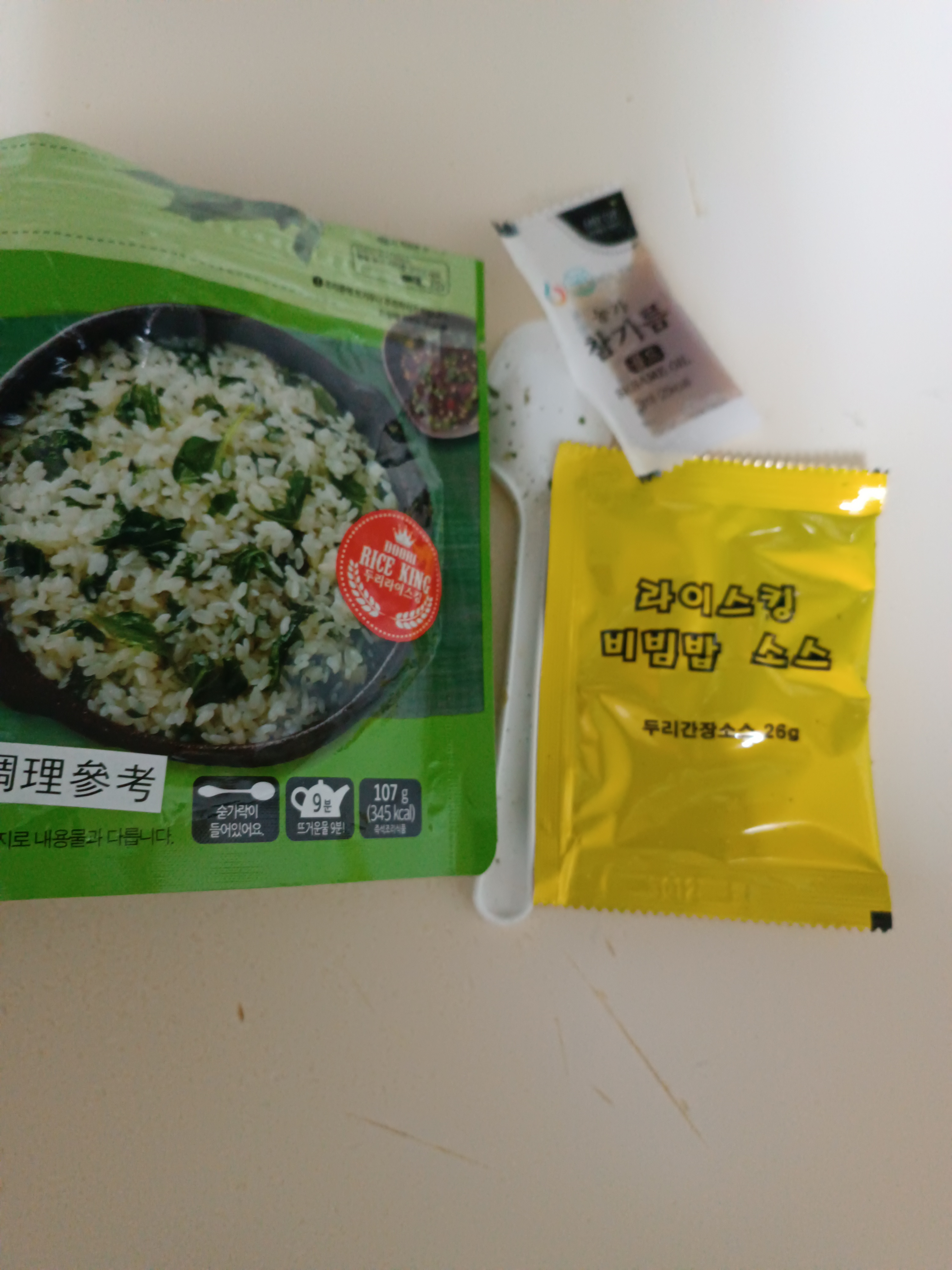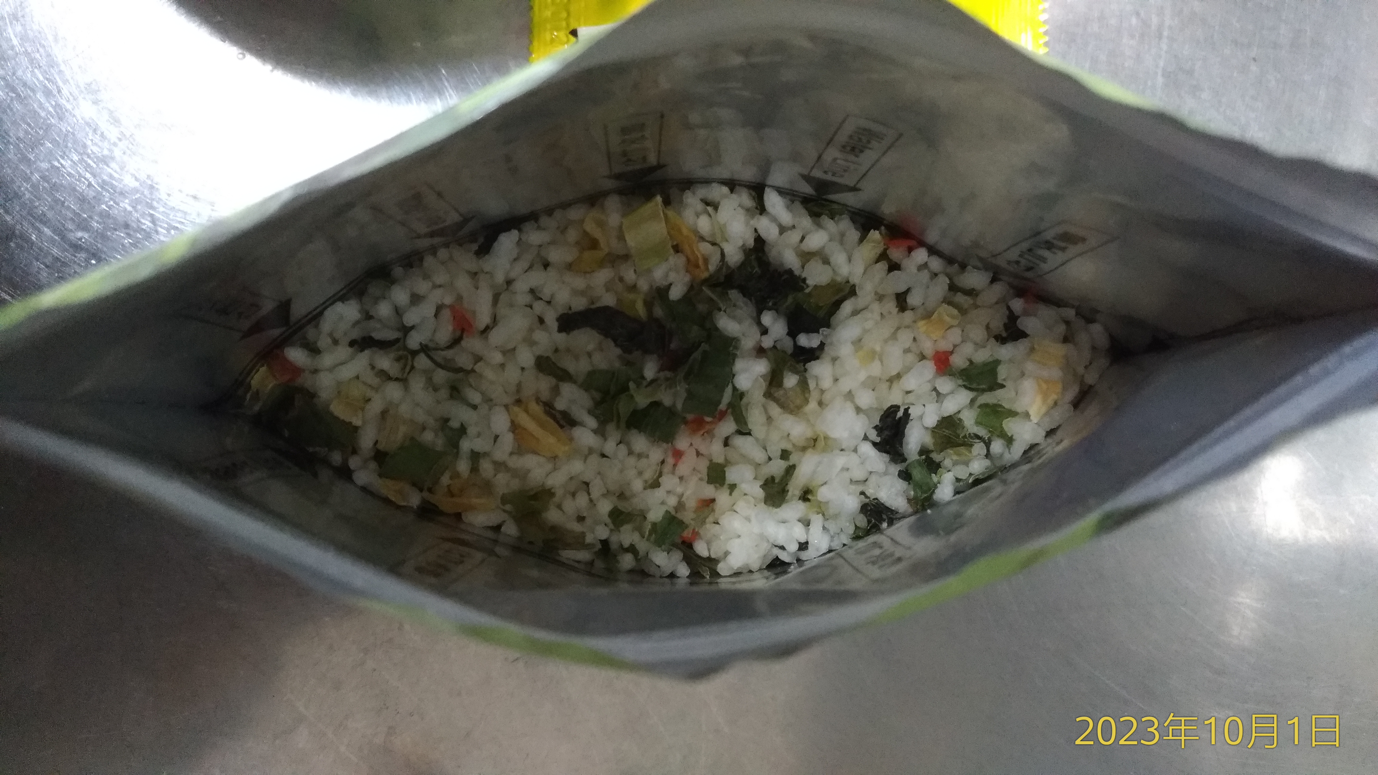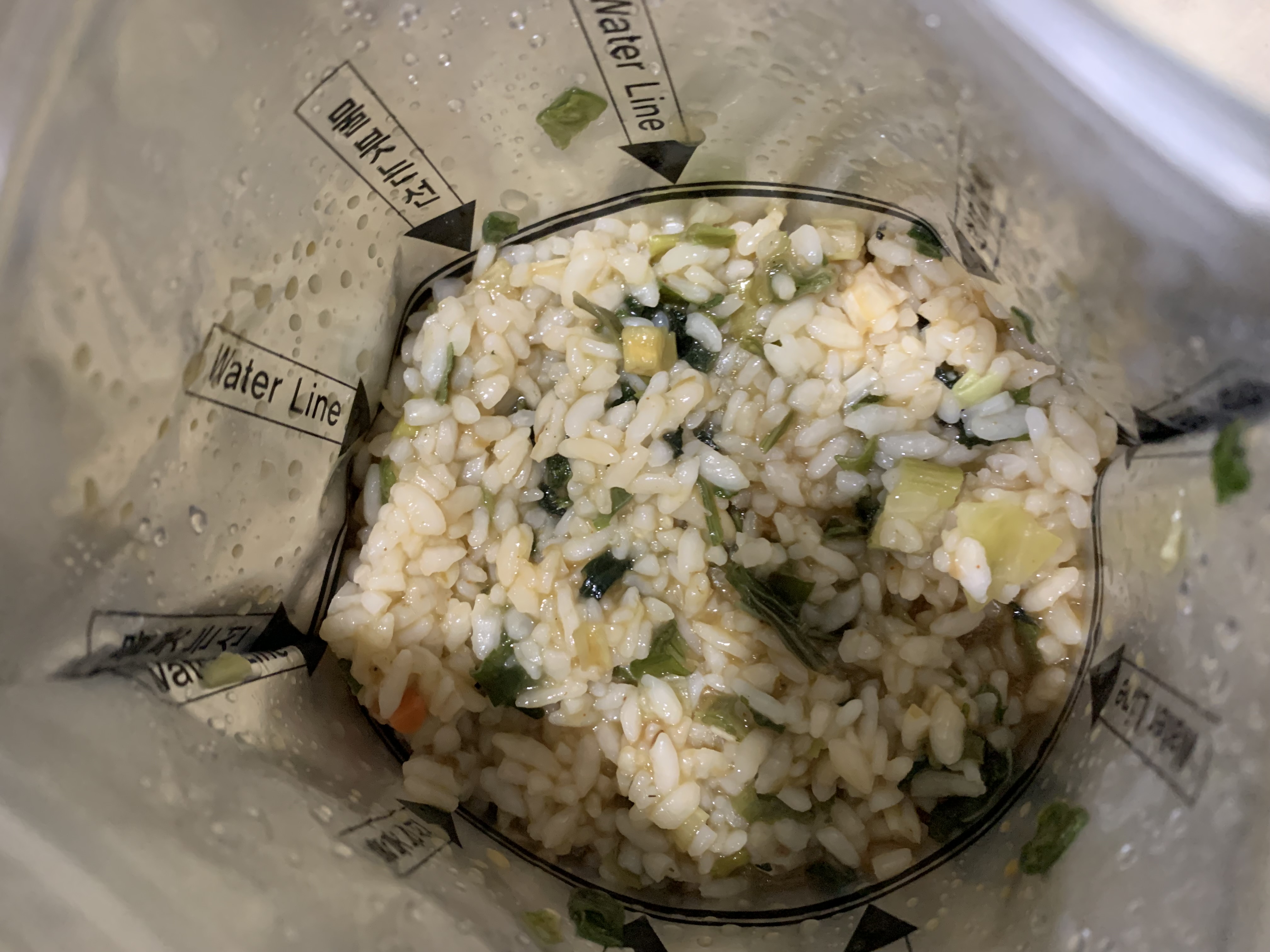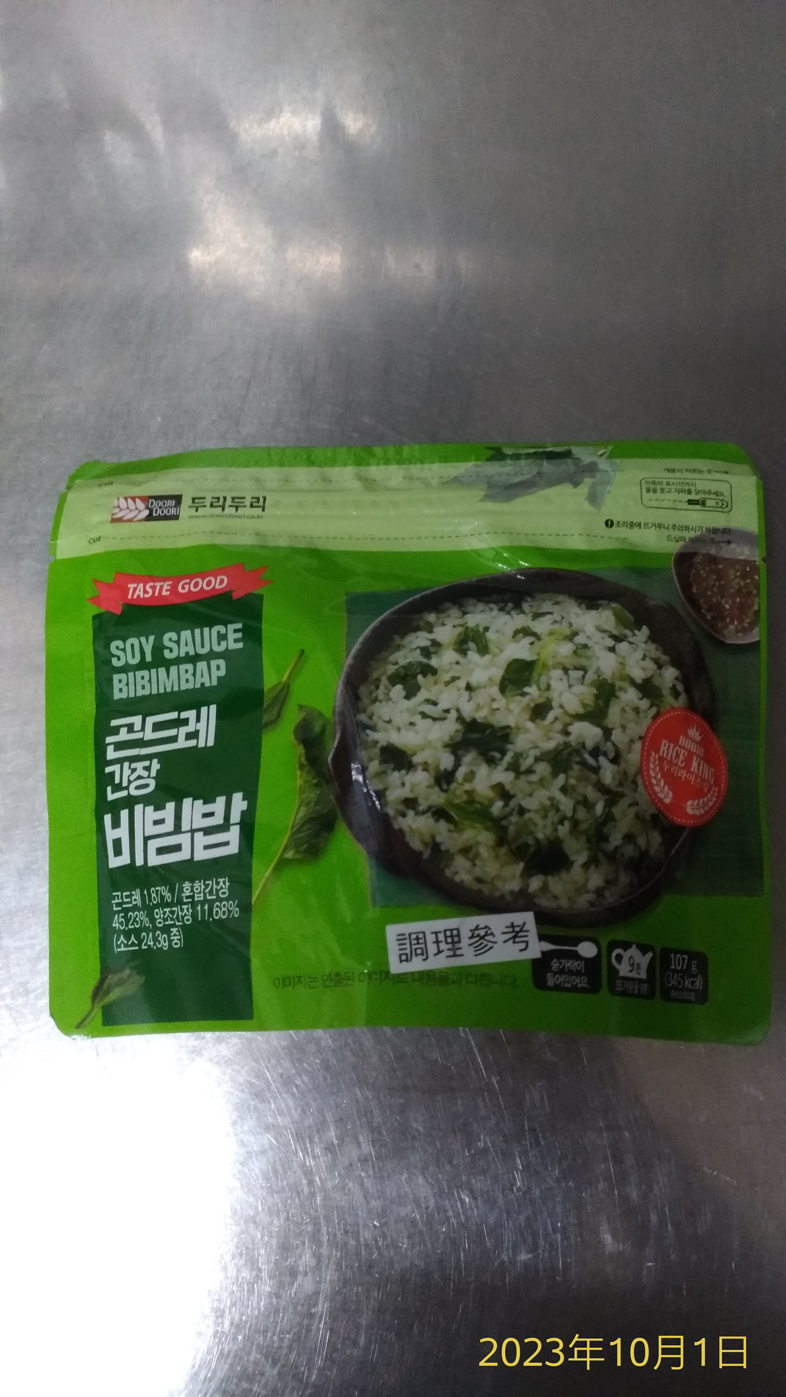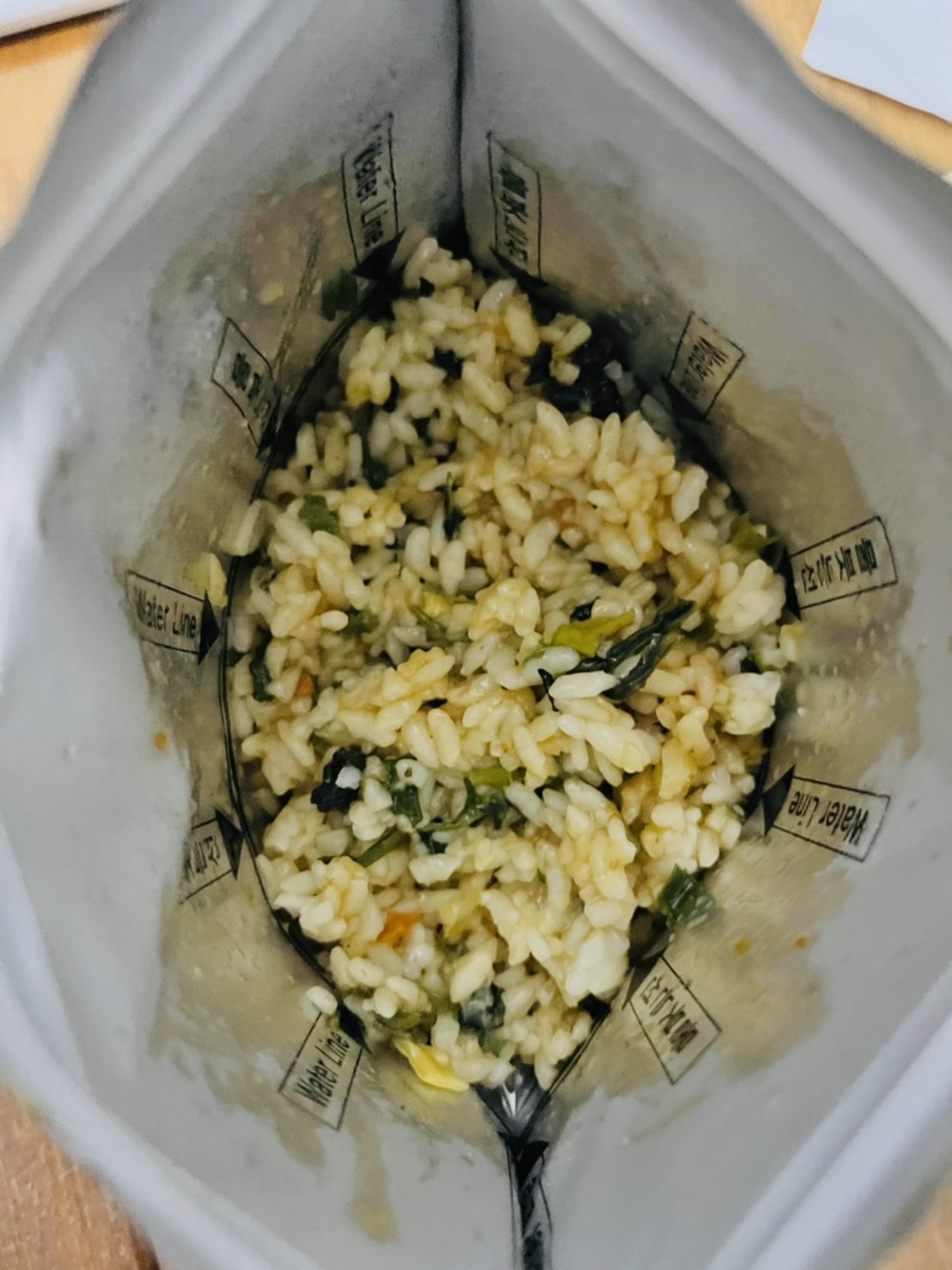 乾燥白米、醬油風味調味醬(大豆胺基酸液-脫脂大豆)、醬油(脫脂大豆,小麥粉,鹽,麴菌)、鹽、玉米糖漿、L-麩酸鈉、甜味劑(甜菊醣苷)、防腐劑(對羥苯甲酸乙酯)、防腐劑(雙十二烷基硫酸硫胺明)、醬油(脫脂大豆、小麥、鹽、高果糖玉米糖漿、發酵酒精(酒精)、調味料(糊精,5’-次黃嘌呤核苷磷酸二鈉、5’-鳥嘌呤核苷磷酸二鈉、糖、酵母萃取物、鹽、甘草)、水、大蒜、糖、果糖漿、青蔥、辣椒風味油(大豆油、玉米油、辣椒油樹脂、紅椒油樹脂)、炒芝麻、鹽、醬料(鮮味萃取物:沙丁魚、鰹魚、昆布)、水解大豆蛋白、芝麻油、L-麩酸鈉、辣椒粉、梅子製品(梅子、寡醣、檸檬酸、檸檬酸鈉)、玉米糖膠、黑胡椒粉、芝麻油、乾燥山薊菜、乾燥胡蘿蔔、乾燥青蔥、乾燥高麗菜。