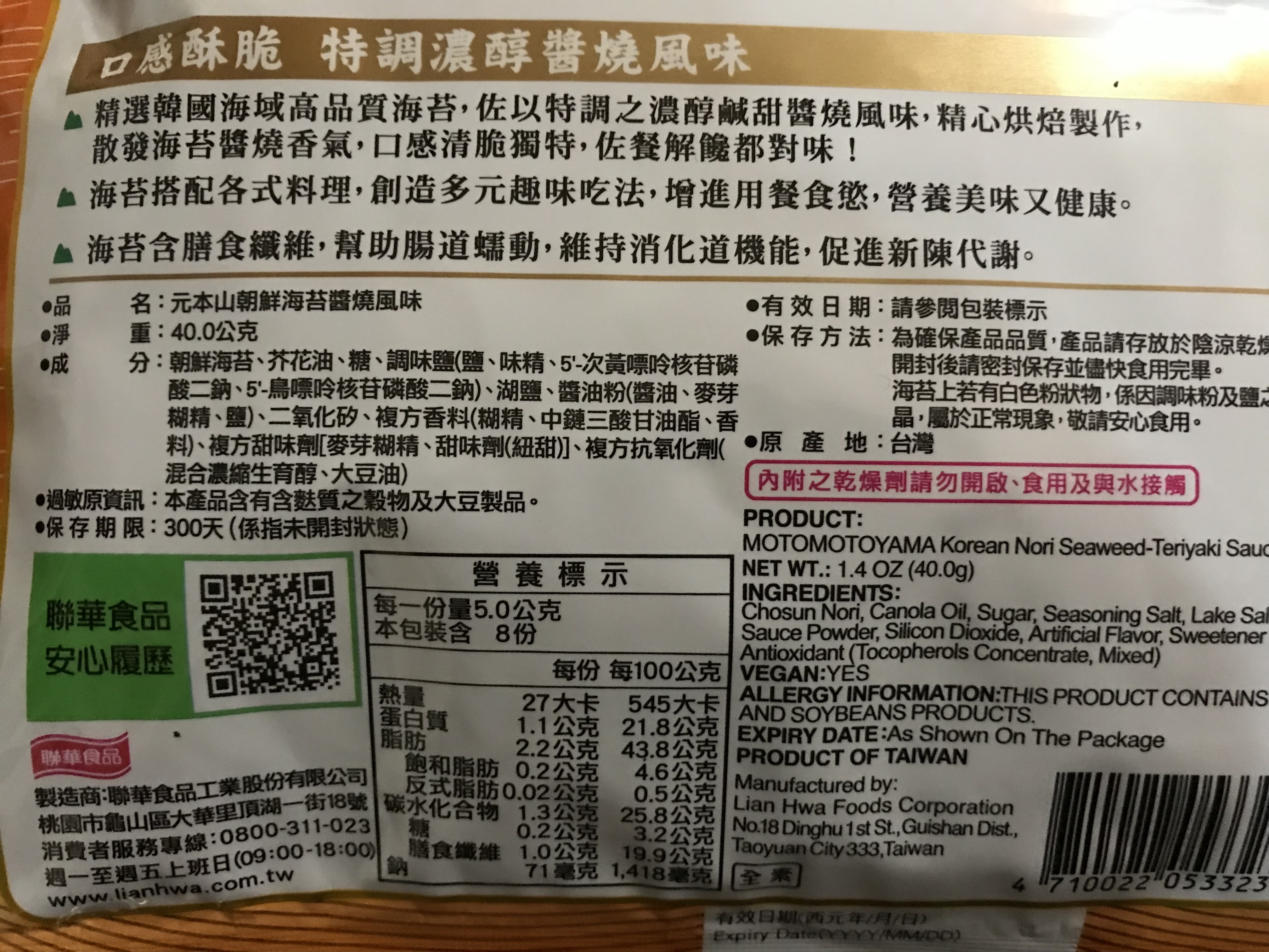 回列表 元本山 朝鮮海苔醬燒風味 佐餐解饞都對味! 市價360元,共三包 所需等級 一般會員以上 所需學分 20 體驗份數 40 關注人數 871 申請人數 226 申請截止 品牌業者:元本山 負責廠商 聯華食品工業股份有限公司 廠商地址 桃園市龜山區大華里頂湖一街18號 產地 台灣 試用產品規格 40克(30枚)/包,共三包 食品業者登錄字號 A-107569627-00000-0 投保產品責任險字號 1000字第09PR000612號 心得分享 商品介紹 商品成分 使用方法 注意事項 體驗名單 9.1 元本山 朝鮮海苔醬燒風味 涮嘴程度 8.9 食用方式多元 9.2 調味剛好 8.7 口感香脆 8.9 建議推薦 9.0 心得分享 39則 蘇孜艾 鑽石達人 40歲 臺南市 2022/04/14 對元本山 朝鮮海苔醬燒風味留下評價 9 我本身就愛吃海苔,更是元本山的愛好者,海苔有很多種口味,這次抽中的是醬燒風味,海苔本身口感清脆,配上日式醬燒調味,有濃郁的燒烤香味,讓人一口接一口,不論是包飯或是單吃都很好吃,最重要的是不會很鹹也不膩口,如果家中有小孩的還能包飯菜,能讓小孩把飯吃光光。 Gloria 鑽石達人 45歲 嘉義市 2022/04/14 對元本山 朝鮮海苔醬燒風味留下評價 9 元本山朝鮮海苔-醬燒風味試吃給的非常大方,一次給三包,吃好吃滿的概念🤣打開試吃品,兒子就吵著要包飯吃,一下子吃了十卷海苔包飯,媽媽零廚藝完全沒問題🆗海苔香脆、調味不太重,所以單吃也唰嘴😆要說缺點,大概就是這口味有點點偏甜,其他都很完美💯 周佳雯 鑽石達人 47歲 彰化縣 2022/04/15 對元本山 朝鮮海苔醬燒風味留下評價 8 我很喜歡吃海苔,因為海苔含有許多纖維且又美味,是少數不多好吃卻又健康的零食,對於元本山海苔我一直都很有印象,廣告洗腦詞「元本山~原本是座山~」深入我心,然海苔很容易受潮,一旦受潮馬上變軟口感就變差,因此夾鍊袋形式包裝沒吃完隨時密封很貼心,一般海苔口味通常都是原味或辣味,難得吃到不一樣的口味-醬燒風味,這款海苔跟它牌比較起來每張厚薄度又更薄了,因此比較沒那麼硬(或是脆),單吃的話我個人覺得一次要吃兩片比較有口感,但是包飯糰比較好捲,不容易在捲的過程中就裂開,整體吃起來醬燒風味不會很濃味道剛好很合,直接當作零食吃或是包飯捲吃都很棒,不過我大推包飯,一下子就包完一碗飯嗑光了! 林冠宏 鑽石達人 44歲 宜蘭縣 2022/04/15 對元本山 朝鮮海苔醬燒風味留下評價 8 與一般韓式海苔相比,元本山醬燒風味朝鮮海苔的調味剛剛好,且保有海苔本身的香氣。單吃不會太鹹,感覺油量也比較少,吃起來清爽、無負擔。不過偏好重口味的家人,則是覺得調味稍嫌不足。口感方面香酥脆口,一片接一片,很涮嘴。包著米飯或夾土司享用又是不同美味。吃法多變,隨心所欲,好吃又好玩! Lin 鑽石達人 26歲 嘉義縣 2022/04/15 對元本山 朝鮮海苔醬燒風味留下評價 7 提到海苔產品一定與老字號品牌「元本山」劃上等號。這次試吃的是朝鮮海苔醬燒風味。包裝採用夾鏈式,對海苔這類怕受潮的產品是較佳的方式。打開後,立刻感受到一股撲鼻的海苔香氣,但醬燒的氣味就稍顯不足。每片海苔還蠻大片的,除了單吃也很適合包飯等其他方式享用。單吃時覺得醬燒調味偏甜,感覺膩口無法一次吃太多,與印象中韓式口味是較鹹、辣有落差;酥脆度也可能是因為塗上一層醬汁的關係而降低了。這些是讓人覺得較可惜的地方。 鍾佳玲 金食達人 47歲 宜蘭縣 2022/04/15 對元本山 朝鮮海苔醬燒風味留下評價 9 元本山是做海苔的專家,常常都會推出很多種口味的海苔,這次推出的是朝鮮海苔醬燒風味,直接吃的話,讓人覺得很香脆,還吃得到甜甜鹹鹹的醬燒味道,很適合大朋友與小朋友一起來食用,喜歡做菜的話,也可以用海苔來搭配料理,像是把海苔鋪著白飯,再加點泡菜、毛豆一起吃,味道真的是好合拍,也可以加入湯裡來享用,增加湯品的營養與豐富度,食用方式可以說是相當的多元化。 踢那 金食達人 41歲 新北市 2022/04/17 對元本山 朝鮮海苔醬燒風味留下評價 10 最喜歡海苔了,看到沒吃過的口味馬上參加試吃,很幸運被抽到,而且廠商直接大方送了三包,太開心了~既然收到這麼多,就請同事們一起試吃,包裝跟其他袋裝海苔一樣,都是有夾鏈袋的設計,很方便保存。一打開就能聞到香味,吃起來鹹中帶甜,是很涮嘴的味道,調味很適中,吃起來沒有負擔,缺點就是一不小心會吃太多片,這個口味蠻有趣的,以後自己也會回購,推薦。 尹俊傑 金食達人 40歲 臺北市 2022/04/17 對元本山 朝鮮海苔醬燒風味留下評價 10 元本山的海苔一直是我非常熱愛的食品,這次很高興有機會品嚐醬燒風味的朝鮮海苔,包裝一打開總共有30枚,可以聞到十足的醬燒風味,大大的一片吃起來味道鹹甜中和,調味恰到好處,又帶著醬燒味令人感到香氣滿滿,非常涮嘴!閒暇時刻咬了一片就上癮,不知不覺一片接著一片,一直吃下去;另一方面,它還可以搭配多元的吃法,煮紫菜蛋花湯時,把它加入湯內也相當適合,湯頭味道好喝,另外還可以將它包著白飯,海苔包飯真能讓人食慾大增,元本山醬燒風味朝鮮海苔,不管用什麼吃法,它都對味,真是一款不能錯過的好吃零食! Lily Liao 鑽石達人 34歲 新北市 2022/04/17 對元本山 朝鮮海苔醬燒風味留下評價 8 感謝食力給予機會試吃元本山的朝鮮海苔醬燒風味。元本山是海苔老字號的廠商,廣告詞「元本山,原本是座山」深植人心,兒時也吃過不少元本山海苔,印象中包裝都是一小袋一