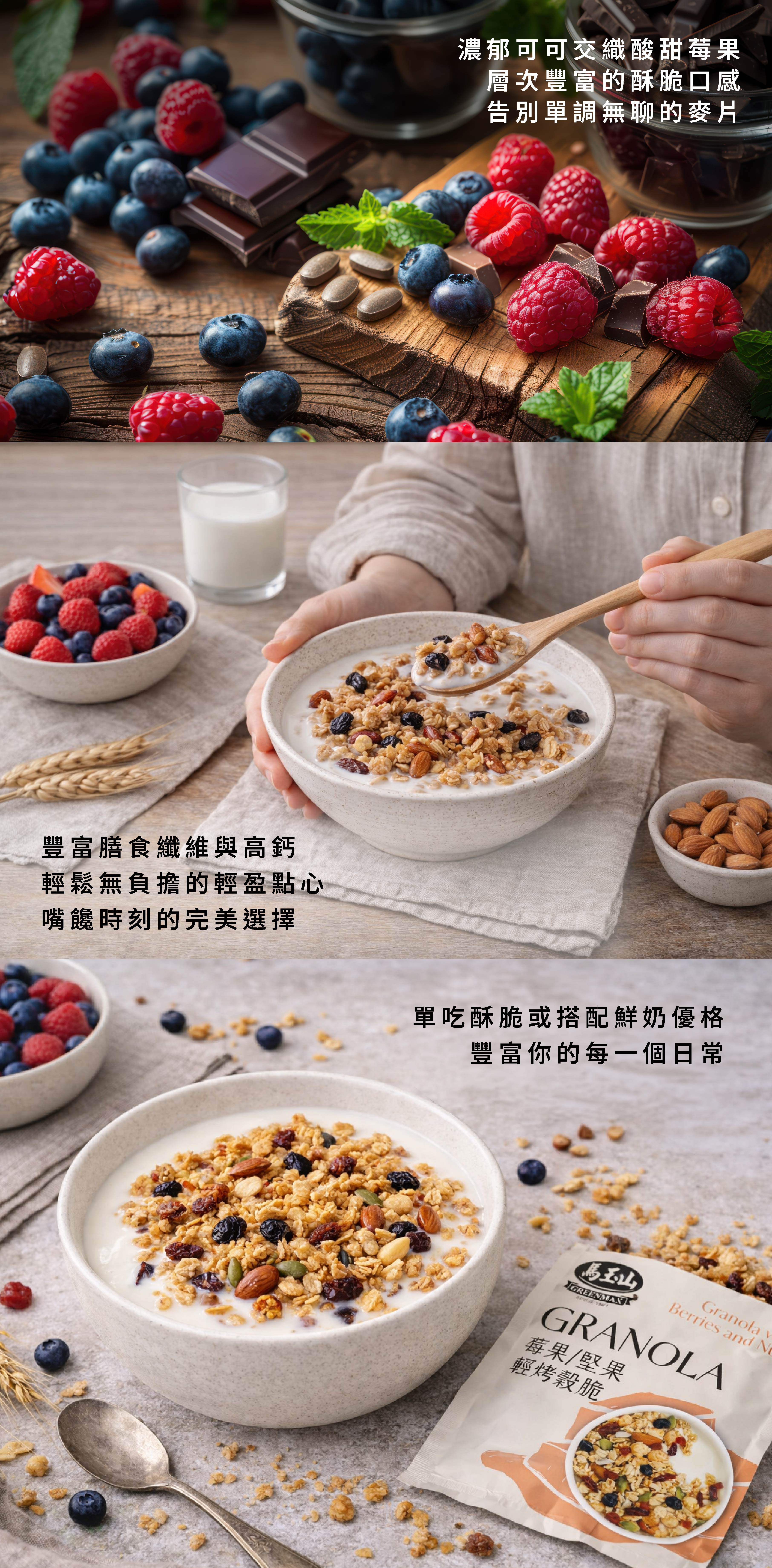 燕麥,綜合莓果(無籽葡萄乾(無籽葡萄,葵花油),蔓越莓乾(蔓越莓,砂糖,葵花油),藍莓乾(藍莓,砂糖,葵花油),凍乾草莓(草莓,砂糖)),砂糖,綜合穀物粒(玉米粉(非基因改造),小麥粉,米穀粉,高粱粉,玉米澱粉,小麥纖維,黑糯米粉,鹽),芥花油,可可粉,杏仁果,葵花籽仁,香料(麥芽糊精,香料),燕麥纖維,碳酸鈣,抗氧化劑(混合濃縮生育醇(含大豆油))。