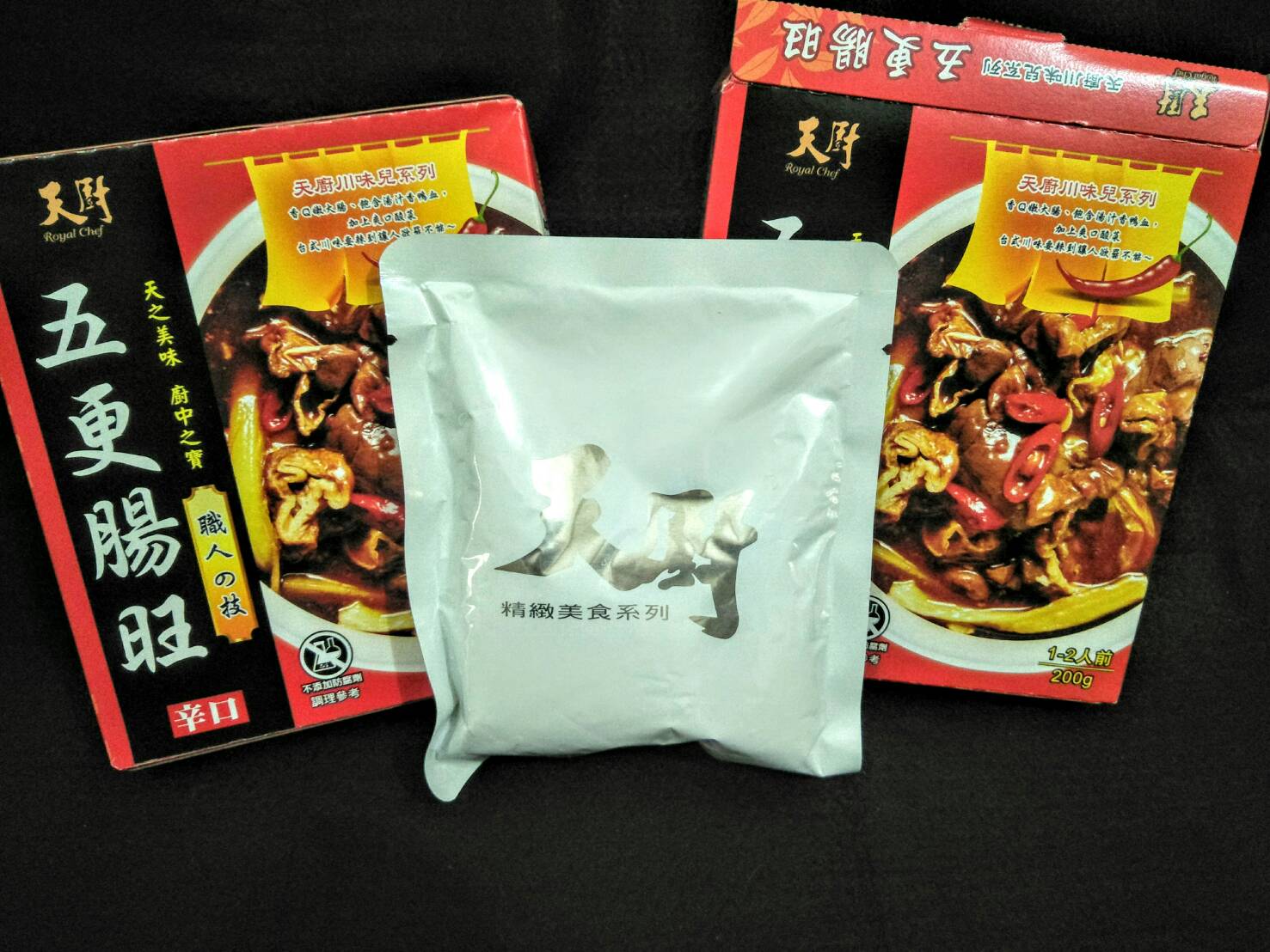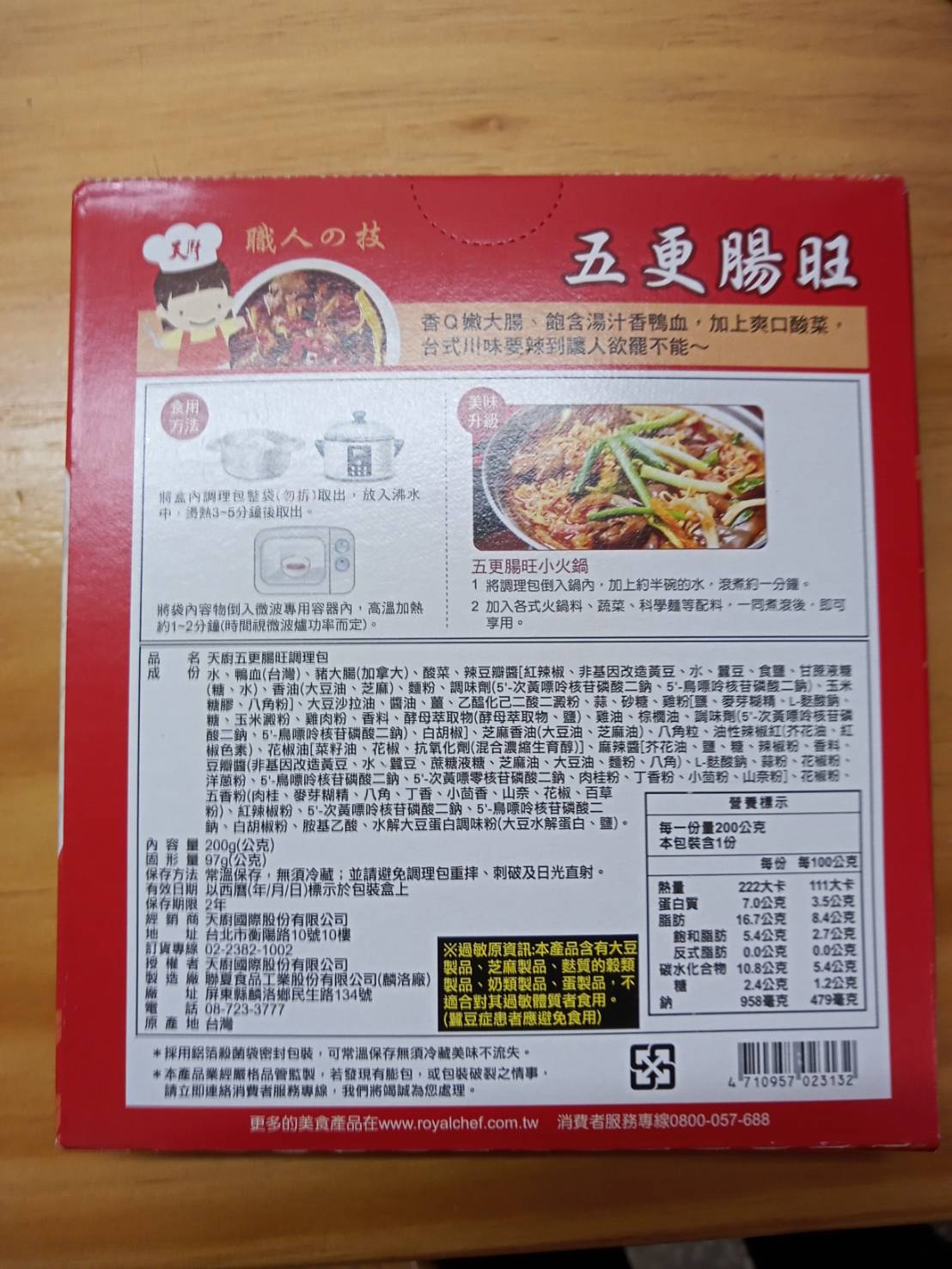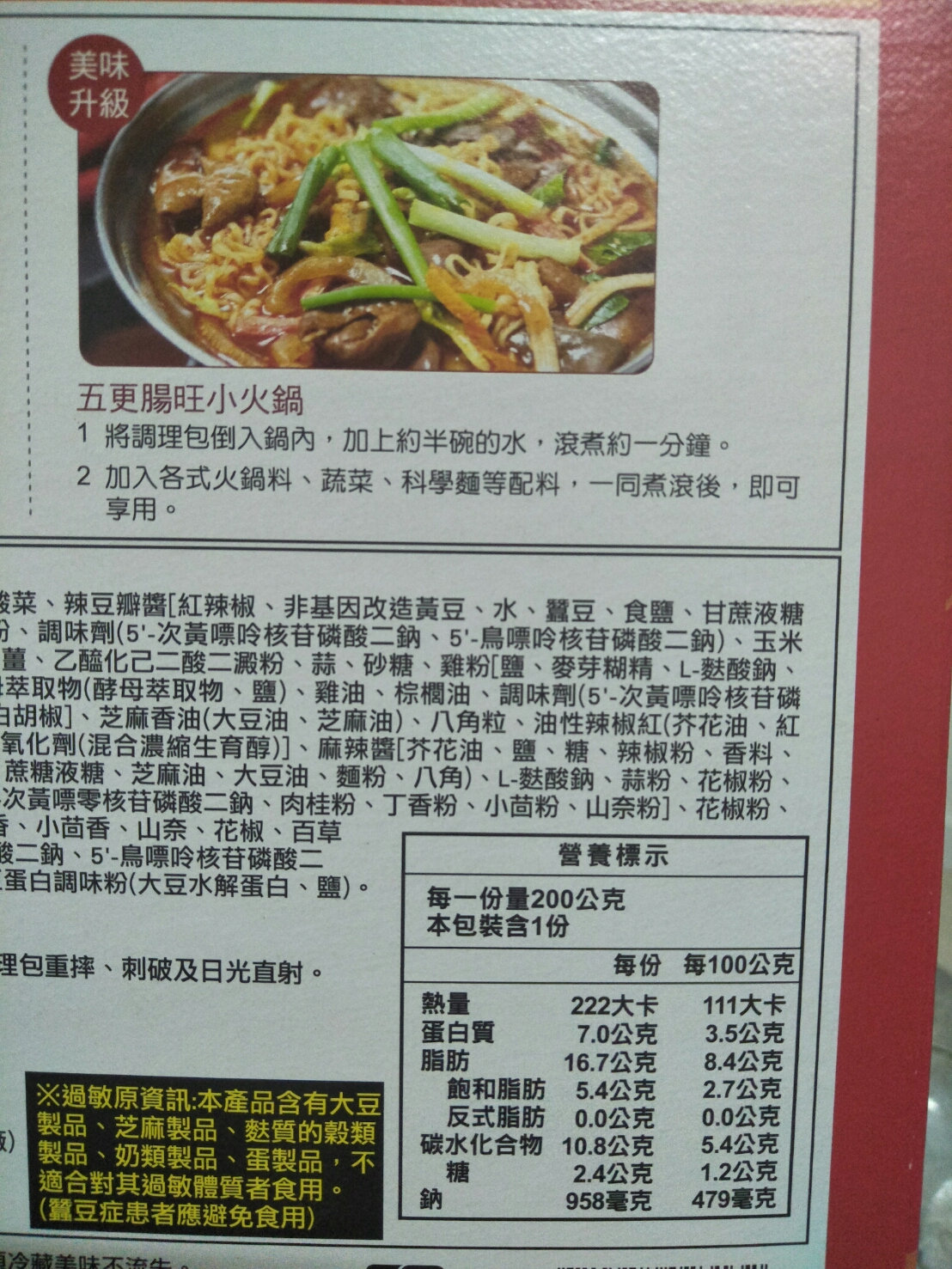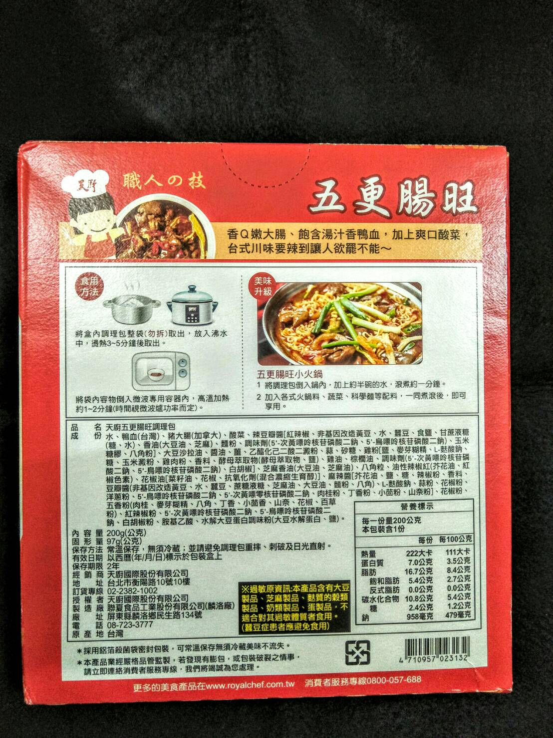 水、鴨血、豬大腸、酸菜、辣豆瓣醬、大豆沙拉油、醬油、薑、蒜、砂糖、雞粉、香油、八角粒、油性辣椒紅、花椒精油、麻辣肉精膏、花椒粉、五香粉、紅辣椒粉、白胡椒粉、水解大豆蛋白調味粉。
