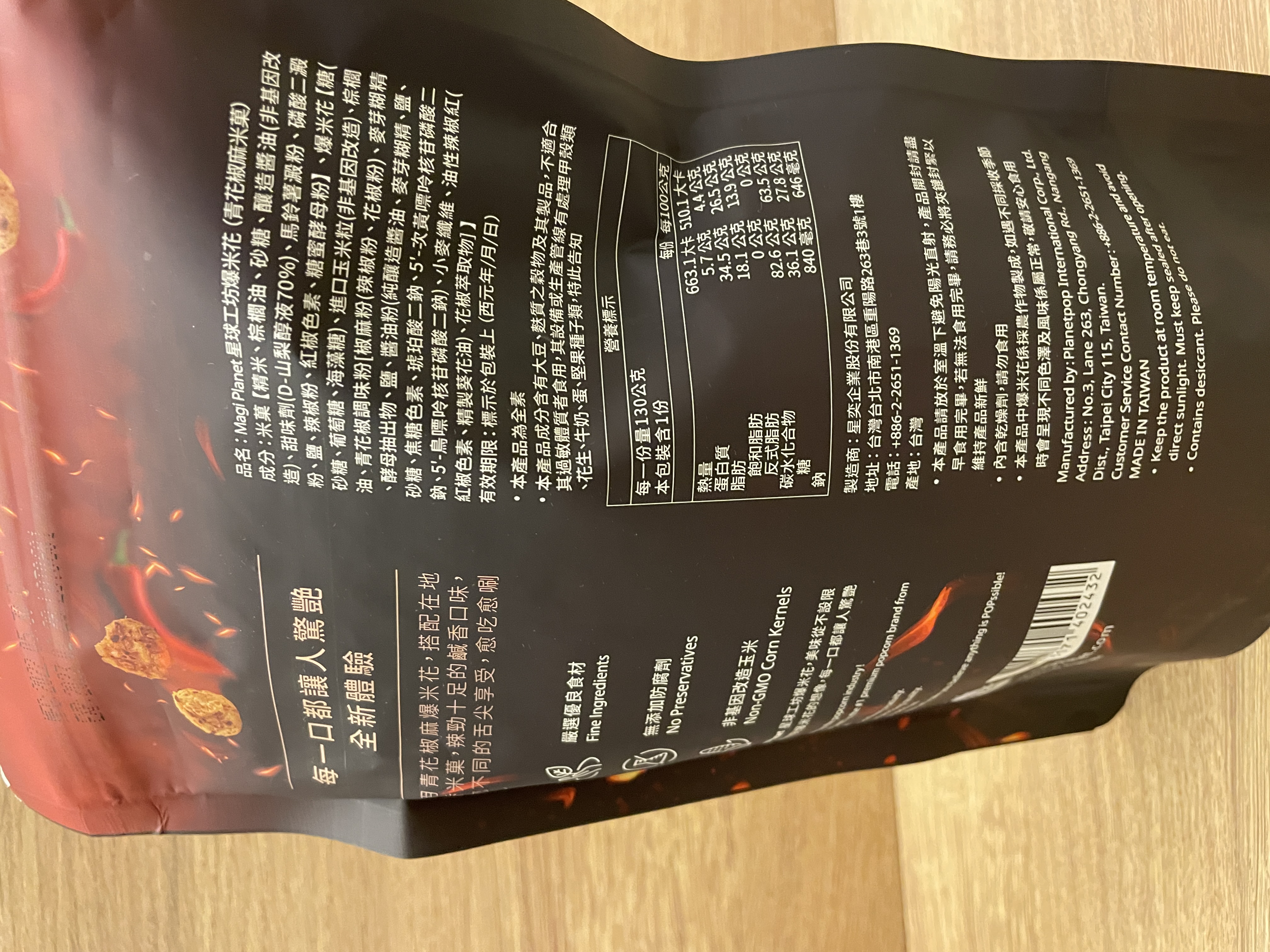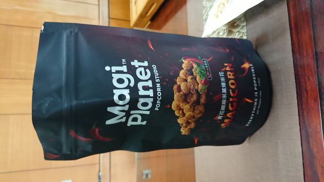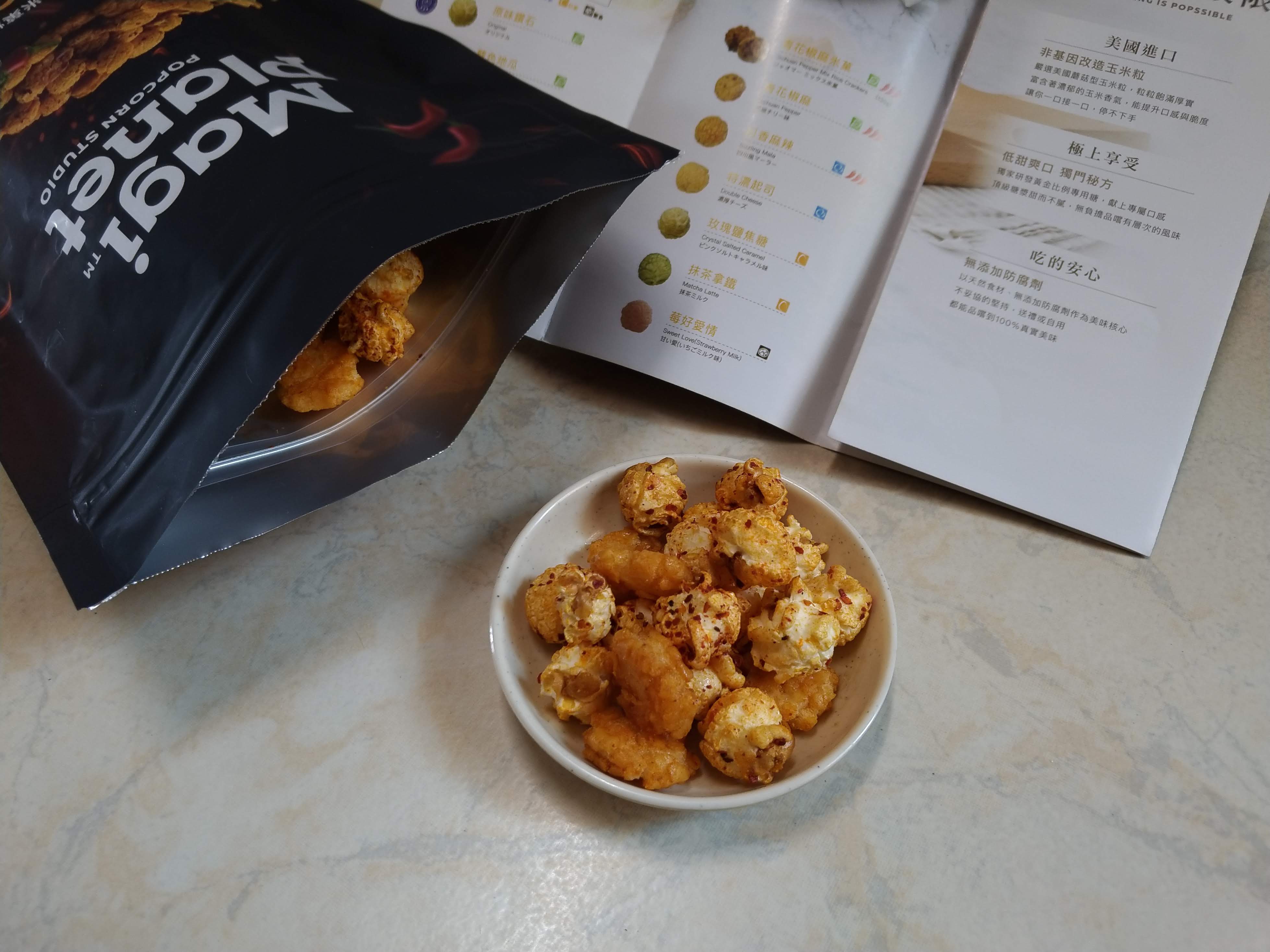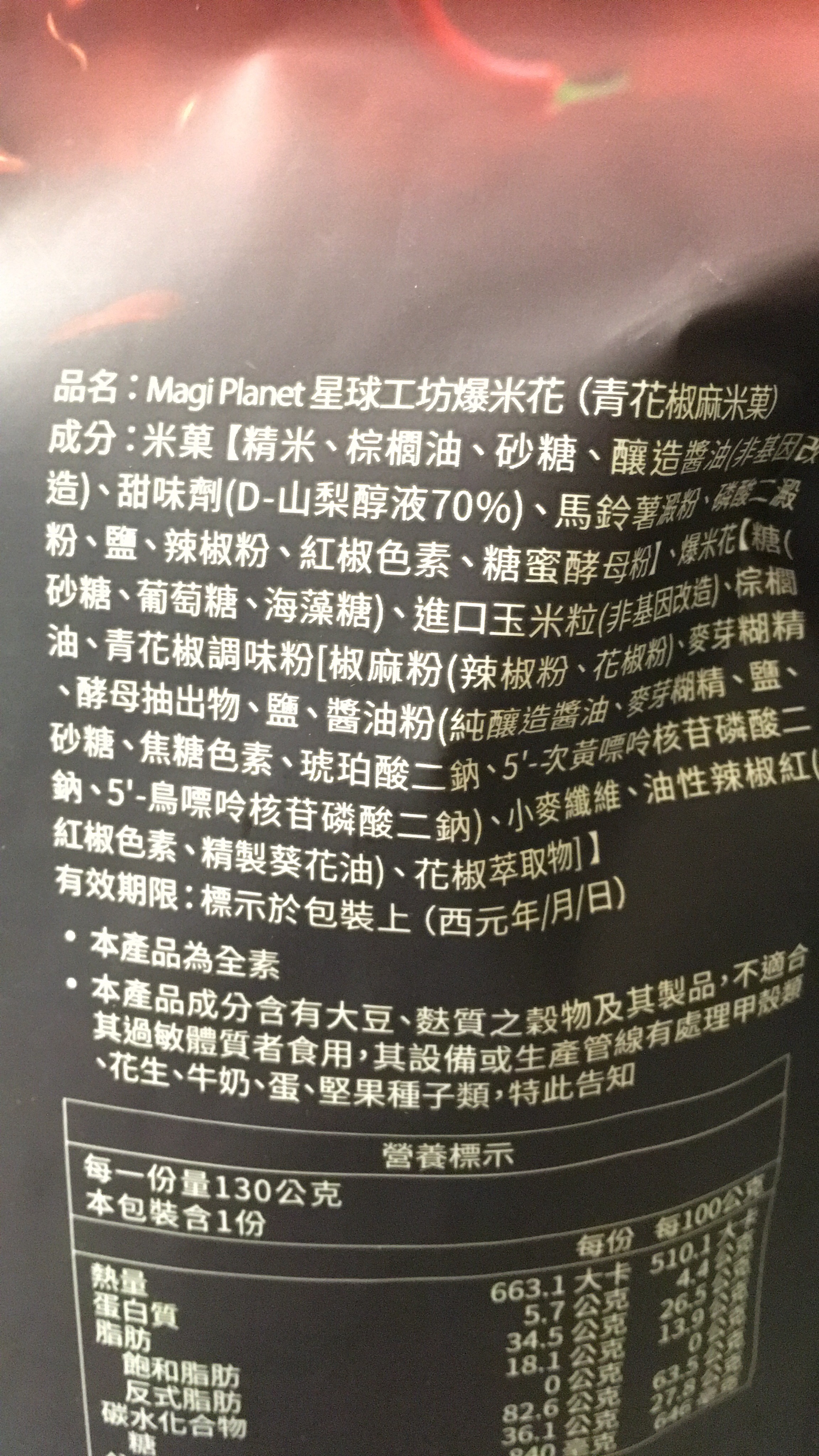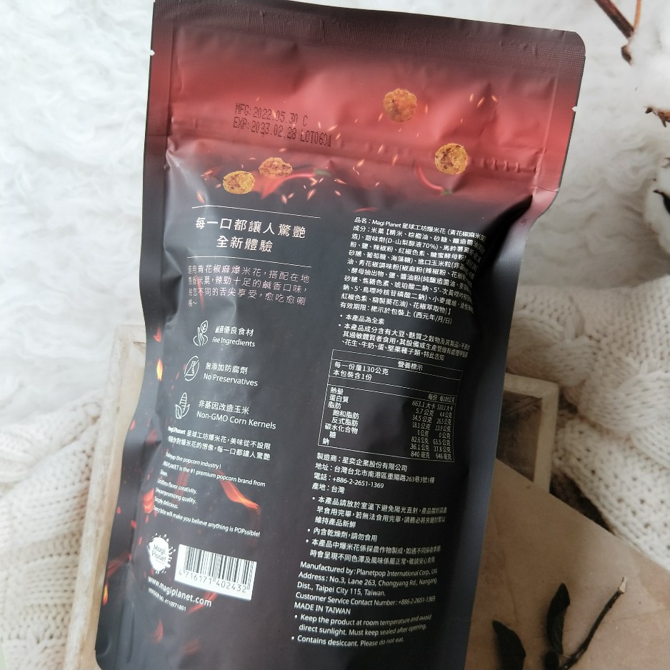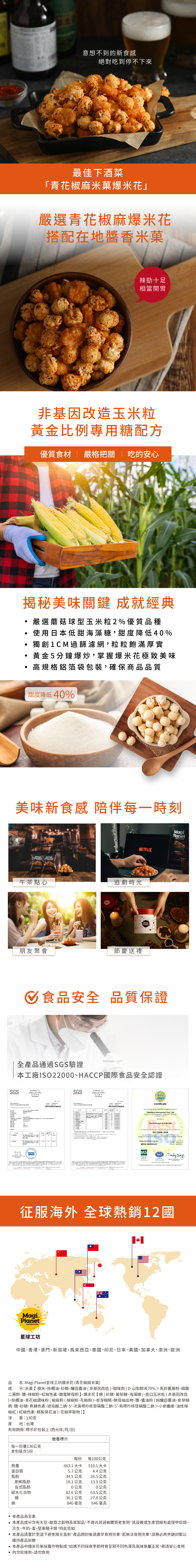 爆米花【 糖 ( 砂糖、葡萄糖、海藻糖)、進口玉米粒( 非基因改造)、棕櫚油、青花椒調味粉[ 椒麻粉( 辣椒粉、花椒粉)、麥芽糊精、酵母抽出物、鹽、醬油粉( 純釀造醬油、麥芽糊精、鹽、砂糖、焦糖色素、琥珀酸二鈉、5'-次黃嘌呤核苷磷酸二鈉、5'-鳥嘌呤核苷磷酸二鈉)、小麥纖維、油性辣椒紅( 紅椒色素、精製葵花油)、花椒萃取物]】