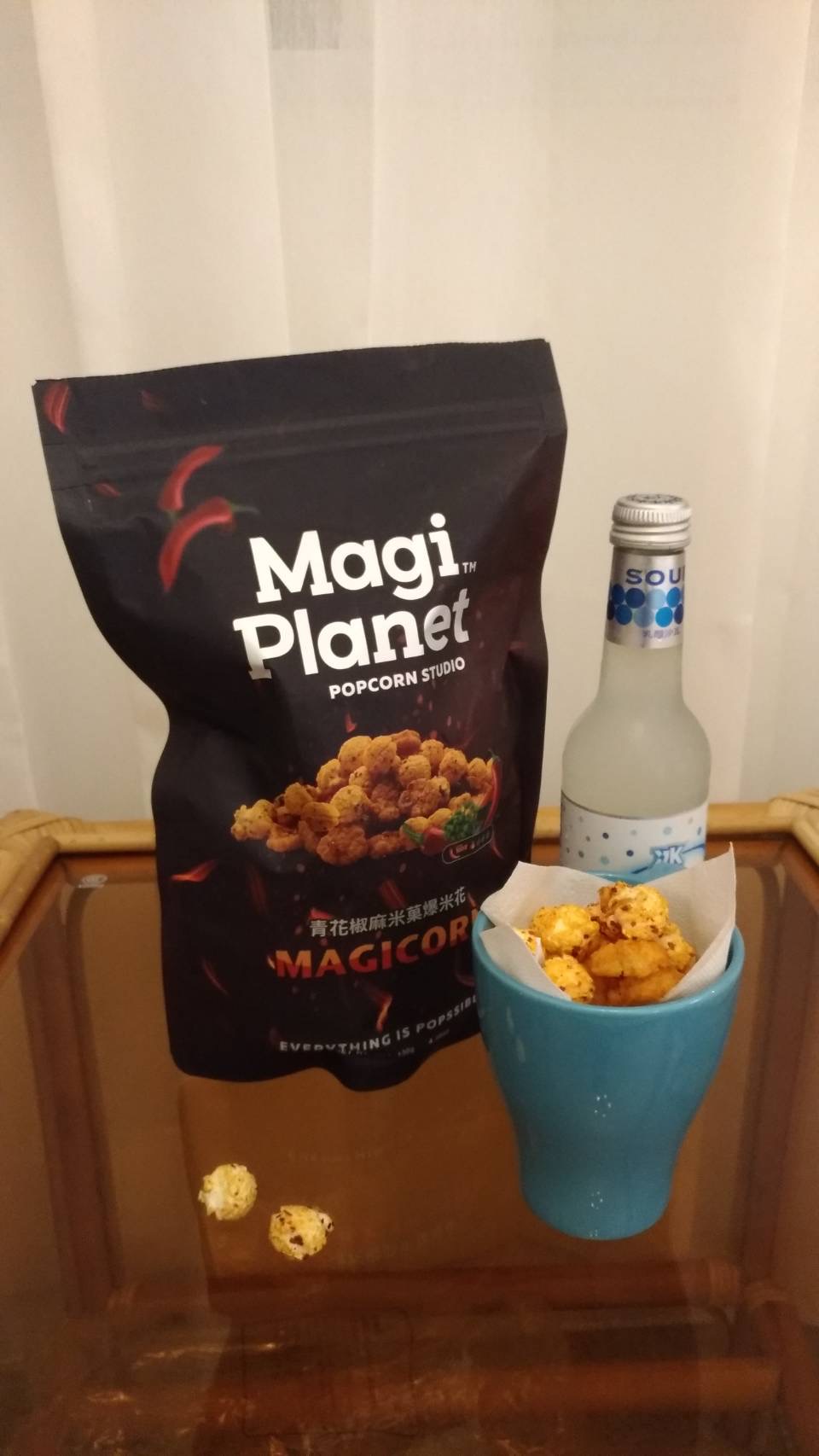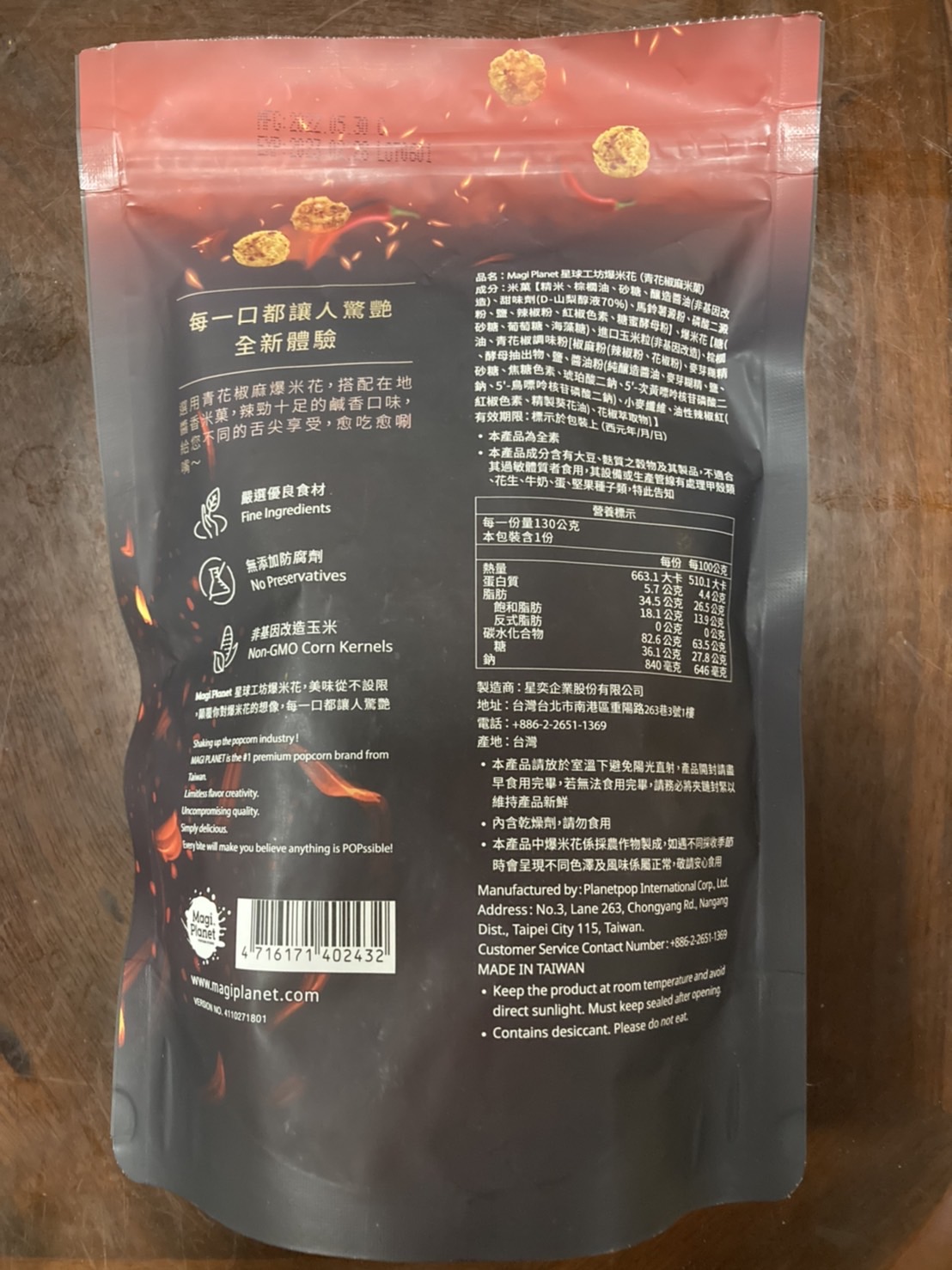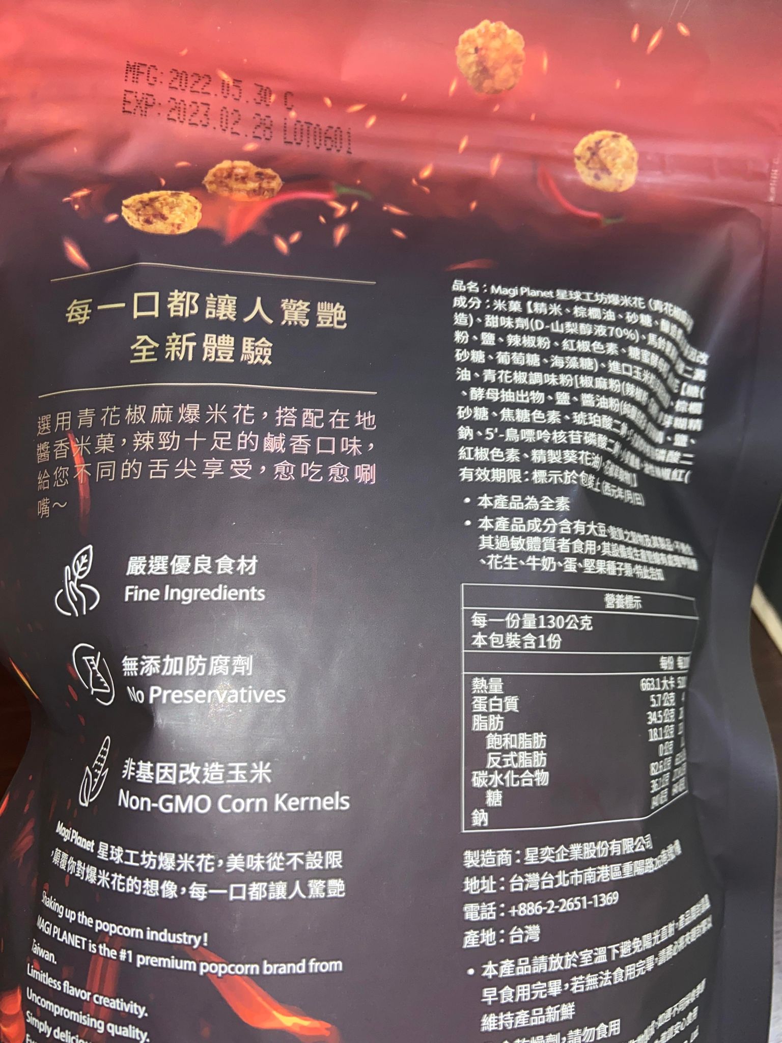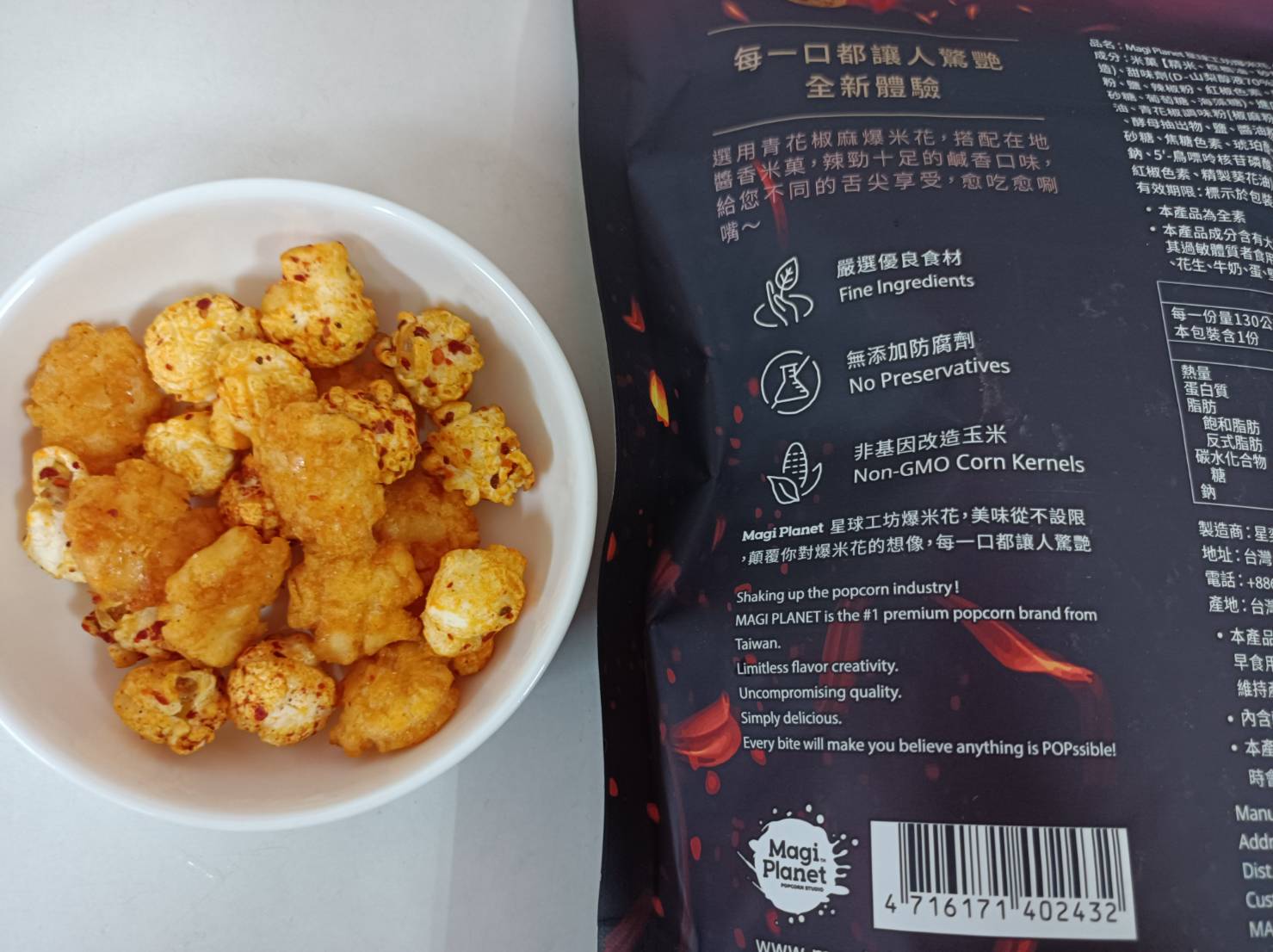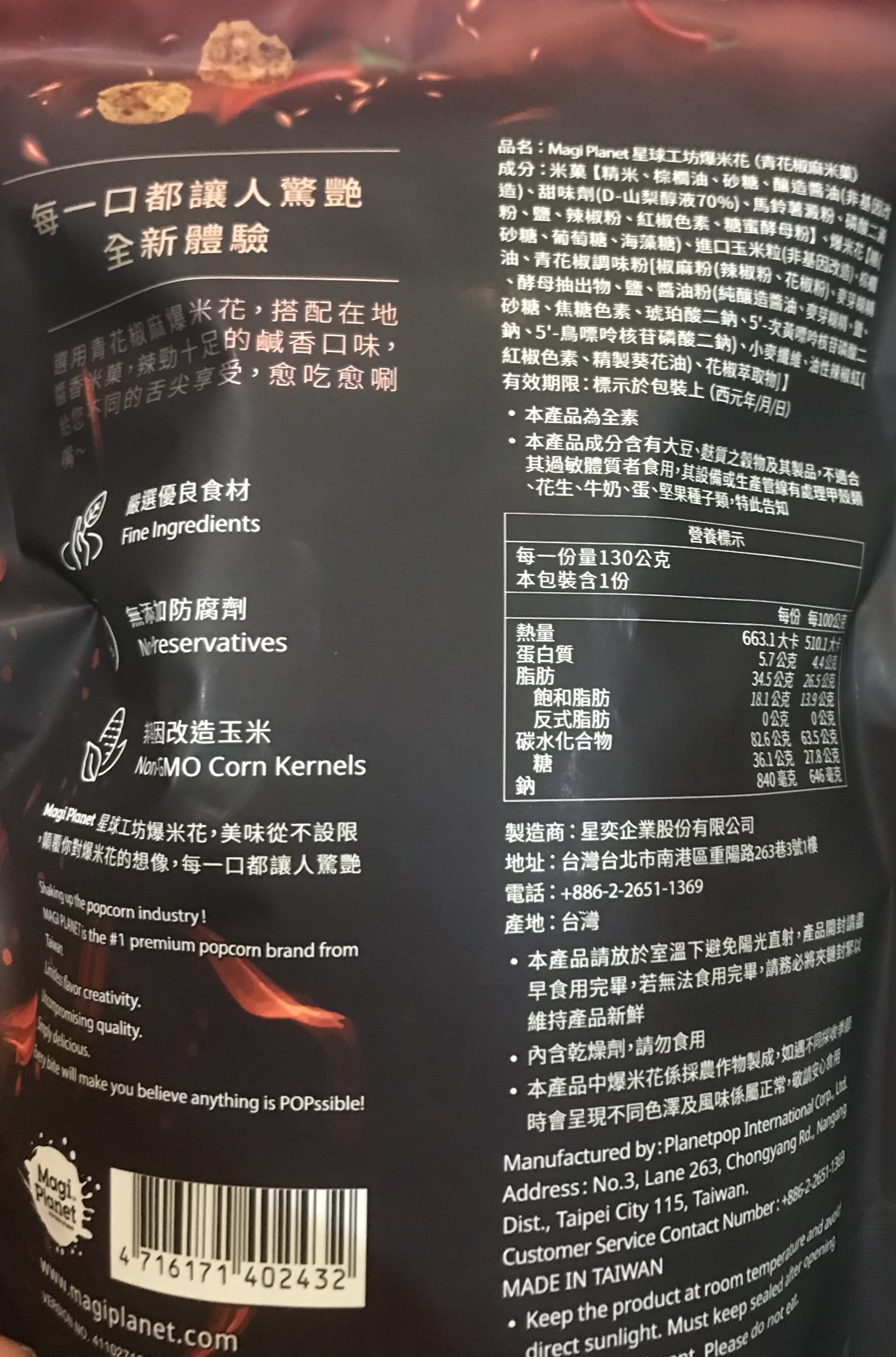 爆米花【 糖 ( 砂糖、葡萄糖、海藻糖)、進口玉米粒( 非基因改造)、棕櫚油、青花椒調味粉[ 椒麻粉( 辣椒粉、花椒粉)、麥芽糊精、酵母抽出物、鹽、醬油粉( 純釀造醬油、麥芽糊精、鹽、砂糖、焦糖色素、琥珀酸二鈉、5'-次黃嘌呤核苷磷酸二鈉、5'-鳥嘌呤核苷磷酸二鈉)、小麥纖維、油性辣椒紅( 紅椒色素、精製葵花油)、花椒萃取物]】