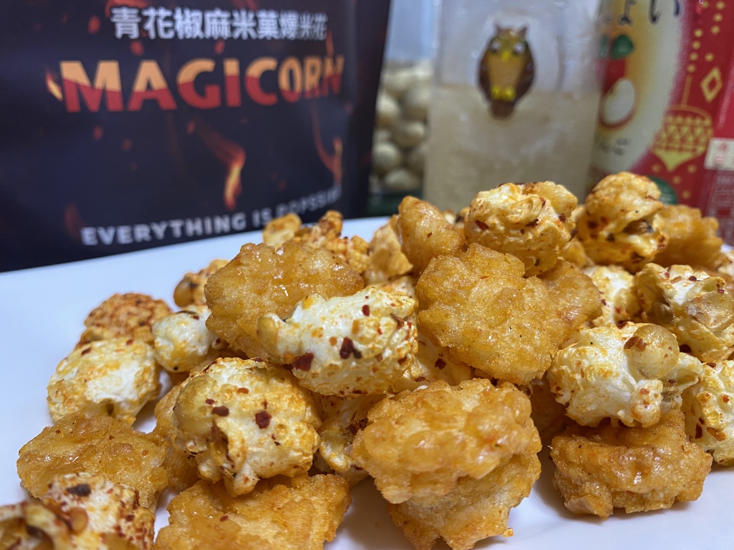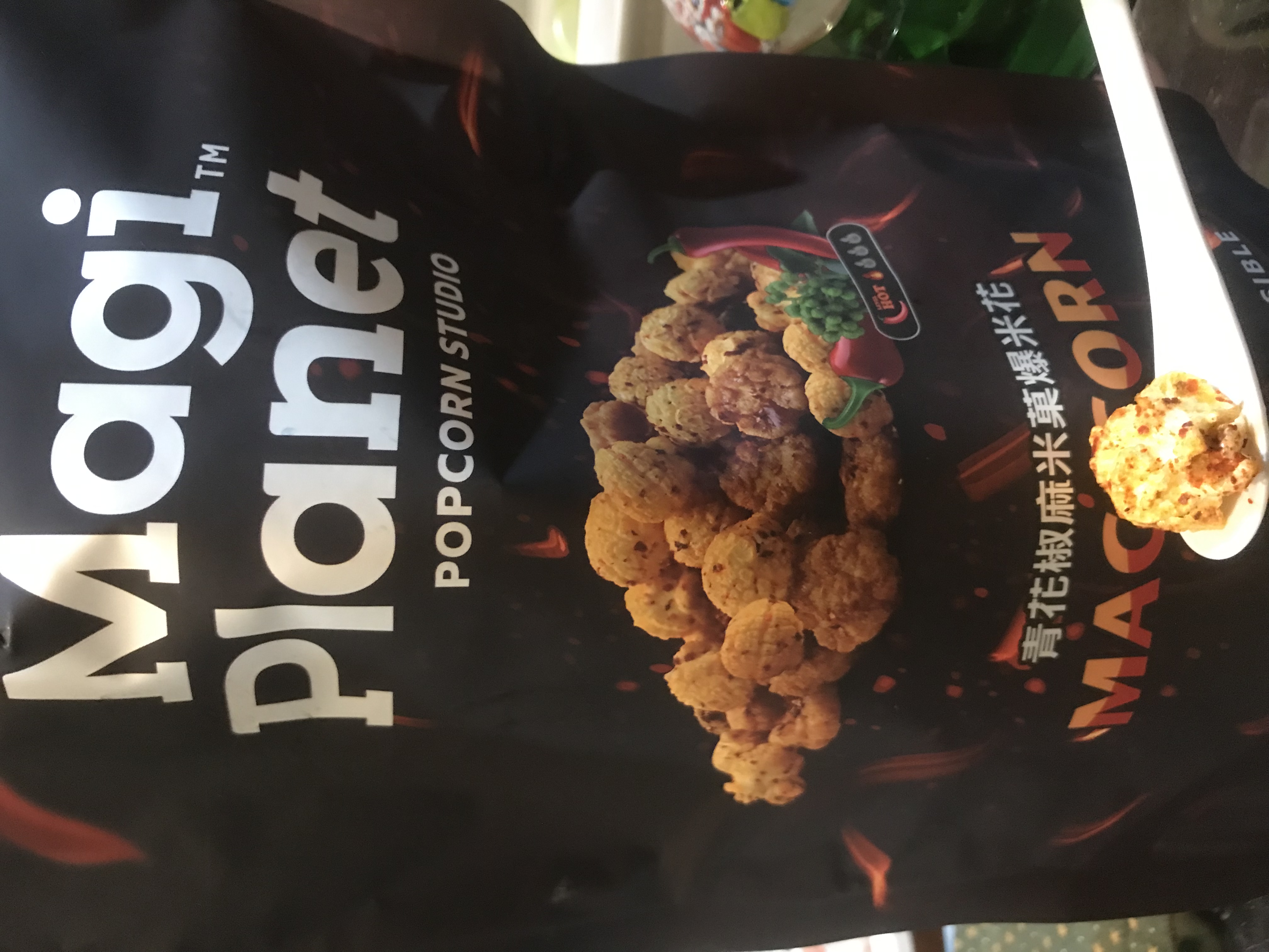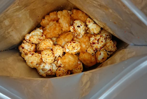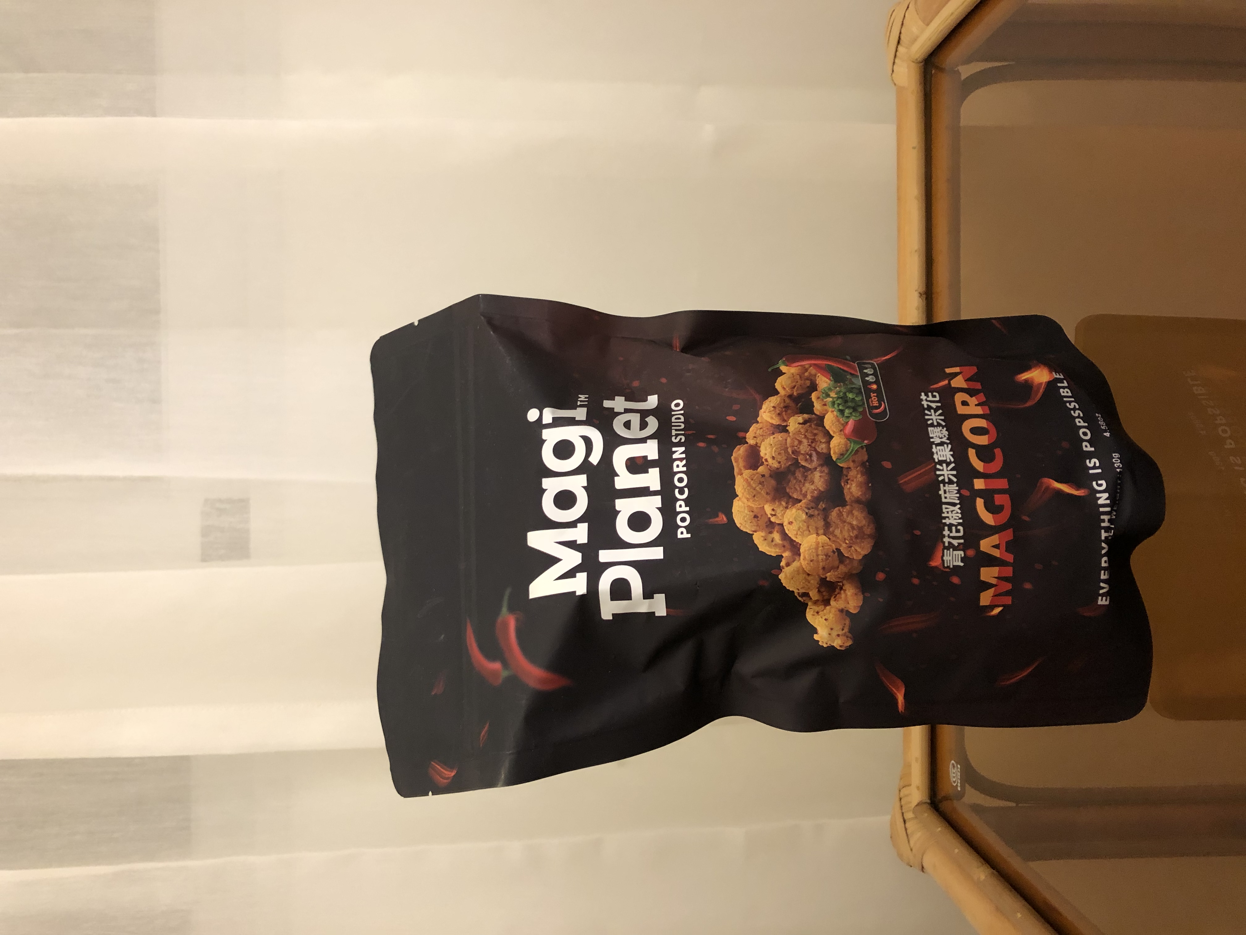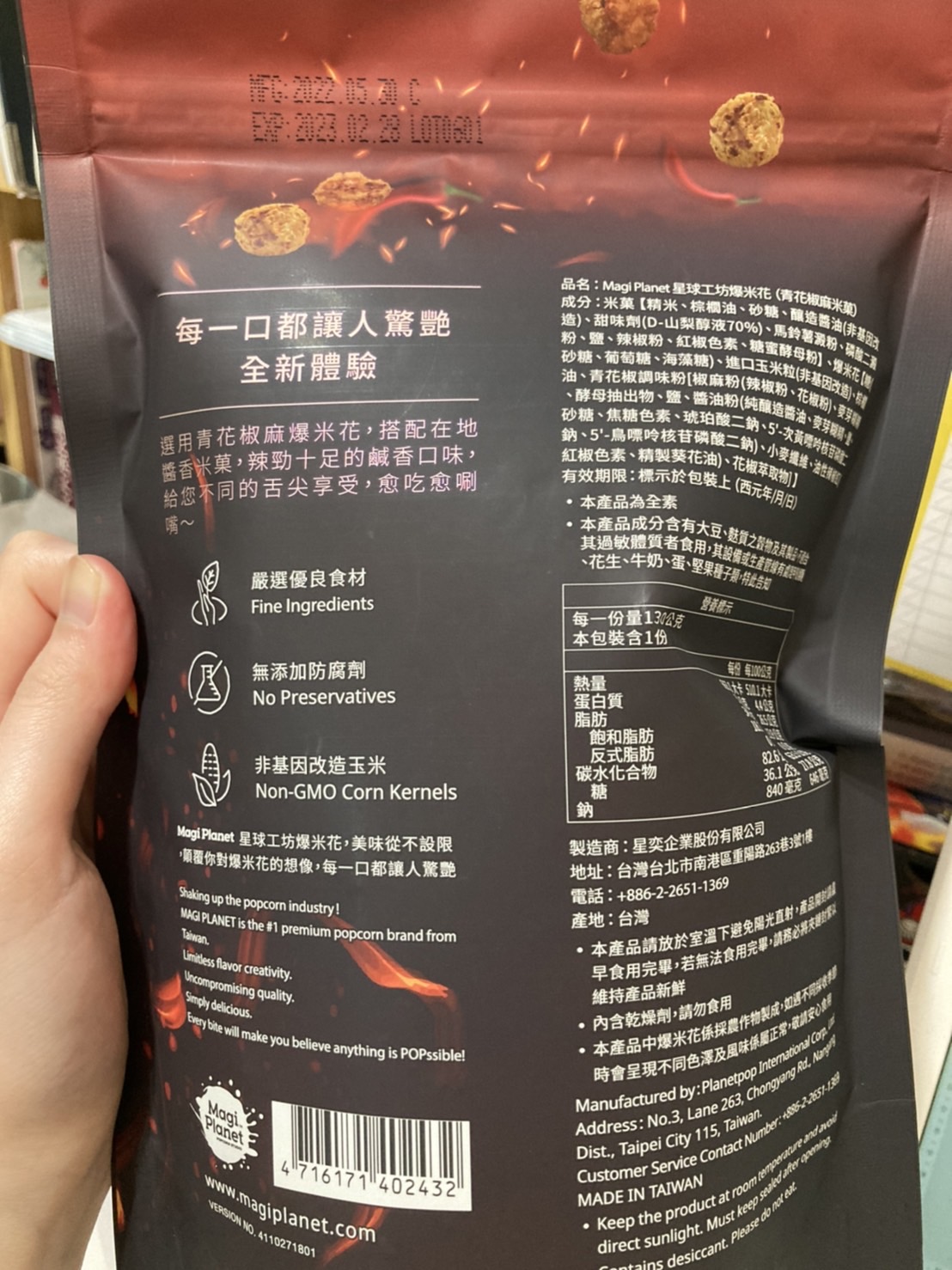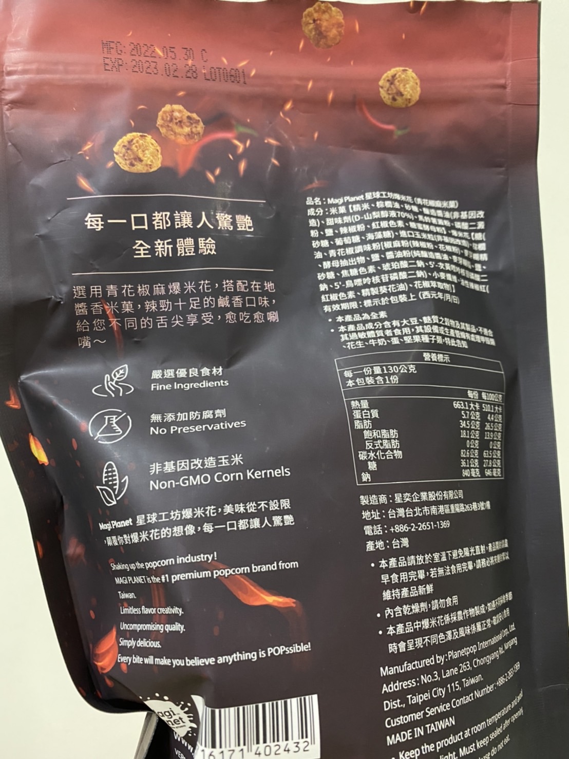 爆米花【 糖 ( 砂糖、葡萄糖、海藻糖)、進口玉米粒( 非基因改造)、棕櫚油、青花椒調味粉[ 椒麻粉( 辣椒粉、花椒粉)、麥芽糊精、酵母抽出物、鹽、醬油粉( 純釀造醬油、麥芽糊精、鹽、砂糖、焦糖色素、琥珀酸二鈉、5'-次黃嘌呤核苷磷酸二鈉、5'-鳥嘌呤核苷磷酸二鈉)、小麥纖維、油性辣椒紅( 紅椒色素、精製葵花油)、花椒萃取物]】