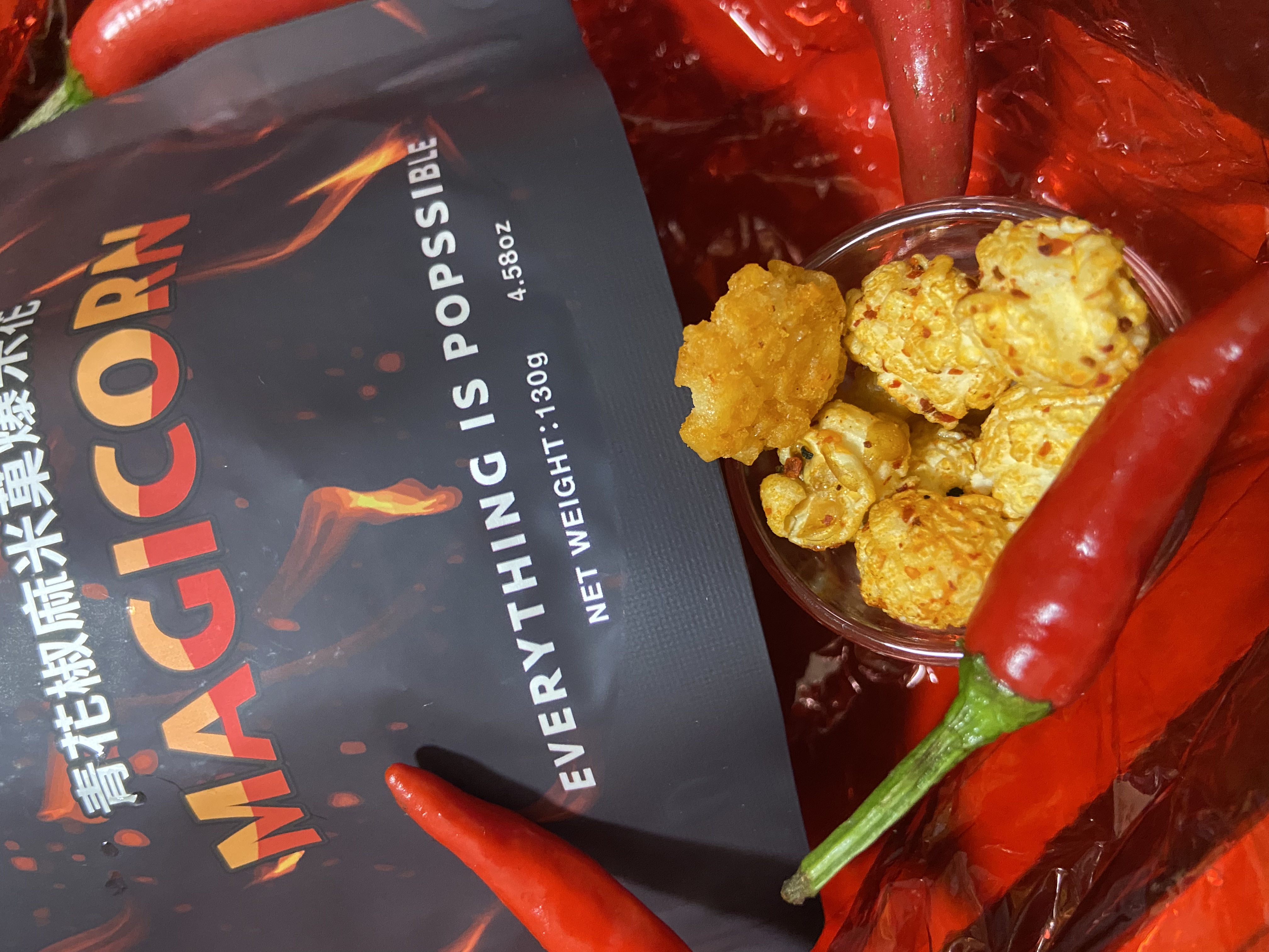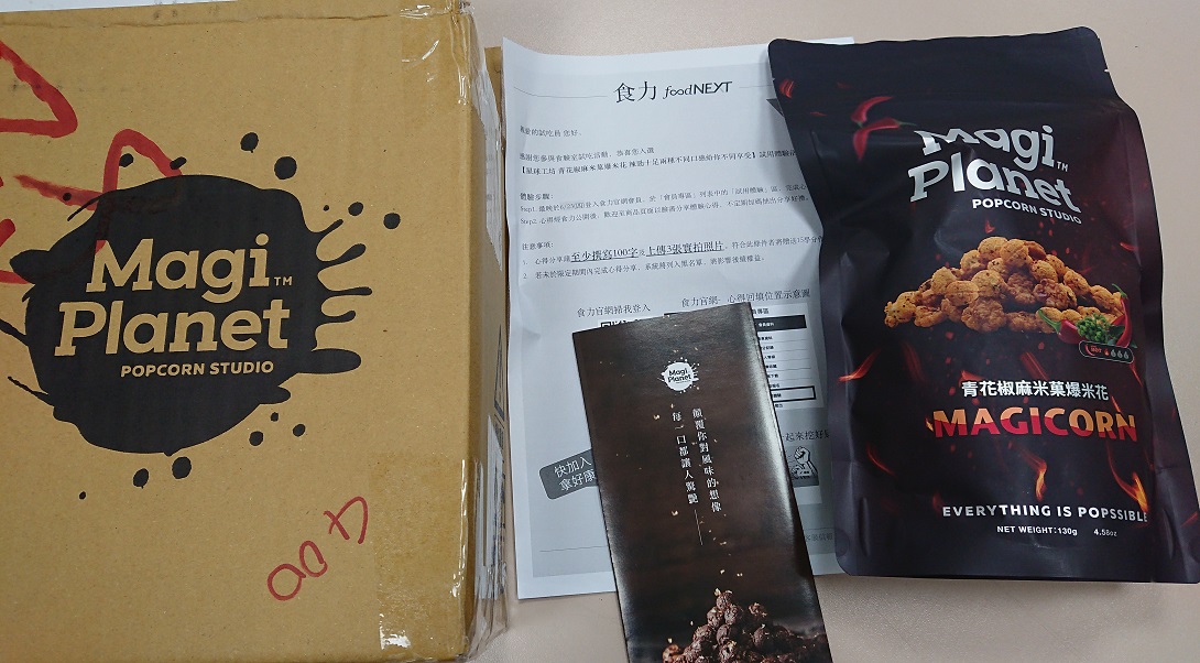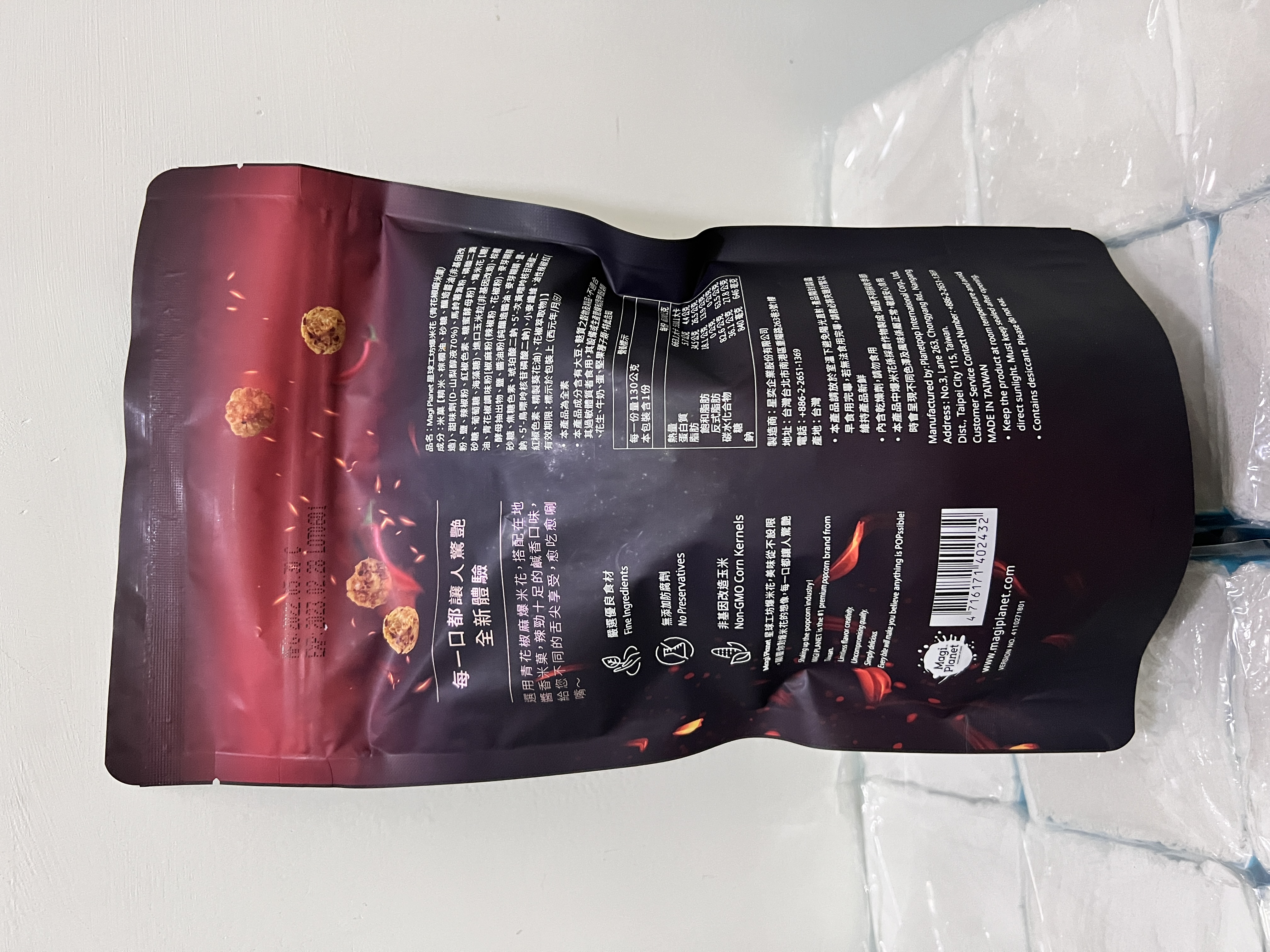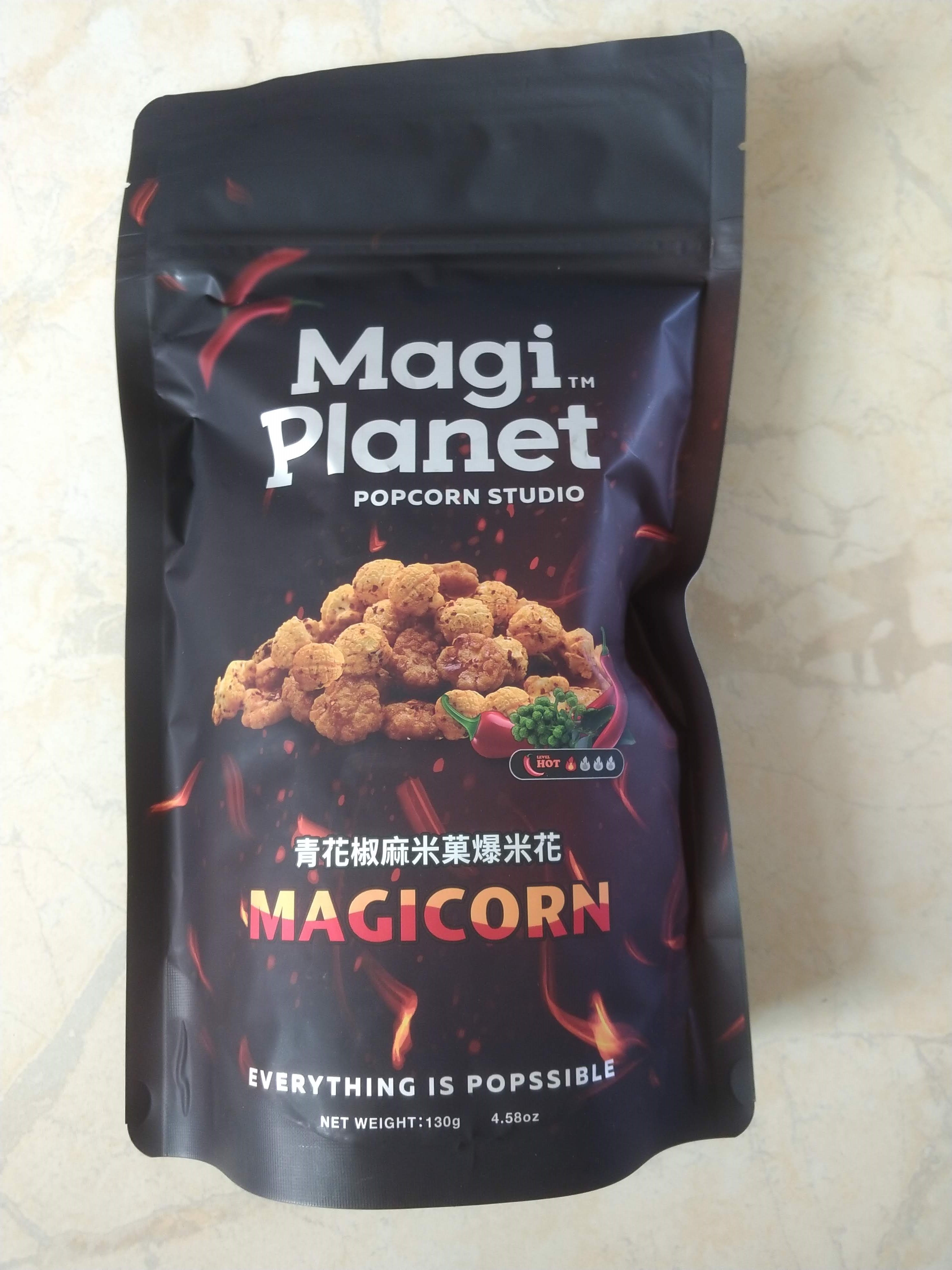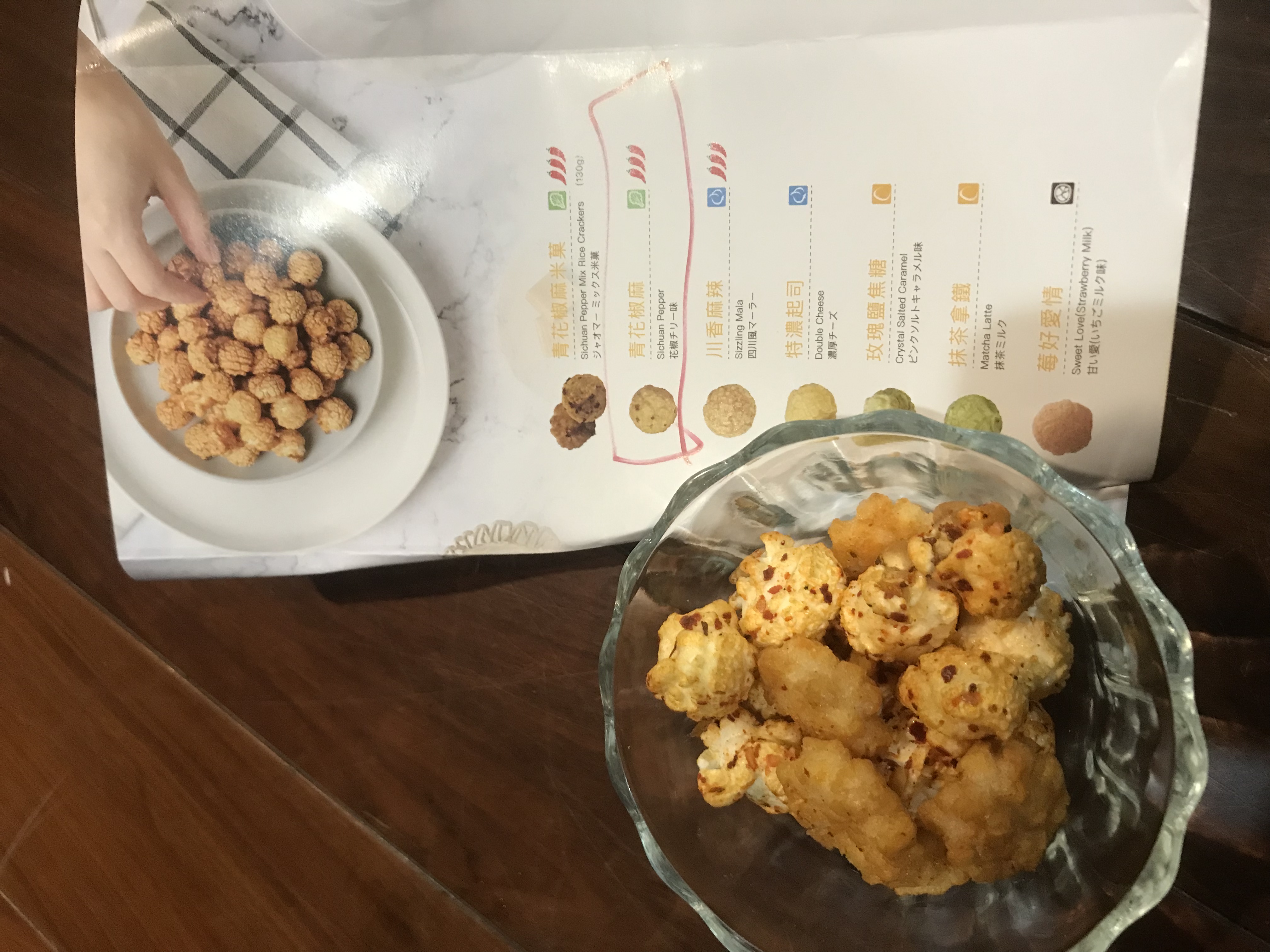 爆米花【 糖 ( 砂糖、葡萄糖、海藻糖)、進口玉米粒( 非基因改造)、棕櫚油、青花椒調味粉[ 椒麻粉( 辣椒粉、花椒粉)、麥芽糊精、酵母抽出物、鹽、醬油粉( 純釀造醬油、麥芽糊精、鹽、砂糖、焦糖色素、琥珀酸二鈉、5'-次黃嘌呤核苷磷酸二鈉、5'-鳥嘌呤核苷磷酸二鈉)、小麥纖維、油性辣椒紅( 紅椒色素、精製葵花油)、花椒萃取物]】