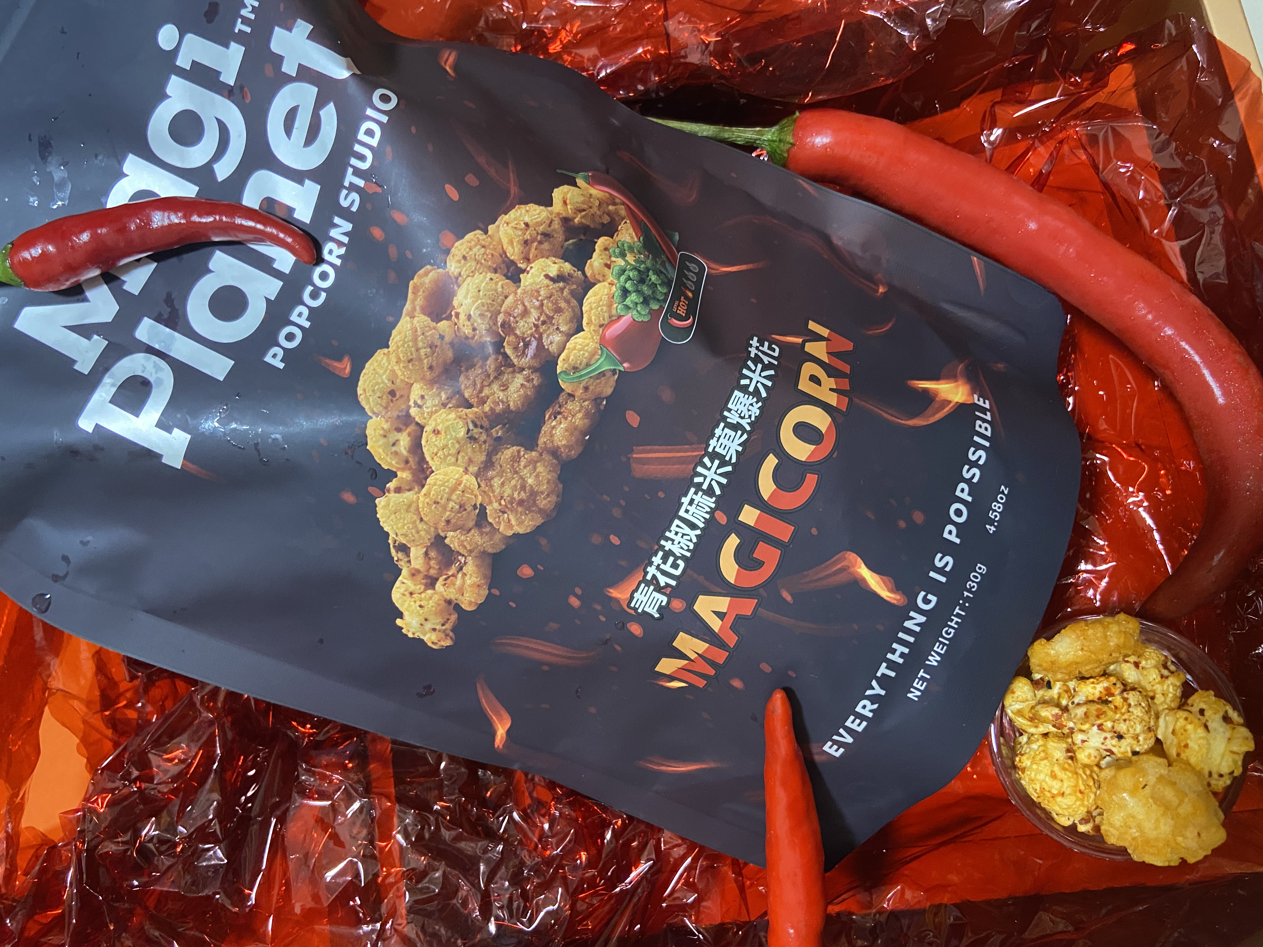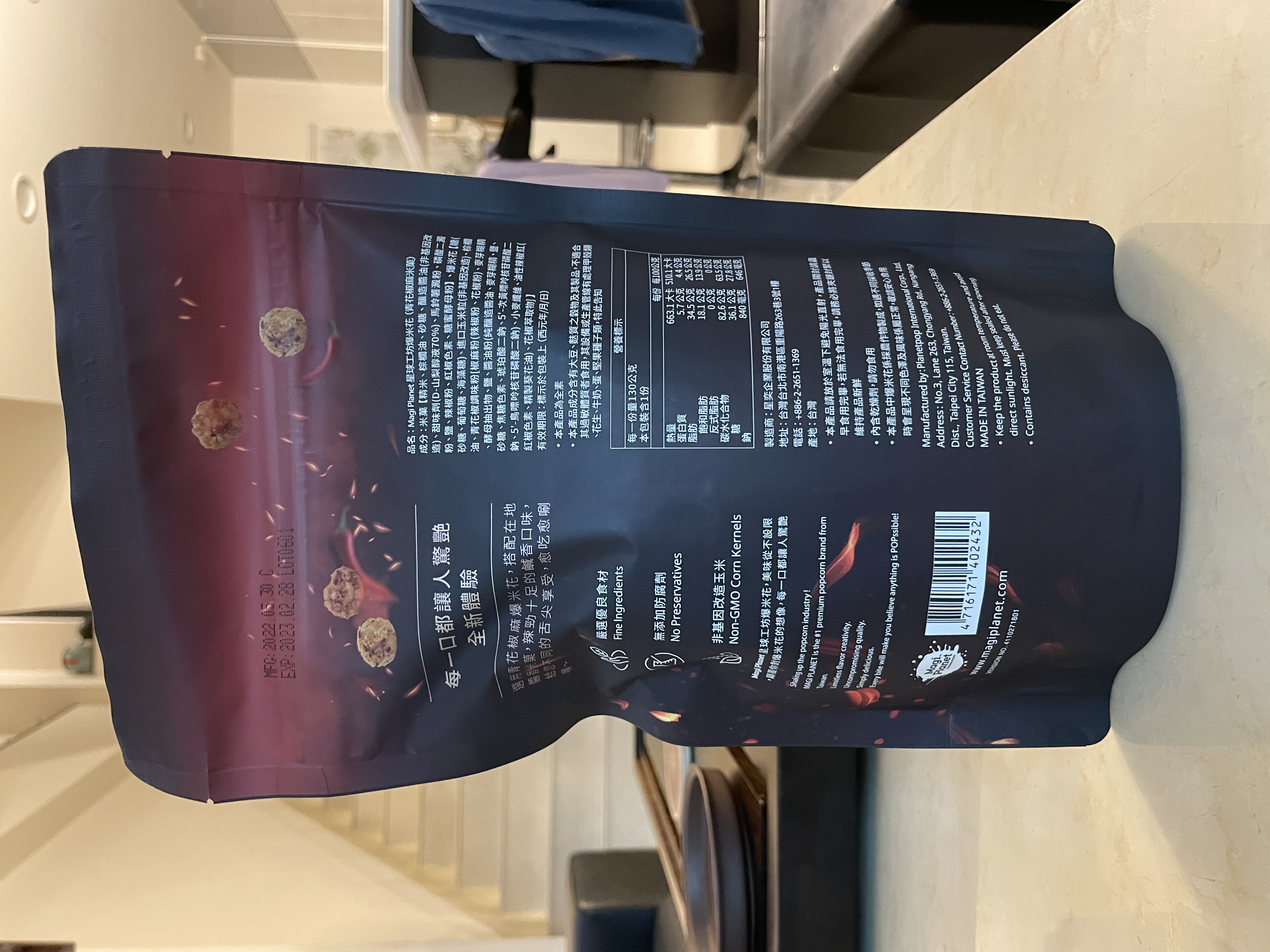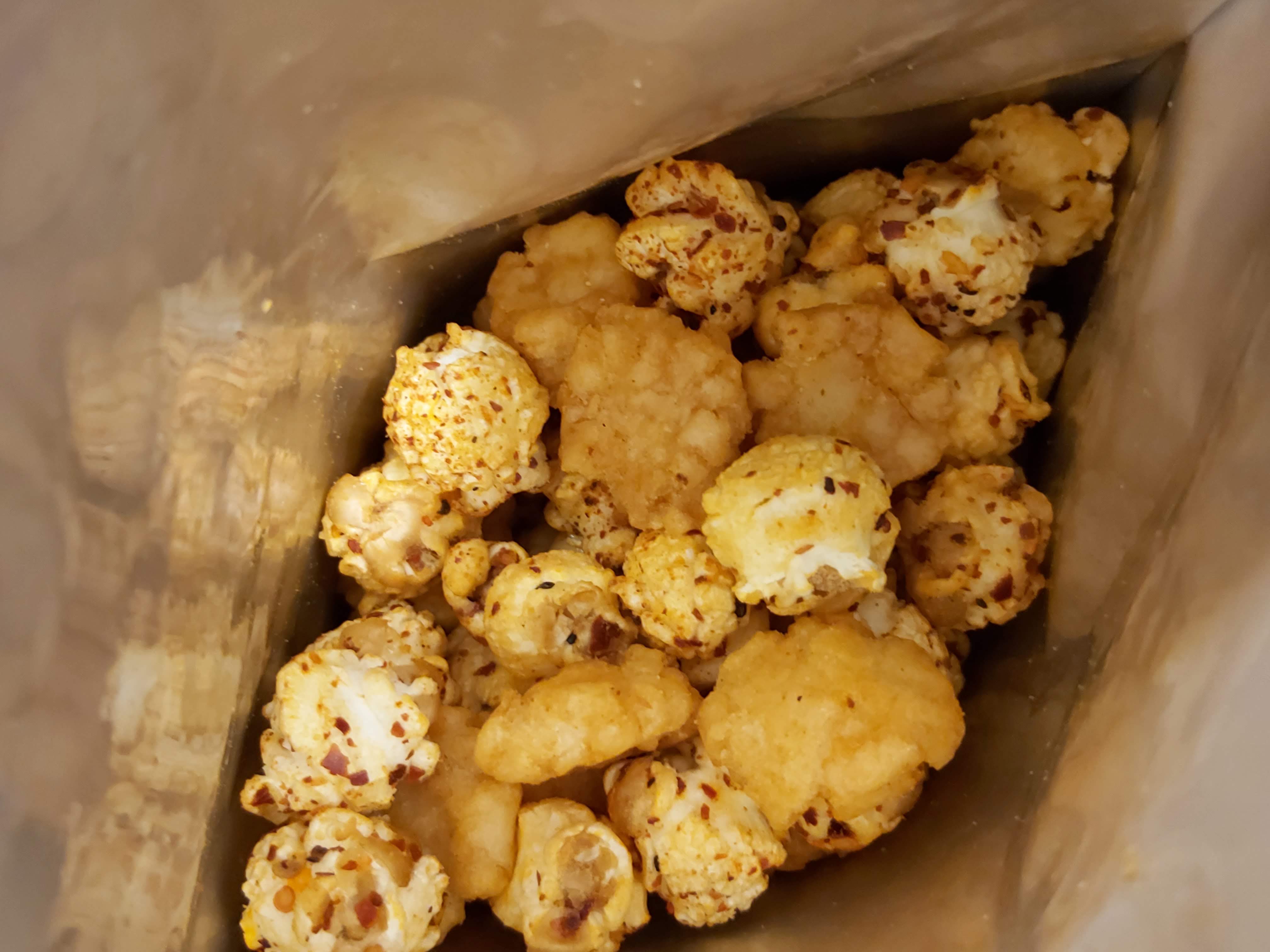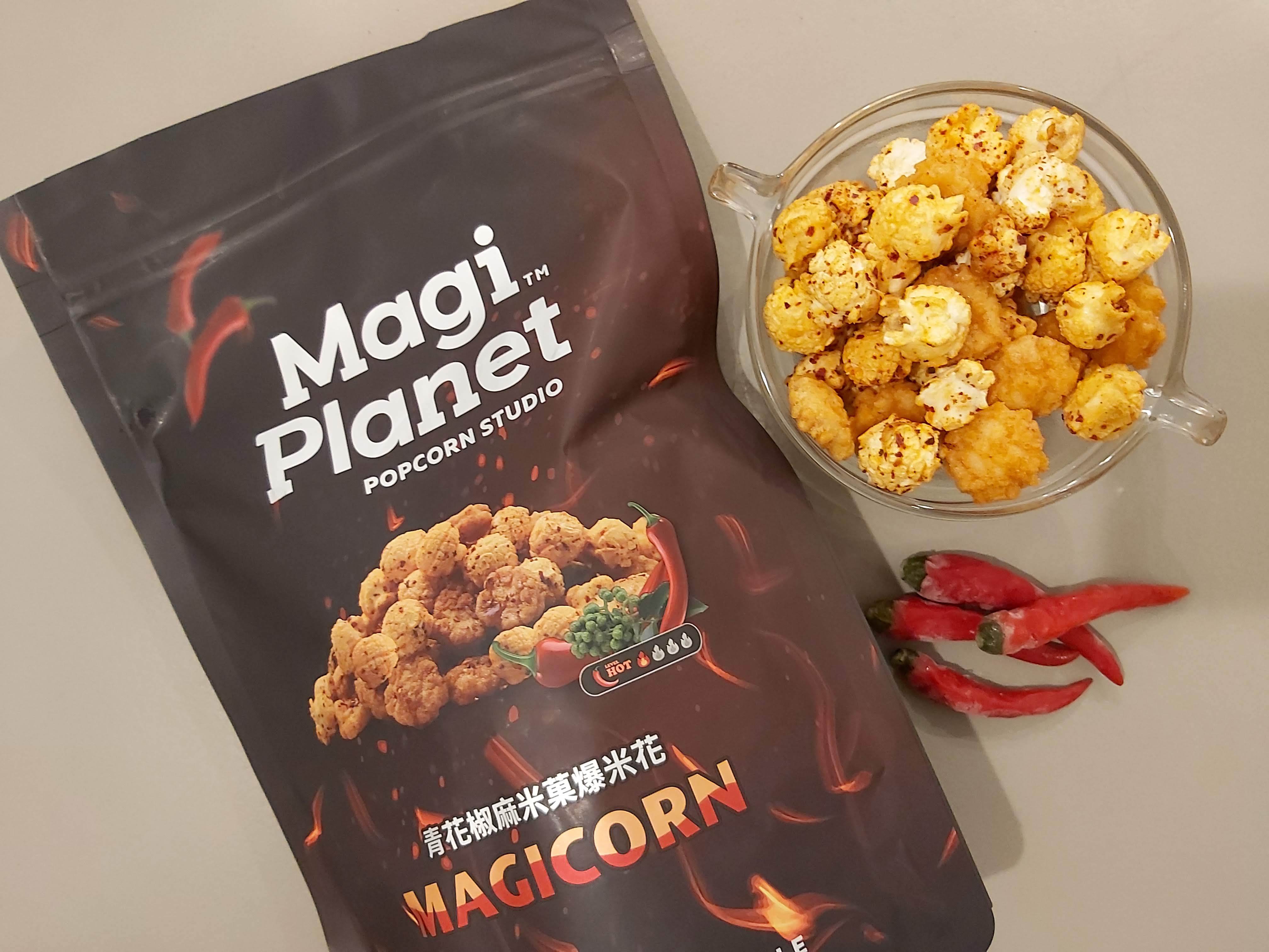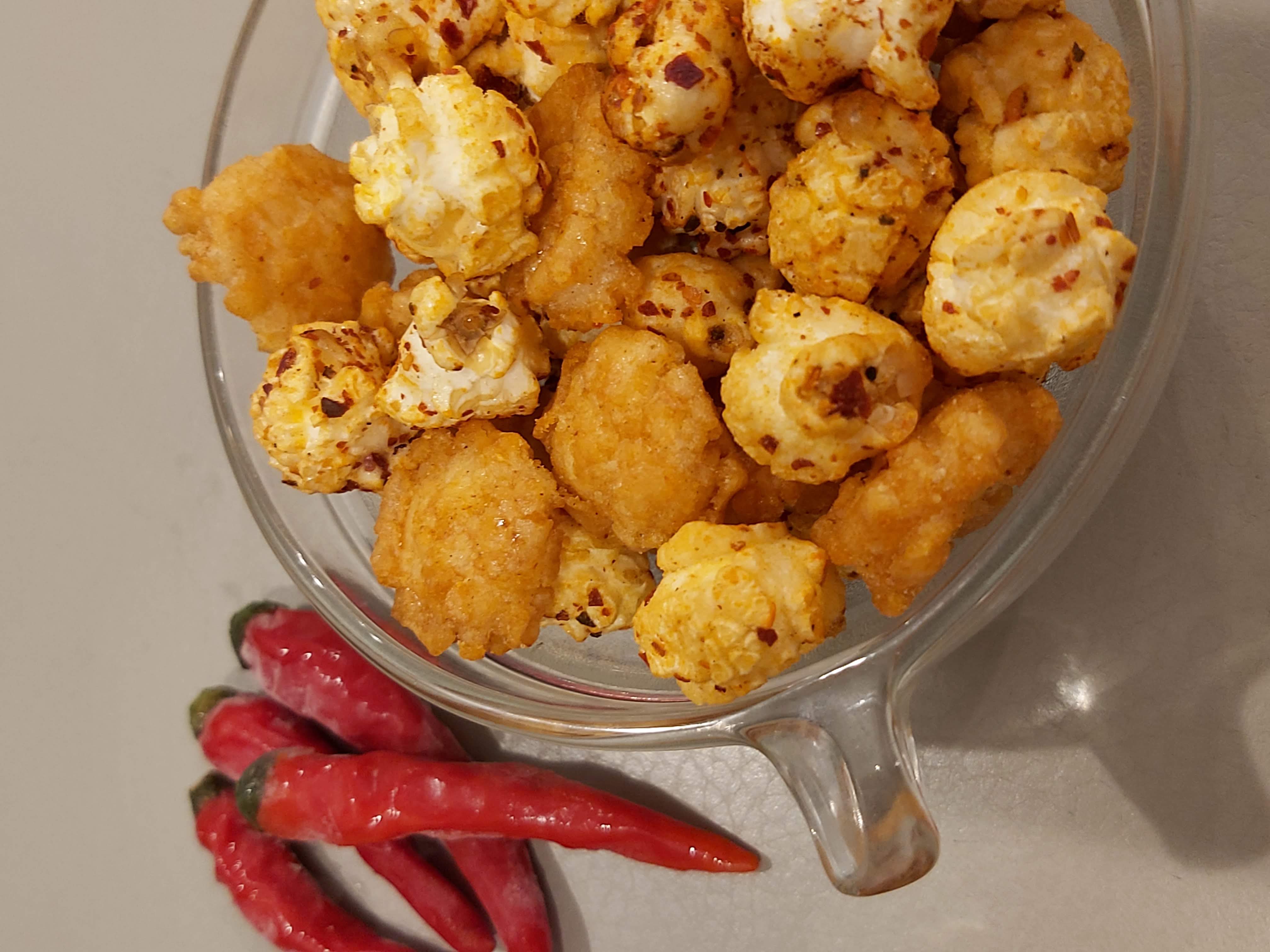 爆米花【 糖 ( 砂糖、葡萄糖、海藻糖)、進口玉米粒( 非基因改造)、棕櫚油、青花椒調味粉[ 椒麻粉( 辣椒粉、花椒粉)、麥芽糊精、酵母抽出物、鹽、醬油粉( 純釀造醬油、麥芽糊精、鹽、砂糖、焦糖色素、琥珀酸二鈉、5'-次黃嘌呤核苷磷酸二鈉、5'-鳥嘌呤核苷磷酸二鈉)、小麥纖維、油性辣椒紅( 紅椒色素、精製葵花油)、花椒萃取物]】