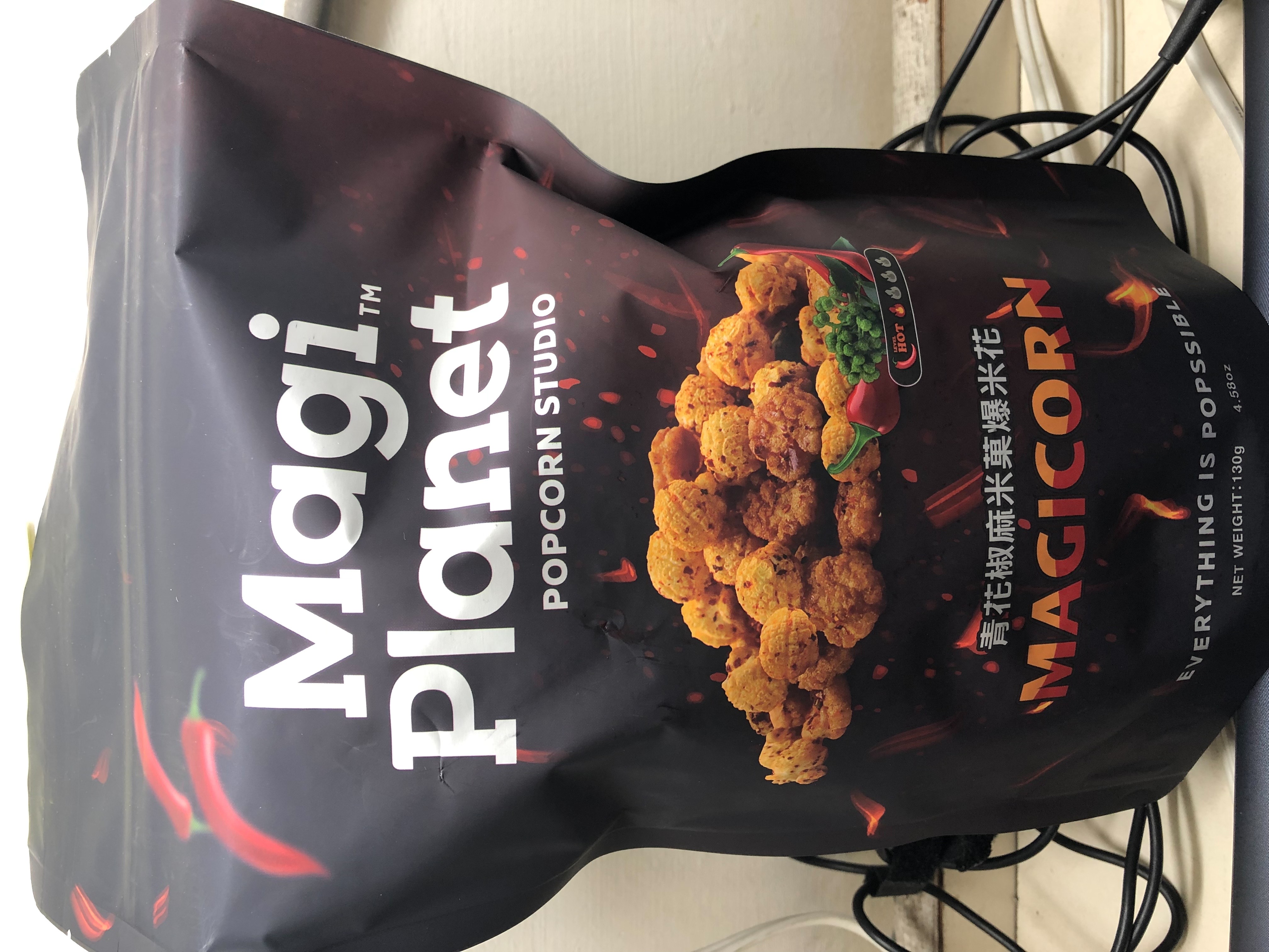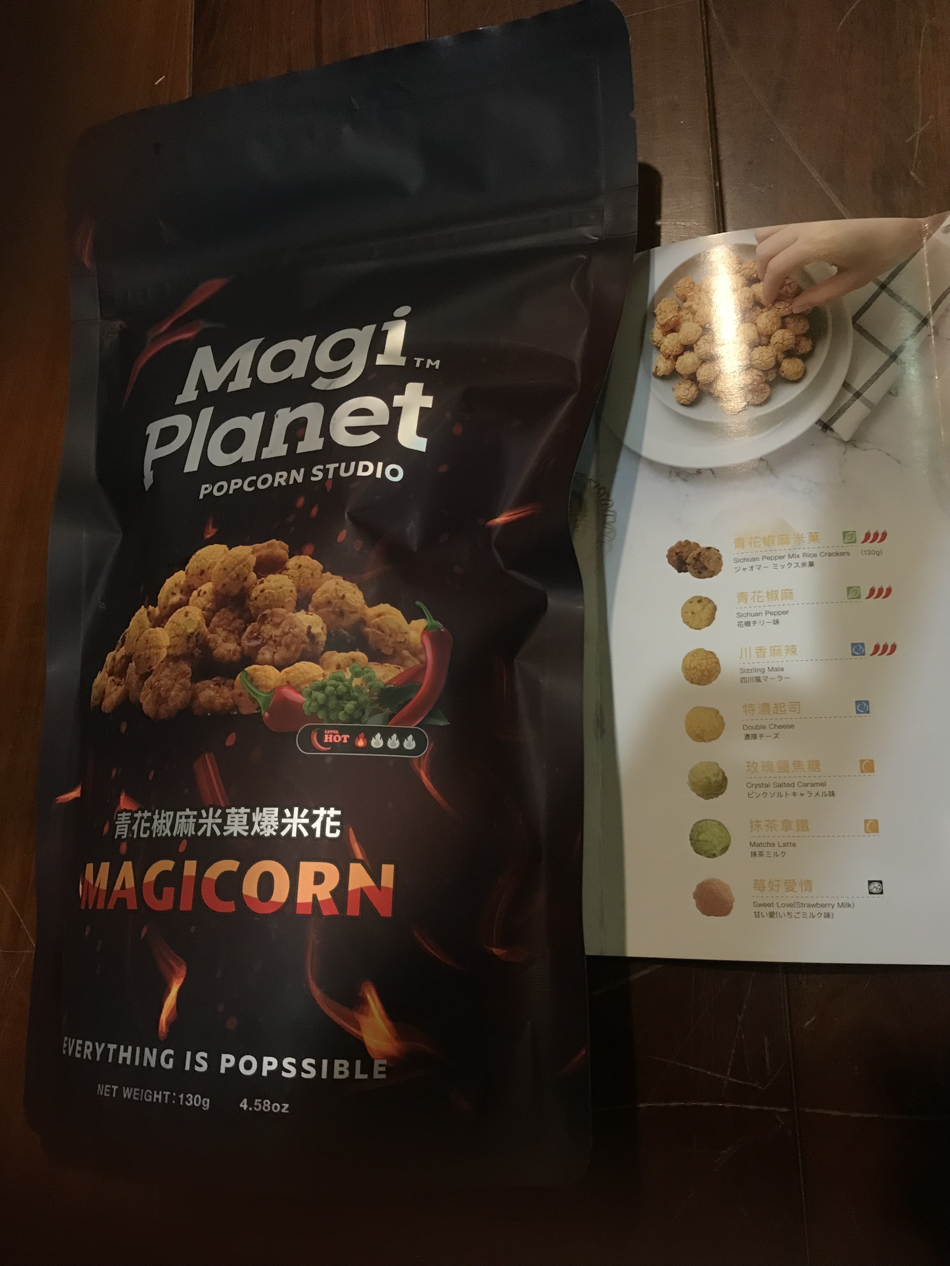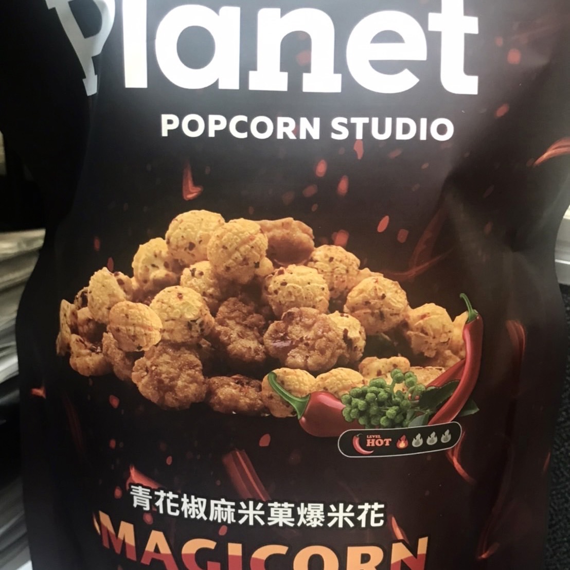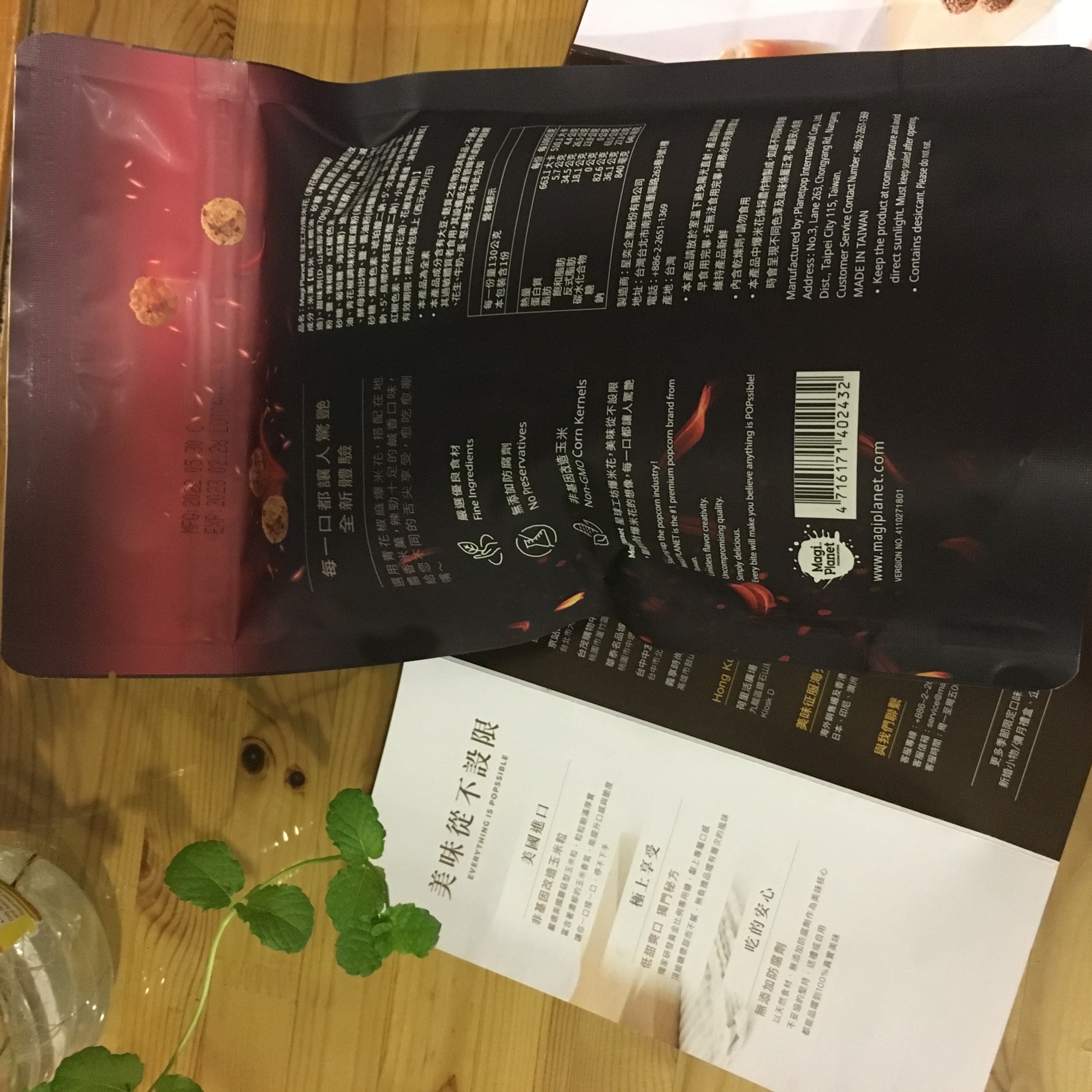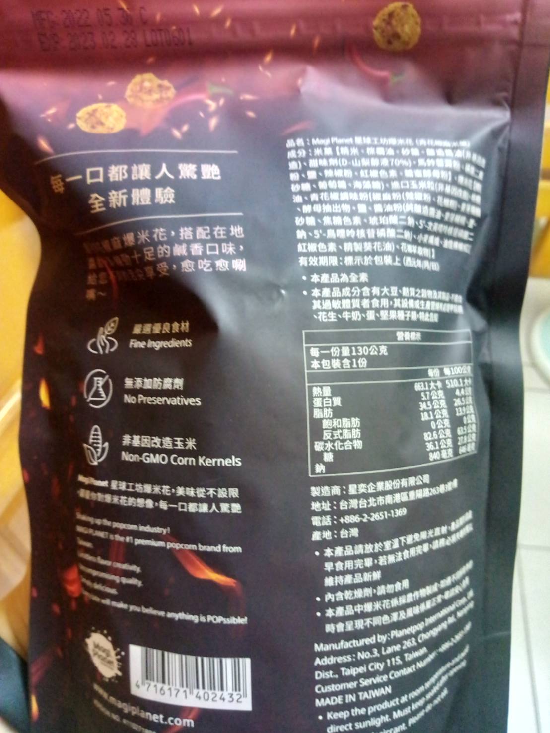 爆米花【 糖 ( 砂糖、葡萄糖、海藻糖)、進口玉米粒( 非基因改造)、棕櫚油、青花椒調味粉[ 椒麻粉( 辣椒粉、花椒粉)、麥芽糊精、酵母抽出物、鹽、醬油粉( 純釀造醬油、麥芽糊精、鹽、砂糖、焦糖色素、琥珀酸二鈉、5'-次黃嘌呤核苷磷酸二鈉、5'-鳥嘌呤核苷磷酸二鈉)、小麥纖維、油性辣椒紅( 紅椒色素、精製葵花油)、花椒萃取物]】